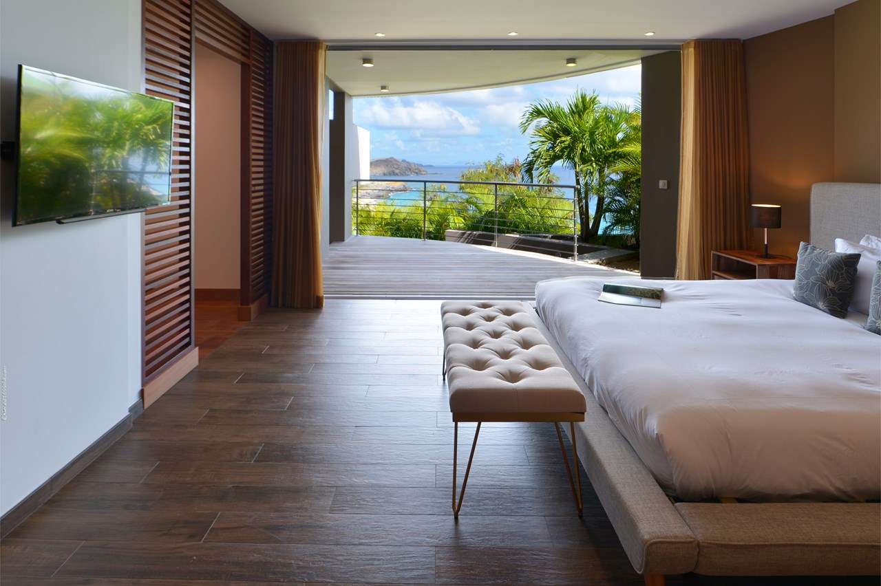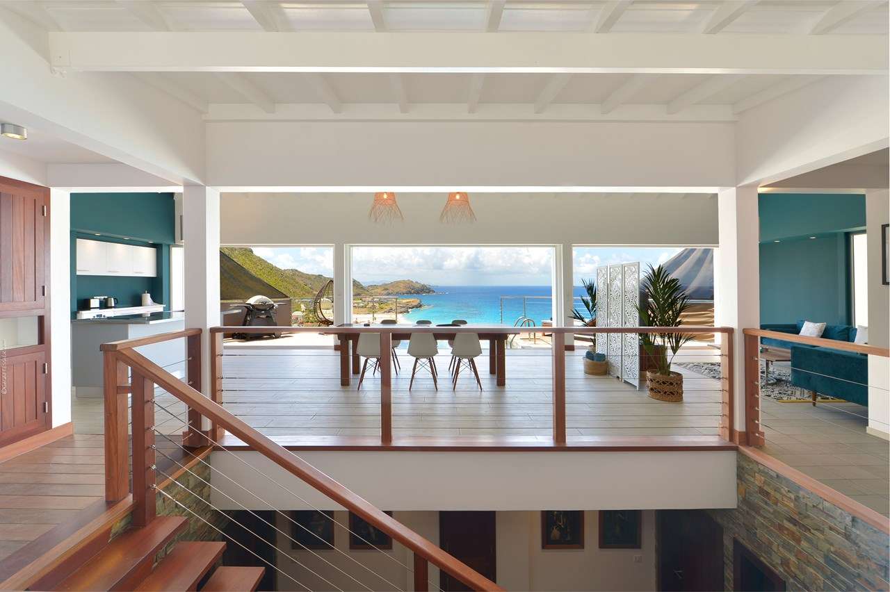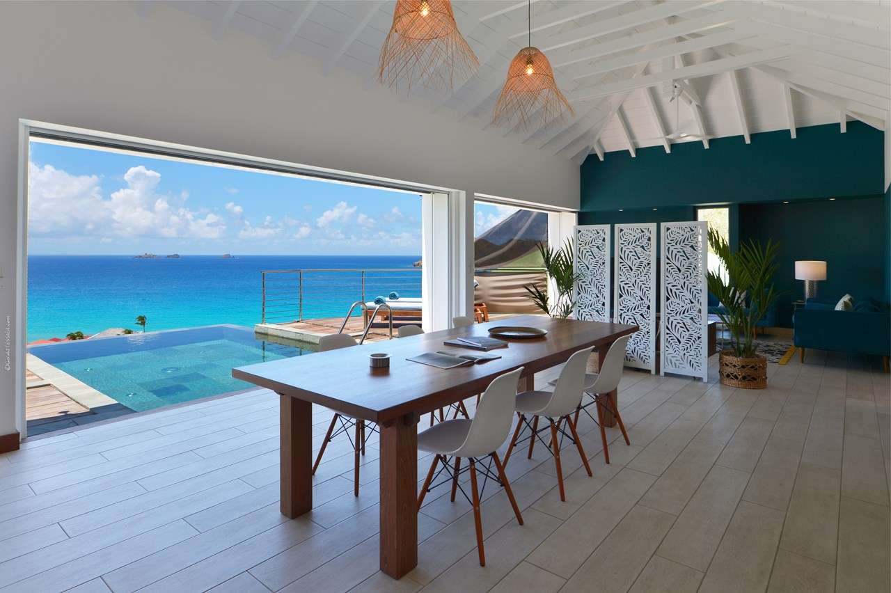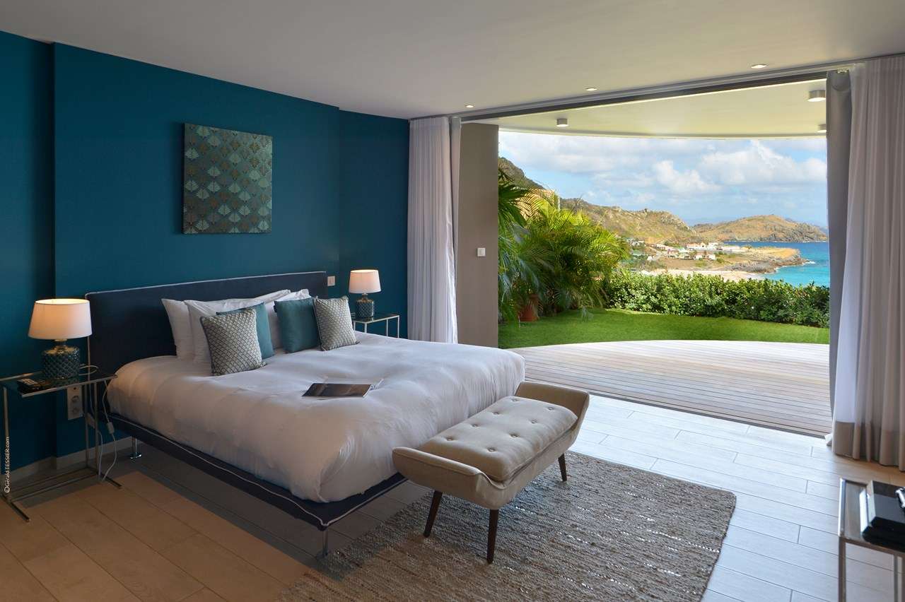 Welcome to Villa Flamands Bay (villa code: WV FLA), a contemporary 2-bedroom villa located in Flamands, St. Barts. With a standout design and panoramic sea views, this island home is a charming spot for a laid-back Caribbean getaway. The unique oval shape of Villa Flamands Bay makes this home unique amongst the vacation homes in St. Barts. Inside is sophisticated and comfortable, with a tropical aesthetic to the décor. Splashes of sea blue in the furnishings and accent walls throughout mirror the ocean outside, while elegant island details lend the villa a warm and homey atmosphere. Villa Flamands Bay also enjoys a wonderful location overlooking the beach of Flamands. Within a 2-minute drive, you could be lounging on the silky sands or wading into the water, while restaurants and shops in Gustavia are around a 10-minute drive. The open floor plan of the main living area blurs the line between the indoors and out, enhancing the endless sea views. Modern tropical details and natural materials throughout make these spaces ideal for relaxing, and shrugging off the rushes of modern life. A great room combines the living room, kitchen, and dining area. An ornate room divider creates a well-defined living room, where cozy blue sofas invite you to sink in and unwind. A large flat-screen TV also provides some entertainment, but just as tempting are the remarkable views to one side. At the other end of the room is the kitchen at Villa Flamands Bay. There’s a splash of blue on the feature wall here as well, continuing with the ocean theme of the home. High-end appliances make cooking a breeze, and our concierge is also happy to organize a grocery delivery or a private chef for an evening. The dining table is a wonderful setting for elegant island meals, and gathering with family and friends over some gourmet food. With uninterrupted views out over the bay, the backdrop is an idyllic accompaniment to any meal. A stairway next to the small indoor pond leads down to 2 bedrooms inside Villa Flamands Bay. Located at either end of the home, both rooms enjoy a European king-sized bed, a dressing area, and an ensuite bathroom with a large shower. Each bedroom also features an outdoor terrace set in a quarter circle, providing wonderful views over the ocean. Back upstairs, the outdoor terrace is graceful and chic, a wonderful spot to let the island breeze wash over you during the sunny Caribbean days. The small infinity pool stretches out to the middle of the living room and is flanked by two quarter-circles of terrace space, each with loungers for sunbathing, reading, or sipping a cool drink. Venturing outside Villa Flamands Bay immediately delivers you into some of the most stunning landscapes in St. Barts. It’s a short drive down to Flamands Beach, a quiet and pristine stretch of sand. From here, you can also tackle the Colombier beach trail, leading you to the island’s most remote beach in the far northwest corner. Since the property is located on a steep road, a 4x4 vehicle is highly recommended. During the Thanksgiving and December holidays, the villa rents at full occupancy rates regardless of how many bedrooms are used.Please fill out the form to begin your inquiry and we will connect you with a seasoned villa rental specialist.