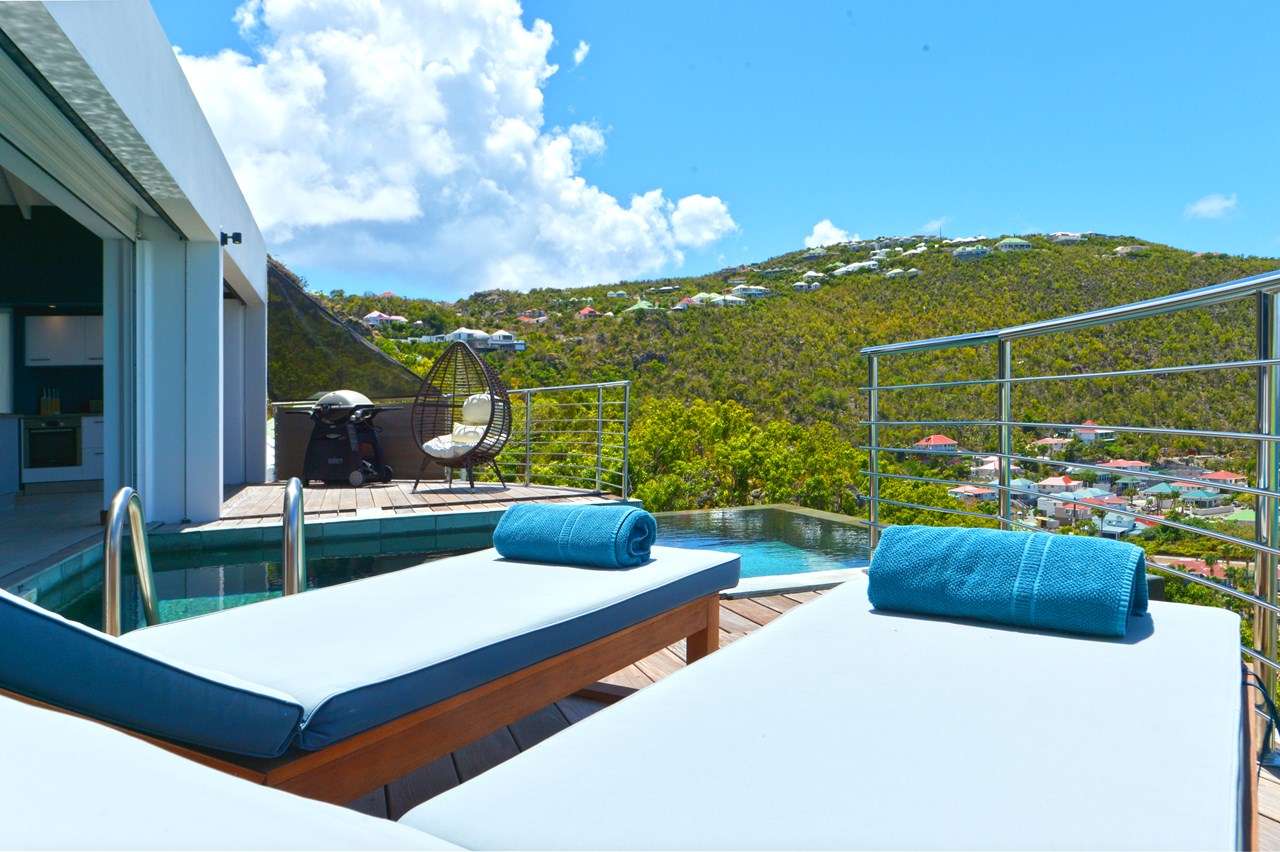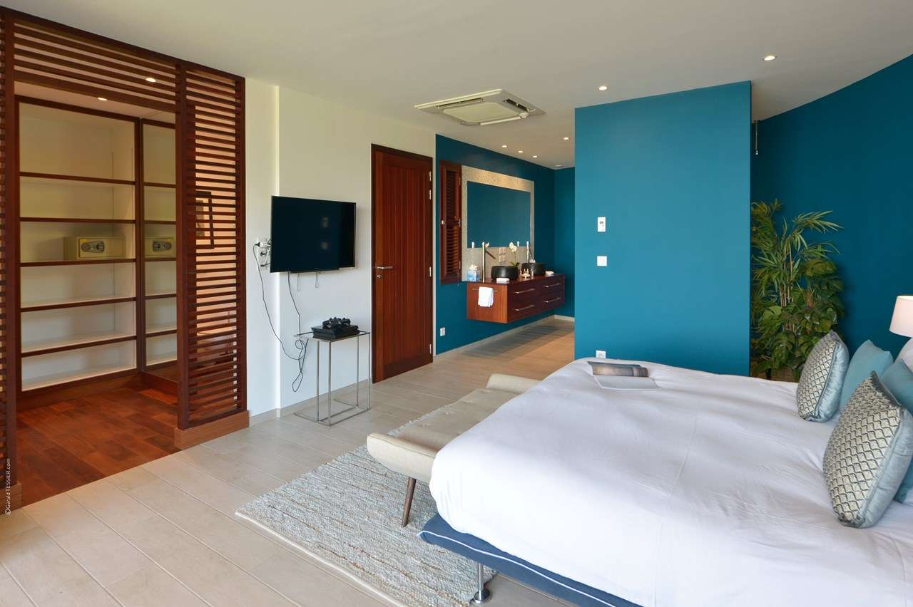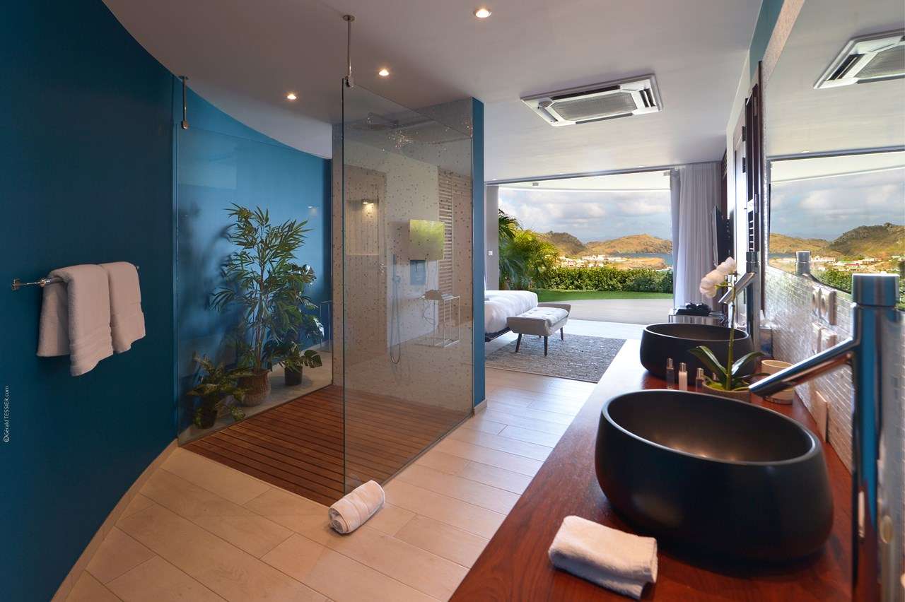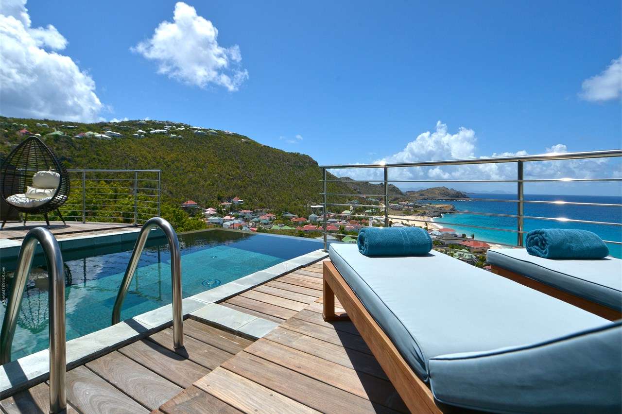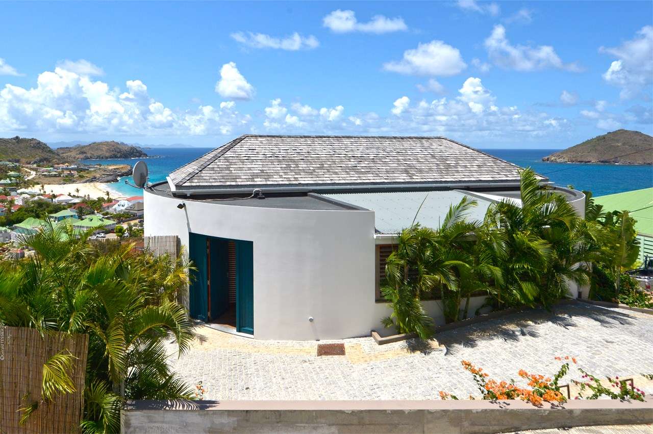 Welcome to Villa Flamands Bay (villa code: WV FLA), a contemporary 2-bedroom villa located in Flamands, St. Barts. With a standout design and panoramic sea views, this island home is a charming spot for a laid-back Caribbean getaway. The unique oval shape of Villa Flamands Bay makes this home unique amongst the vacation homes in St. Barts. Inside is sophisticated and comfortable, with a tropical aesthetic to the décor. Splashes of sea blue in the furnishings and accent walls throughout mirror the ocean outside, while elegant island details lend the villa a warm and homey atmosphere. Villa Flamands Bay also enjoys a wonderful location overlooking the beach of Flamands. Within a 2-minute drive, you could be lounging on the silky sands or wading into the water, while restaurants and shops in Gustavia are around a 10-minute drive. The open floor plan of the main living area blurs the line between the indoors and out, enhancing the endless sea views. Modern tropical details and natural materials throughout make these spaces ideal for relaxing, and shrugging off the rushes of modern life. A great room combines the living room, kitchen, and dining area. An ornate room divider creates a well-defined living room, where cozy blue sofas invite you to sink in and unwind. A large flat-screen TV also provides some entertainment, but just as tempting are the remarkable views to one side. At the other end of the room is the kitchen at Villa Flamands Bay. There’s a splash of blue on the feature wall here as well, continuing with the ocean theme of the home. High-end appliances make cooking a breeze, and our concierge is also happy to organize a grocery delivery or a private chef for an evening. The dining table is a wonderful setting for elegant island meals, and gathering with family and friends over some gourmet food. With uninterrupted views out over the bay, the backdrop is an idyllic accompaniment to any meal. A stairway next to the small indoor pond leads down to 2 bedrooms inside Villa Flamands Bay. Located at either end of the home, both rooms enjoy a European king-sized bed, a dressing area, and an ensuite bathroom with a large shower. Each bedroom also features an outdoor terrace set in a quarter circle, providing wonderful views over the ocean. Back upstairs, the outdoor terrace is graceful and chic, a wonderful spot to let the island breeze wash over you during the sunny Caribbean days. The small infinity pool stretches out to the middle of the living room and is flanked by two quarter-circles of terrace space, each with loungers for sunbathing, reading, or sipping a cool drink. Venturing outside Villa Flamands Bay immediately delivers you into some of the most stunning landscapes in St. Barts. It’s a short drive down to Flamands Beach, a quiet and pristine stretch of sand. From here, you can also tackle the Colombier beach trail, leading you to the island’s most remote beach in the far northwest corner. Since the property is located on a steep road, a 4x4 vehicle is highly recommended. During the Thanksgiving and December holidays, the villa rents at full occupancy rates regardless of how many bedrooms are used.Please fill out the form to begin your inquiry and we will connect you with a seasoned villa rental specialist.
