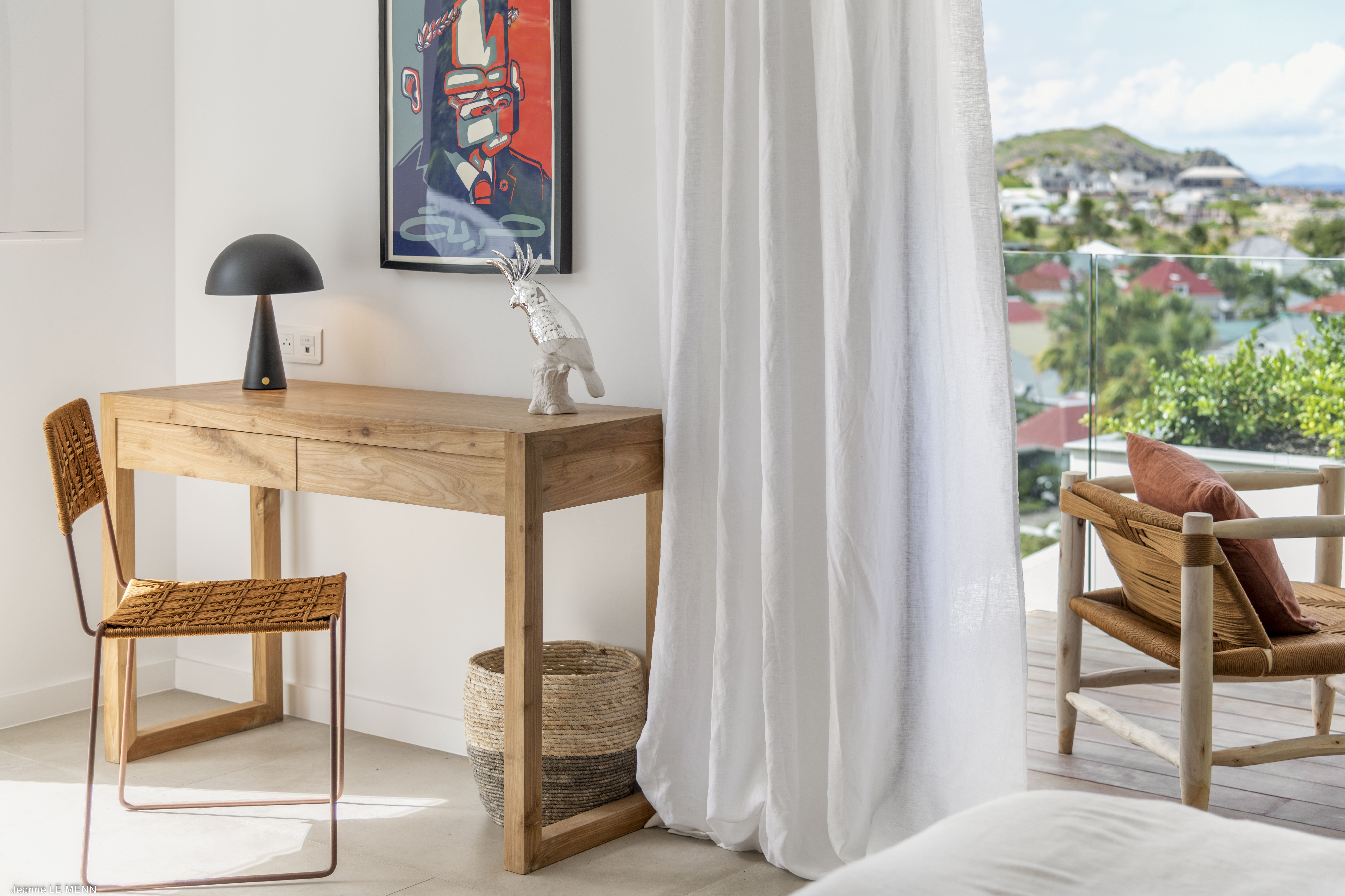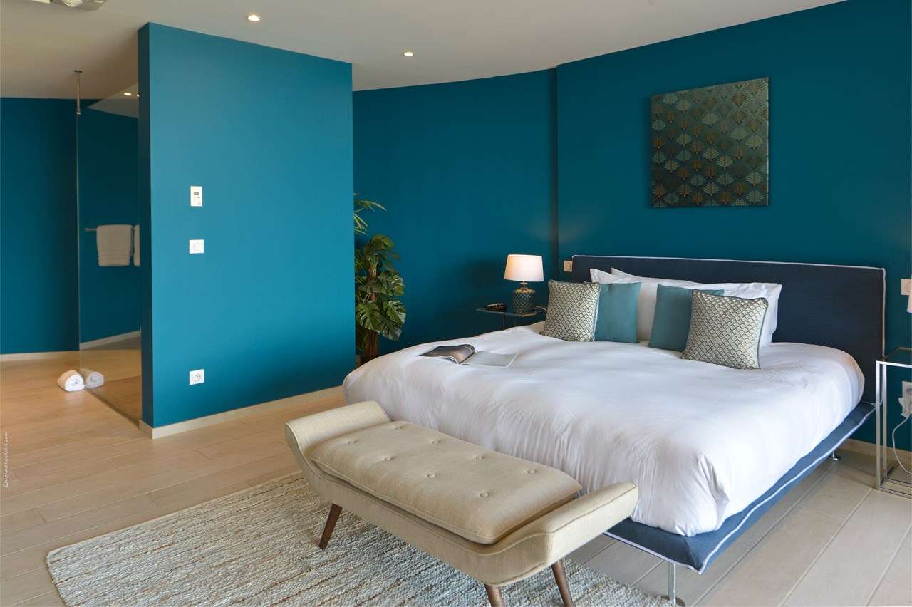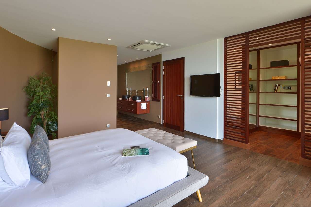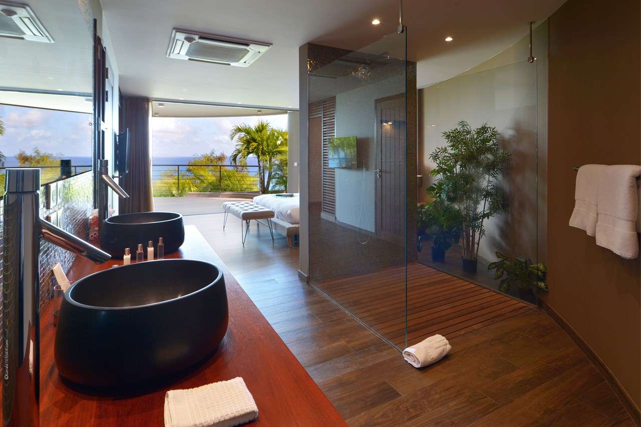 Welcome to Villa Flamands Bay (villa code: WV FLA), a contemporary 2-bedroom villa located in Flamands, St. Barts. With a standout design and panoramic sea views, this island home is a charming spot for a laid-back Caribbean getaway. The unique oval shape of Villa Flamands Bay makes this home unique amongst the vacation homes in St. Barts. Inside is sophisticated and comfortable, with a tropical aesthetic to the décor. Splashes of sea blue in the furnishings and accent walls throughout mirror the ocean outside, while elegant island details lend the villa a warm and homey atmosphere. Villa Flamands Bay also enjoys a wonderful location overlooking the beach of Flamands. Within a 2-minute drive, you could be lounging on the silky sands or wading into the water, while restaurants and shops in Gustavia are around a 10-minute drive. The open floor plan of the main living area blurs the line between the indoors and out, enhancing the endless sea views. Modern tropical details and natural materials throughout make these spaces ideal for relaxing, and shrugging off the rushes of modern life. A great room combines the living room, kitchen, and dining area. An ornate room divider creates a well-defined living room, where cozy blue sofas invite you to sink in and unwind. A large flat-screen TV also provides some entertainment, but just as tempting are the remarkable views to one side. At the other end of the room is the kitchen at Villa Flamands Bay. There’s a splash of blue on the feature wall here as well, continuing with the ocean theme of the home. High-end appliances make cooking a breeze, and our concierge is also happy to organize a grocery delivery or a private chef for an evening. The dining table is a wonderful setting for elegant island meals, and gathering with family and friends over some gourmet food. With uninterrupted views out over the bay, the backdrop is an idyllic accompaniment to any meal. A stairway next to the small indoor pond leads down to 2 bedrooms inside Villa Flamands Bay. Located at either end of the home, both rooms enjoy a European king-sized bed, a dressing area, and an ensuite bathroom with a large shower. Each bedroom also features an outdoor terrace set in a quarter circle, providing wonderful views over the ocean. Back upstairs, the outdoor terrace is graceful and chic, a wonderful spot to let the island breeze wash over you during the sunny Caribbean days. The small infinity pool stretches out to the middle of the living room and is flanked by two quarter-circles of terrace space, each with loungers for sunbathing, reading, or sipping a cool drink. Venturing outside Villa Flamands Bay immediately delivers you into some of the most stunning landscapes in St. Barts. It’s a short drive down to Flamands Beach, a quiet and pristine stretch of sand. From here, you can also tackle the Colombier beach trail, leading you to the island’s most remote beach in the far northwest corner. Since the property is located on a steep road, a 4x4 vehicle is highly recommended. During the Thanksgiving and December holidays, the villa rents at full occupancy rates regardless of how many bedrooms are used.Please fill out the form to begin your inquiry and we will connect you with a seasoned villa rental specialist.