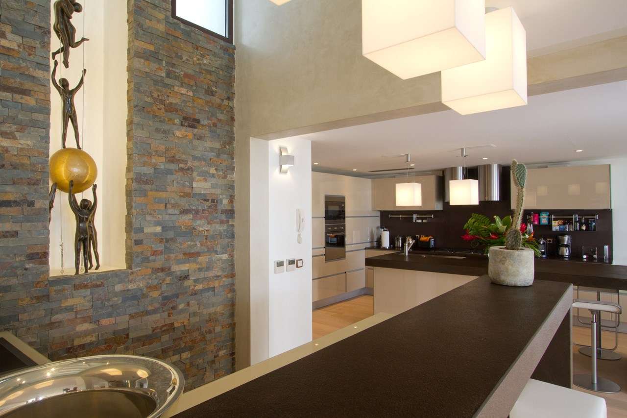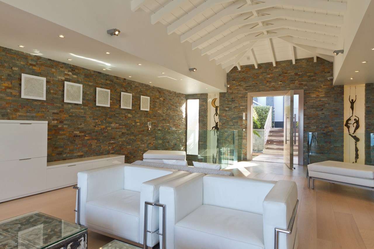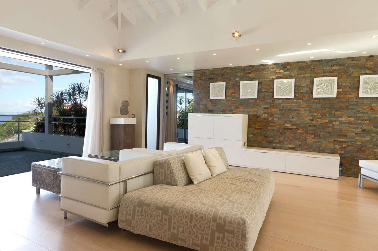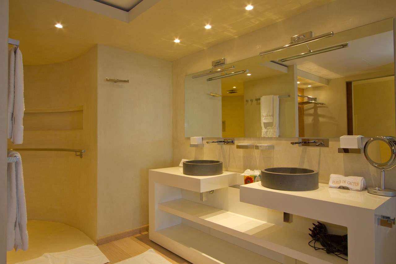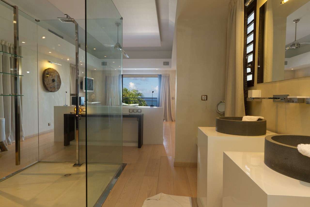 Inside Fleur de Cactus, it’s all about the sophisticated island life. Stylish and modern, the interiors feature fabulous artwork and high-end furnishings. Creamy neutral colors contrast with rustic touches like slate-stone feature walls, large indoor plants, and fascinating antiques. Floor-to-ceiling doors open to the terrace, bringing the natural beauty of St. Barts inside.