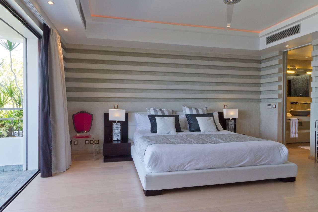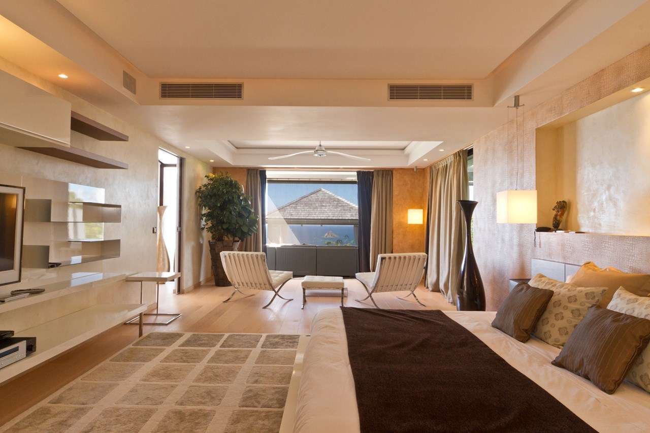 One master suite is located on the main level off the living area. This airy room opens directly onto the pool terrace and even features its own comfortable seating area.