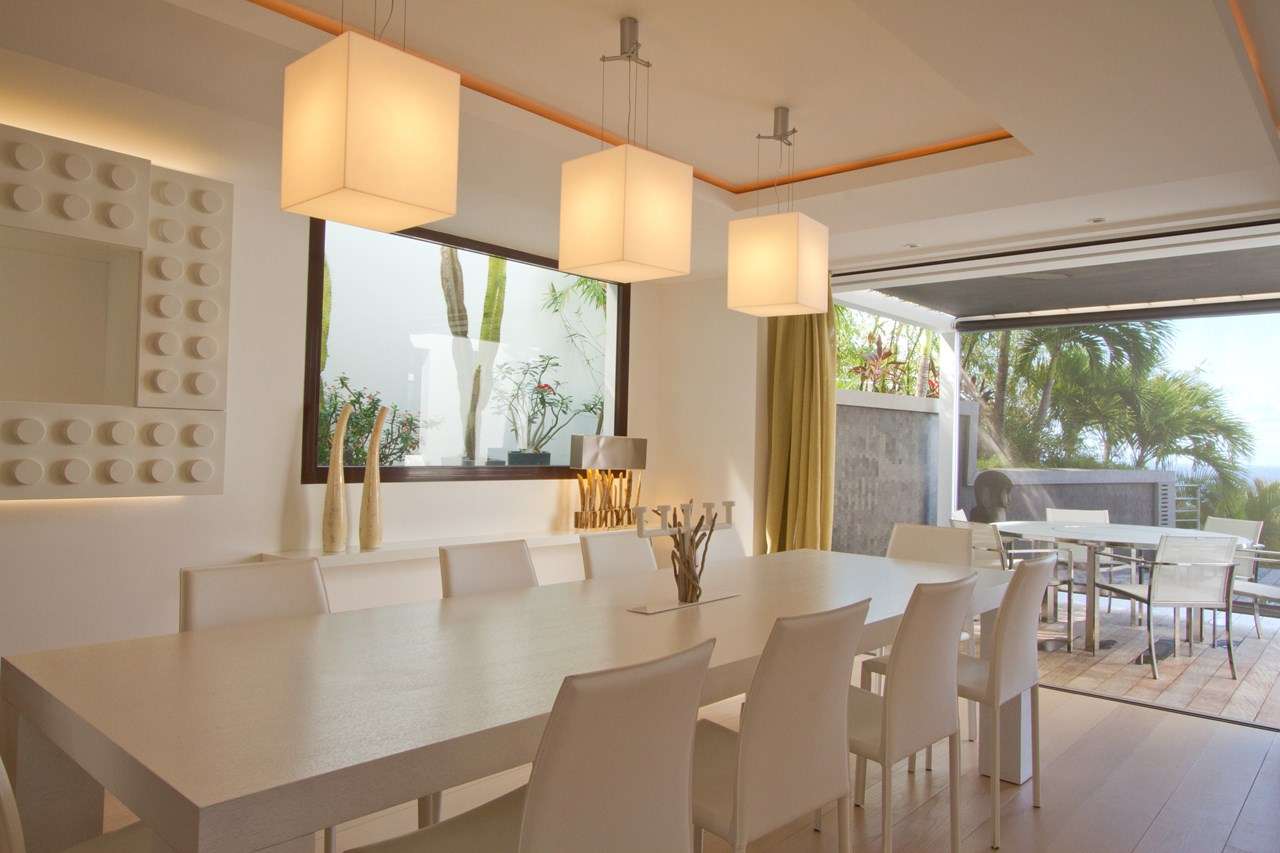 For glamorous dinners, the indoor dining table with seating for 10 guests is a fabulous setting. If alfresco dining is more your style, an outdoor dining table for six is ideal for more intimate dinners in the warm island air.