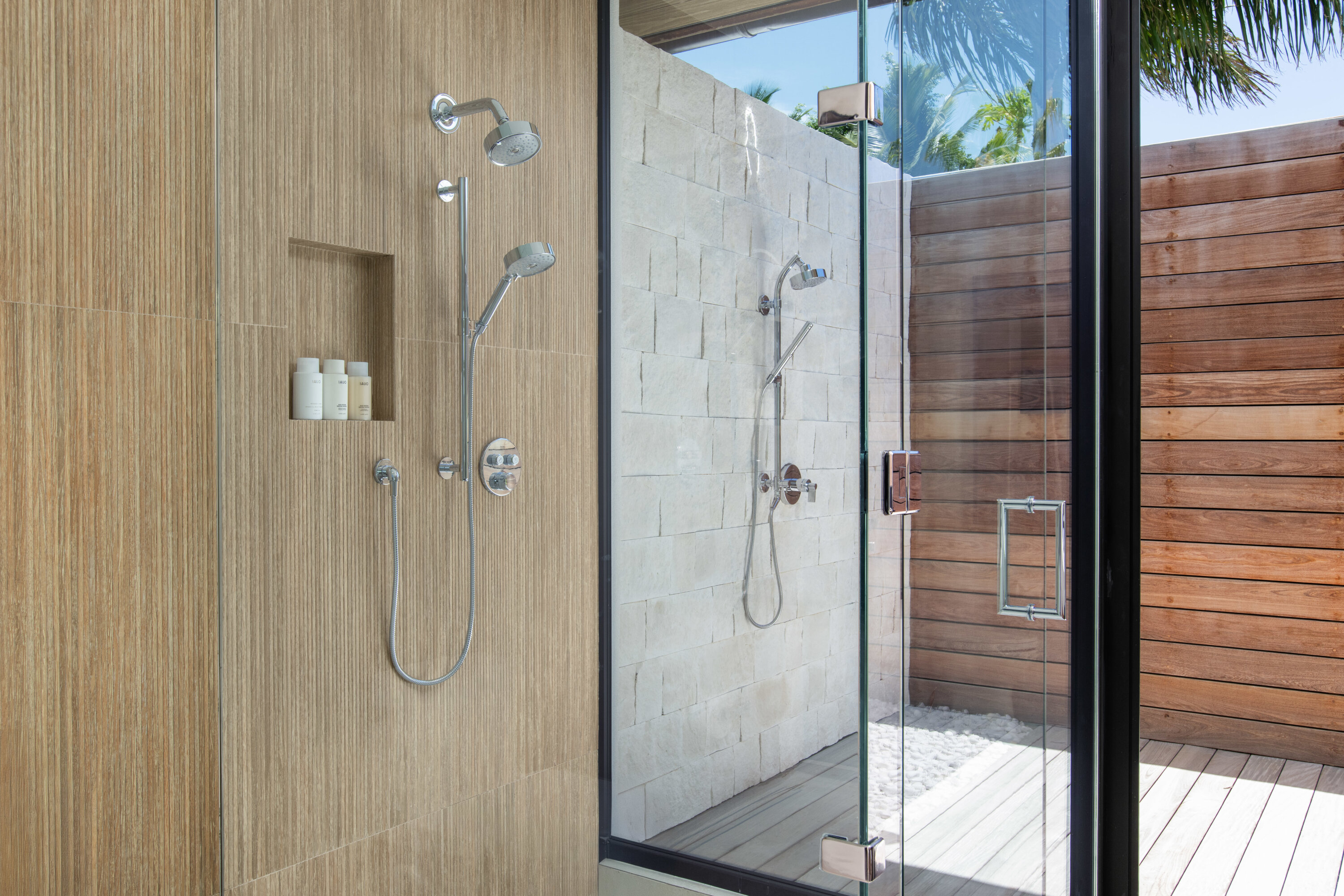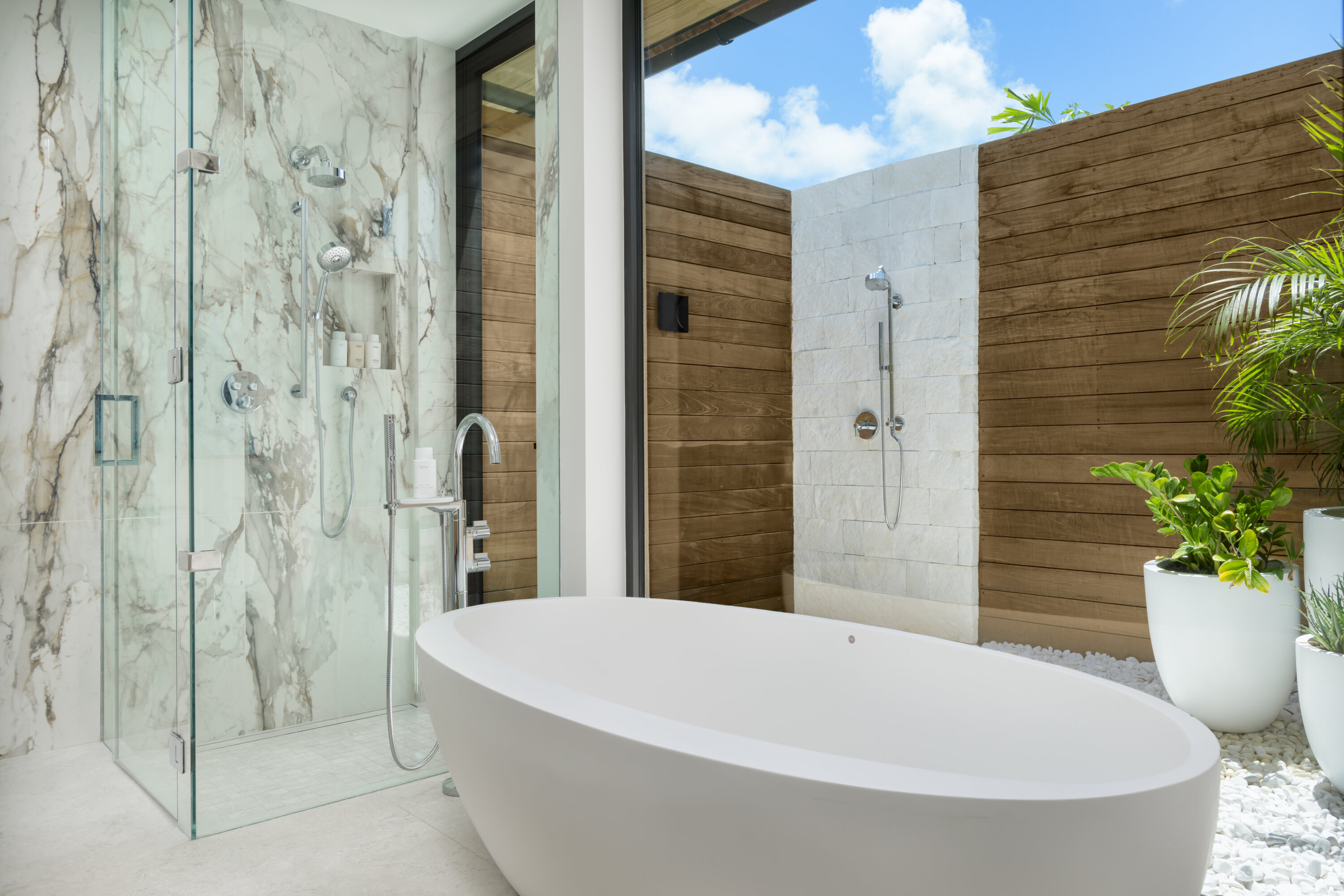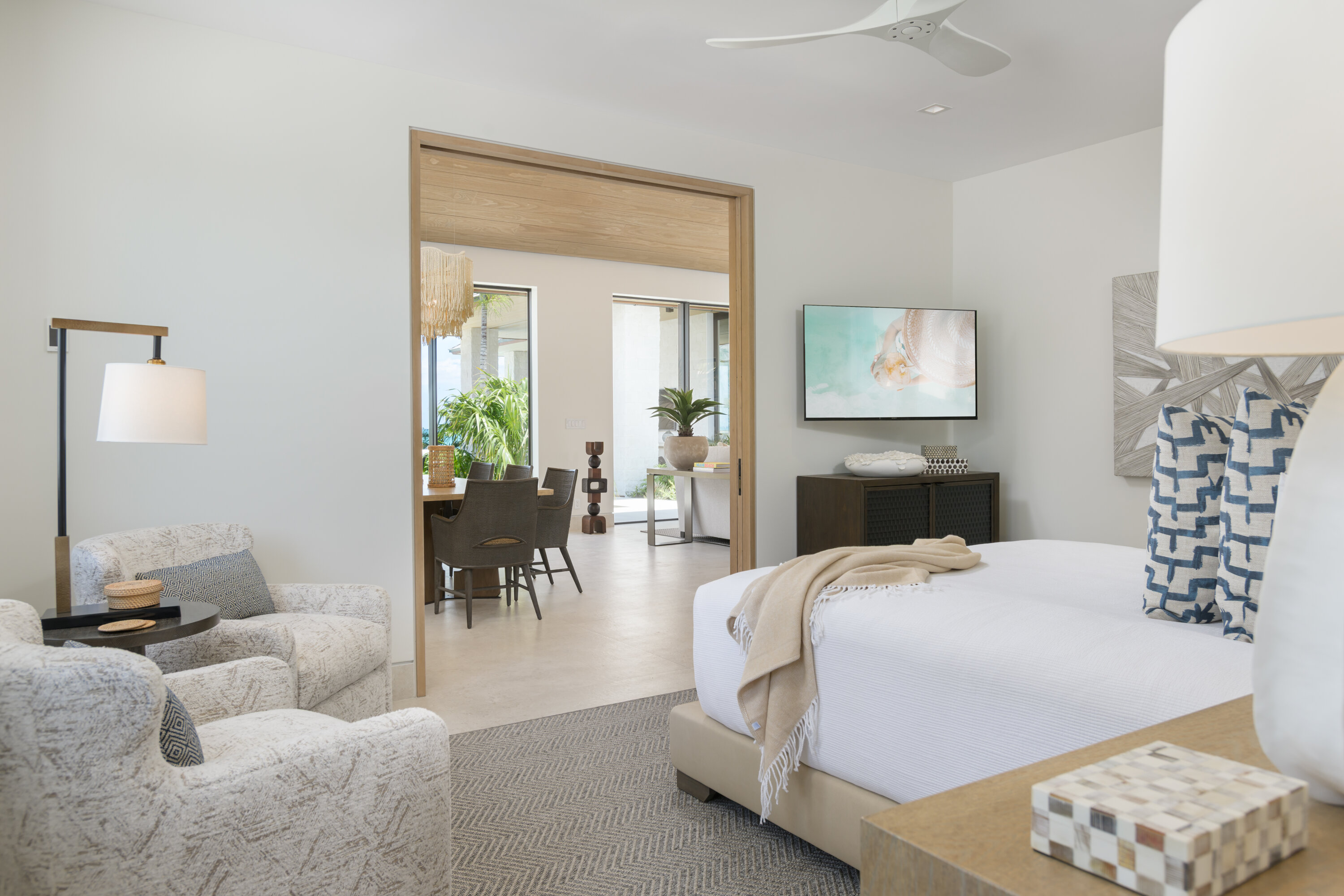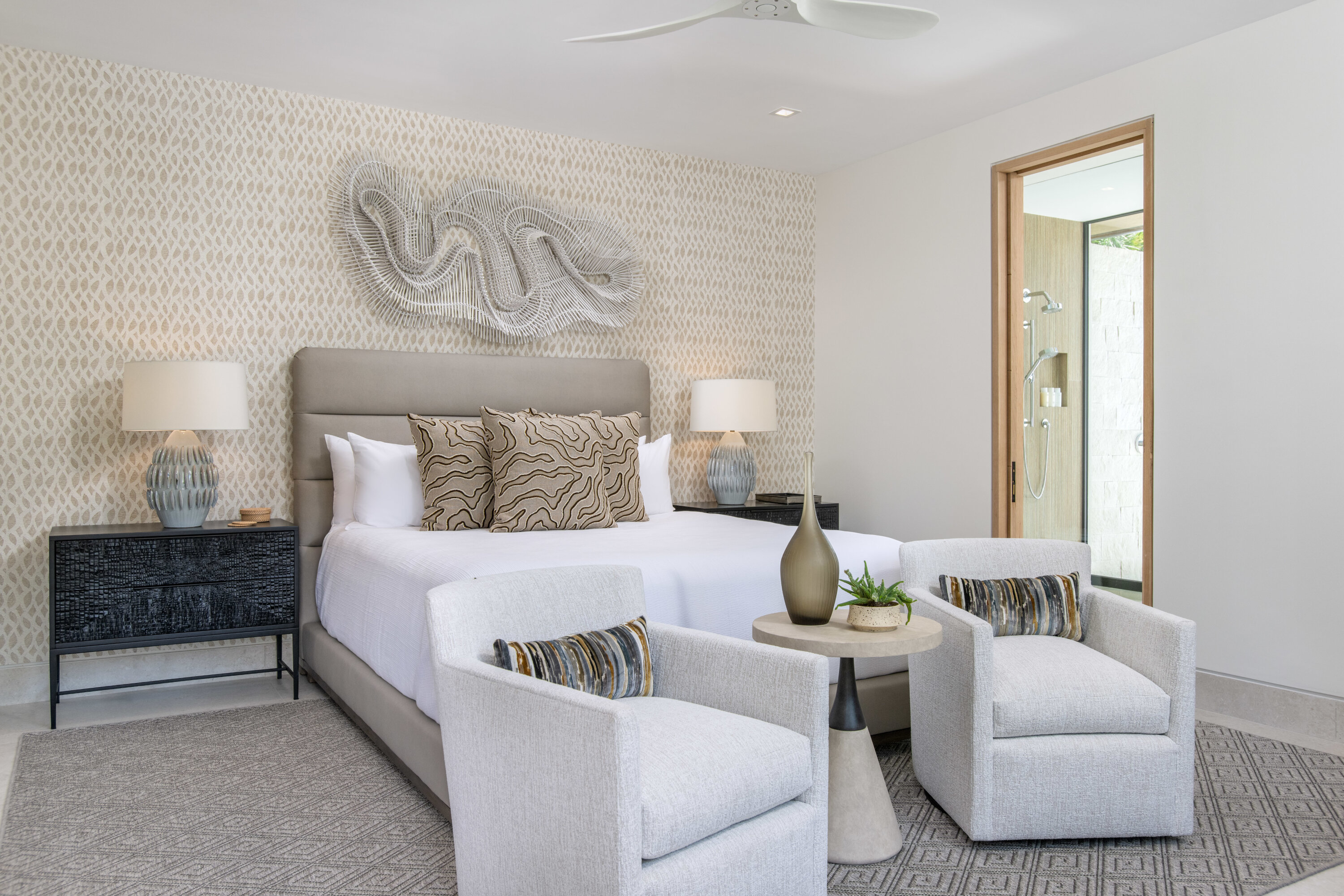 Each bedroom is a haven of serenity, complete with king beds, deep plush mattresses, motorized shades, and both indoor and open-air showers. Select suites also offer private terraces, outdoor soaking tubs, and built-in coffee stations for a leisurely start to the day.