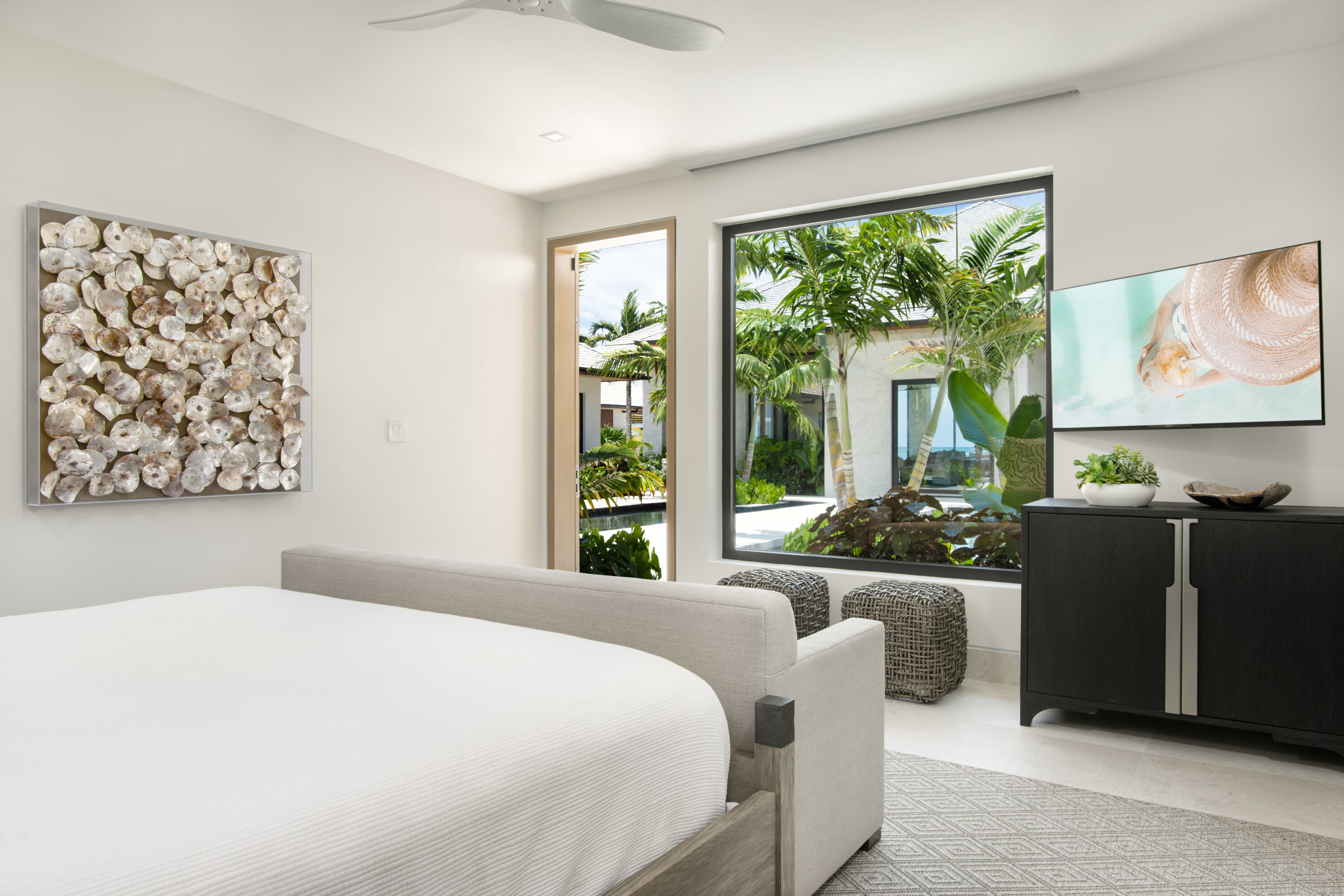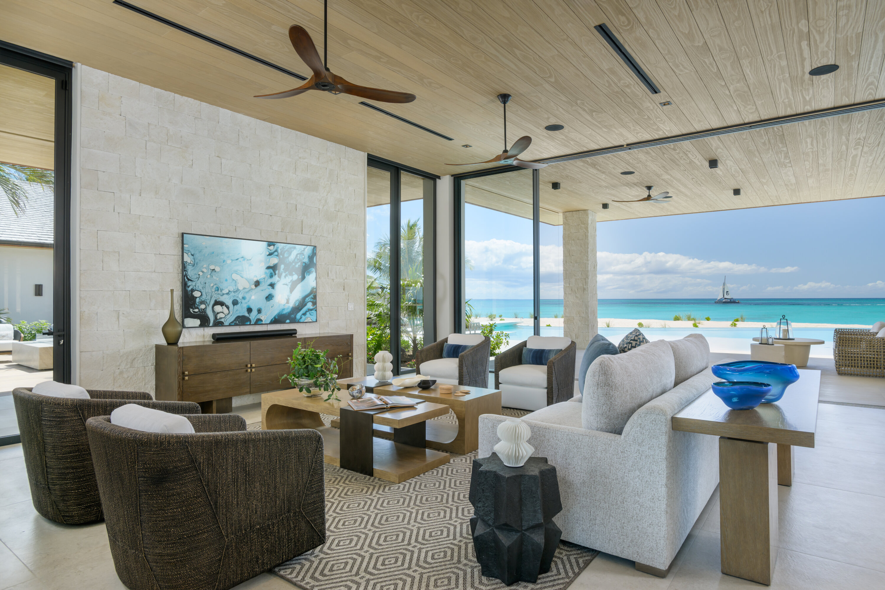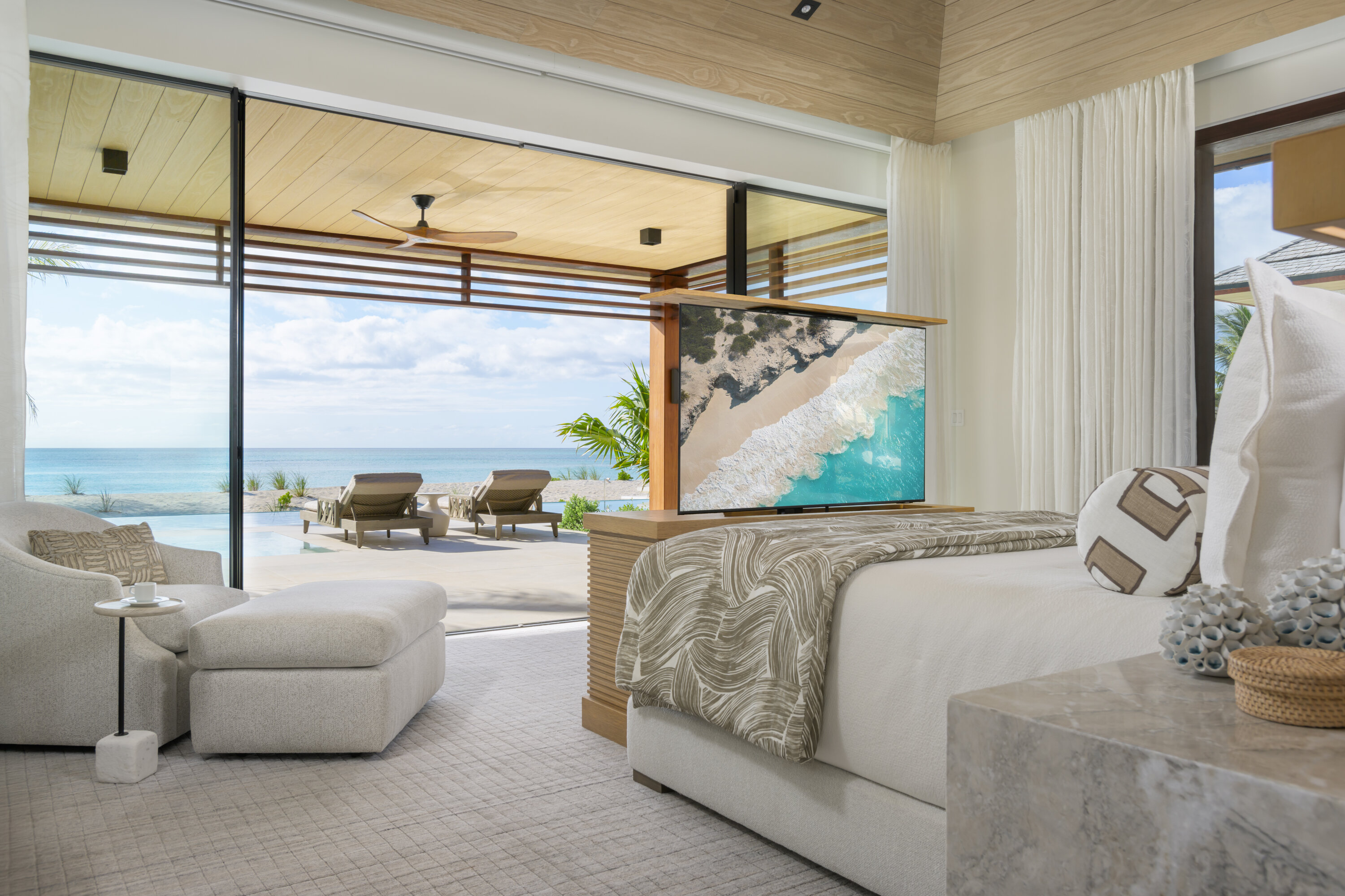 Inside, the interiors echo the villa’s coastal setting with lofty ceilings, soothing earth tones, and wide windows that flood the space with natural light. Thoughtful design details—from rich textures and curated artwork to high-end materials—create a calm and sophisticated ambiance throughout.