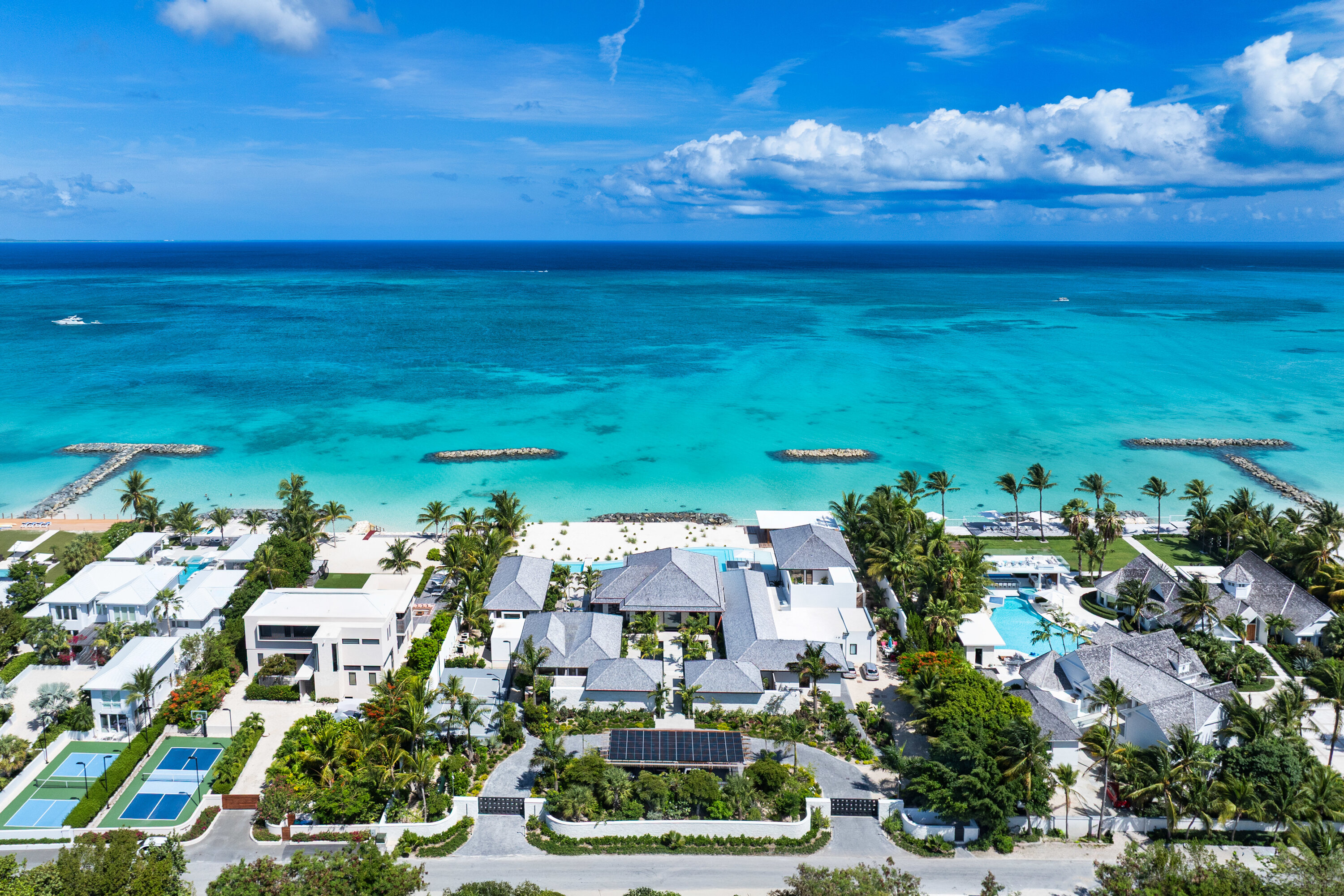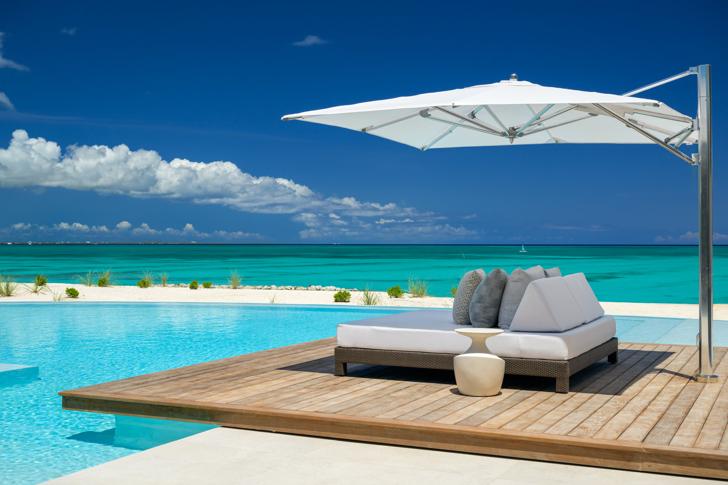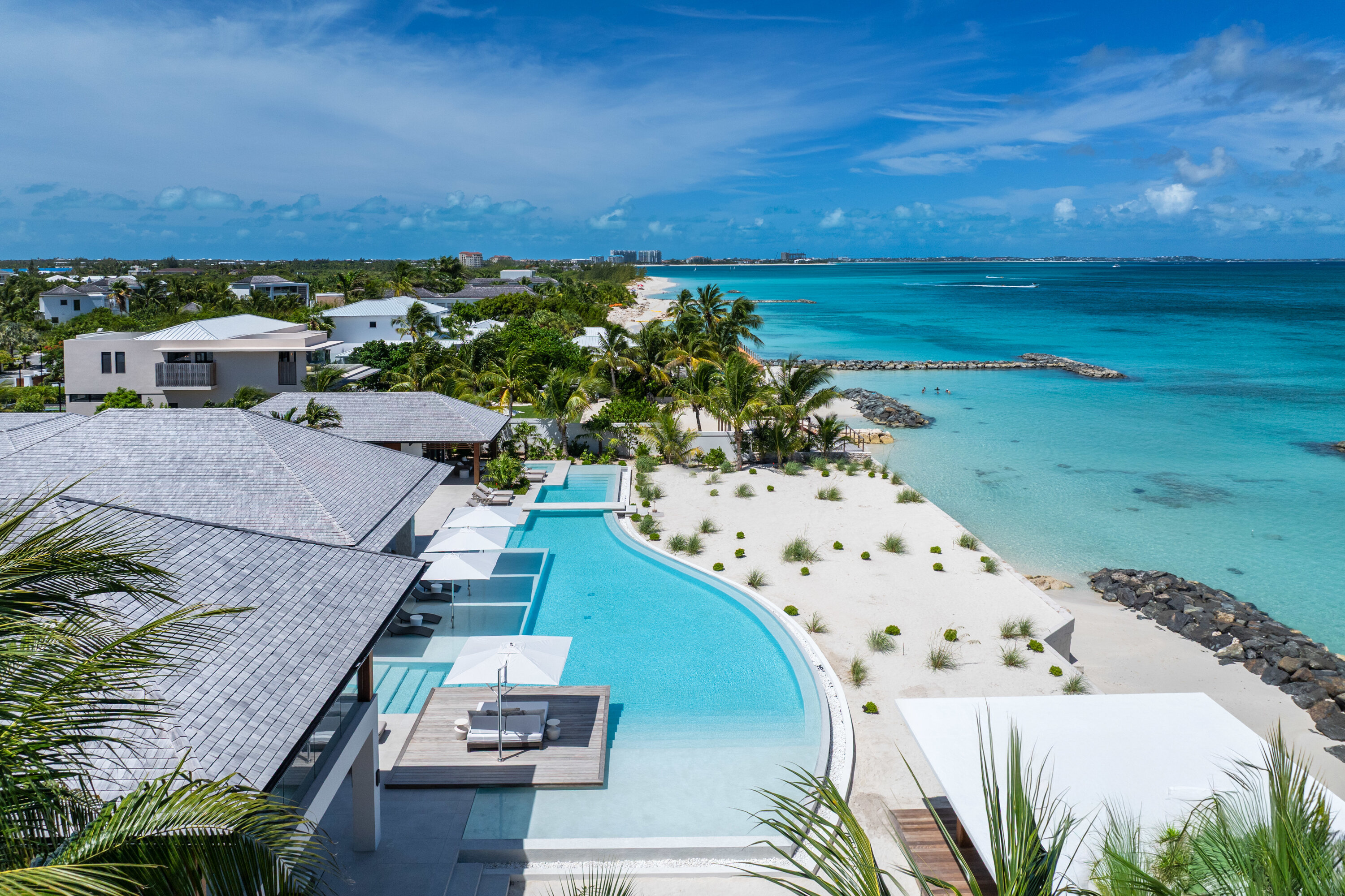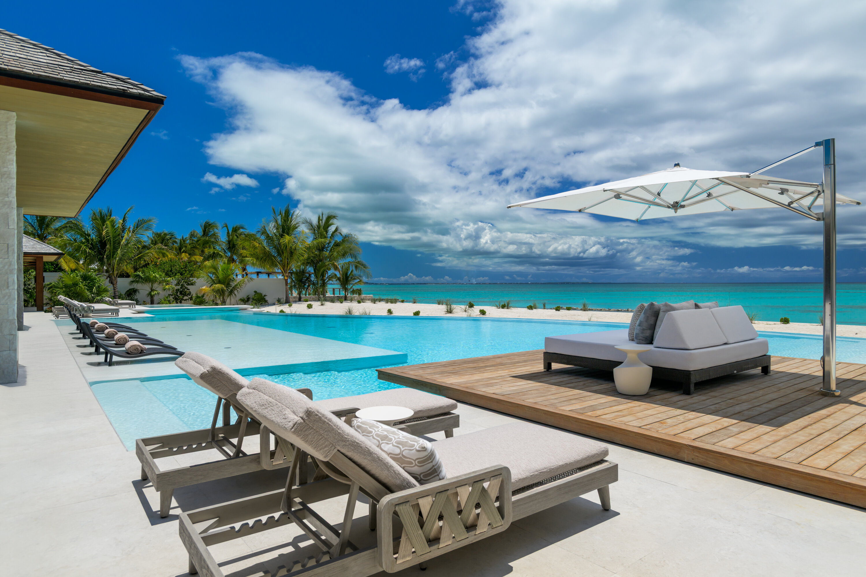 Just a few steps above the soft white sands of Grace Bay, the expansive pool terrace remains secluded from the beach, ensuring both easy access and total privacy. At its heart is an oversized perimeter overflow pool, ideal for swimming laps, lounging on the tanning ledge, or unwinding in the integrated hot tub. Sunbeds, shaded seating nooks, and a breezy poolside cabana invite all-day relaxation, while after sunset, the outdoor lounge, firepit, and illuminated pickleball and half-basketball court become the setting for lively evening gatherings.