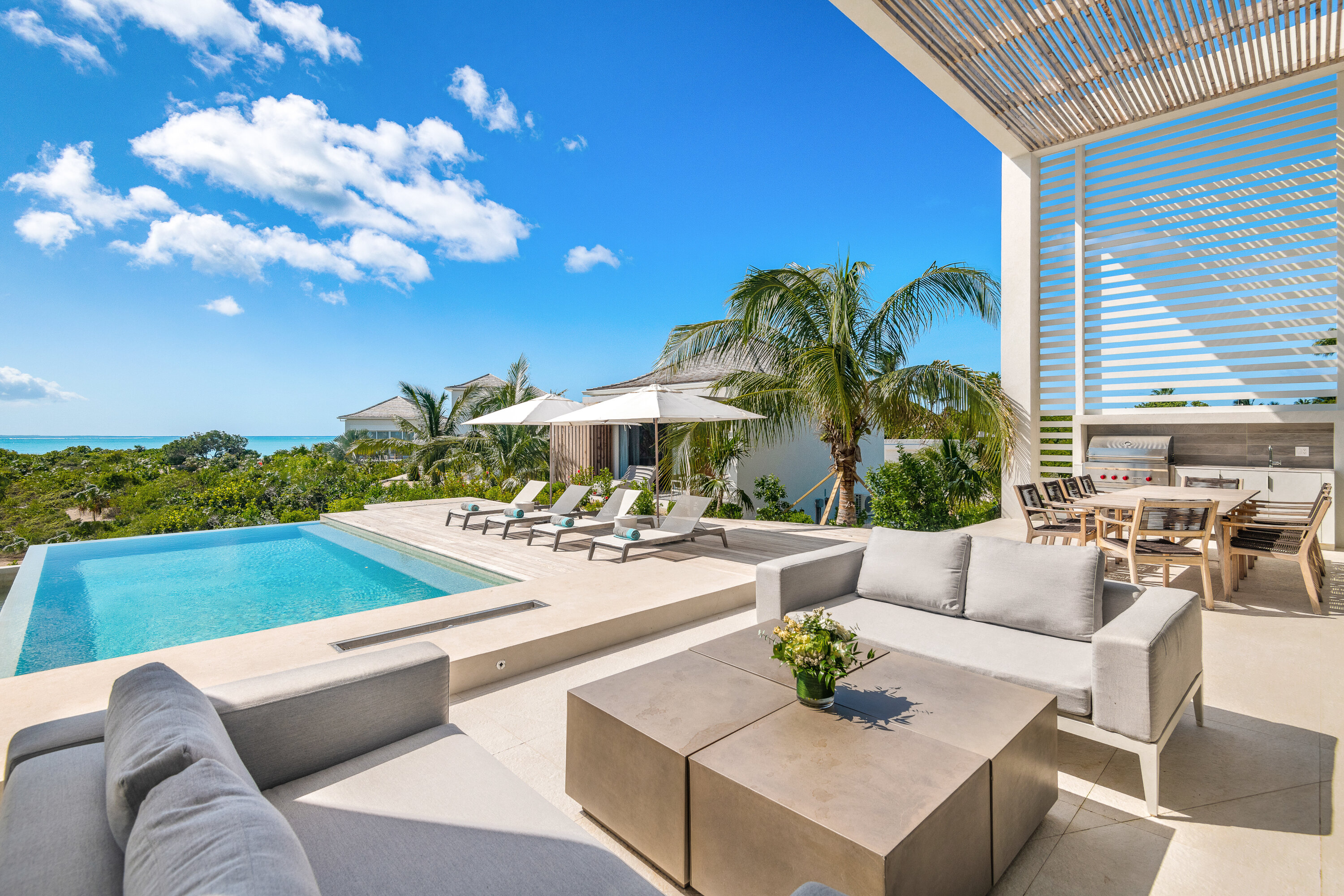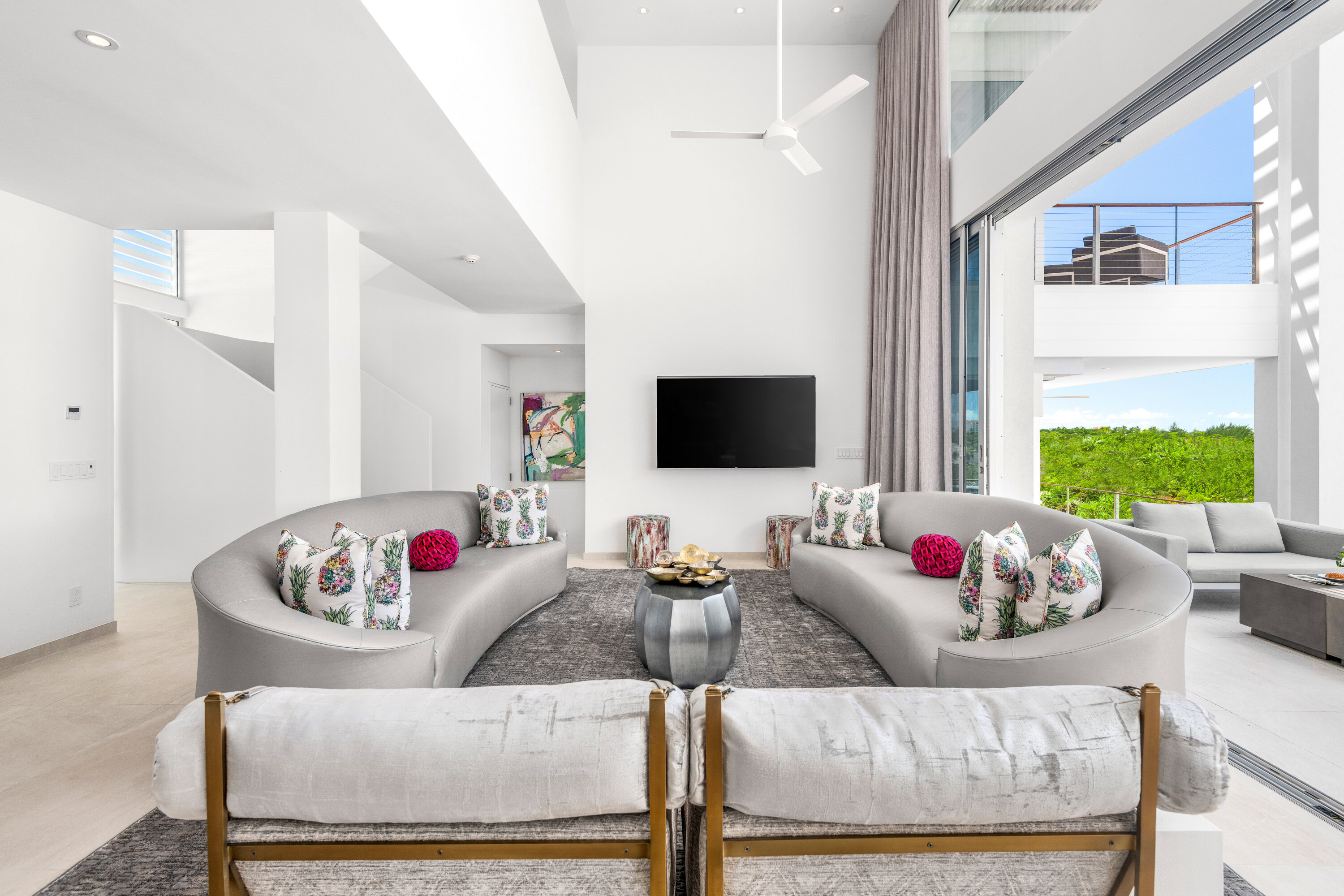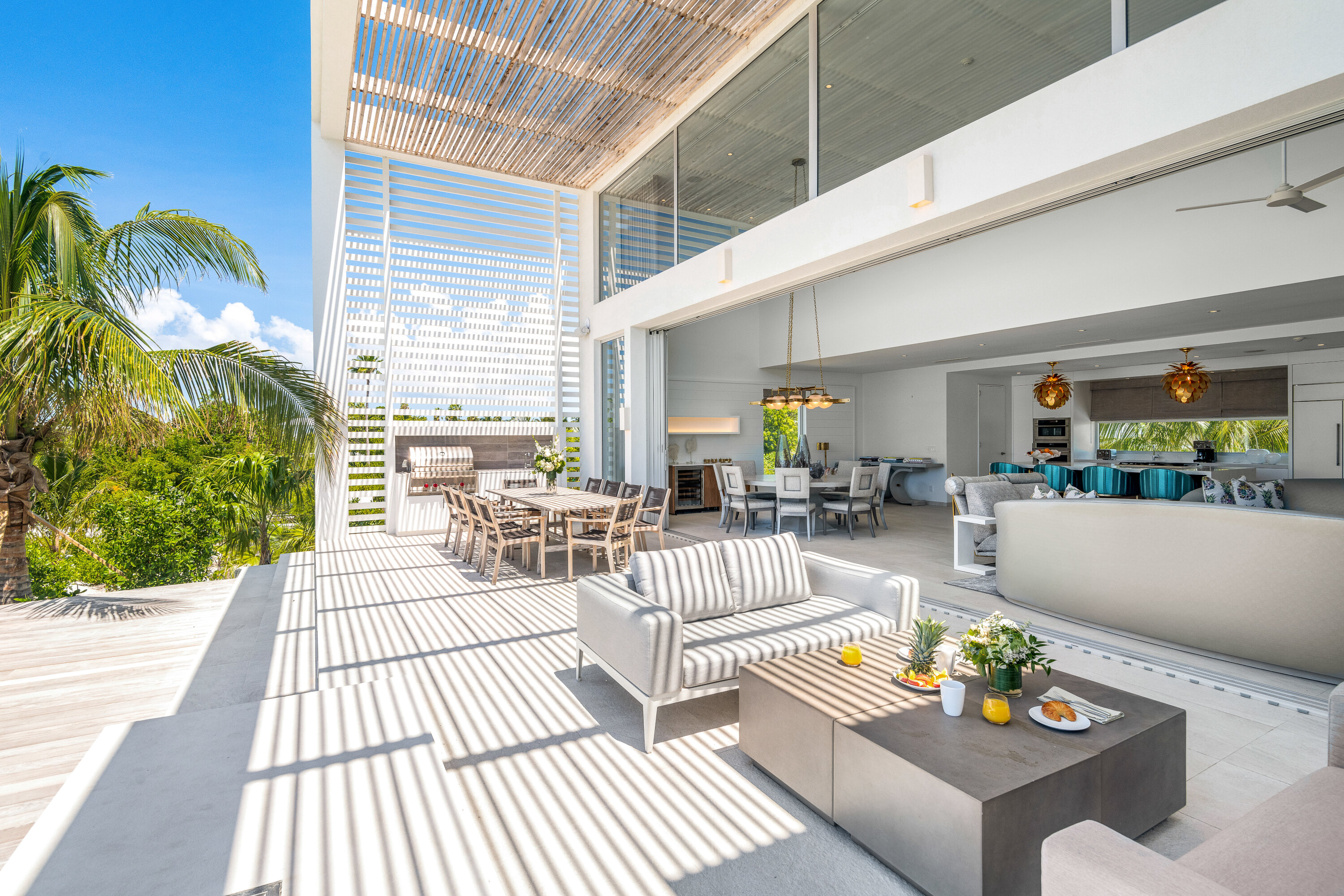 Villa Grace Bay Ocean View (villa code: TC GB60) is a magnificent 6-bedroom home offering an open living space with expansive sliding glass doors. The dining area seats eight guests beneath a beautiful light fixture next to a second lounge area.
