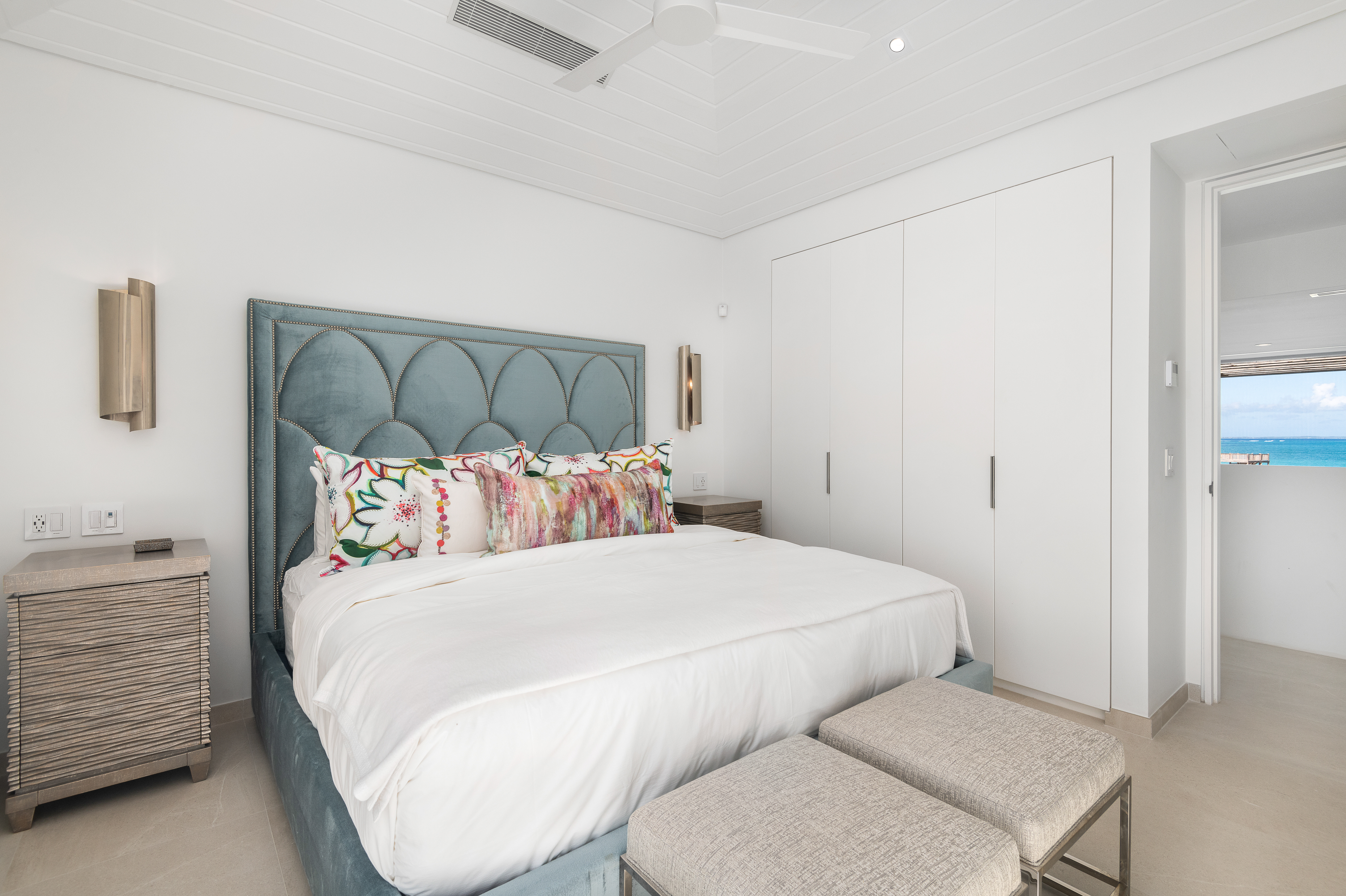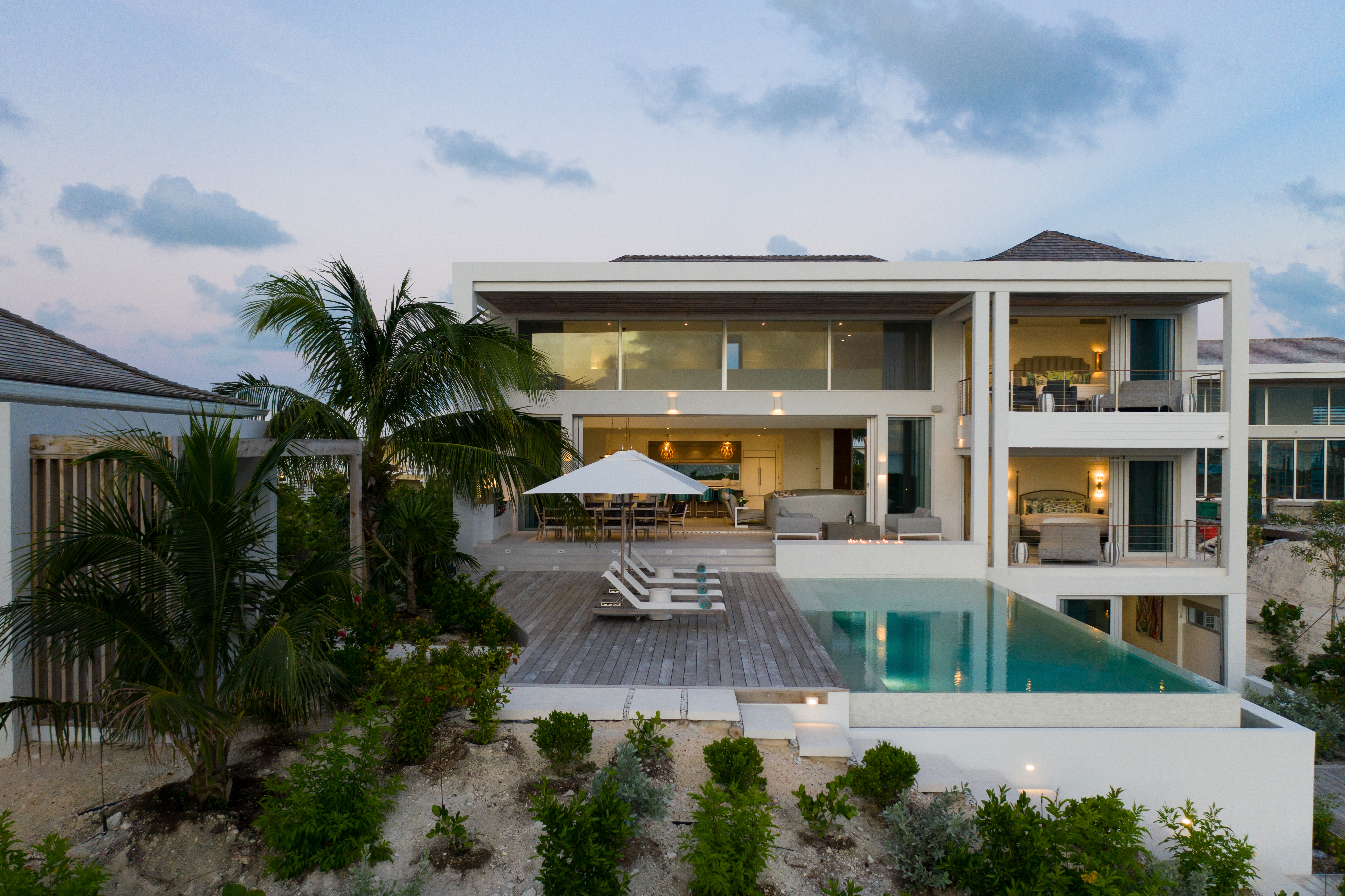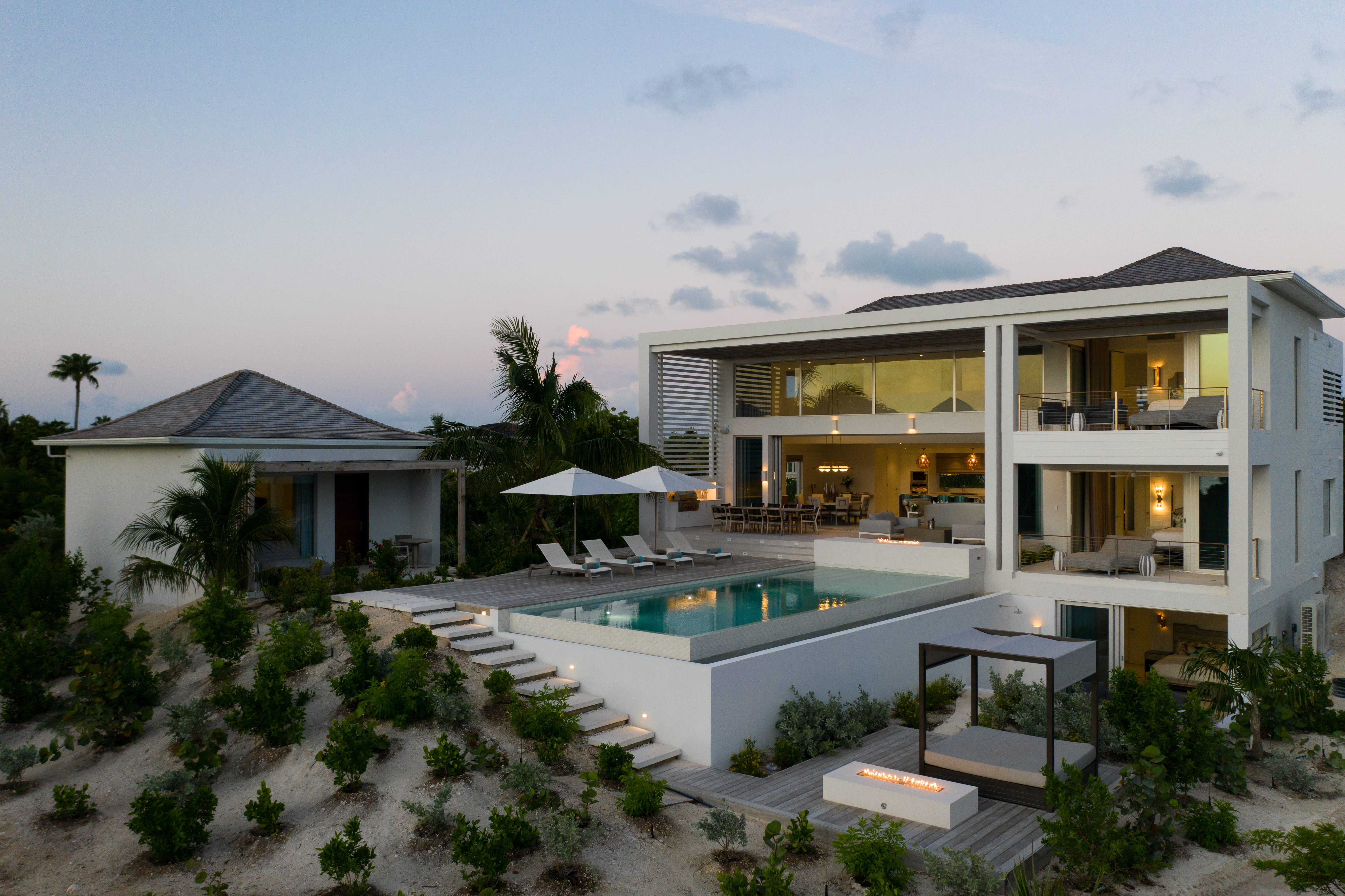 This magnificent 6-bedroom home offers an open living space with expansive sliding glass doors. The dining area seats eight guests beneath a beautiful light fixture next to a second lounge area. Beach Enclave’s gourmet kitchen is also fully-equipped with stainless steel appliances, extended countertops, and layered pendant lighting. Each of the six lovely suites at this Beach Enclave Villa has an ensuite bathroom and a flatscreen TV. Each member of your party can enjoy luxury and comfort in their own peaceful space. There are four king suites and one twin suite in the main villa, with the other suite located in the quaint cottage next to the villa. Each of the master suites in the villa is in the main house and boasts a private terrace, a walk-in shower, and a soaking tub. The fifth suite in this home has exterior access to the pool terrace. Enjoy a morning dip in the pool in peace and quiet as the sky begins to wake. The cottage suite has access also but to a private terrace. This space allows for more privacy and peace possibly for a young couple or younger members of the group looking to separate from the group on occasion if they wish. This home also provides sleeping space in the media room and two rollaway beds, accommodating 14 people altogether. There is an extra fee of $200 plus 27% per night for additional guests. Spanning 6,300 to 10,000 square feet, Beach Enclave Grace Bay’s ten beachfront and ocean-view villas are spread across ten acres of manicured and native gardens, providing a full acre of space and privacy for each villa. Four beachfront villas each have 100 feet of private beach, with an additional 100-foot expanse reserved exclusively for the six elevated ocean view villas. Showcasing stunning examples of contemporary beach architecture, the villas at Beach Enclave Grace Bay blur the line between outdoor and indoor living. Designed by SWA Architects and interior design team Domino Creative, each villa features an open living space. Expansive glass sliding doors lead to private infinity-edge pools, signature outdoor showers and multiple terraces and decks for al fresco dining. Indoors, clean lines define spacious, modern living areas, open layout kitchens and ocean-facing master suites. Enjoy five-star resort amenities and services on call, within the comfort of your own villa. Beach Enclave’s signature butler service ensures all discerning needs are catered to throughout the stay. Amenities include in-villa spa services, a fitness center and basketball, tennis and bocce courts, as well as a kids’ club. Also enjoy on-property activities such as yoga, snorkeling, stand-up paddle boarding, kayaking and kiteboarding, among others. Private chefs are available to create in-villa dining experiences. The rate is for (12) guests. A maximum of two (2) additional guests over the age of 12, can be added at a rate of $200 per person per night plus 27% taxes.