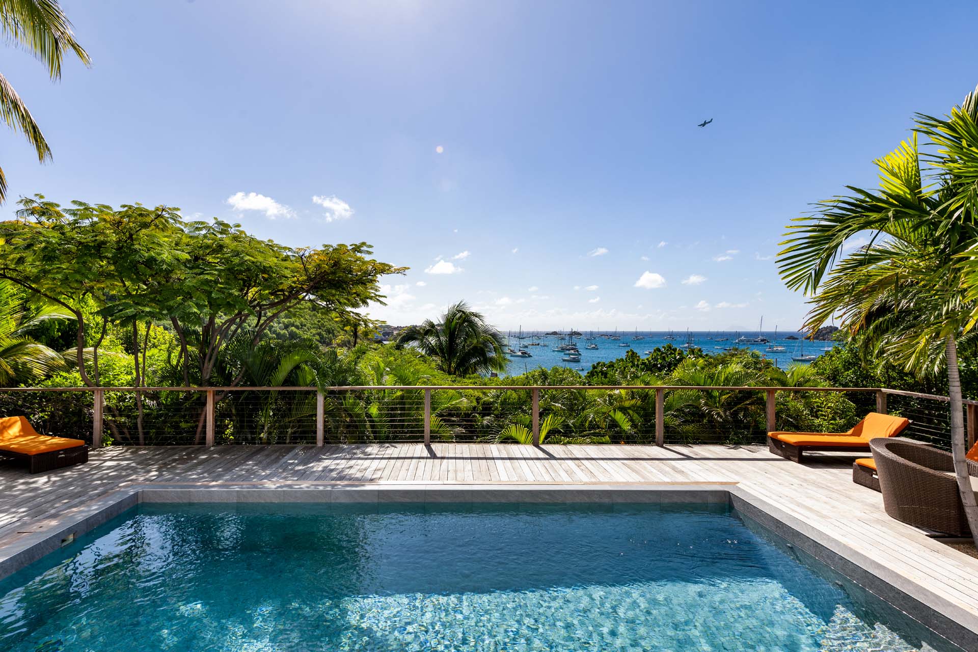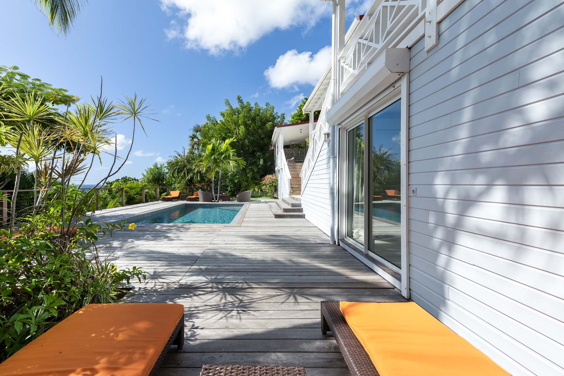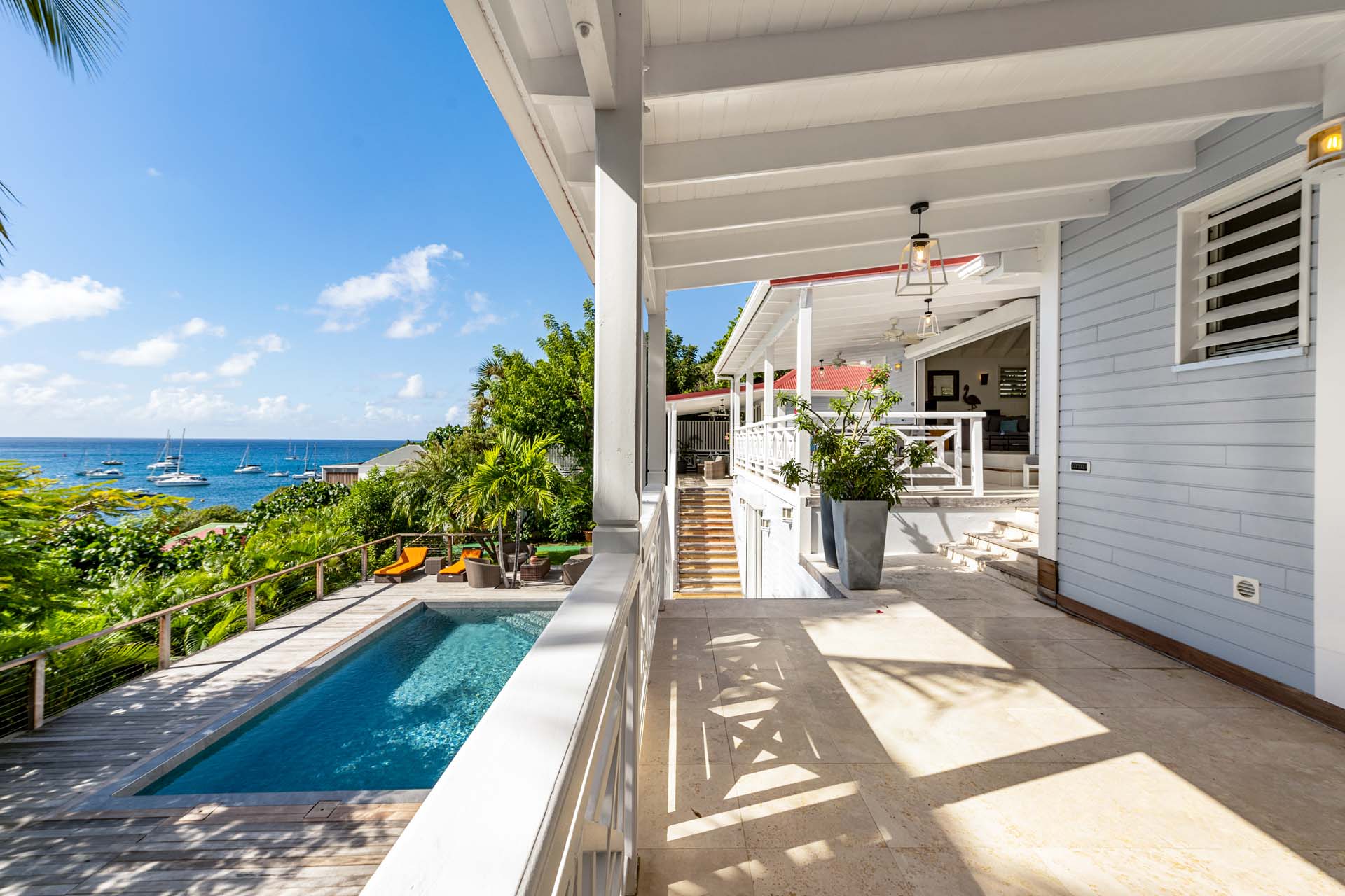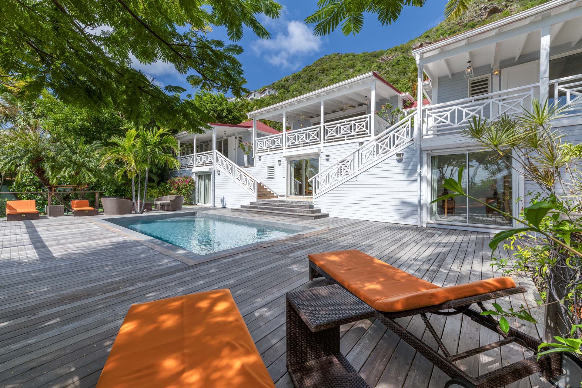 Villa Habitation Saint Louis, (villa code: WV HSL) is an authentic St. Barts 4-bedroom villa located in Corossol within a short walk of the beach and minutes from shopping. This private, hillside villa offers views of the sea and harbor. The villa is multi-level. On the main level is the living room, which has Indonesian style furniture and opens to the terrace with an ocean view. A bar separates the living area from the well-equipped kitchen. Located off the living room and kitchen is an outdoor, covered terrace with dining and sitting areas. Two of the four bedrooms are also on the main level. Both have an ensuite bathroom and open to the pool deck overlooking the bay. One bedroom has a king-size bed or twin beds, while the second bedroom has a queen-size bed. The other two bedrooms can be found on the upper level, each with king-size beds, ensuite bathroom, and a large, private terrace with view. All of the bedrooms are air-conditioned. A deck with loungers and a large day bed surround the pool, making this an ideal spot for reading poolside or sunbathing. Lush, tropical gardens surround the property. A private footpath from the villa leads to the beach. Villa Habitation Saint Louis can be rented with the villa next door, Petite Saint Louis (villa code: WV PSL), for a total of 5 bedrooms. Petite Saint Louis features a king bedroom with an ensuite bathroom, an outdoor covered terrace as well as a kitchenette, a swimming pool, and a great view.Please fill out the form to begin your inquiry and we will connect you with a seasoned villa rental specialist.