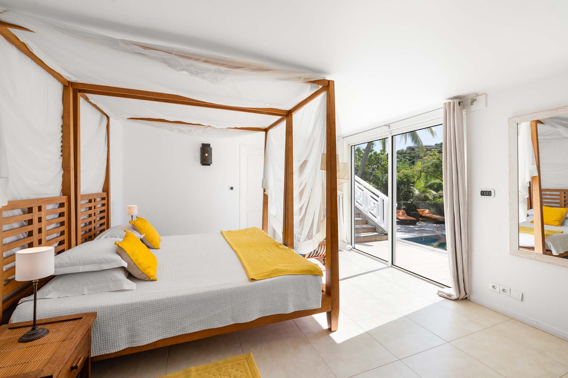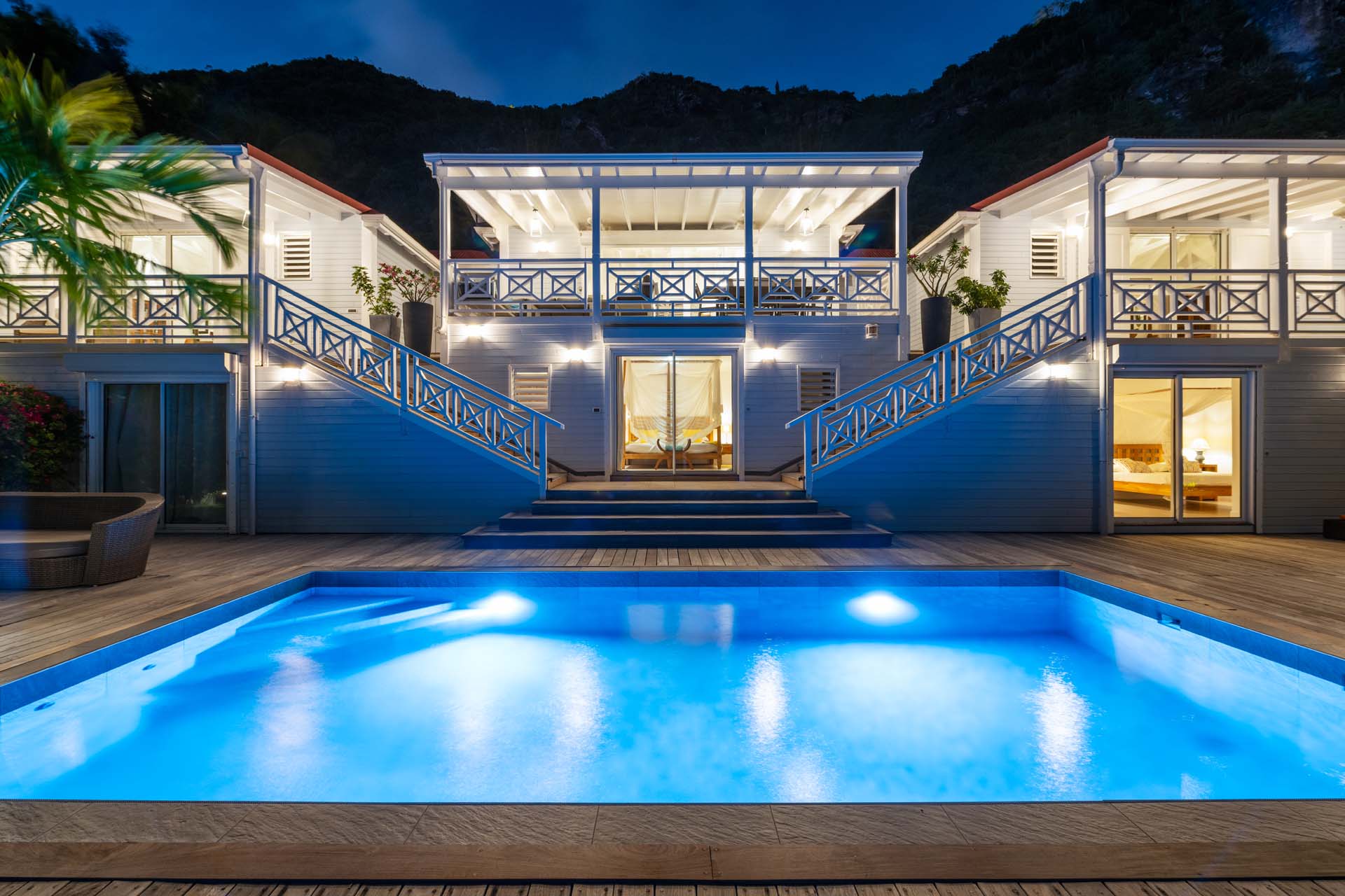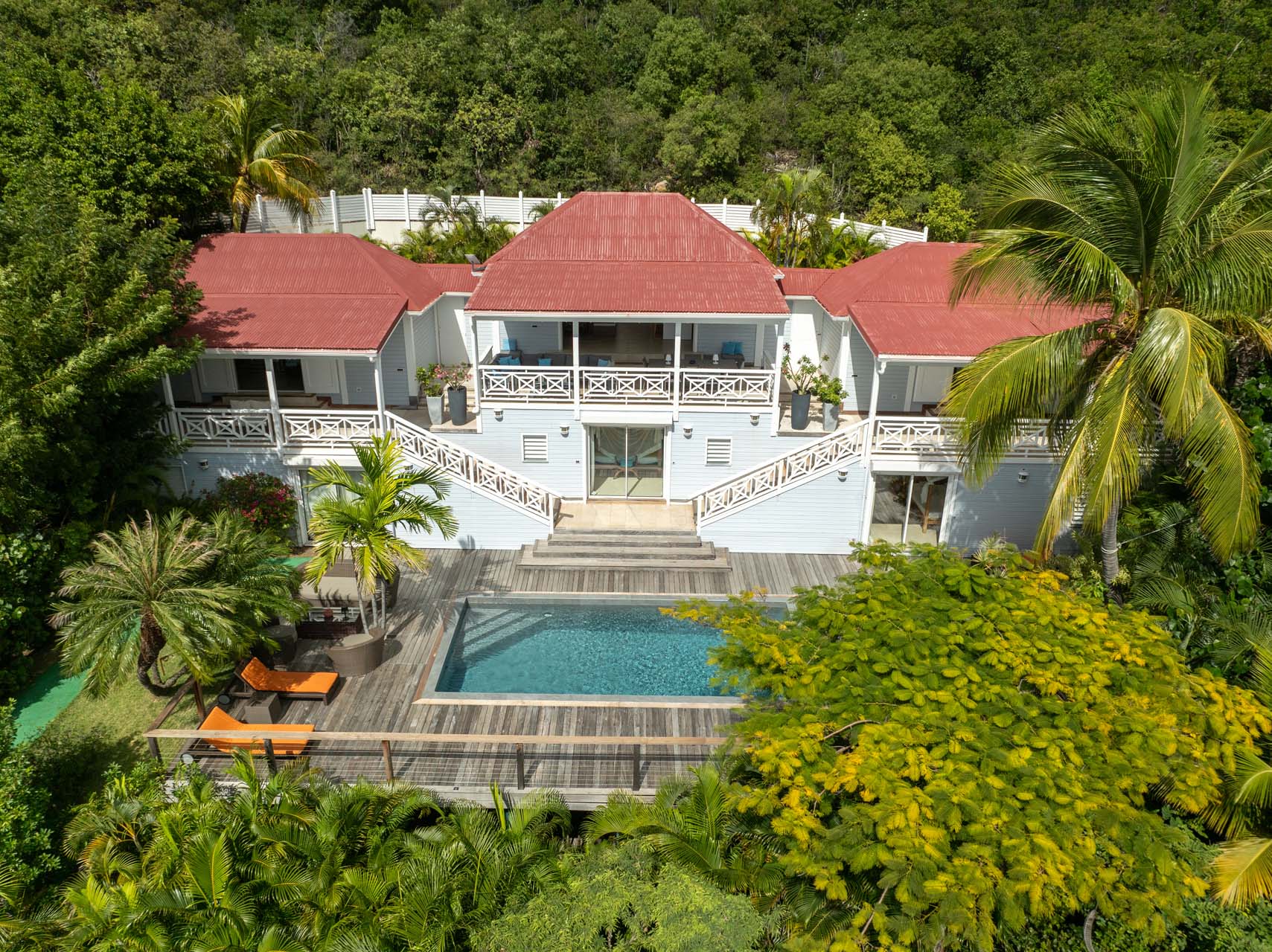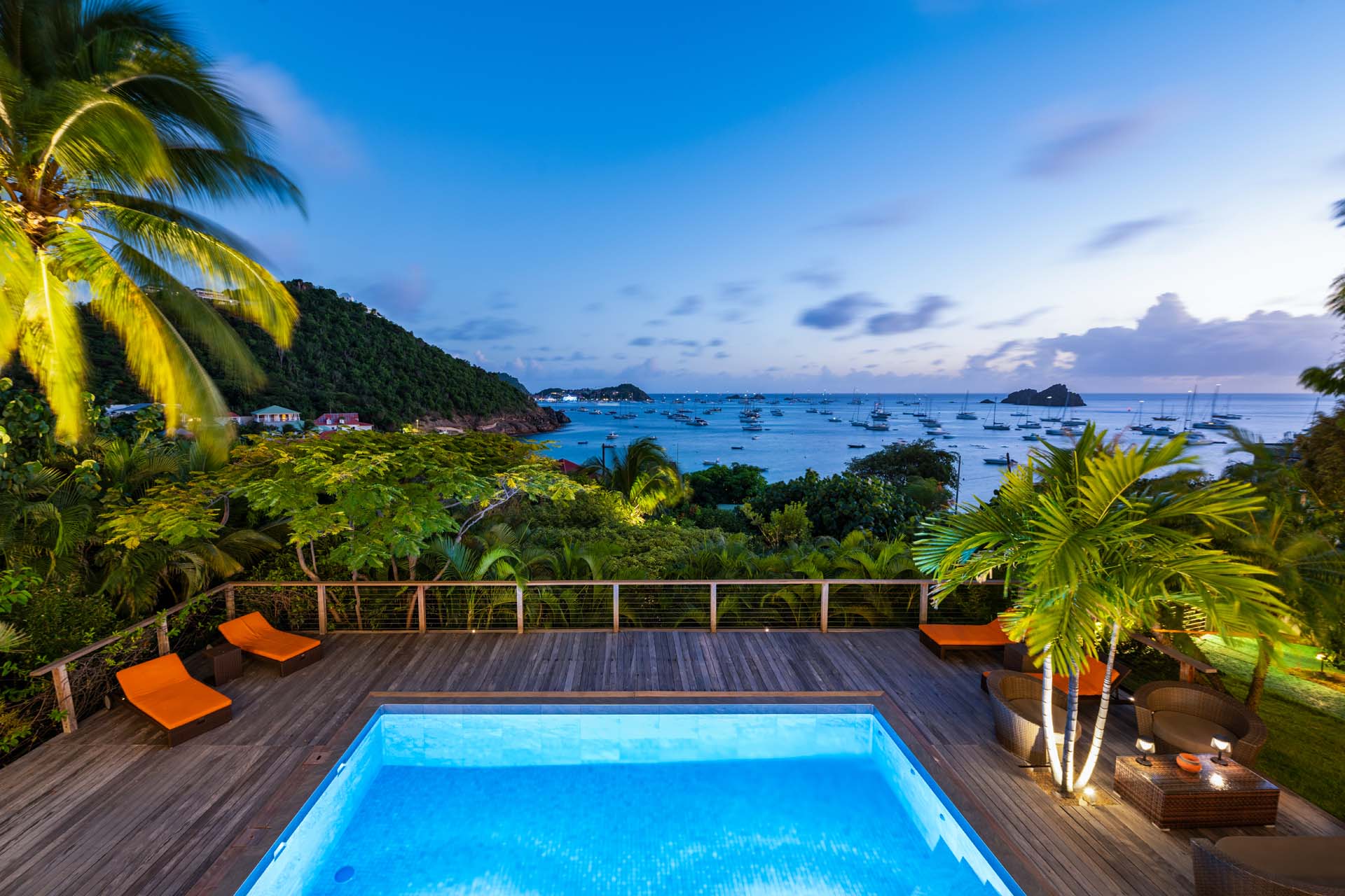 Villa Habitation Saint Louis, (villa code: WV HSL) is an authentic St. Barts 4-bedroom villa located in Corossol within a short walk of the beach and minutes from shopping. This private, hillside villa offers views of the sea and harbor. The villa is multi-level. On the main level is the living room, which has Indonesian style furniture and opens to the terrace with an ocean view. A bar separates the living area from the well-equipped kitchen. Located off the living room and kitchen is an outdoor, covered terrace with dining and sitting areas. Two of the four bedrooms are also on the main level. Both have an ensuite bathroom and open to the pool deck overlooking the bay. One bedroom has a king-size bed or twin beds, while the second bedroom has a queen-size bed. The other two bedrooms can be found on the upper level, each with king-size beds, ensuite bathroom, and a large, private terrace with view. All of the bedrooms are air-conditioned. A deck with loungers and a large day bed surround the pool, making this an ideal spot for reading poolside or sunbathing. Lush, tropical gardens surround the property. A private footpath from the villa leads to the beach. Villa Habitation Saint Louis can be rented with the villa next door, Petite Saint Louis (villa code: WV PSL), for a total of 5 bedrooms. Petite Saint Louis features a king bedroom with an ensuite bathroom, an outdoor covered terrace as well as a kitchenette, a swimming pool, and a great view.Please fill out the form to begin your inquiry and we will connect you with a seasoned villa rental specialist.