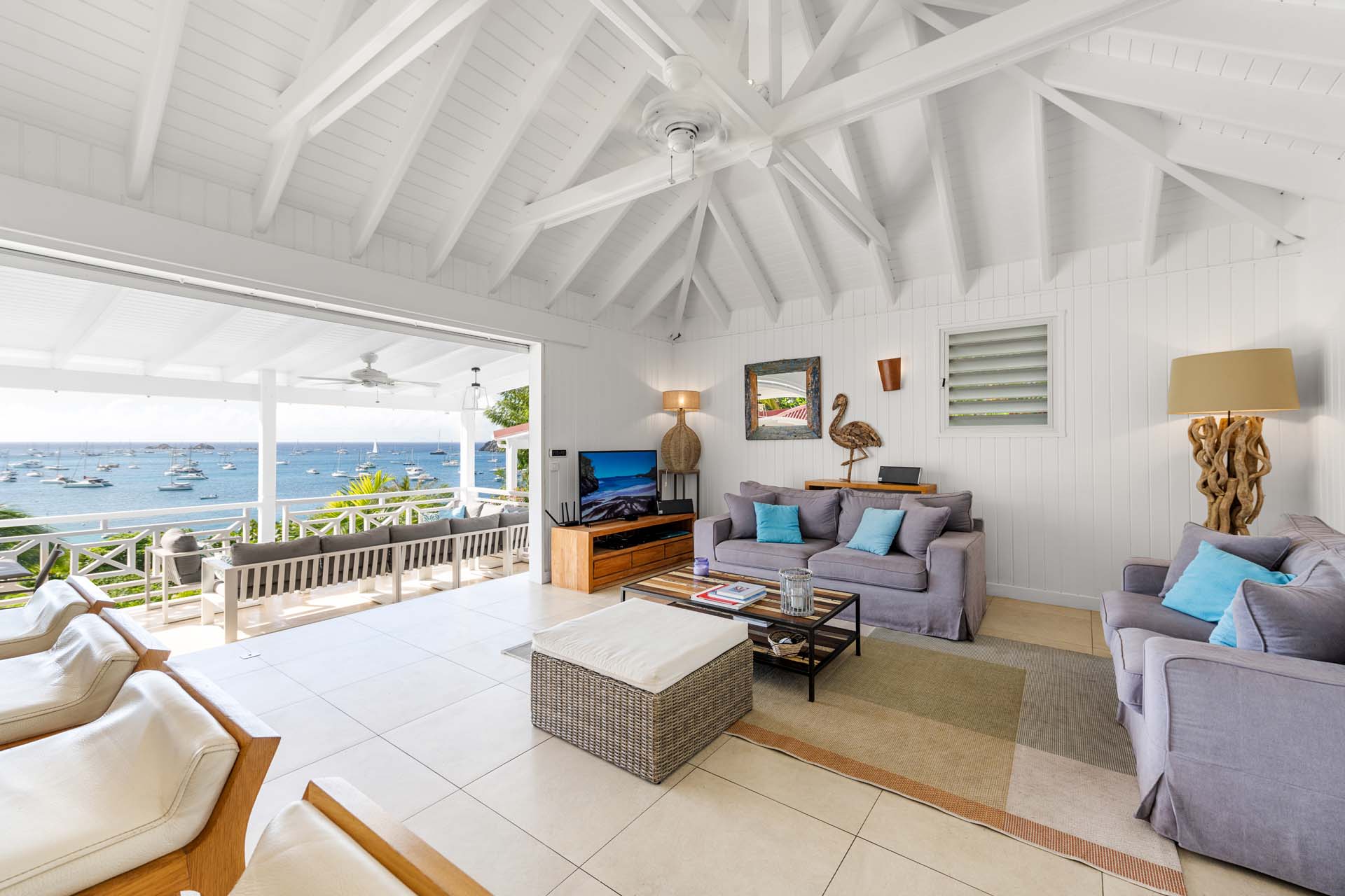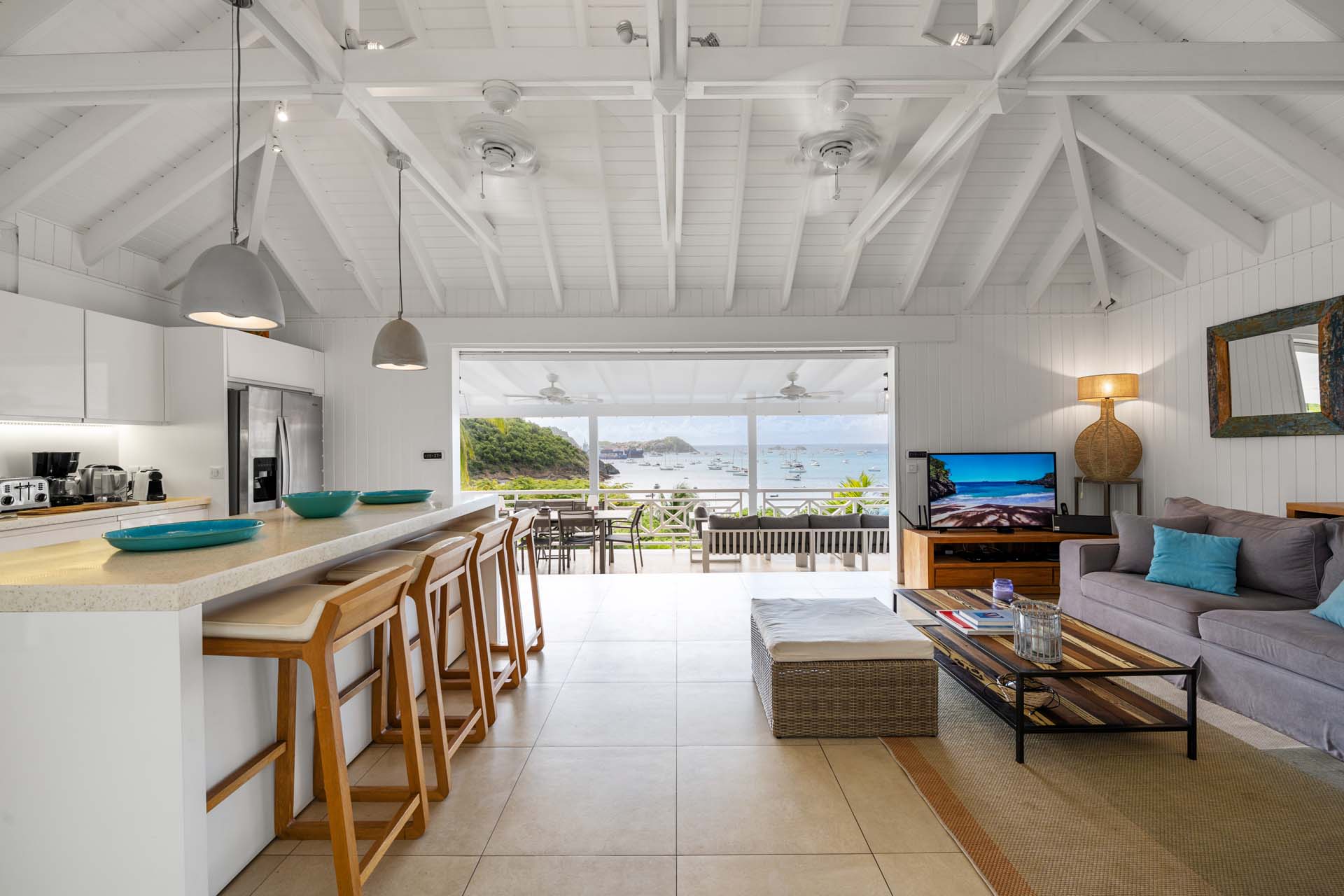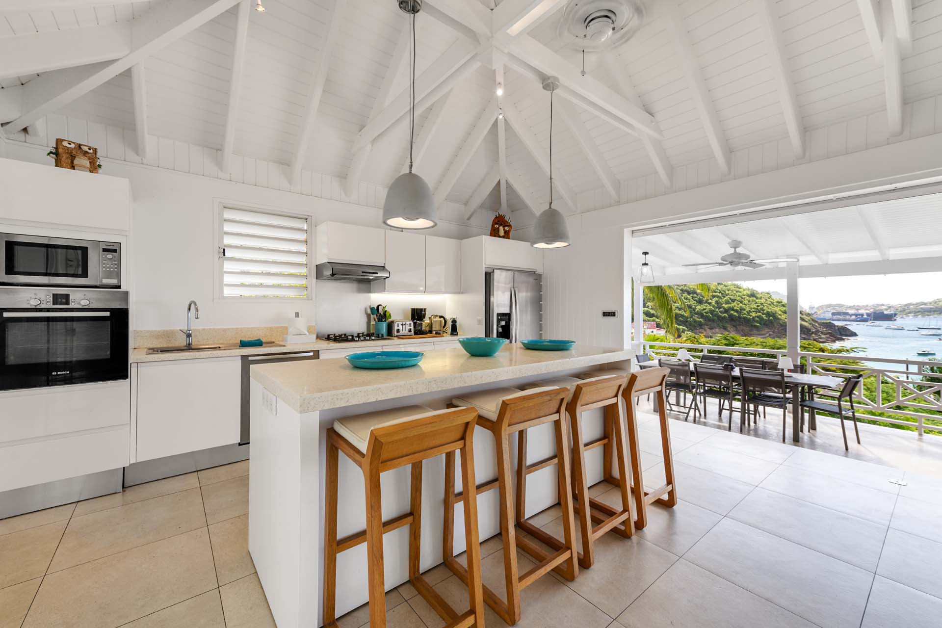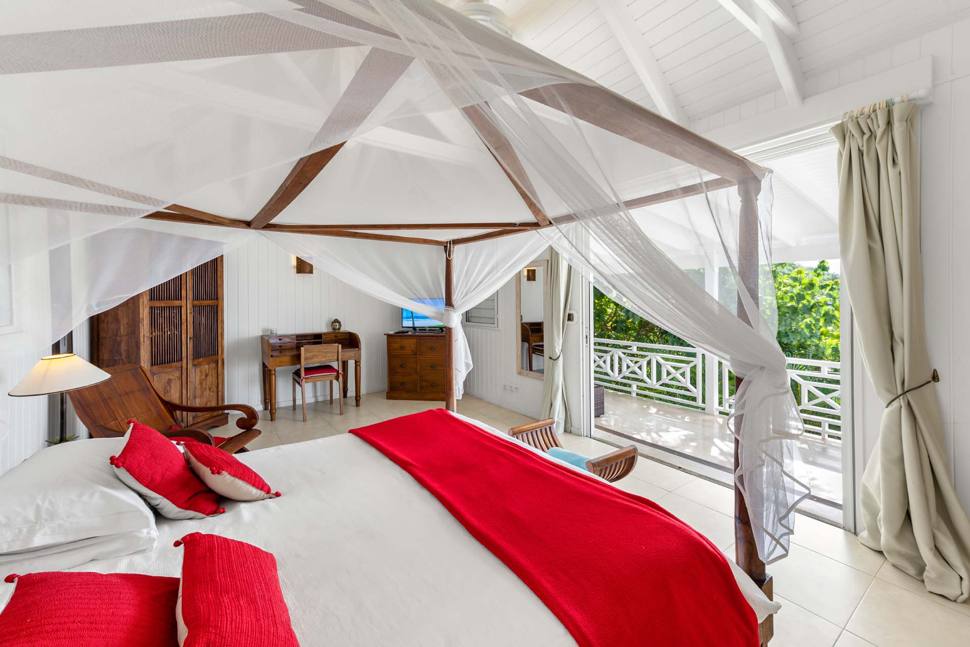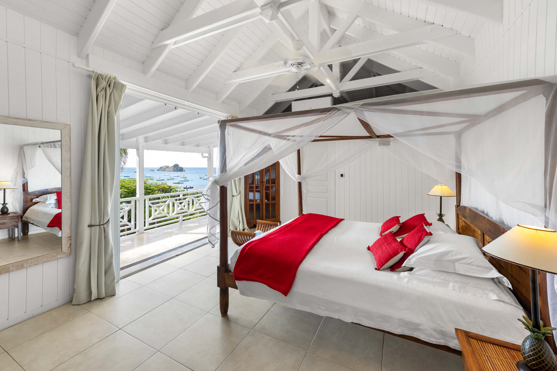 Villa Habitation Saint Louis, (villa code: WV HSL) is an authentic St. Barts 4-bedroom villa located in Corossol within a short walk of the beach and minutes from shopping. This private, hillside villa offers views of the sea and harbor. The villa is multi-level. On the main level is the living room, which has Indonesian style furniture and opens to the terrace with an ocean view. A bar separates the living area from the well-equipped kitchen. Located off the living room and kitchen is an outdoor, covered terrace with dining and sitting areas. Two of the four bedrooms are also on the main level. Both have an ensuite bathroom and open to the pool deck overlooking the bay. One bedroom has a king-size bed or twin beds, while the second bedroom has a queen-size bed. The other two bedrooms can be found on the upper level, each with king-size beds, ensuite bathroom, and a large, private terrace with view. All of the bedrooms are air-conditioned. A deck with loungers and a large day bed surround the pool, making this an ideal spot for reading poolside or sunbathing. Lush, tropical gardens surround the property. A private footpath from the villa leads to the beach. Villa Habitation Saint Louis can be rented with the villa next door, Petite Saint Louis (villa code: WV PSL), for a total of 5 bedrooms. Petite Saint Louis features a king bedroom with an ensuite bathroom, an outdoor covered terrace as well as a kitchenette, a swimming pool, and a great view.Please fill out the form to begin your inquiry and we will connect you with a seasoned villa rental specialist.