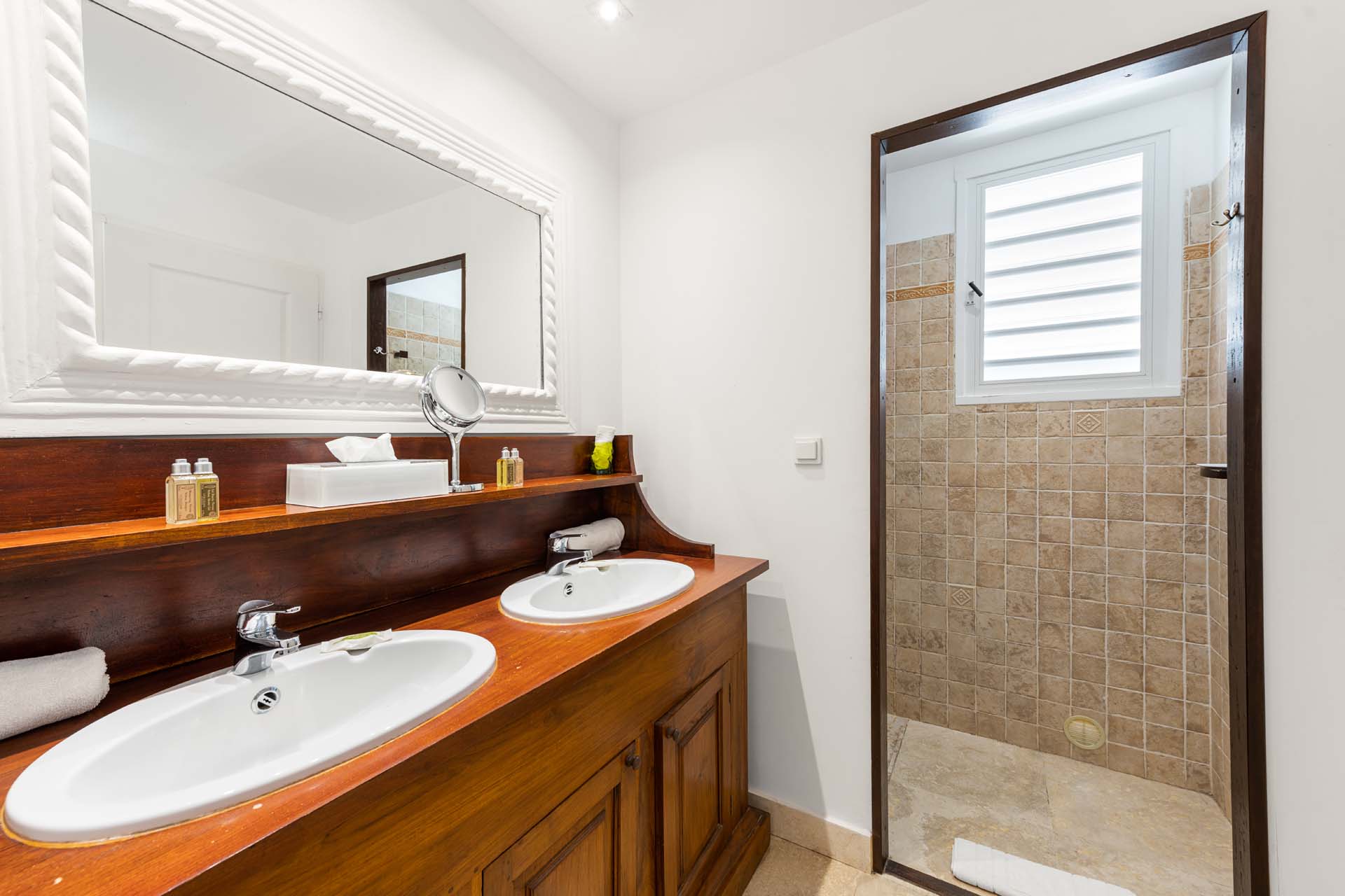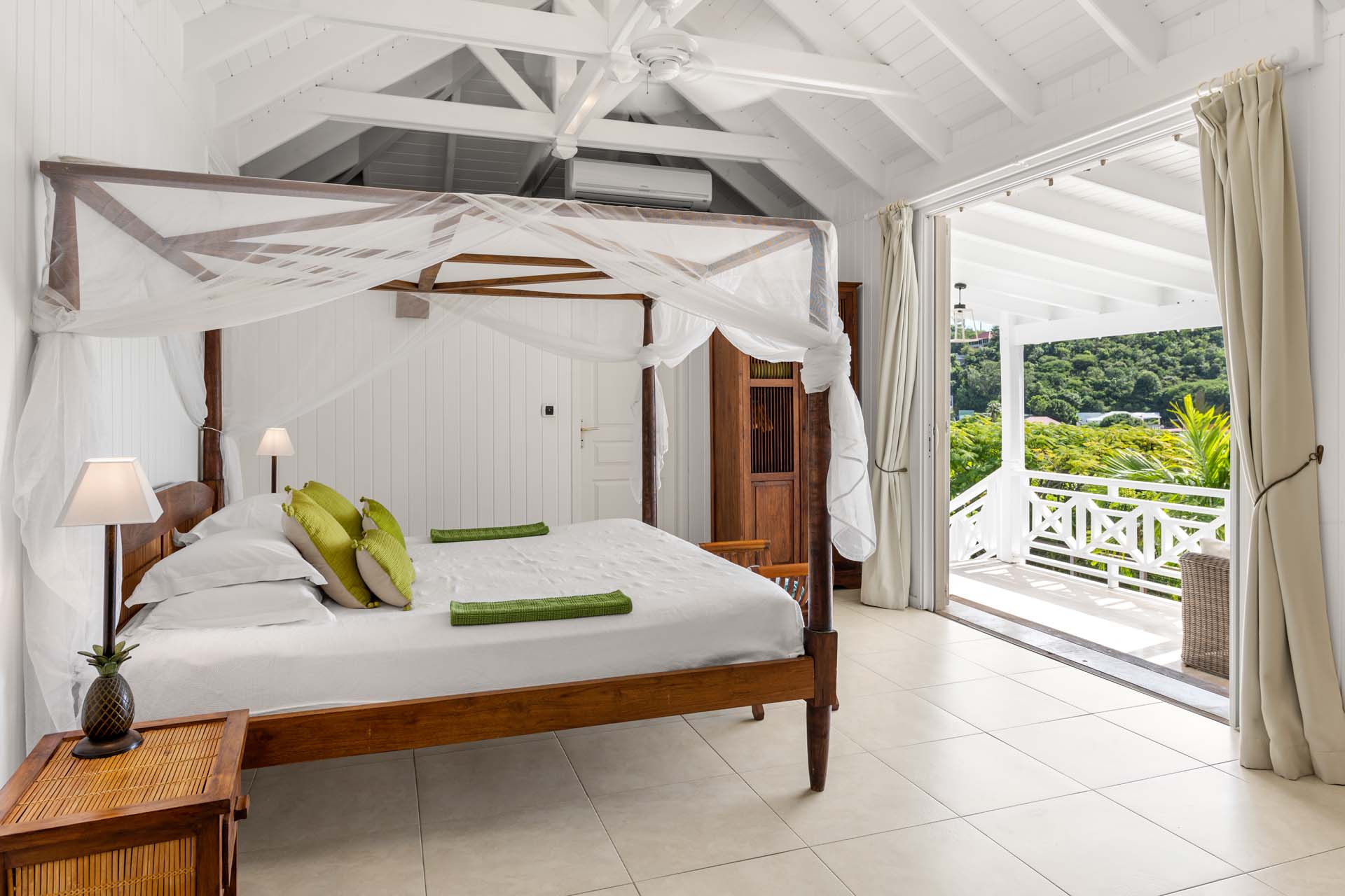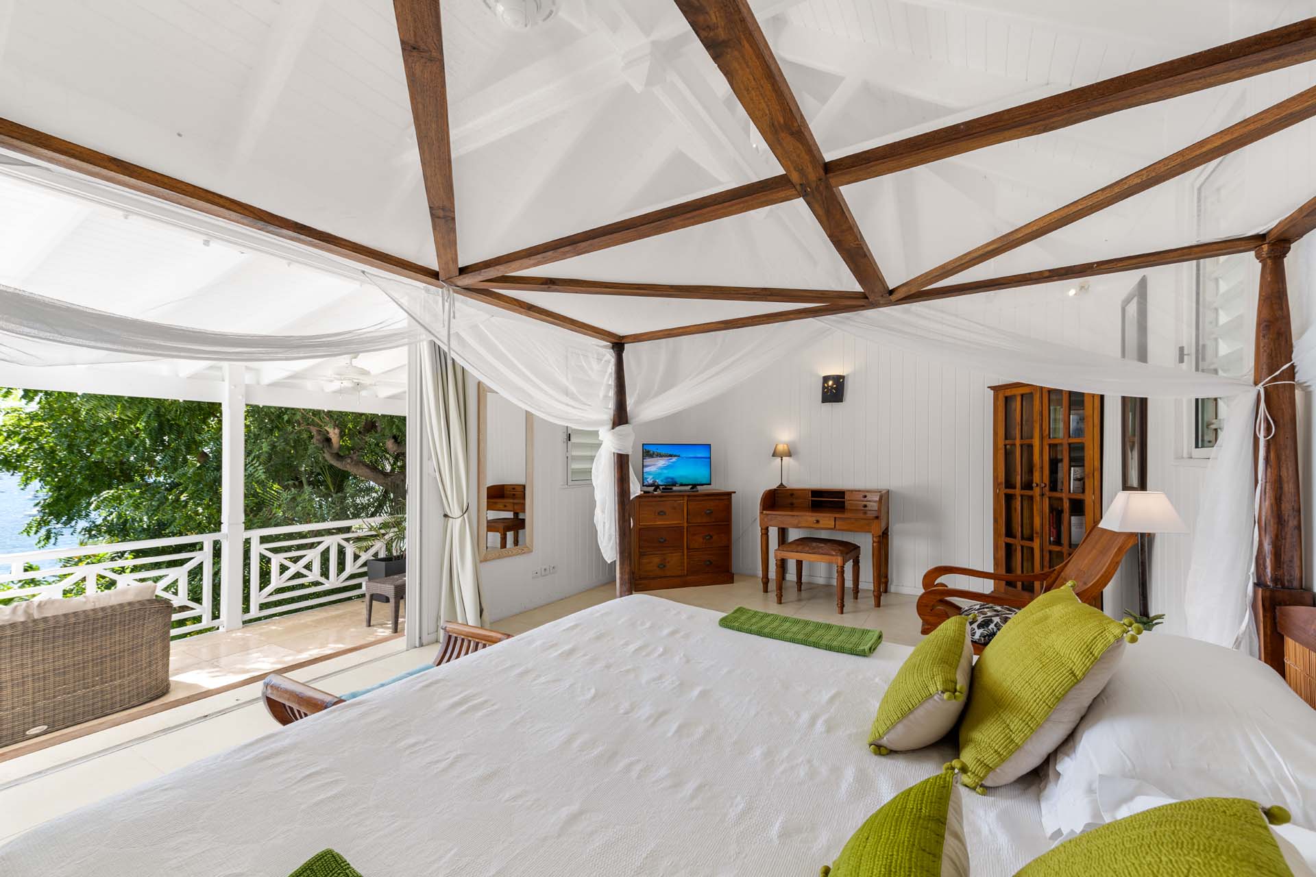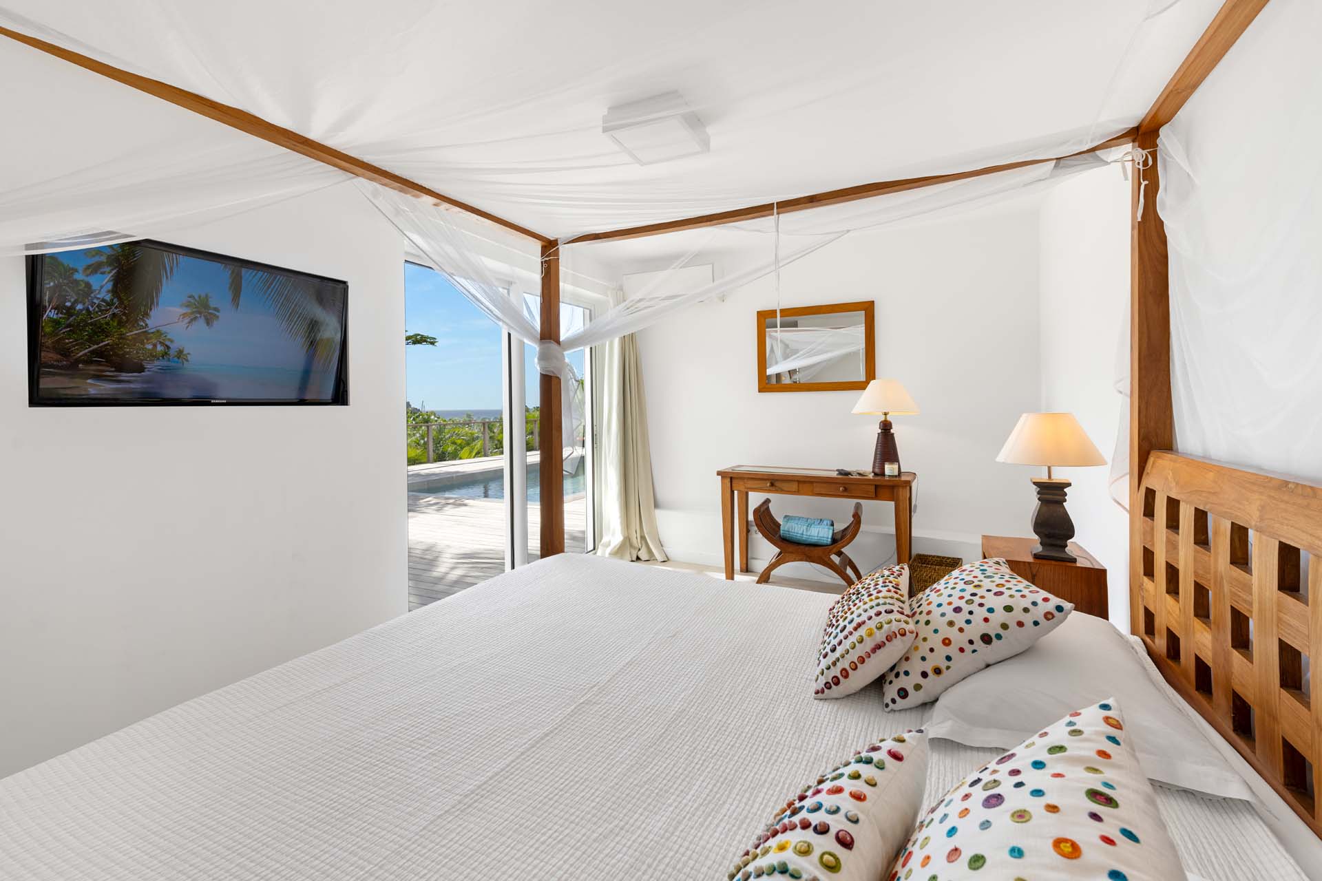 Villa Habitation Saint Louis, (villa code: WV HSL) is an authentic St. Barts 4-bedroom villa located in Corossol within a short walk of the beach and minutes from shopping. This private, hillside villa offers views of the sea and harbor. The villa is multi-level. On the main level is the living room, which has Indonesian style furniture and opens to the terrace with an ocean view. A bar separates the living area from the well-equipped kitchen. Located off the living room and kitchen is an outdoor, covered terrace with dining and sitting areas. Two of the four bedrooms are also on the main level. Both have an ensuite bathroom and open to the pool deck overlooking the bay. One bedroom has a king-size bed or twin beds, while the second bedroom has a queen-size bed. The other two bedrooms can be found on the upper level, each with king-size beds, ensuite bathroom, and a large, private terrace with view. All of the bedrooms are air-conditioned. A deck with loungers and a large day bed surround the pool, making this an ideal spot for reading poolside or sunbathing. Lush, tropical gardens surround the property. A private footpath from the villa leads to the beach. Villa Habitation Saint Louis can be rented with the villa next door, Petite Saint Louis (villa code: WV PSL), for a total of 5 bedrooms. Petite Saint Louis features a king bedroom with an ensuite bathroom, an outdoor covered terrace as well as a kitchenette, a swimming pool, and a great view.Please fill out the form to begin your inquiry and we will connect you with a seasoned villa rental specialist.