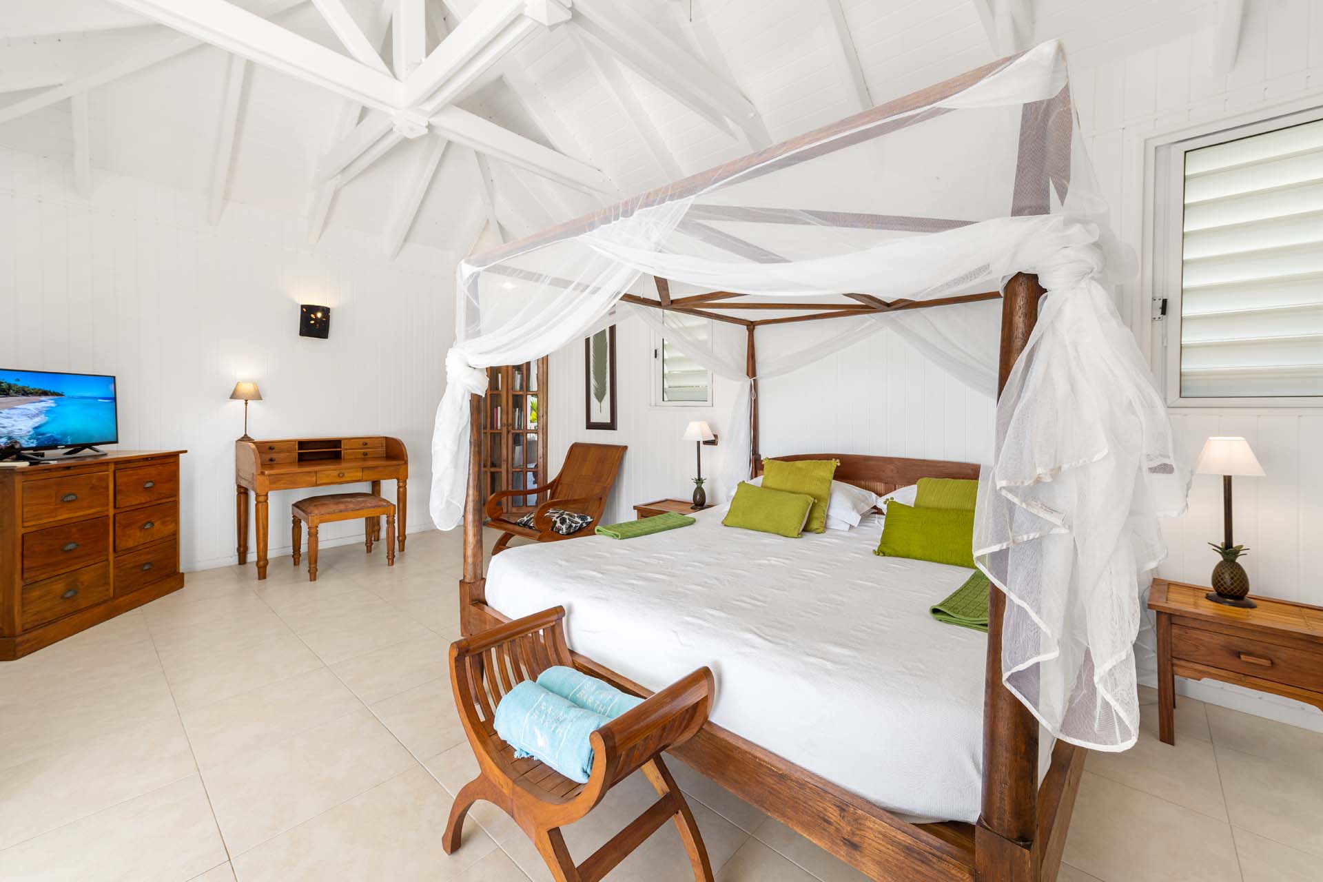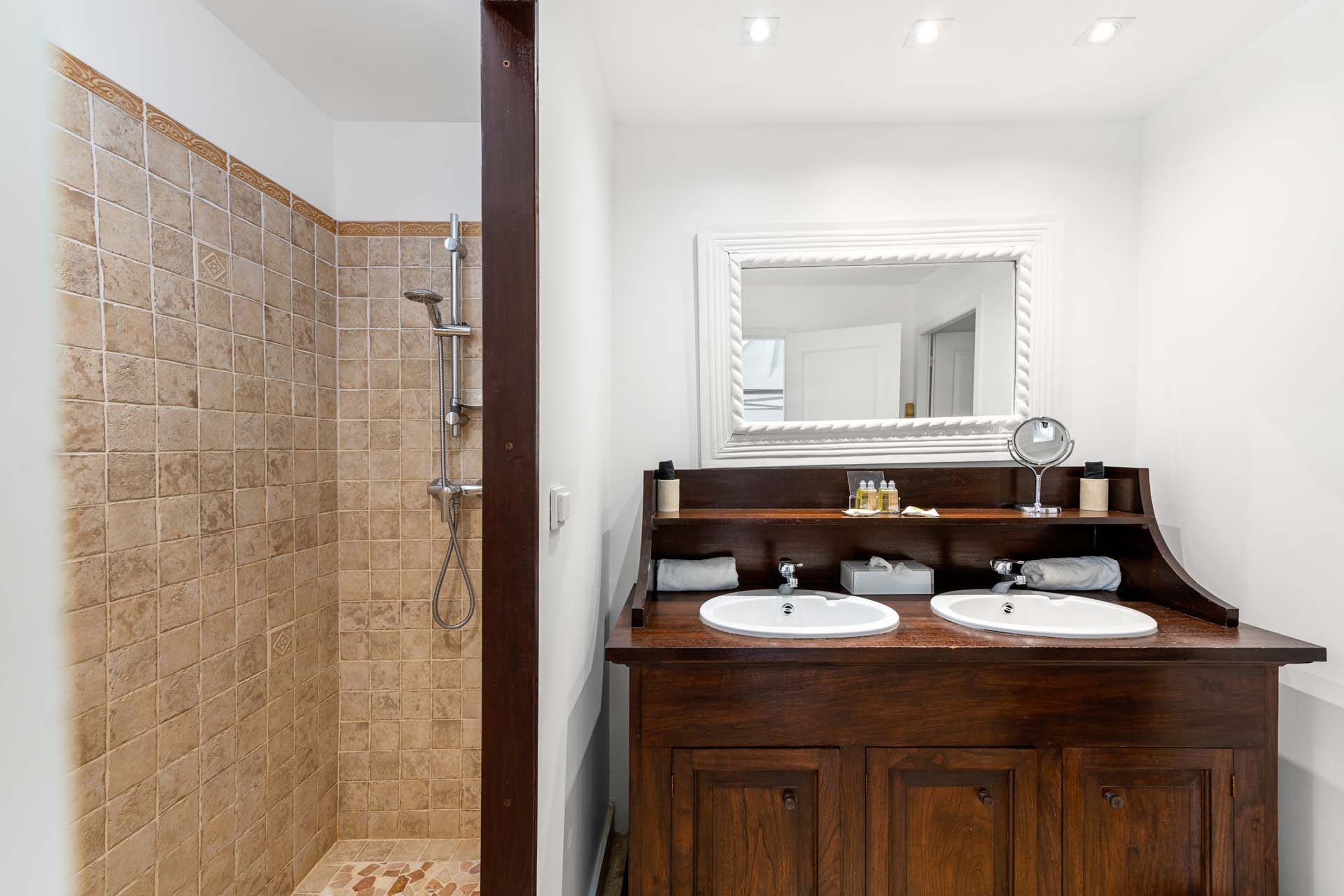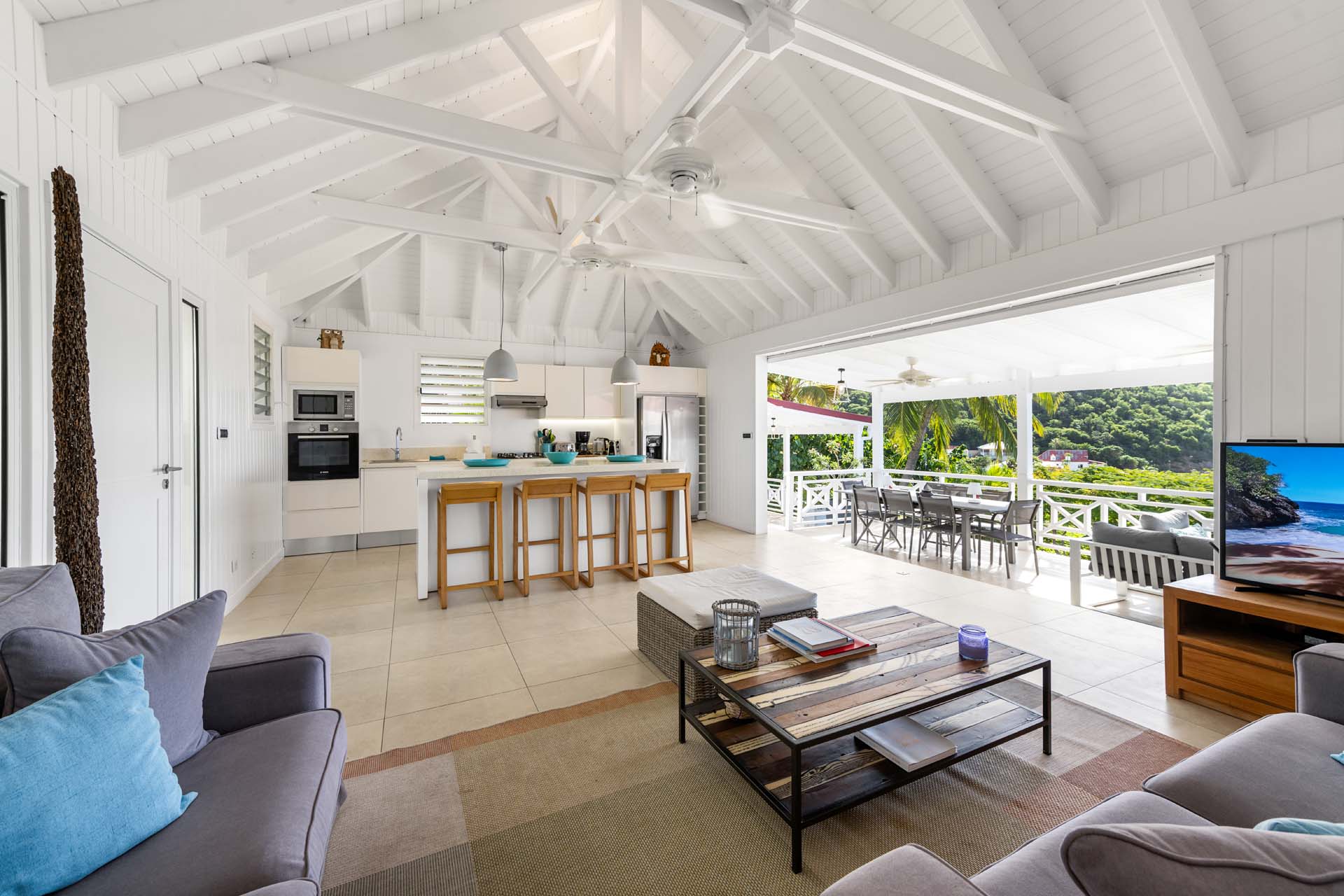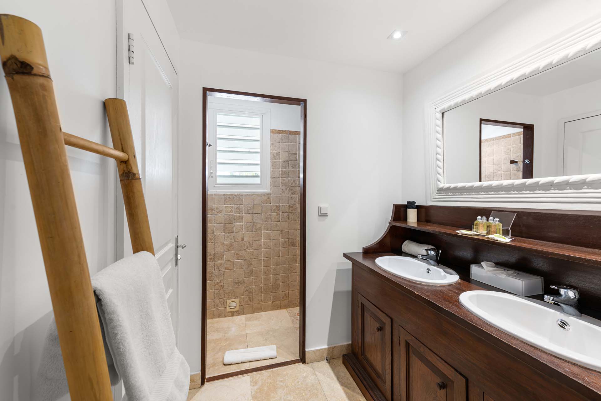 Villa Habitation Saint Louis, (villa code: WV HSL) is an authentic St. Barts 4-bedroom villa located in Corossol within a short walk of the beach and minutes from shopping. This private, hillside villa offers views of the sea and harbor. The villa is multi-level. On the main level is the living room, which has Indonesian style furniture and opens to the terrace with an ocean view. A bar separates the living area from the well-equipped kitchen. Located off the living room and kitchen is an outdoor, covered terrace with dining and sitting areas. Two of the four bedrooms are also on the main level. Both have an ensuite bathroom and open to the pool deck overlooking the bay. One bedroom has a king-size bed or twin beds, while the second bedroom has a queen-size bed. The other two bedrooms can be found on the upper level, each with king-size beds, ensuite bathroom, and a large, private terrace with view. All of the bedrooms are air-conditioned. A deck with loungers and a large day bed surround the pool, making this an ideal spot for reading poolside or sunbathing. Lush, tropical gardens surround the property. A private footpath from the villa leads to the beach. Villa Habitation Saint Louis can be rented with the villa next door, Petite Saint Louis (villa code: WV PSL), for a total of 5 bedrooms. Petite Saint Louis features a king bedroom with an ensuite bathroom, an outdoor covered terrace as well as a kitchenette, a swimming pool, and a great view.Please fill out the form to begin your inquiry and we will connect you with a seasoned villa rental specialist.