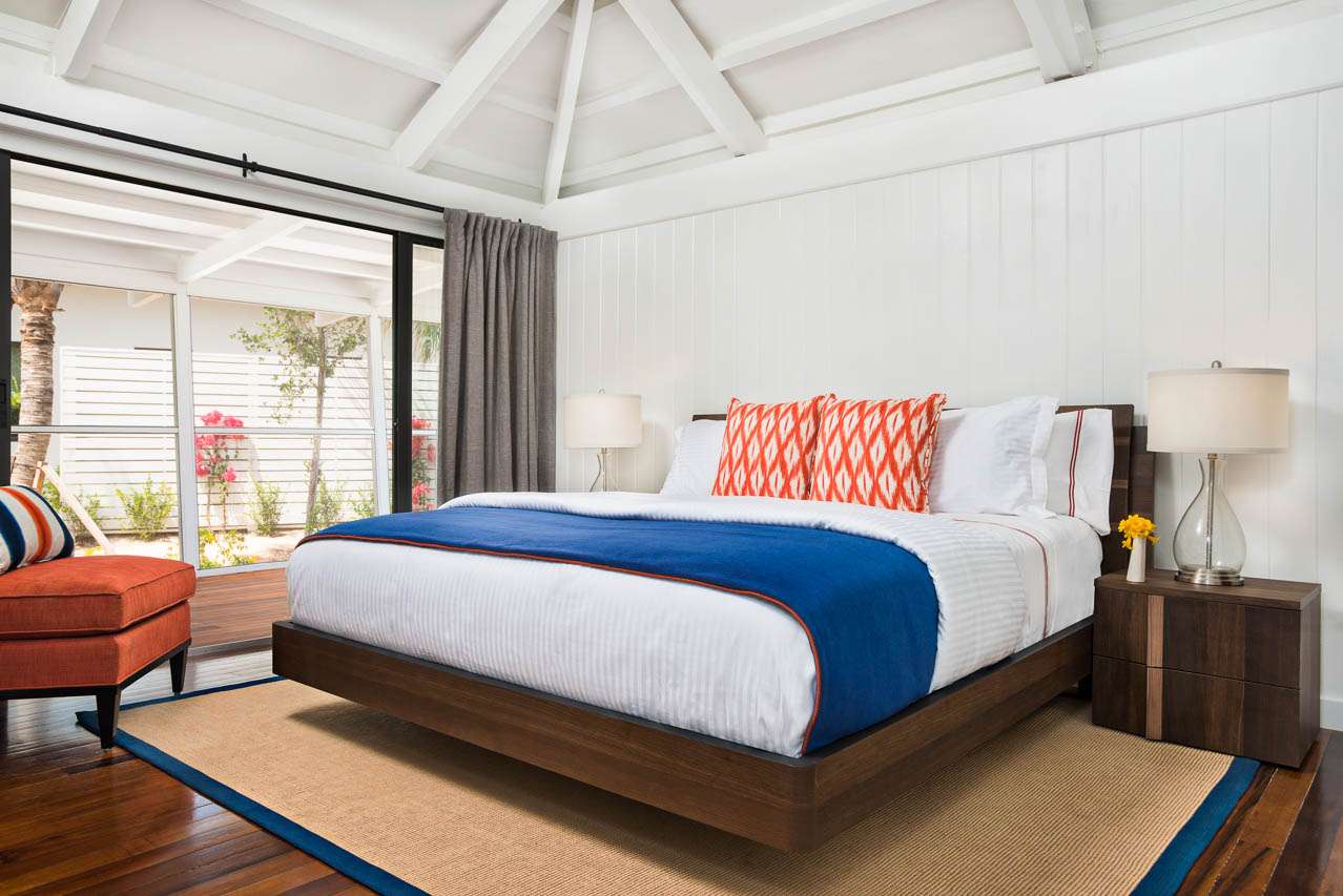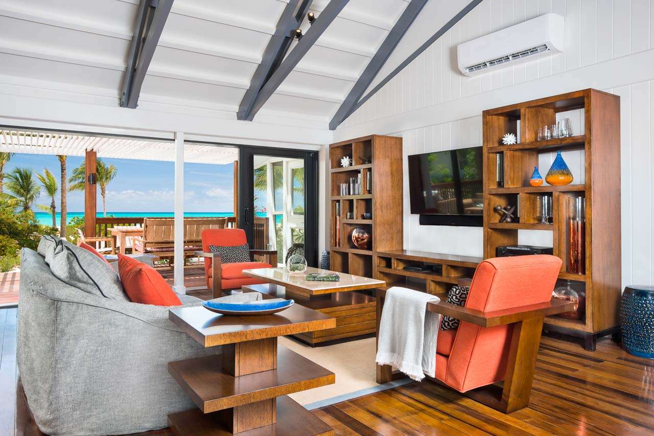 The whimsical interior of the Villa Hawksbill Beach House will sweep you away. Flowing from the white sand, the stylish open-plan villa contains a living room, formal dining area, and modern kitchen. Tropical ocean breezes blow into the contemporary grey and white interior. Vaulted ceilings with exposed wooden beams add a rustic, beachy vibe to the entire space.