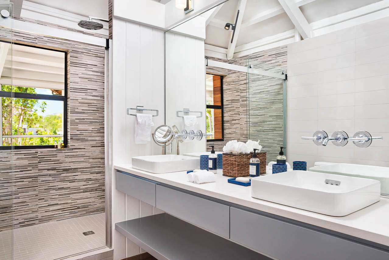 Villa Hawksbill Beach House sleeps up to seven guests in its three bedrooms. Two come with a palatial king-sized bed promising incredible comfort, luxury, and deep sleep. With a ceiling fan and TV, the bedrooms act as the perfect sanctuary to retreat into and recharge. The third bedroom is located on the lower level and comes with a twin bunk bed over a queen bed and ensuite bathroom.