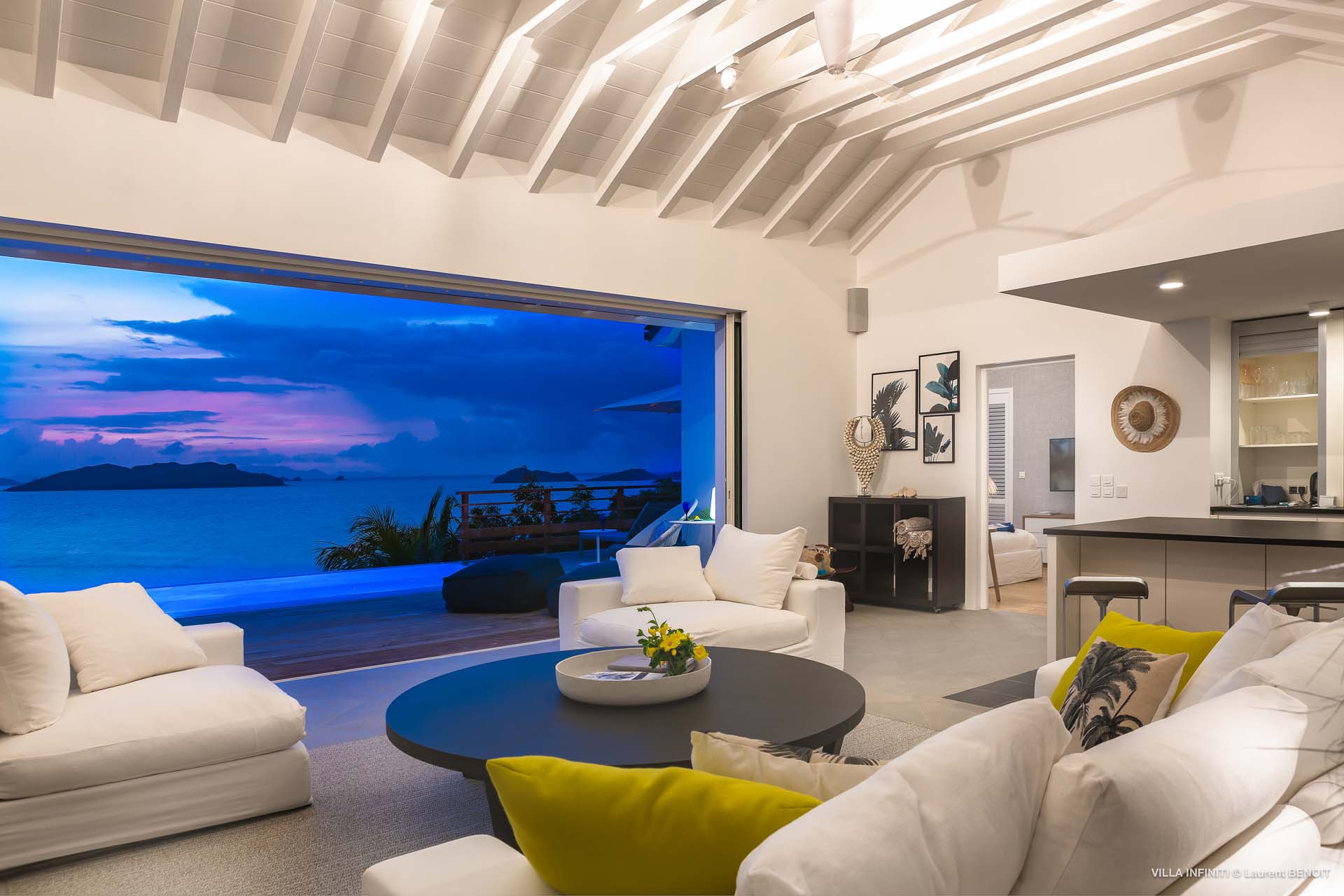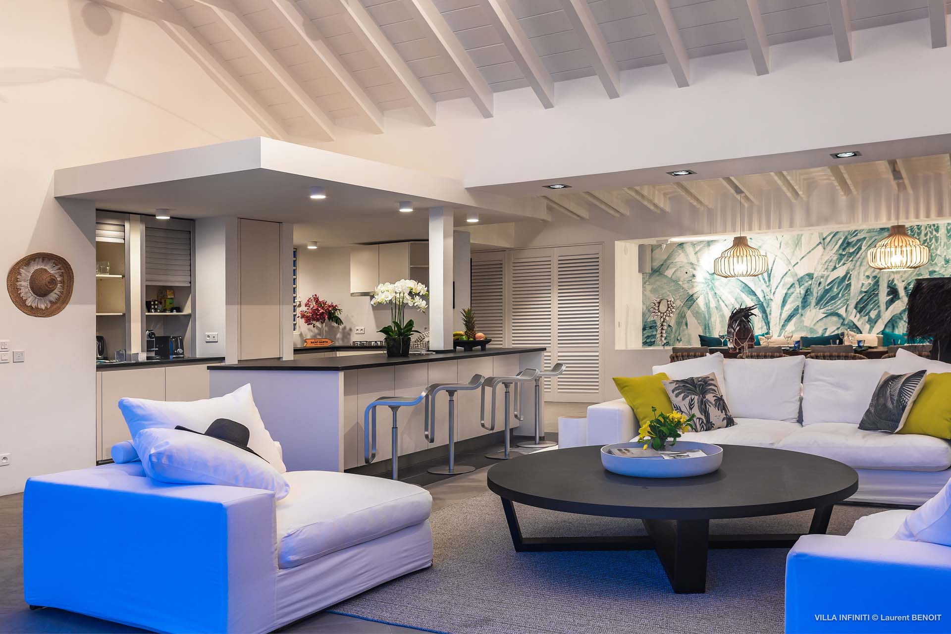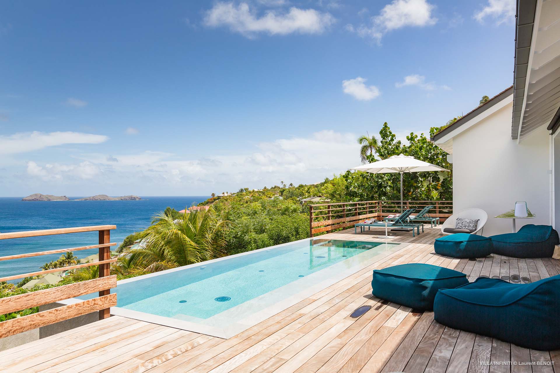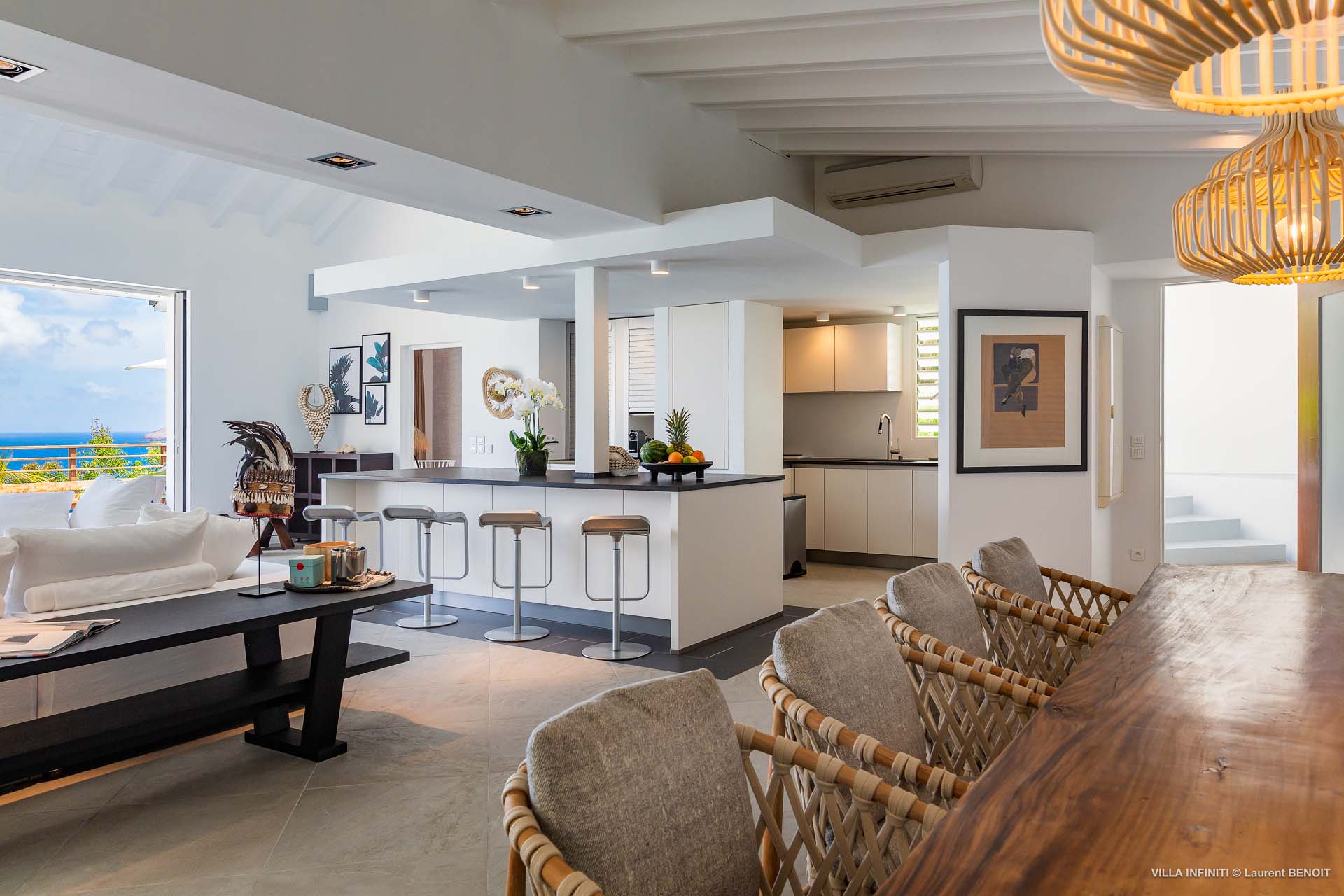 Embrace the good life at Villa Infinity (villa code: WV INF), an idyllic 3-bedroom villa in the popular area of Pointe Milou, St. Barts. This is a lively Caribbean villa with expansive views, a delightful and modern home imbued with the warmth and elegance of the island. Villa Infinity was recently-renovated to contemporary standards, and the results are wonderful. The design takes a fun approach to the island style, with the all-white walls contrasted by loud feature wallpapers, beautiful wicker dining chairs and light fixtures, and pops of color in the artwork that adorns the wall. Villa Infinity sits about halfway up the hillside above Hotel Christopher, and fully benefits from the famous views the hotel is known for. The immersive ocean views are only broken up by the offshore islands, and the sunset views are incredible. The nearest beach is a 5-minute drive, while the boutique shops and restaurants in St. Jean are 10 minutes by car. The well-designed main room inside Villa Infinity features an inviting open-concept floor plan. Gorgeous island light washes through the space, bathing the furnishings in touches of gold in a heady mix of Caribbean color. The living area is furnished with comfortable couches and chairs, set in such a way to be able to fully take in the view. It’s an idyllic place to kick back and relax, slipping into the slow pace of life in St. Barts. Next to the living area is Villa Infinity’s modern kitchen, complete with a breakfast island. With all the modern conveniences for cooking, this space makes it tempting to stay in and prepare your meals at home. Our concierge could even organize a grocery delivery, or for a special occasion, a private chef. The kitchen is within easy serving distance of the cozy indoor dining table, with seating for eight guests. With the azure blues of the feature wall right behind, it’s an atmospheric spot for a gourmet island meal. There are 3 bedrooms inside Villa Infinity, contemporary and quiet spaces for relaxing and recharging each evening. There are two bedrooms on the main floor, located on either side of the living room, one of which is the master suite. This room is slightly bigger than the others, with a king-sized bed and a spacious ensuite with a shower that can be opened to the outside. The other bedroom on the main level has a king-sized bed. The third bedroom is on the lower level, also with a king-sized bed. Each bedroom features an ensuite bathroom, with an open layout and no door dividing the two spaces. Outside, Villa Infinity gets its name from the stunning infinity pool at the edge of the terrace, breaking up the horizon. Cool and refreshing, you could easily spend a day lounging in the water and gazing out at the shimmering blue hues of the Caribbean below. There are plenty of loungers for sunbathing, and a large gazebo in the far corner is a gorgeous setting for alfresco meals. As the afternoon fades, there’s nothing quite like kicking back in one of the plush daybeds, drinking in hand, and admiring the golden sunset unfolding across the sea and sky. During the December holiday the villa rents at the full occupancy rate regardless of how many bedrooms are used.Please fill out the form to begin your inquiry and we will connect you with a seasoned villa rental specialist.
