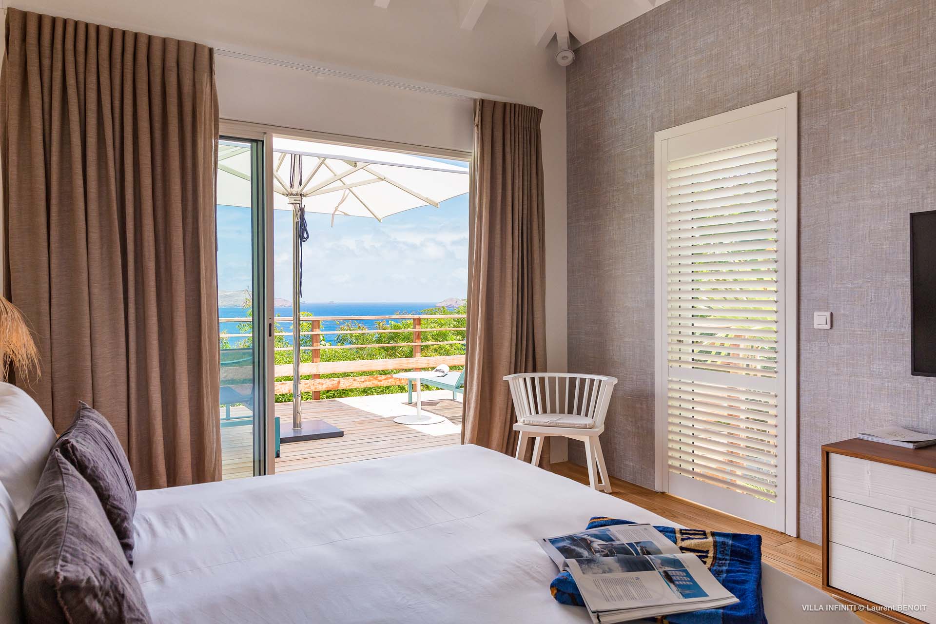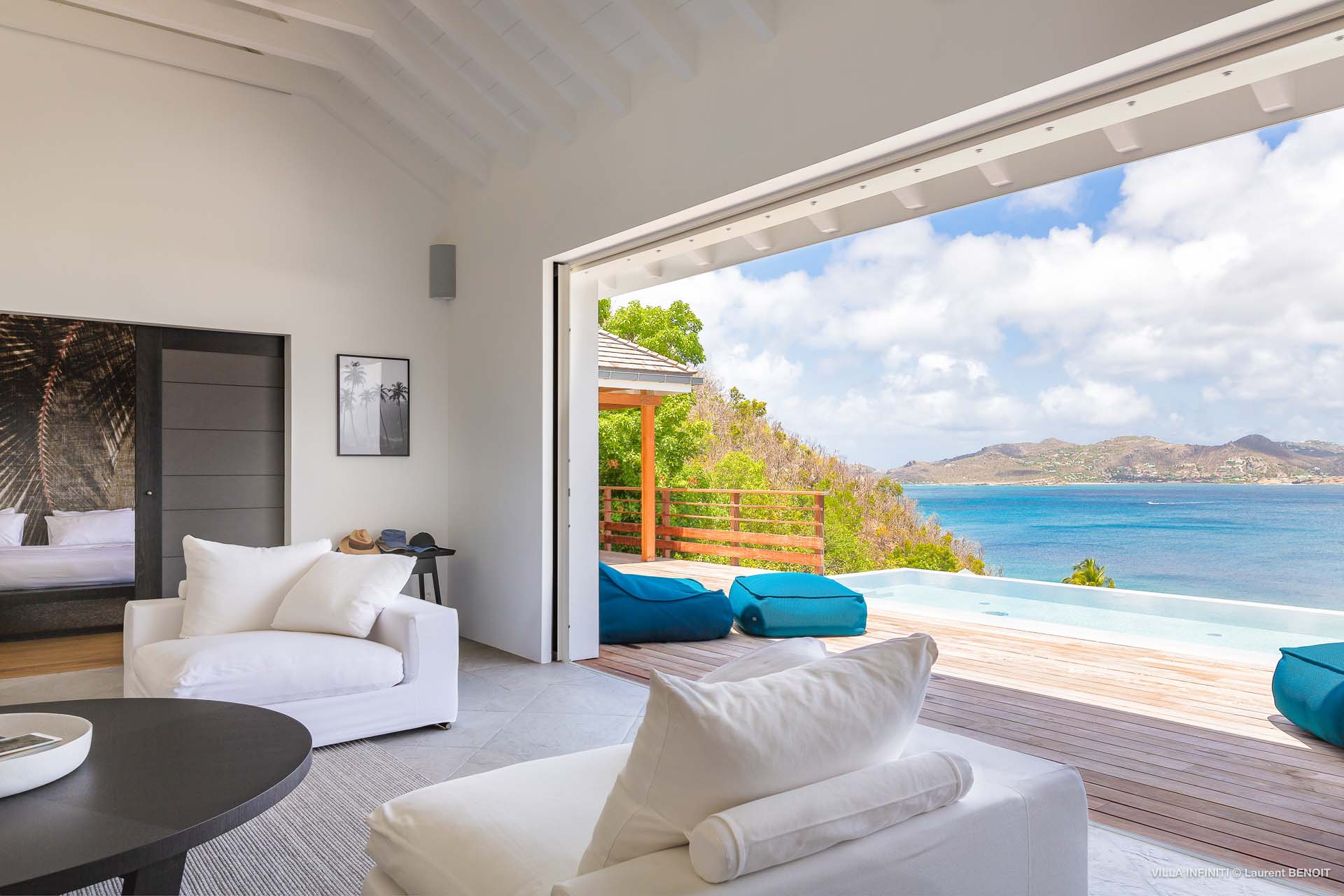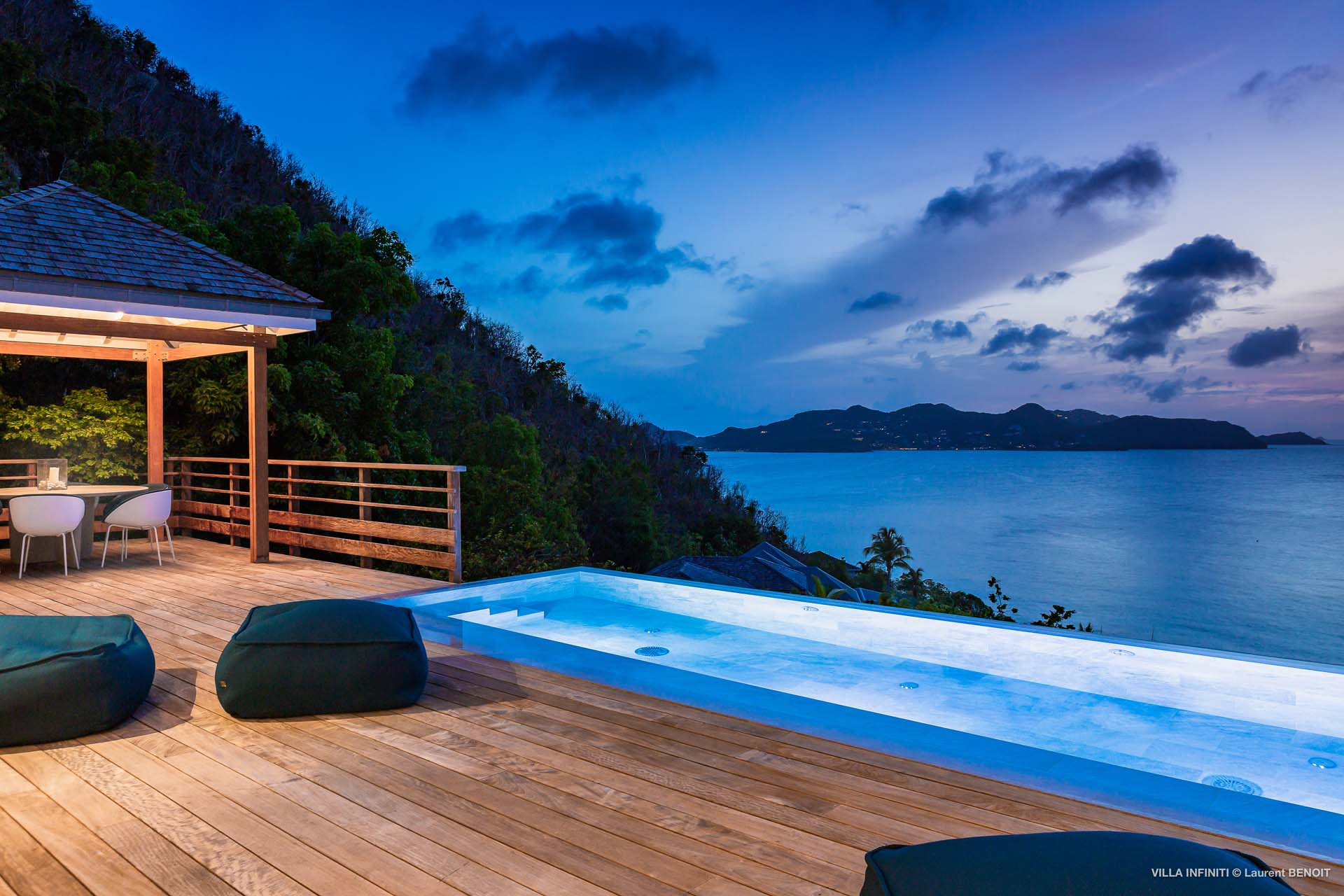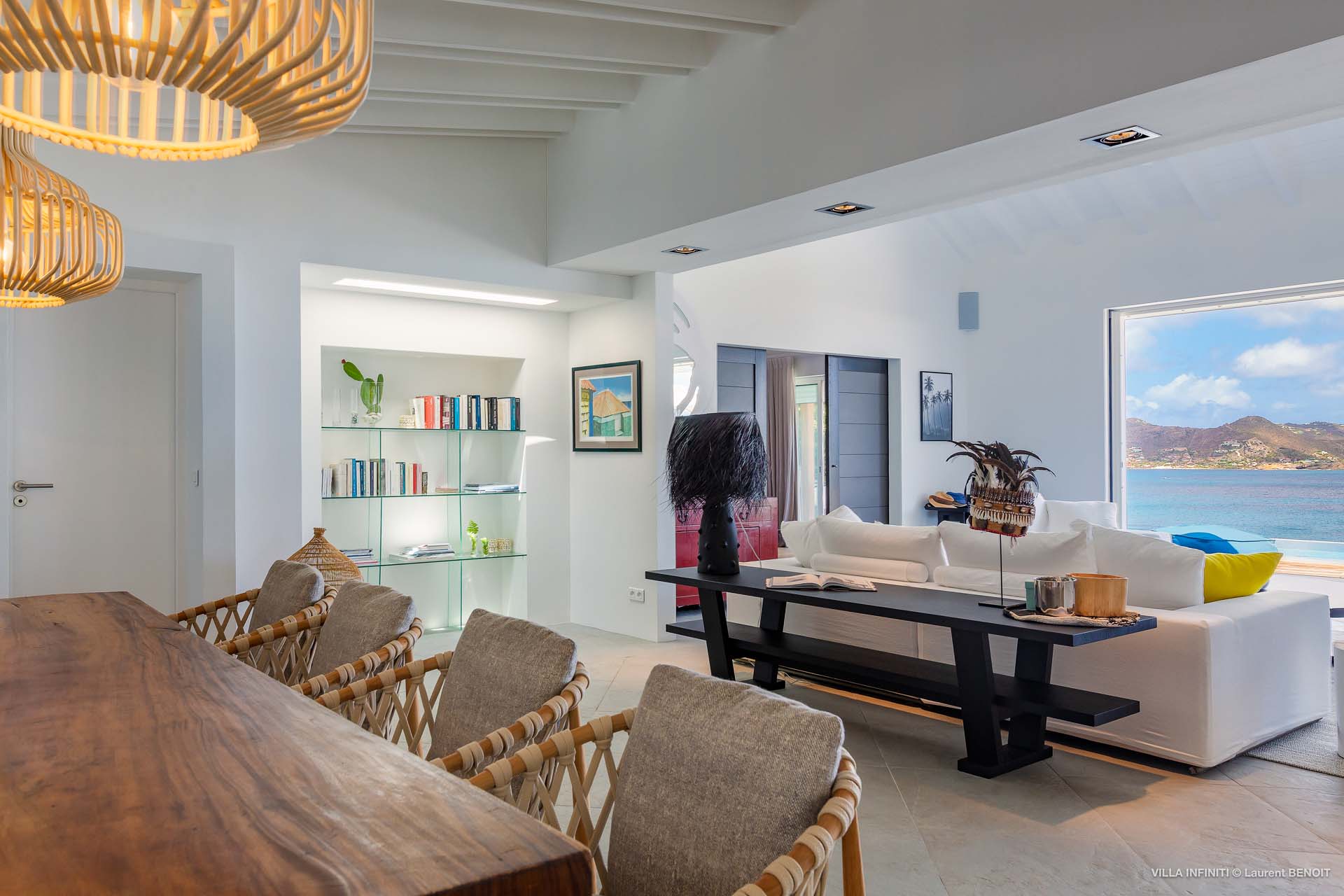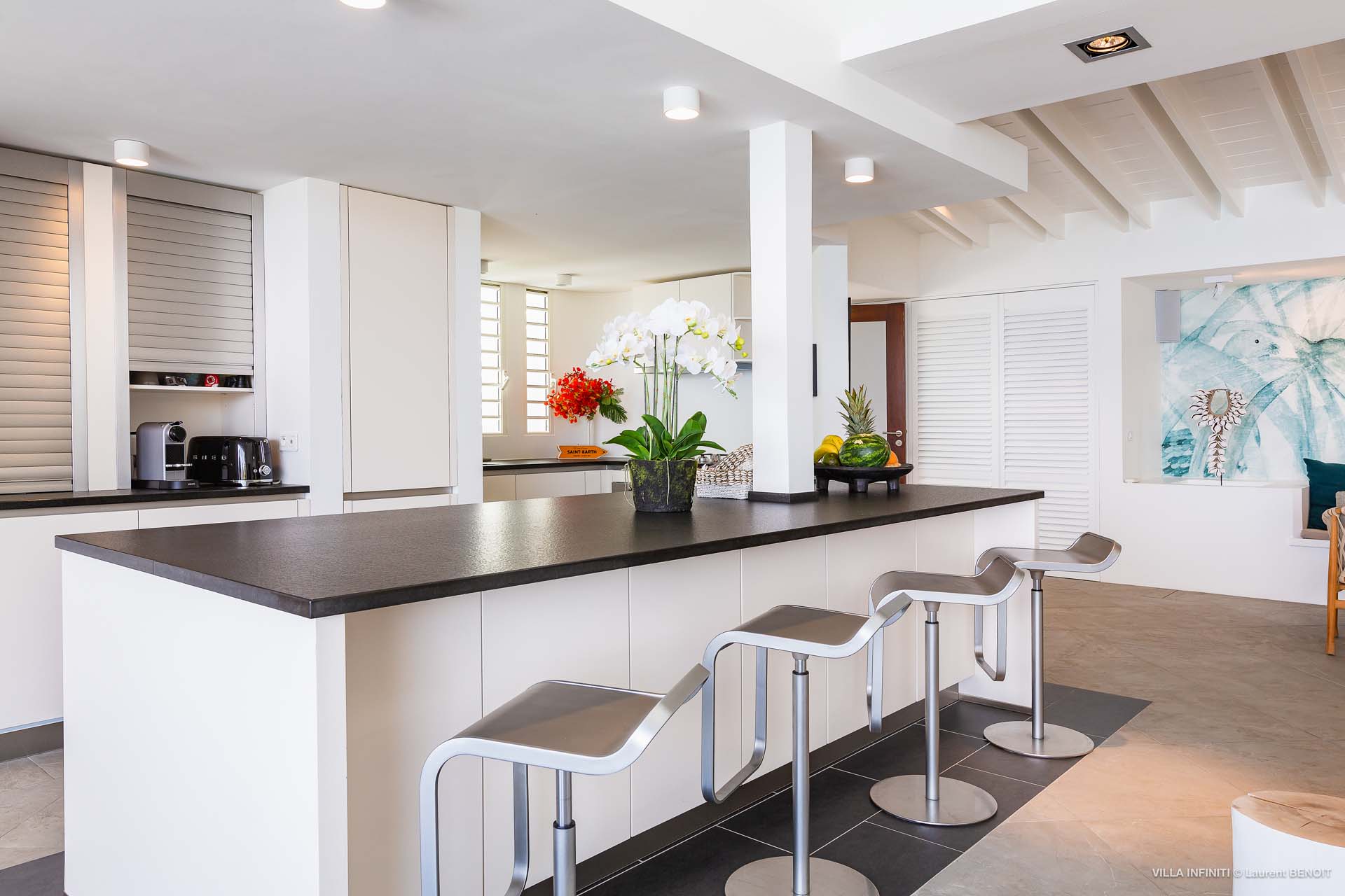 Embrace the good life at Villa Infinity (villa code: WV INF), an idyllic 3-bedroom villa in the popular area of Pointe Milou, St. Barts. This is a lively Caribbean villa with expansive views, a delightful and modern home imbued with the warmth and elegance of the island. Villa Infinity was recently-renovated to contemporary standards, and the results are wonderful. The design takes a fun approach to the island style, with the all-white walls contrasted by loud feature wallpapers, beautiful wicker dining chairs and light fixtures, and pops of color in the artwork that adorns the wall. Villa Infinity sits about halfway up the hillside above Hotel Christopher, and fully benefits from the famous views the hotel is known for. The immersive ocean views are only broken up by the offshore islands, and the sunset views are incredible. The nearest beach is a 5-minute drive, while the boutique shops and restaurants in St. Jean are 10 minutes by car. The well-designed main room inside Villa Infinity features an inviting open-concept floor plan. Gorgeous island light washes through the space, bathing the furnishings in touches of gold in a heady mix of Caribbean color. The living area is furnished with comfortable couches and chairs, set in such a way to be able to fully take in the view. It’s an idyllic place to kick back and relax, slipping into the slow pace of life in St. Barts. Next to the living area is Villa Infinity’s modern kitchen, complete with a breakfast island. With all the modern conveniences for cooking, this space makes it tempting to stay in and prepare your meals at home. Our concierge could even organize a grocery delivery, or for a special occasion, a private chef. The kitchen is within easy serving distance of the cozy indoor dining table, with seating for eight guests. With the azure blues of the feature wall right behind, it’s an atmospheric spot for a gourmet island meal. There are 3 bedrooms inside Villa Infinity, contemporary and quiet spaces for relaxing and recharging each evening. There are two bedrooms on the main floor, located on either side of the living room, one of which is the master suite. This room is slightly bigger than the others, with a king-sized bed and a spacious ensuite with a shower that can be opened to the outside. The other bedroom on the main level has a king-sized bed. The third bedroom is on the lower level, also with a king-sized bed. Each bedroom features an ensuite bathroom, with an open layout and no door dividing the two spaces. Outside, Villa Infinity gets its name from the stunning infinity pool at the edge of the terrace, breaking up the horizon. Cool and refreshing, you could easily spend a day lounging in the water and gazing out at the shimmering blue hues of the Caribbean below. There are plenty of loungers for sunbathing, and a large gazebo in the far corner is a gorgeous setting for alfresco meals. As the afternoon fades, there’s nothing quite like kicking back in one of the plush daybeds, drinking in hand, and admiring the golden sunset unfolding across the sea and sky. During the December holiday the villa rents at the full occupancy rate regardless of how many bedrooms are used.Please fill out the form to begin your inquiry and we will connect you with a seasoned villa rental specialist.