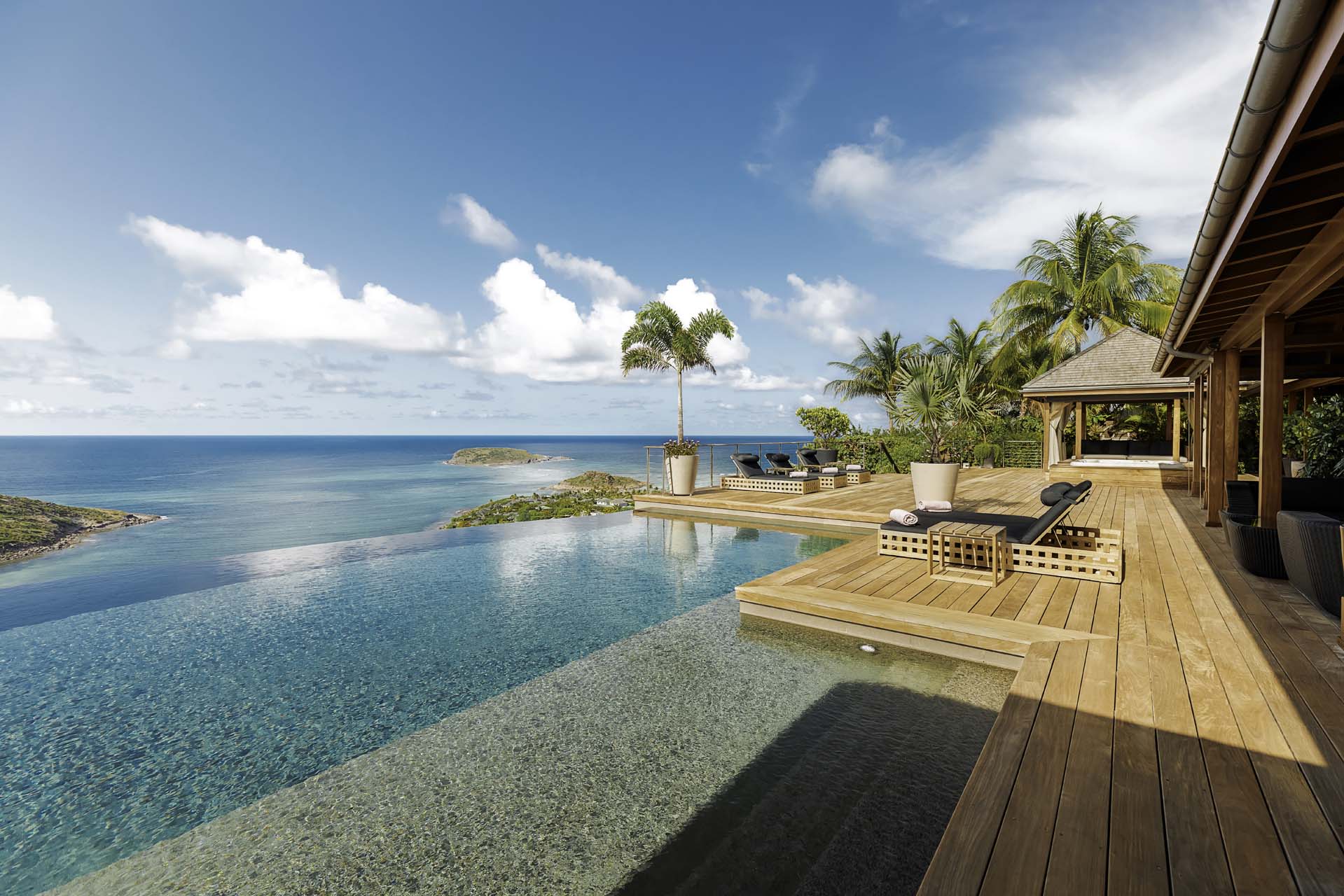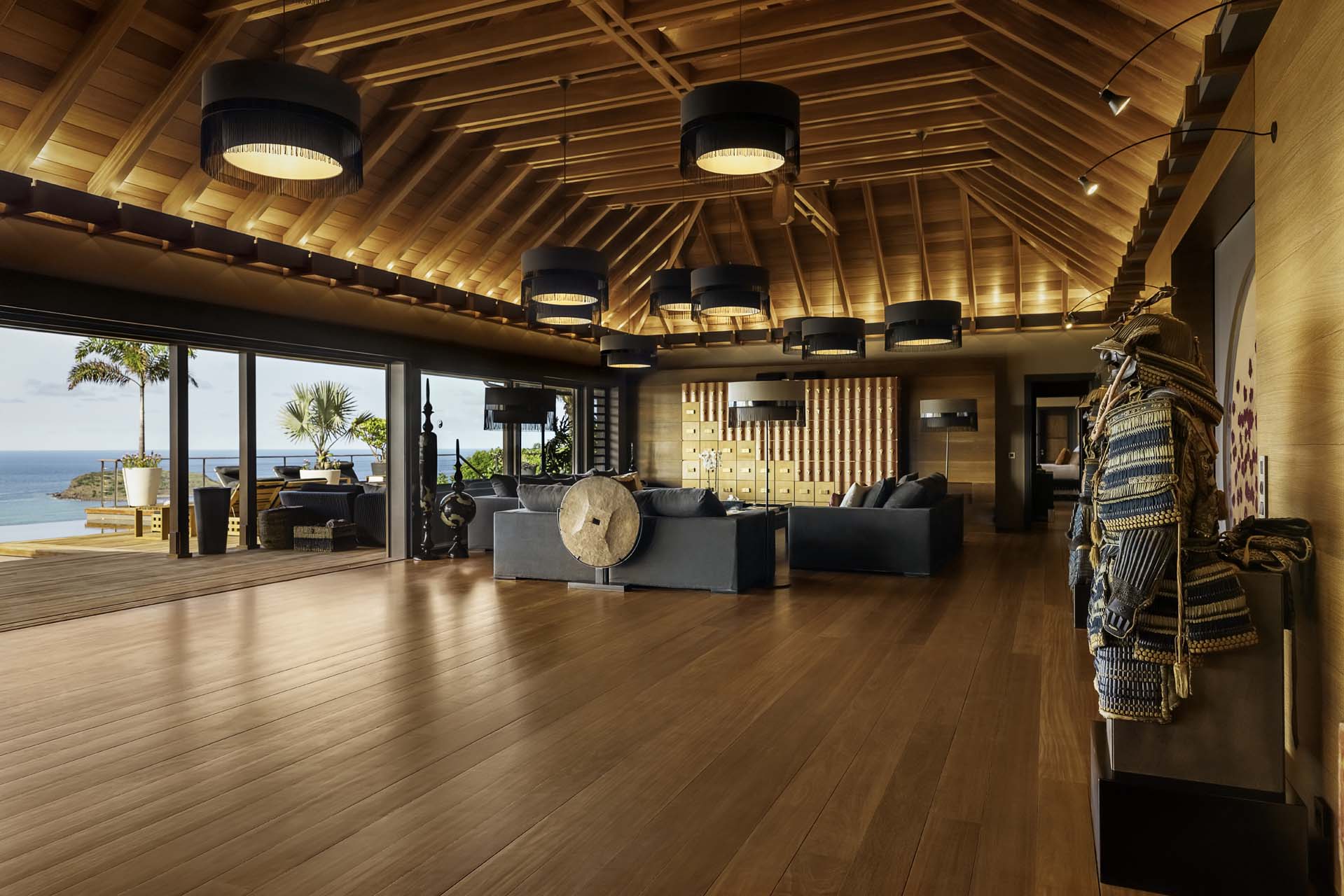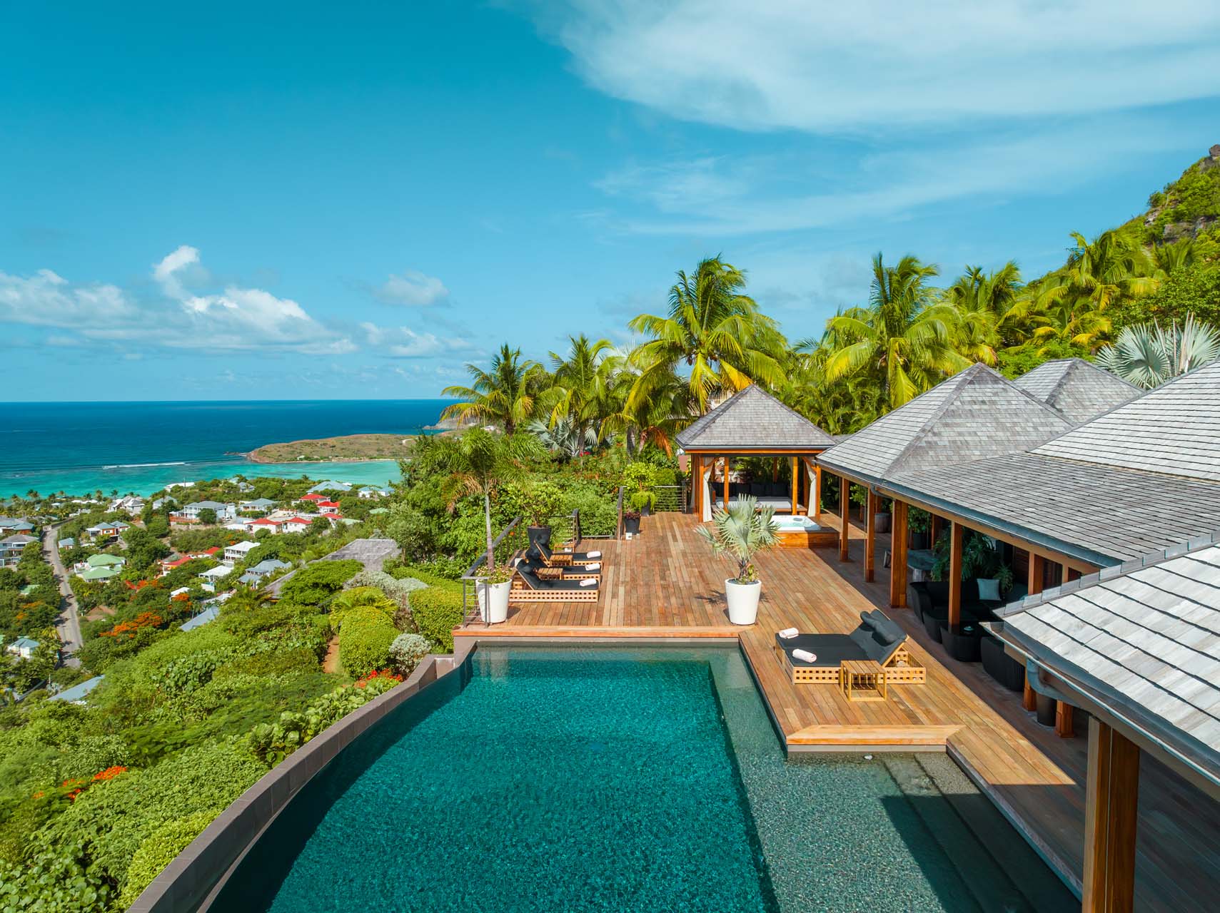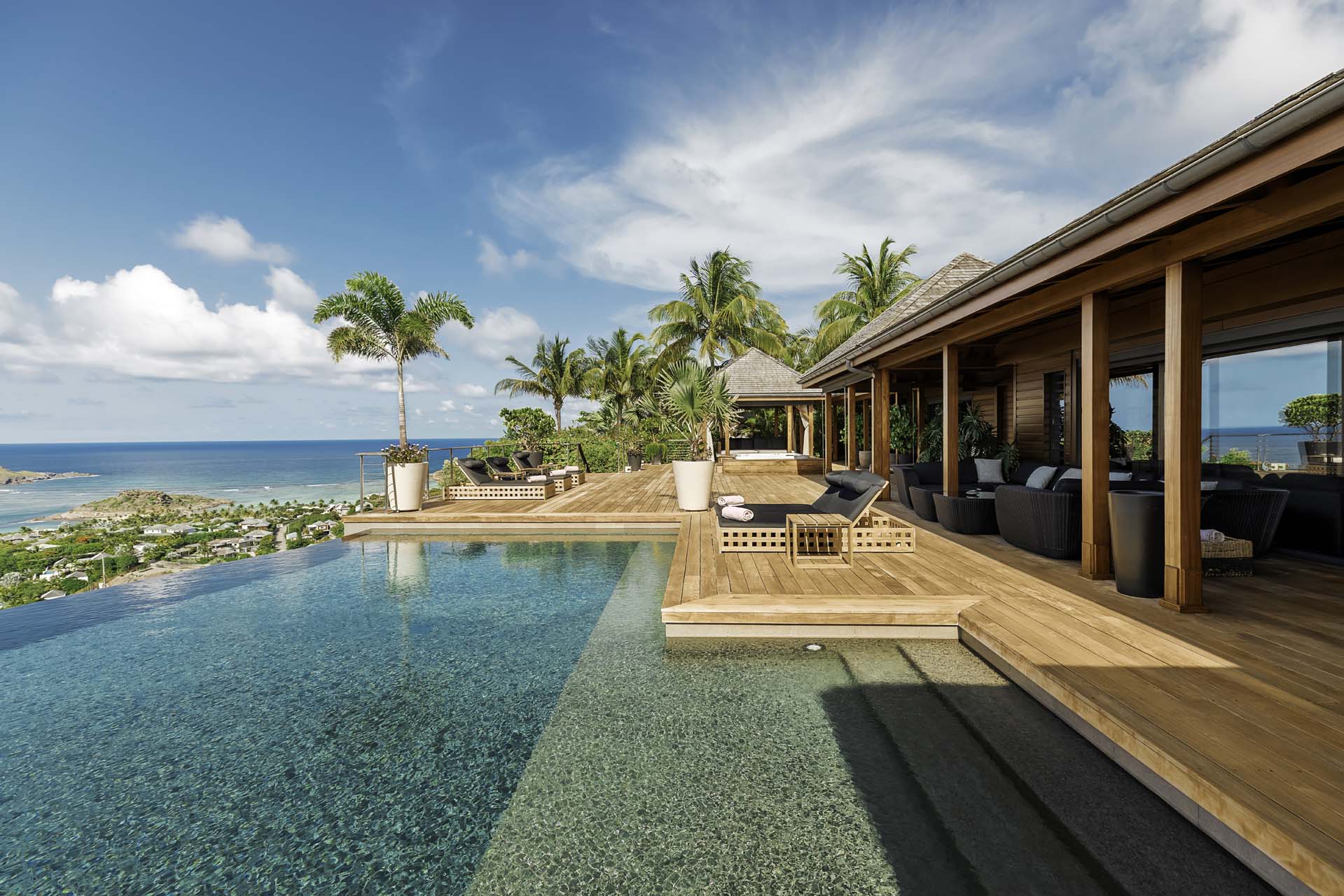 Indulgent, luxurious, and exclusive, Villa Jade (villa code: WV JLH) is one of the most incredible villas in St. Barts. A stay at this 8-bedroom island home in Marigot will make you the envy of all your friends – and everyone else vacationing in St. Barts as well. Stepping inside Villa Jade, you’ll immediately appreciate the owners’ eye for a striking design. The interiors are a tribute to Asia, its discreet traits of modernity and timelessness, coaxing you to relax. The entire home is a utopia; serene and effortlessly cool, successfully blending the East with the West. Set on the hillside of Marigot, Villa Jade evokes a sense of island whimsy with its ocean views. Your gaze will be drawn across the sparkling Marigot Bay, with Turtle Island sitting offshore. The beach is a 5-minute drive down the hill, with shops and restaurants around 10 minutes away. Upon entering the villa the Asian influence becomes apparent: a small wooden bridge straddles a pond of water lilies and reeds where koi carp peacefully swim. This is bordered on one side by a wall of pebbles over which water cascades, creating a bubbling, Zen-like atmosphere. Two 17th-century samurai soldiers guard the huge living area, where 14 black, fringed Moi lamps hang at varying heights to fabulous effect. There’s a pair of luxurious sofas to kick back on and take it all in, admiring the Asian décor, natural woods, and magnificent views. Everything from the television cabinet to the kitchen stools was custom-made for the villa. Foodies will fall in love with the chef-level kitchen at Villa Jade. The dining table sits on the covered terrace outside, overlooking the pool and the Caribbean Sea beyond. The 8 bedrooms at Villa Jade are equally as impressive as the rest of the villa – you’ll remember this property long after you’ve returned home. The master bedroom is spectacular. Above a carpet of black pebbles, an enormous bed made from open slats of wenge wood is the centerpiece of the room. The Hermes orange headboard was meticulously created by the famous Alexandre Mareuil in Bordeaux. Three more bedrooms are set inside private cottages, each decorated with a specific theme of Asian culture. The soft beds promise a wonderful night’s sleep. There are two more bedrooms designed for kids, with bright pink walls. The eighth room is ideal for staff or a live-in nanny. The icing on the cake is the enchanting views from Villa Jade’s outdoor terrace. Taking in Marigot Bay and the offshore Turtle Island, your gaze will constantly be drawn to the horizon, spying out luxury yachts as they cruise by. There’s plenty of plush seating in sun and shade; day beds, lounge areas, and sunbathing beds all offer comfortable spots to kick back and take it all in. The striking pool is also tempting, its black, mirror-like tiles create superb lighting effects both day and night. During the Thanksgiving and December holidays, the villa rents at full occupancy rates regardless of how many bedrooms are used.Please fill out the form to begin your inquiry and we will connect you with a seasoned villa rental specialist.