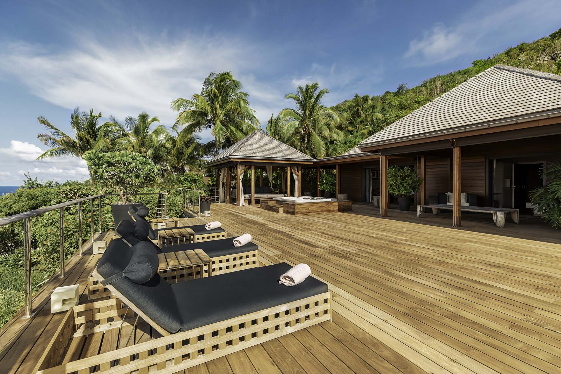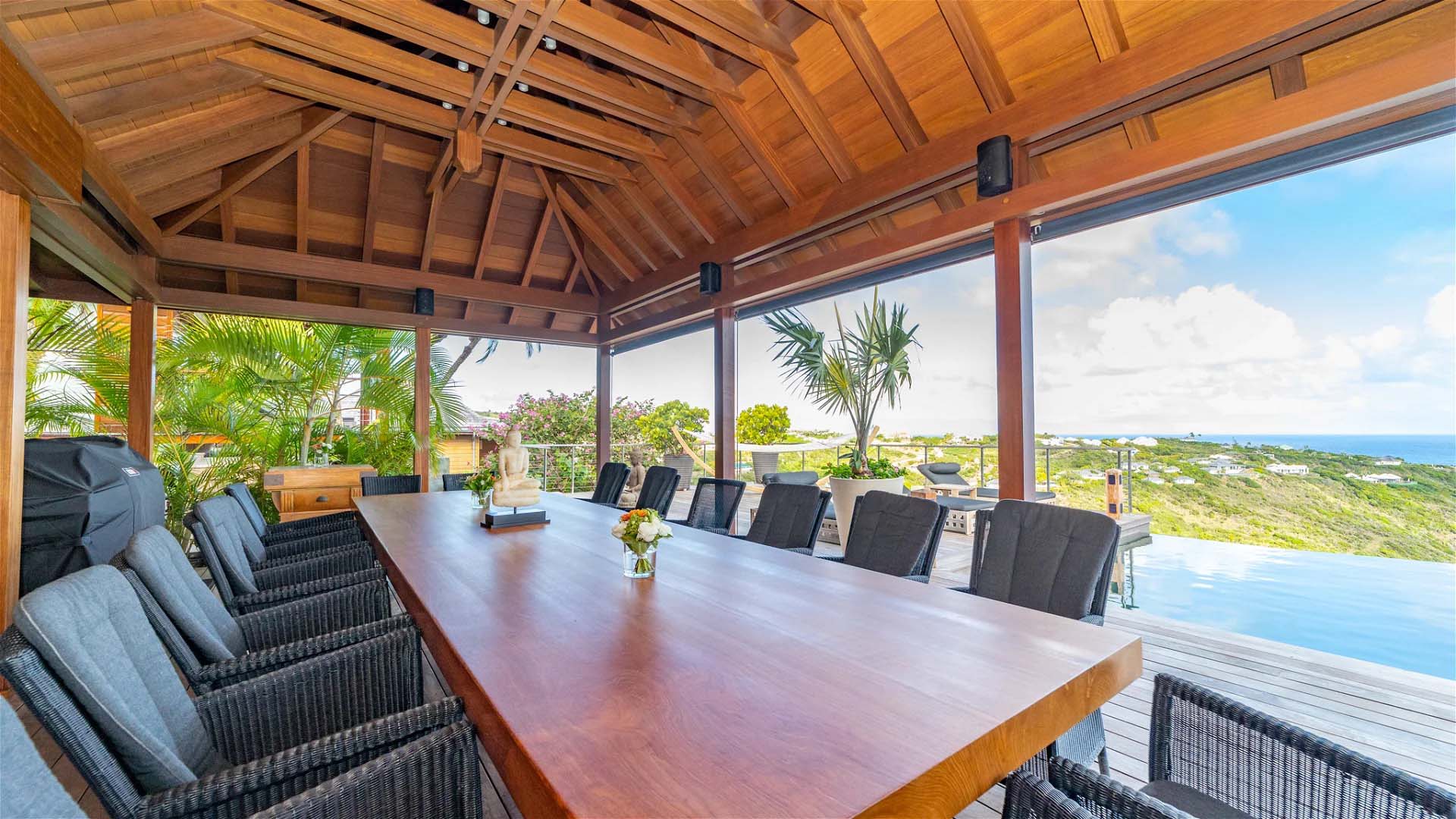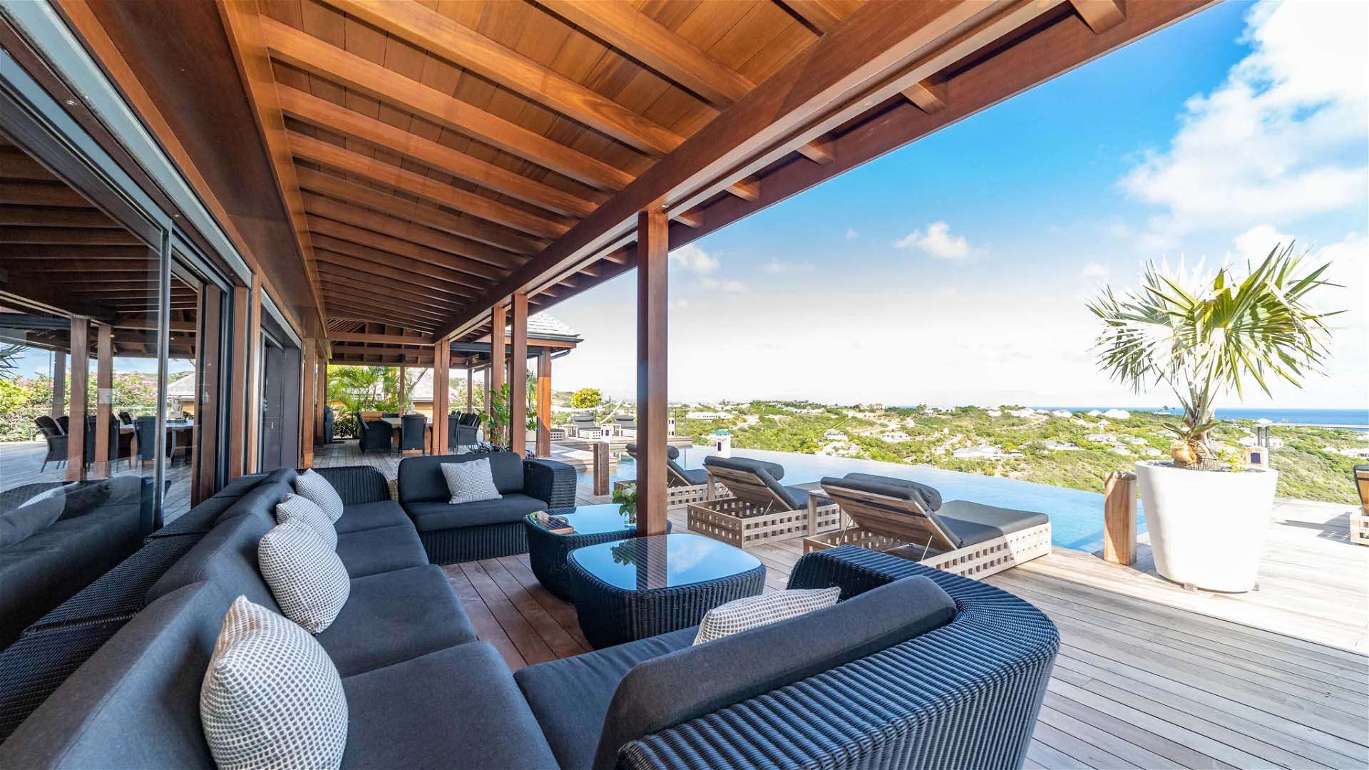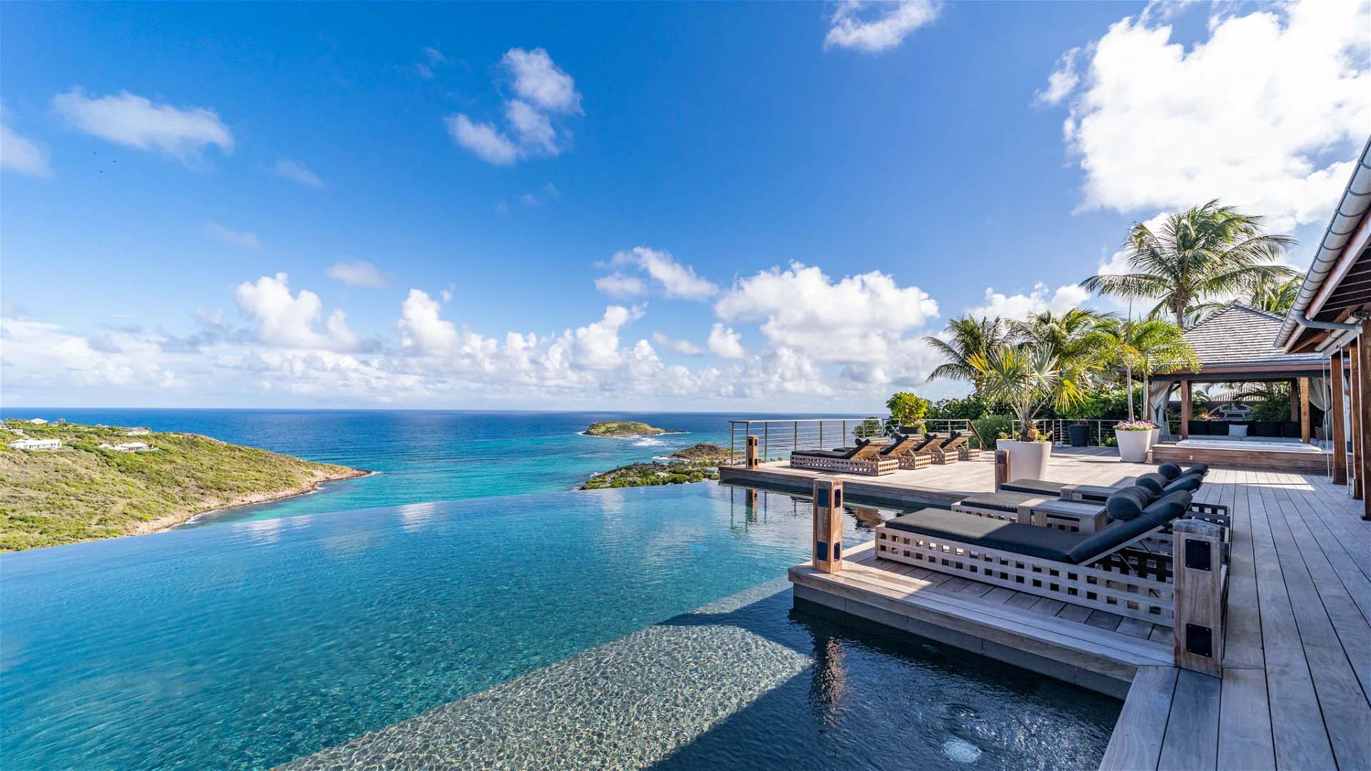 Indulgent, luxurious, and exclusive, Villa Jade (villa code: WV JLH) is one of the most incredible villas in St. Barts. A stay at this 8-bedroom island home in Marigot will make you the envy of all your friends – and everyone else vacationing in St. Barts as well. Stepping inside Villa Jade, you’ll immediately appreciate the owners’ eye for a striking design. The interiors are a tribute to Asia, its discreet traits of modernity and timelessness, coaxing you to relax. The entire home is a utopia; serene and effortlessly cool, successfully blending the East with the West. Set on the hillside of Marigot, Villa Jade evokes a sense of island whimsy with its ocean views. Your gaze will be drawn across the sparkling Marigot Bay, with Turtle Island sitting offshore. The beach is a 5-minute drive down the hill, with shops and restaurants around 10 minutes away. Upon entering the villa the Asian influence becomes apparent: a small wooden bridge straddles a pond of water lilies and reeds where koi carp peacefully swim. This is bordered on one side by a wall of pebbles over which water cascades, creating a bubbling, Zen-like atmosphere. Two 17th-century samurai soldiers guard the huge living area, where 14 black, fringed Moi lamps hang at varying heights to fabulous effect. There’s a pair of luxurious sofas to kick back on and take it all in, admiring the Asian décor, natural woods, and magnificent views. Everything from the television cabinet to the kitchen stools was custom-made for the villa. Foodies will fall in love with the chef-level kitchen at Villa Jade. The dining table sits on the covered terrace outside, overlooking the pool and the Caribbean Sea beyond. The 8 bedrooms at Villa Jade are equally as impressive as the rest of the villa – you’ll remember this property long after you’ve returned home. The master bedroom is spectacular. Above a carpet of black pebbles, an enormous bed made from open slats of wenge wood is the centerpiece of the room. The Hermes orange headboard was meticulously created by the famous Alexandre Mareuil in Bordeaux. Three more bedrooms are set inside private cottages, each decorated with a specific theme of Asian culture. The soft beds promise a wonderful night’s sleep. There are two more bedrooms designed for kids, with bright pink walls. The eighth room is ideal for staff or a live-in nanny. The icing on the cake is the enchanting views from Villa Jade’s outdoor terrace. Taking in Marigot Bay and the offshore Turtle Island, your gaze will constantly be drawn to the horizon, spying out luxury yachts as they cruise by. There’s plenty of plush seating in sun and shade; day beds, lounge areas, and sunbathing beds all offer comfortable spots to kick back and take it all in. The striking pool is also tempting, its black, mirror-like tiles create superb lighting effects both day and night. During the Thanksgiving and December holidays, the villa rents at full occupancy rates regardless of how many bedrooms are used.Please fill out the form to begin your inquiry and we will connect you with a seasoned villa rental specialist.