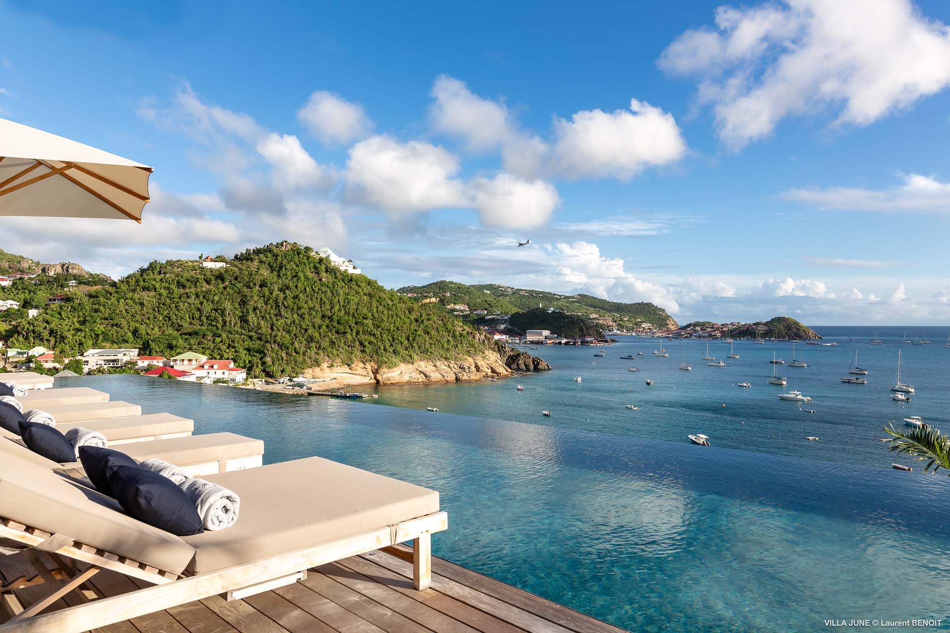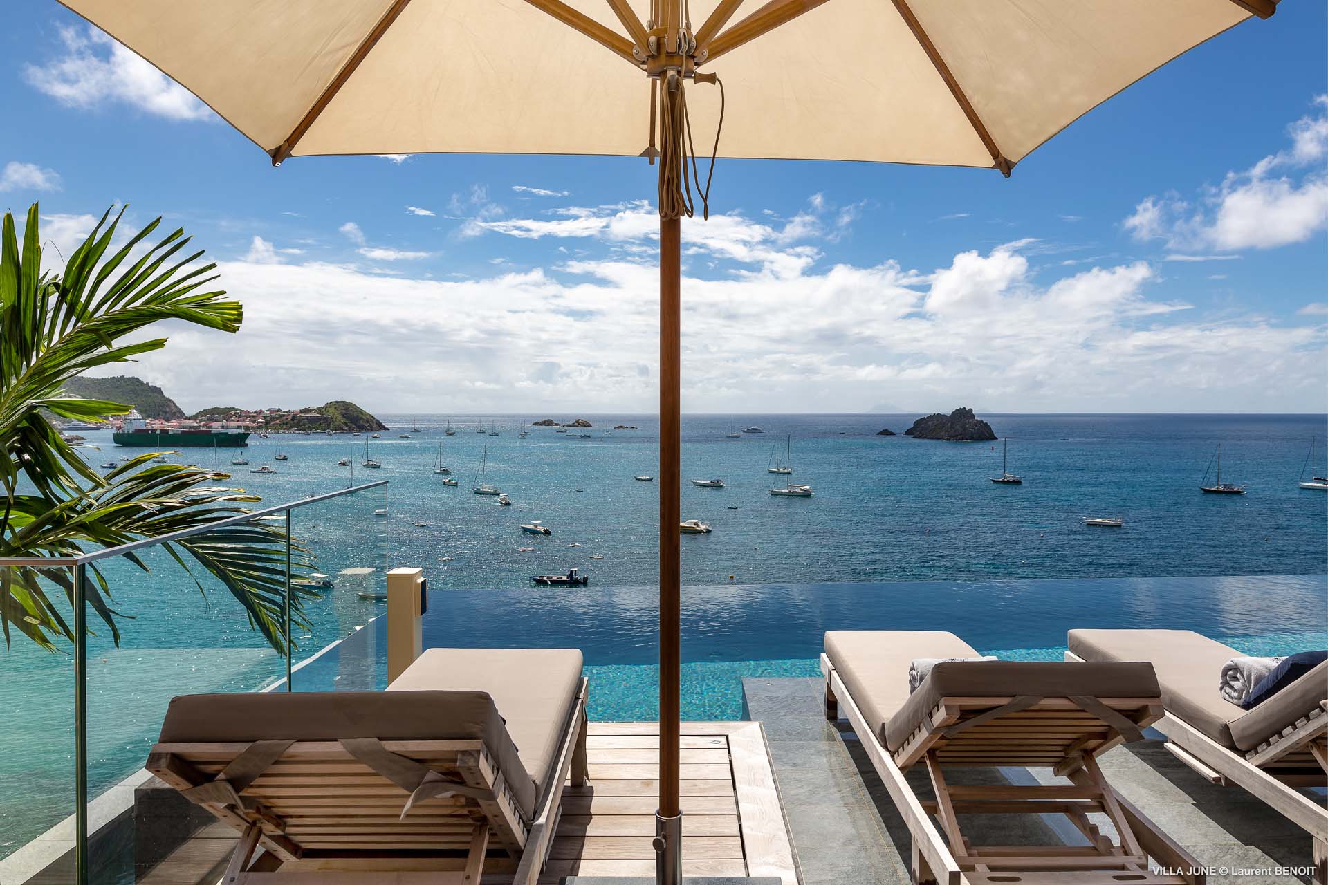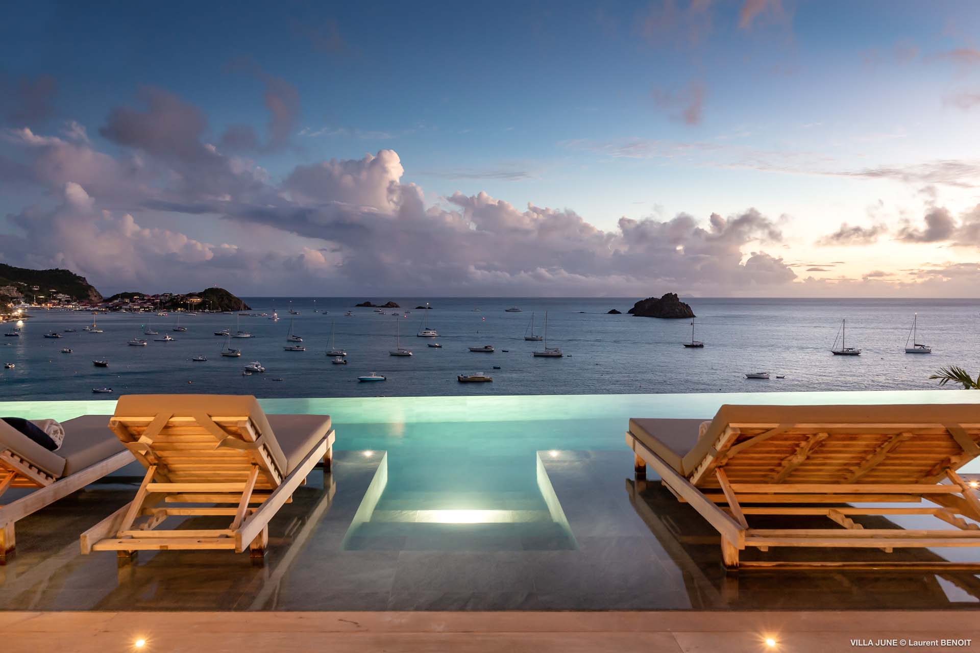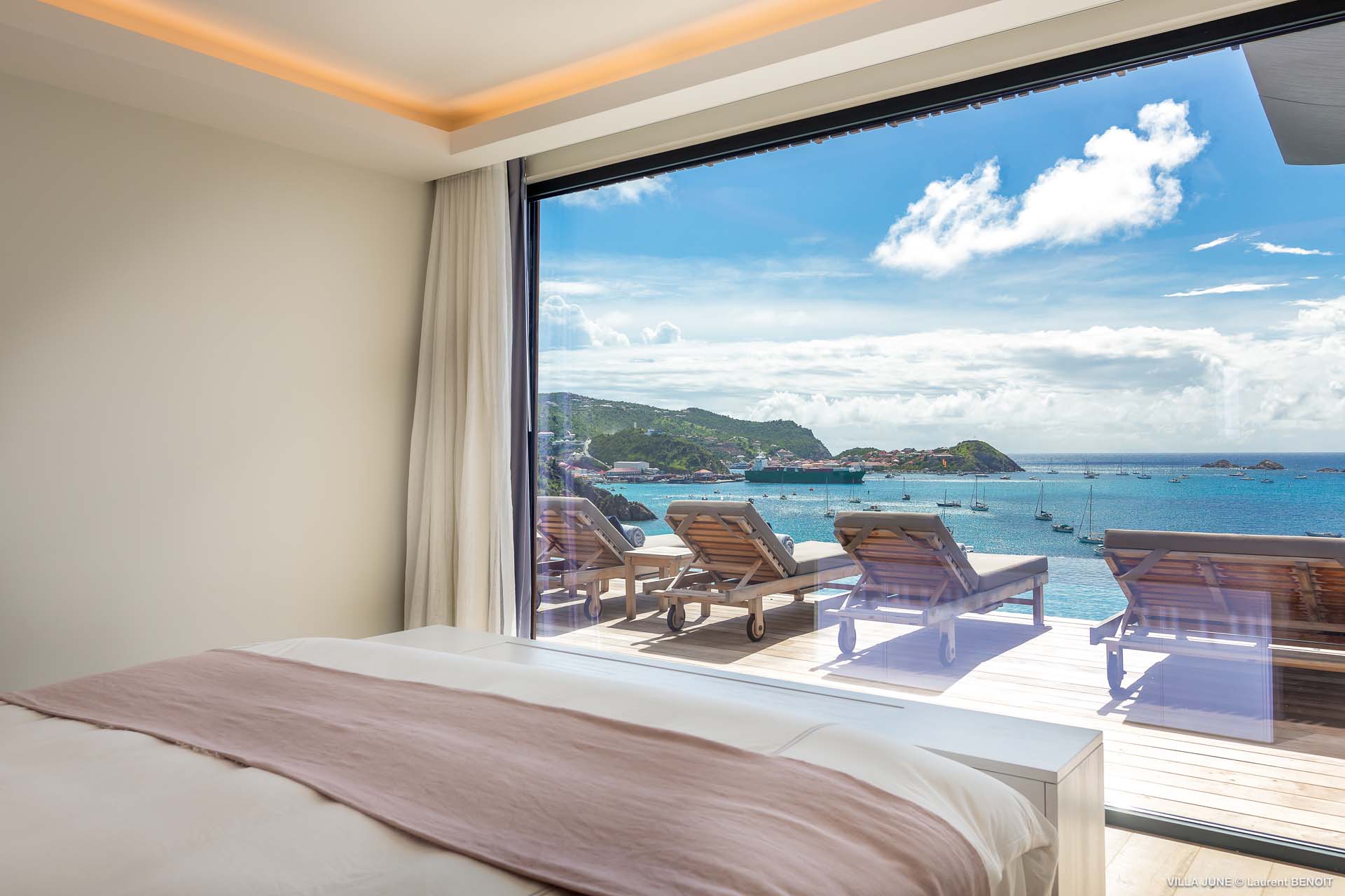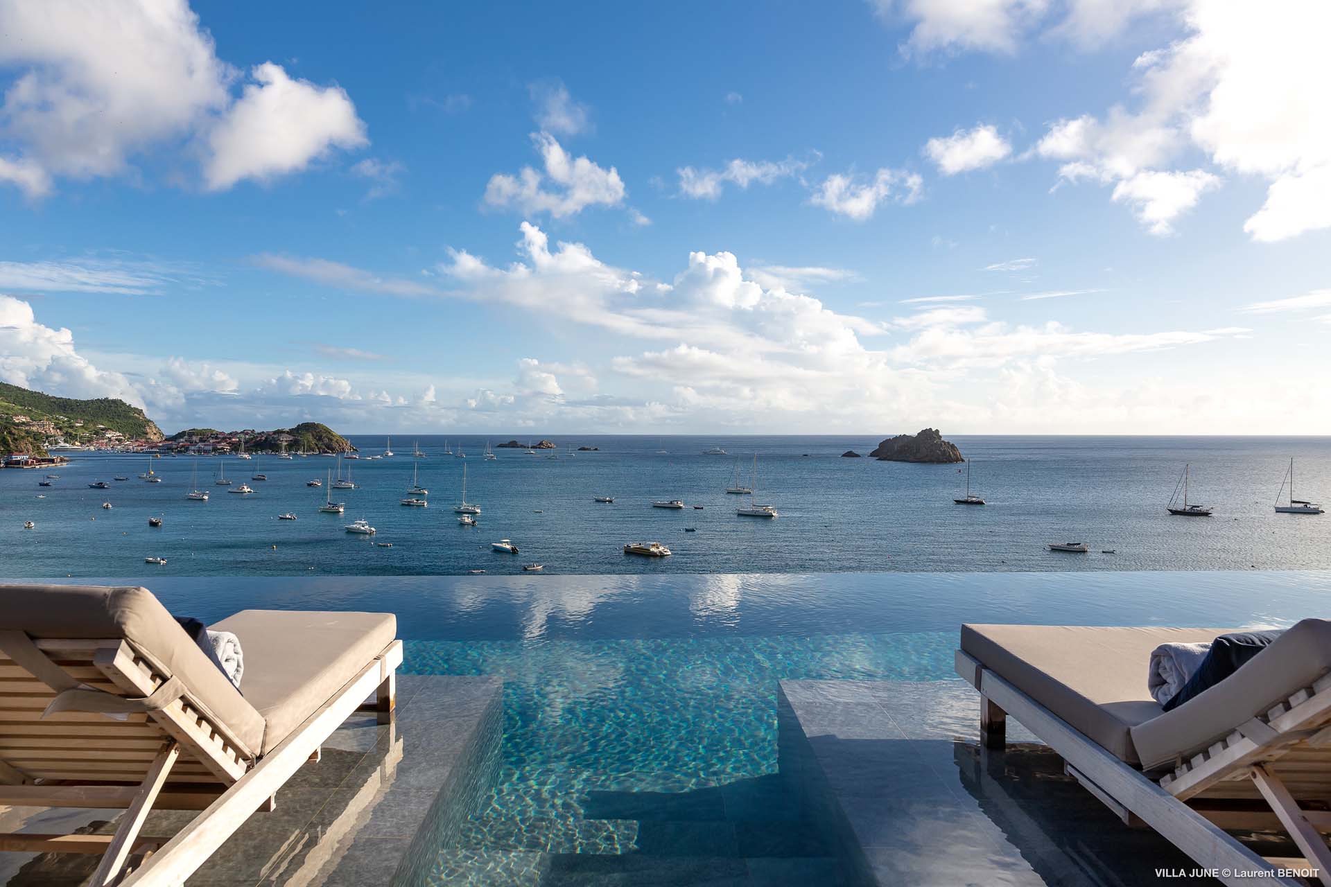 Embrace the good life at Villa June (villa code: WV JUN), a stunning 6-bedroom villa overlooking the harbor of Gustavia, St. Barts. Like a wide-angle camera lens, guests of this island home will enjoy fabulous views over the Caribbean Sea, watching as the luxury yachts sail to and from St. Barts’ elegant capital. Sleek, elegant, and sophisticated, Villa June is a graceful property that will capture your imagination as soon as you step foot inside. There are plenty of natural island woods, creating a contemporary and calm atmosphere, while the eclectic décor inside will please those with an eye for design and style. Located in the hills of Corossol, a new hotspot for the island’s most luxurious properties, Villa June enjoys a coveted location. There are excellent views across Gustavia harbor, while the beaches, shops, and restaurants of Gustavia and St. Jean are also within close driving distance. Villa June sprawls over three levels, with a flowing open plan characterized by a clean and modern design. There’s ample space to spread out and come together as a group, whether it’s in the luxurious home theater, the fitness room, or the beautiful great room at the property’s heart. A grand staircase and elevator connect the three levels. It’s here where you’ll find the large kitchen and living room. In the latter, beautifully soft sofas invite you to sink in and relax, diving into a good book or watching a film on the wall-mounted TV in front of a stunning shelf display. Sliding doors open wide to the outdoor terrace, framing the azure hues of the water and luxury yachts at anchor. Next to the living room is Villa June’s high-end kitchen. The large island has seating for 10 guests, making it the ideal spot to relax with a drink while you watch your private chef whip up a gourmet meal. You could choose to eat at the island or set up at the dining table on the covered terrace as an alternative. With the cool island breeze and outstanding views, this is the ideal setting for entertaining, opening a few bottles of wine, and toasting your island vacation over some fantastic local food. There’s a total of 6 bedrooms in Villa June, spread across the three levels to ensure privacy between guests. There are three on the main level. Next to the living room is the first, which connects to bedroom number two, an ideal choice for parents with young children. Of course, both rooms can be fully separated as well. The third bedroom on this level sits at the far end of the terrace, offering more privacy. Descending to the lower level brings you to the other three bedrooms, spread around the media and fitness rooms. The main focal point of the outdoor space is the heated, 70-foot-long infinity pool. Stretching the length of the terrace, the edge blends into the ocean beyond, creating the impression of a continuous waterscape with varied shades of blue. Slipping in for a refreshing dip here is impossible to resist. The pool is lined with plush loungers, ideal for sunbathing. You could also throw up the umbrellas for some shade, letting you drop off for a nap in the cool breezes. Back toward the house, the covered terrace is another beautiful spot to lounge around. There’s an outdoor sofa for cocktail hour and of course a beautiful dining table for alfresco meals. There’s additional seating and shade on the middle-level terrace that connects the bedrooms. During the December holidays, Thanksgiving, and Bucket, the villa rents at the full occupancy rate regardless of how many bedrooms are used and is an excellent villa for large groups traveling together with families with children.Please fill out the form to begin your inquiry and we will connect you with a seasoned villa rental specialist.