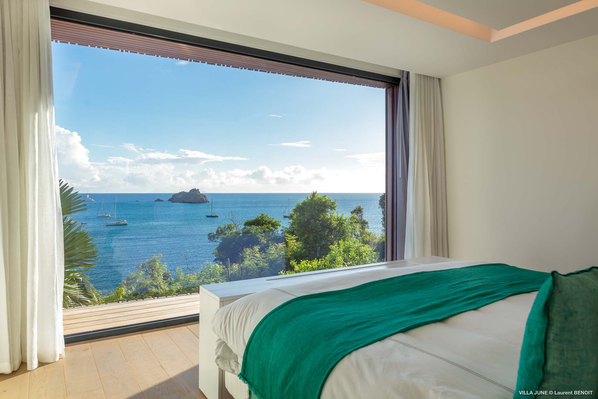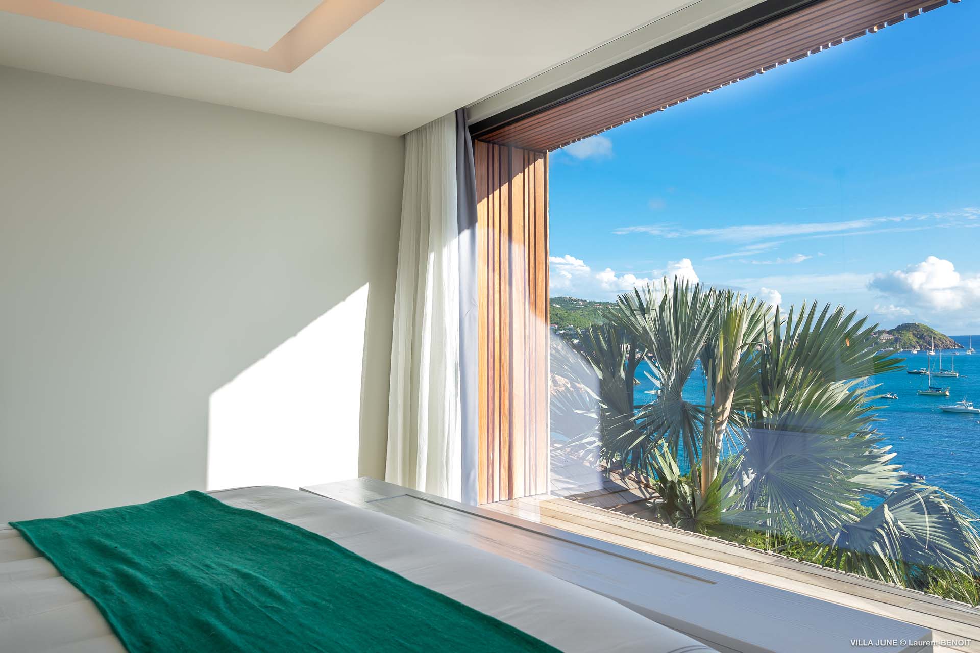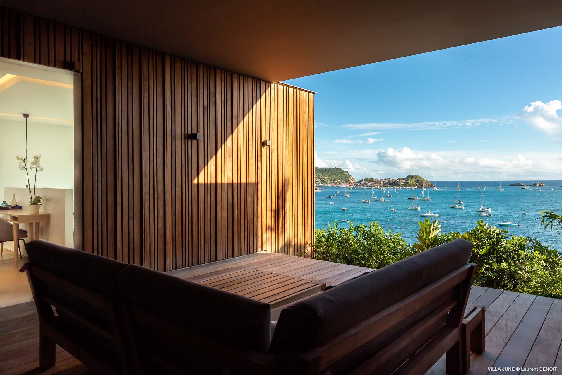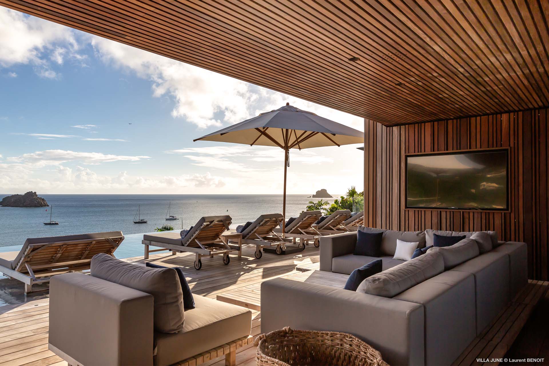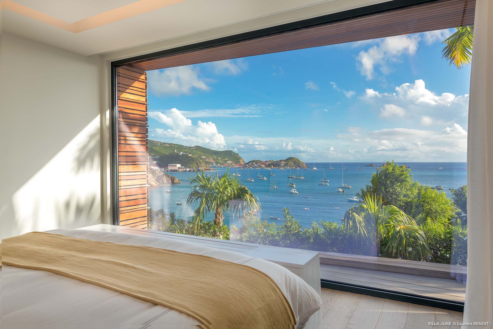 Embrace the good life at Villa June (villa code: WV JUN), a stunning 6-bedroom villa overlooking the harbor of Gustavia, St. Barts. Like a wide-angle camera lens, guests of this island home will enjoy fabulous views over the Caribbean Sea, watching as the luxury yachts sail to and from St. Barts’ elegant capital. Sleek, elegant, and sophisticated, Villa June is a graceful property that will capture your imagination as soon as you step foot inside. There are plenty of natural island woods, creating a contemporary and calm atmosphere, while the eclectic décor inside will please those with an eye for design and style. Located in the hills of Corossol, a new hotspot for the island’s most luxurious properties, Villa June enjoys a coveted location. There are excellent views across Gustavia harbor, while the beaches, shops, and restaurants of Gustavia and St. Jean are also within close driving distance. Villa June sprawls over three levels, with a flowing open plan characterized by a clean and modern design. There’s ample space to spread out and come together as a group, whether it’s in the luxurious home theater, the fitness room, or the beautiful great room at the property’s heart. A grand staircase and elevator connect the three levels. It’s here where you’ll find the large kitchen and living room. In the latter, beautifully soft sofas invite you to sink in and relax, diving into a good book or watching a film on the wall-mounted TV in front of a stunning shelf display. Sliding doors open wide to the outdoor terrace, framing the azure hues of the water and luxury yachts at anchor. Next to the living room is Villa June’s high-end kitchen. The large island has seating for 10 guests, making it the ideal spot to relax with a drink while you watch your private chef whip up a gourmet meal. You could choose to eat at the island or set up at the dining table on the covered terrace as an alternative. With the cool island breeze and outstanding views, this is the ideal setting for entertaining, opening a few bottles of wine, and toasting your island vacation over some fantastic local food. There’s a total of 6 bedrooms in Villa June, spread across the three levels to ensure privacy between guests. There are three on the main level. Next to the living room is the first, which connects to bedroom number two, an ideal choice for parents with young children. Of course, both rooms can be fully separated as well. The third bedroom on this level sits at the far end of the terrace, offering more privacy. Descending to the lower level brings you to the other three bedrooms, spread around the media and fitness rooms. The main focal point of the outdoor space is the heated, 70-foot-long infinity pool. Stretching the length of the terrace, the edge blends into the ocean beyond, creating the impression of a continuous waterscape with varied shades of blue. Slipping in for a refreshing dip here is impossible to resist. The pool is lined with plush loungers, ideal for sunbathing. You could also throw up the umbrellas for some shade, letting you drop off for a nap in the cool breezes. Back toward the house, the covered terrace is another beautiful spot to lounge around. There’s an outdoor sofa for cocktail hour and of course a beautiful dining table for alfresco meals. There’s additional seating and shade on the middle-level terrace that connects the bedrooms. During the December holidays, Thanksgiving, and Bucket, the villa rents at the full occupancy rate regardless of how many bedrooms are used and is an excellent villa for large groups traveling together with families with children.Please fill out the form to begin your inquiry and we will connect you with a seasoned villa rental specialist.