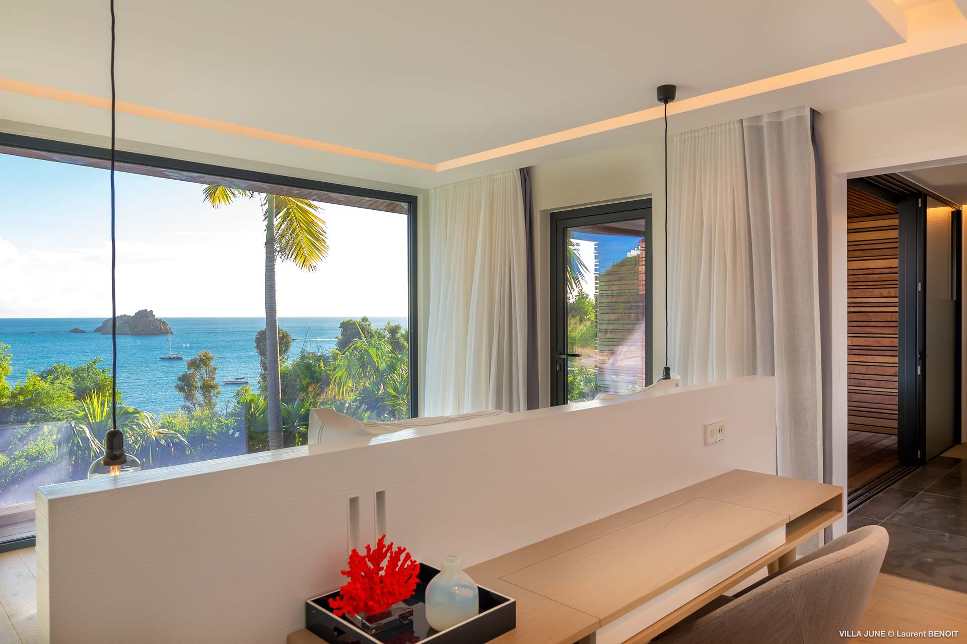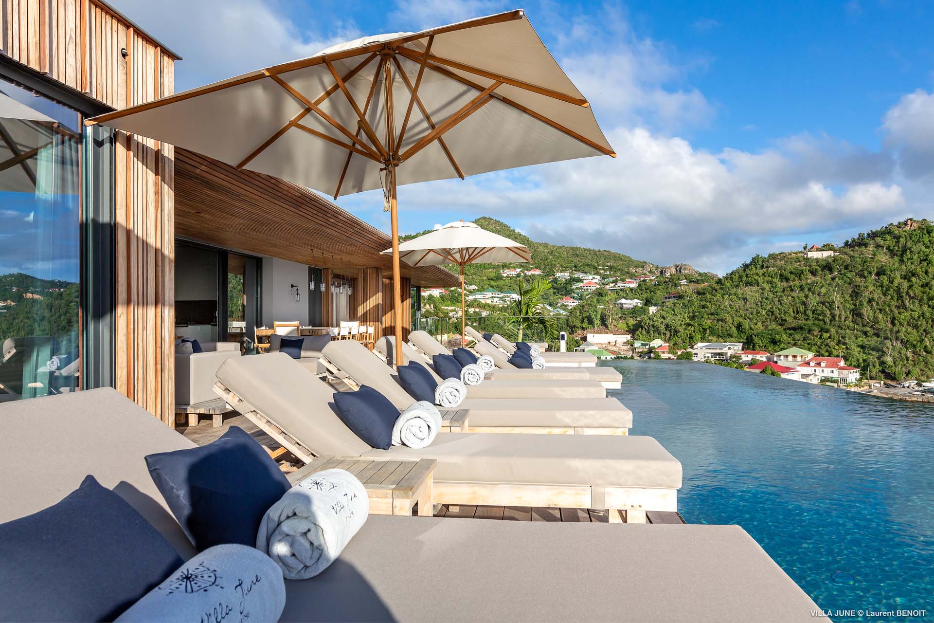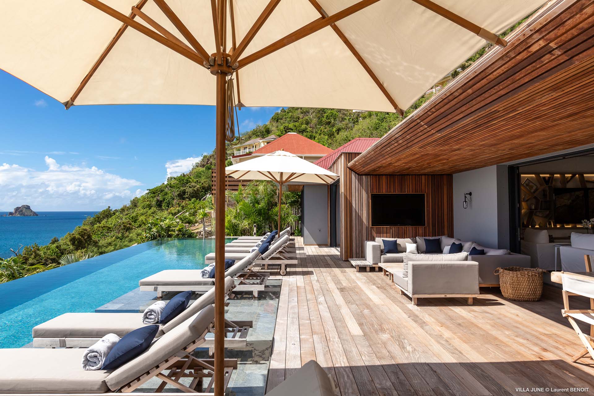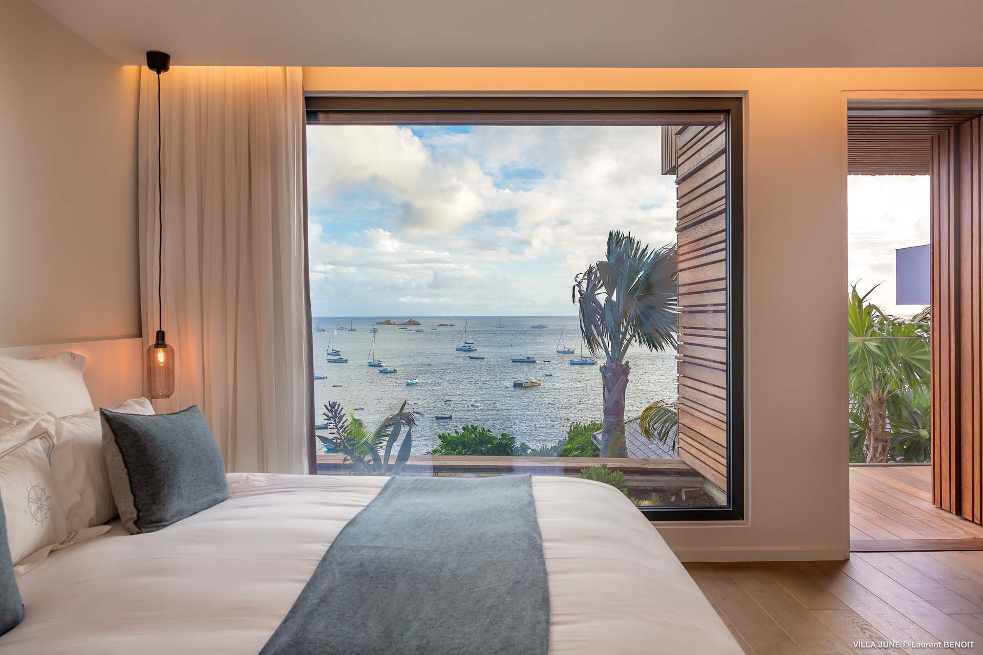 Embrace the good life at Villa June (villa code: WV JUN), a stunning 6-bedroom villa overlooking the harbor of Gustavia, St. Barts. Like a wide-angle camera lens, guests of this island home will enjoy fabulous views over the Caribbean Sea, watching as the luxury yachts sail to and from St. Barts’ elegant capital. Sleek, elegant, and sophisticated, Villa June is a graceful property that will capture your imagination as soon as you step foot inside. There are plenty of natural island woods, creating a contemporary and calm atmosphere, while the eclectic décor inside will please those with an eye for design and style. Located in the hills of Corossol, a new hotspot for the island’s most luxurious properties, Villa June enjoys a coveted location. There are excellent views across Gustavia harbor, while the beaches, shops, and restaurants of Gustavia and St. Jean are also within close driving distance. Villa June sprawls over three levels, with a flowing open plan characterized by a clean and modern design. There’s ample space to spread out and come together as a group, whether it’s in the luxurious home theater, the fitness room, or the beautiful great room at the property’s heart. A grand staircase and elevator connect the three levels. It’s here where you’ll find the large kitchen and living room. In the latter, beautifully soft sofas invite you to sink in and relax, diving into a good book or watching a film on the wall-mounted TV in front of a stunning shelf display. Sliding doors open wide to the outdoor terrace, framing the azure hues of the water and luxury yachts at anchor. Next to the living room is Villa June’s high-end kitchen. The large island has seating for 10 guests, making it the ideal spot to relax with a drink while you watch your private chef whip up a gourmet meal. You could choose to eat at the island or set up at the dining table on the covered terrace as an alternative. With the cool island breeze and outstanding views, this is the ideal setting for entertaining, opening a few bottles of wine, and toasting your island vacation over some fantastic local food. There’s a total of 6 bedrooms in Villa June, spread across the three levels to ensure privacy between guests. There are three on the main level. Next to the living room is the first, which connects to bedroom number two, an ideal choice for parents with young children. Of course, both rooms can be fully separated as well. The third bedroom on this level sits at the far end of the terrace, offering more privacy. Descending to the lower level brings you to the other three bedrooms, spread around the media and fitness rooms. The main focal point of the outdoor space is the heated, 70-foot-long infinity pool. Stretching the length of the terrace, the edge blends into the ocean beyond, creating the impression of a continuous waterscape with varied shades of blue. Slipping in for a refreshing dip here is impossible to resist. The pool is lined with plush loungers, ideal for sunbathing. You could also throw up the umbrellas for some shade, letting you drop off for a nap in the cool breezes. Back toward the house, the covered terrace is another beautiful spot to lounge around. There’s an outdoor sofa for cocktail hour and of course a beautiful dining table for alfresco meals. There’s additional seating and shade on the middle-level terrace that connects the bedrooms. During the December holidays, Thanksgiving, and Bucket, the villa rents at the full occupancy rate regardless of how many bedrooms are used and is an excellent villa for large groups traveling together with families with children.Please fill out the form to begin your inquiry and we will connect you with a seasoned villa rental specialist.