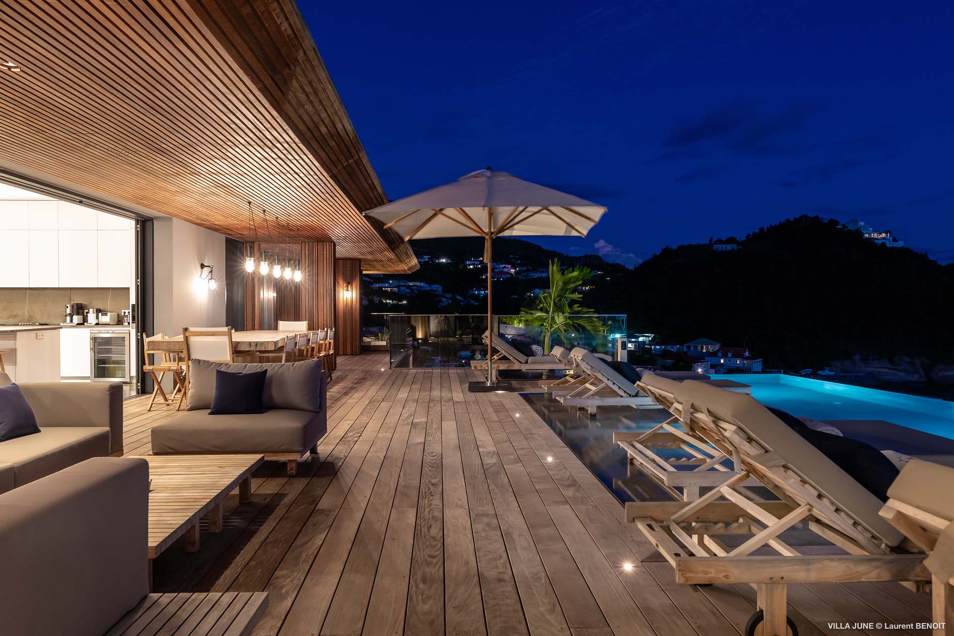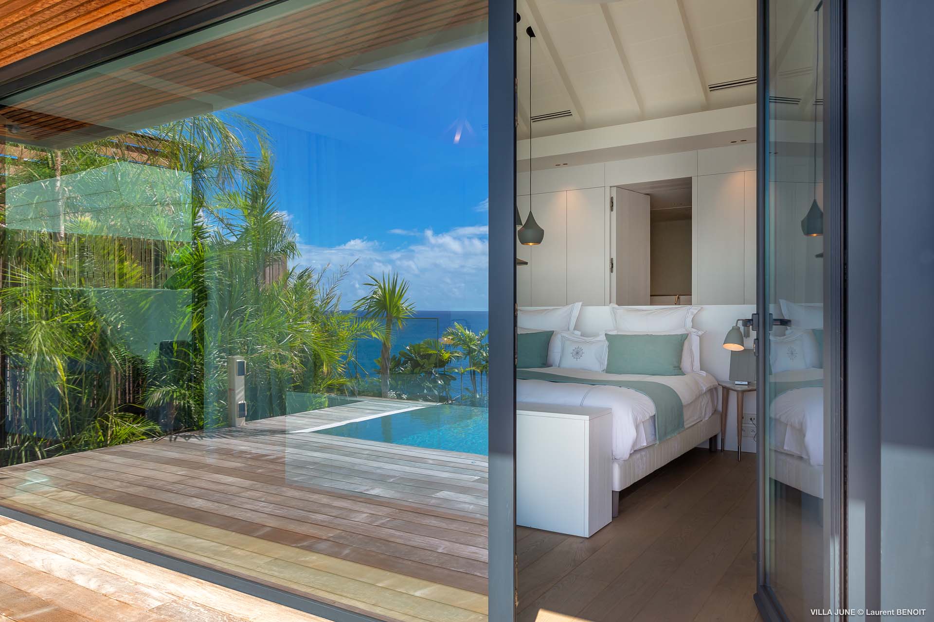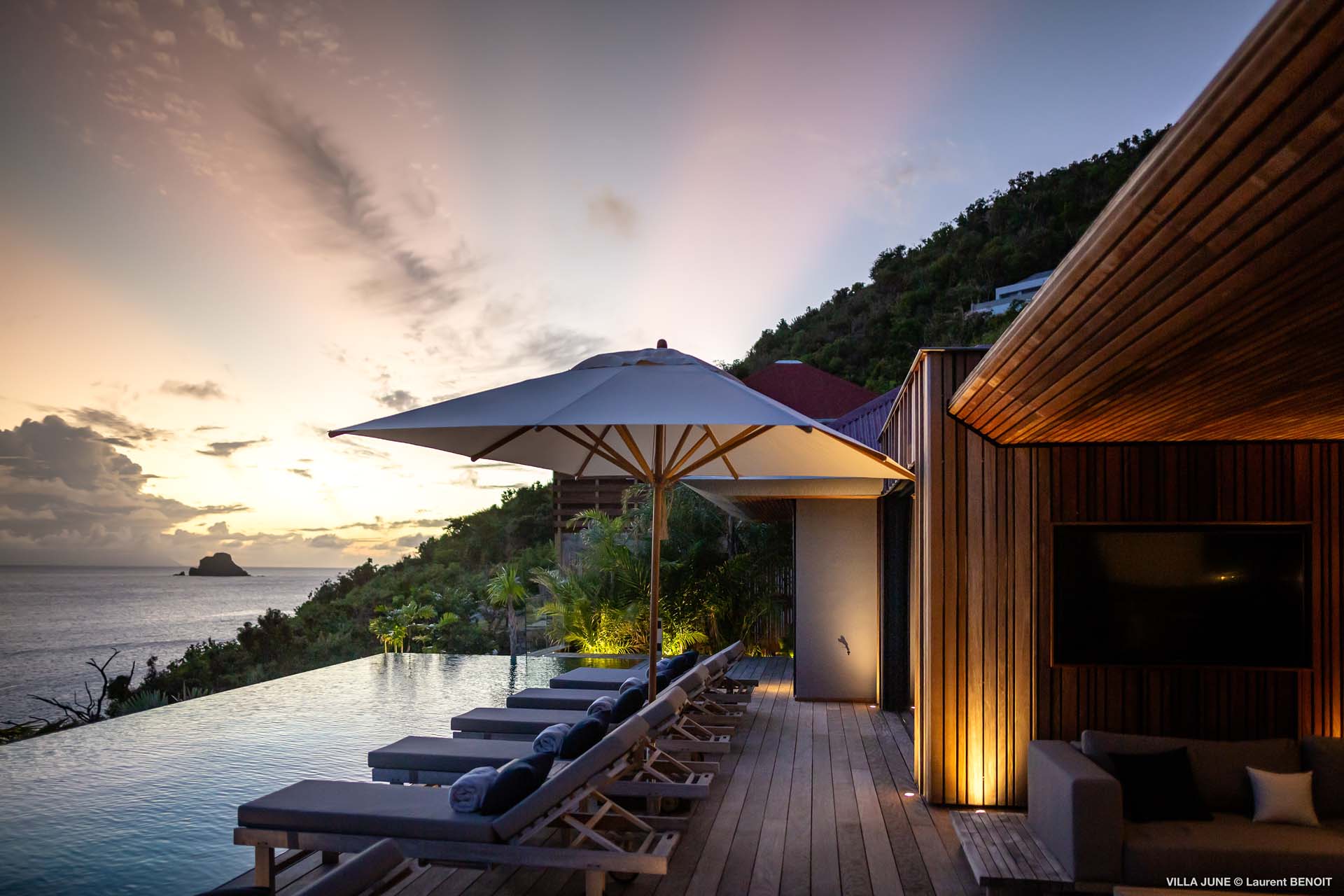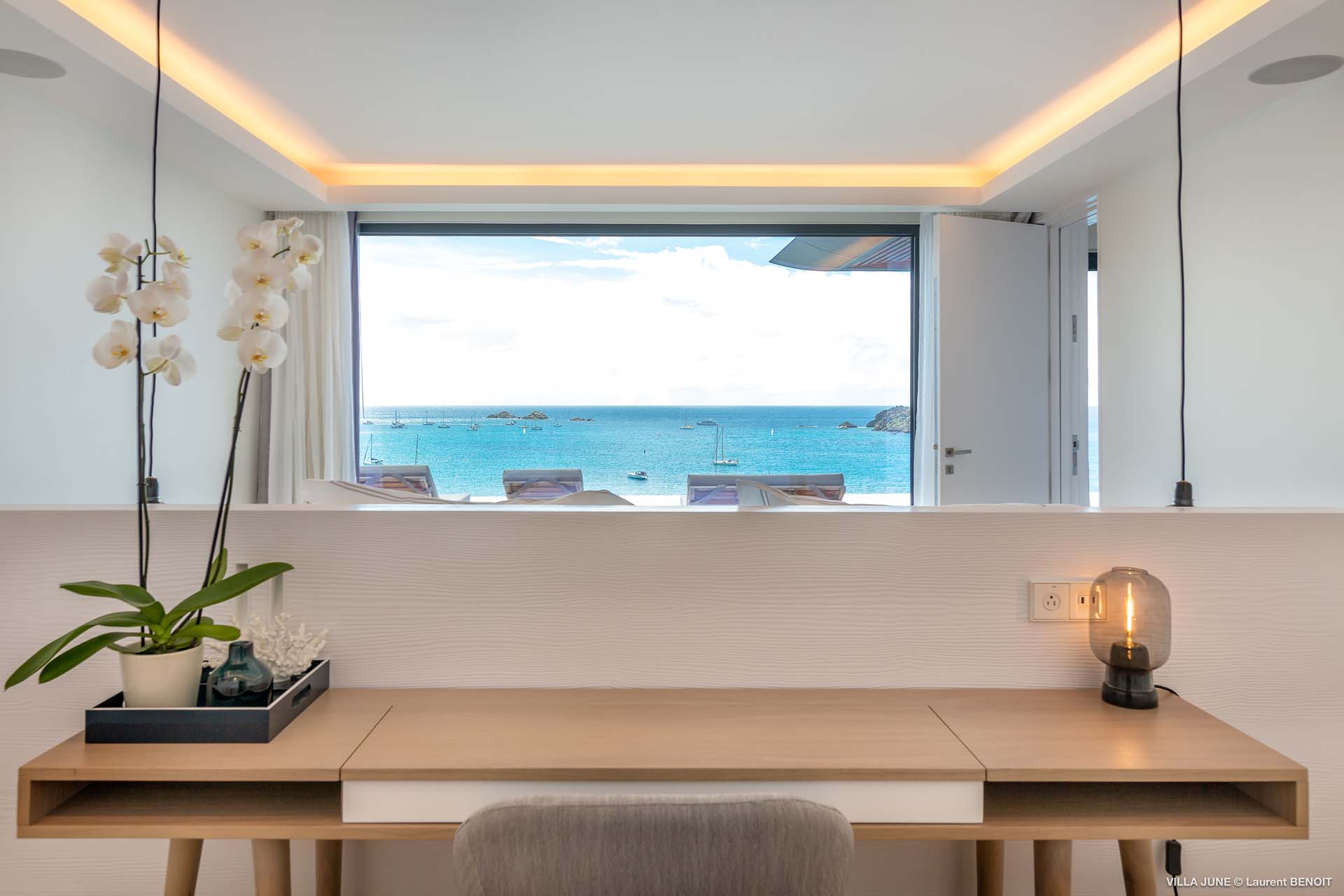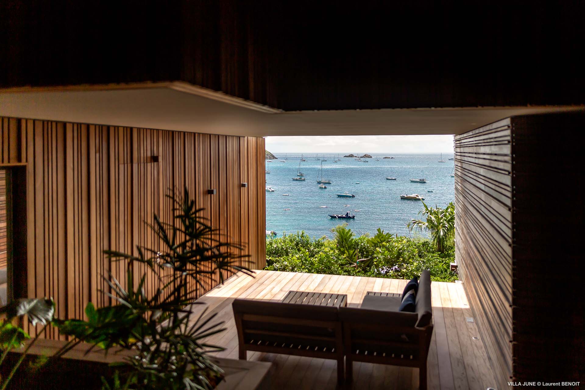 Embrace the good life at Villa June (villa code: WV JUN), a stunning 6-bedroom villa overlooking the harbor of Gustavia, St. Barts. Like a wide-angle camera lens, guests of this island home will enjoy fabulous views over the Caribbean Sea, watching as the luxury yachts sail to and from St. Barts’ elegant capital. Sleek, elegant, and sophisticated, Villa June is a graceful property that will capture your imagination as soon as you step foot inside. There are plenty of natural island woods, creating a contemporary and calm atmosphere, while the eclectic décor inside will please those with an eye for design and style. Located in the hills of Corossol, a new hotspot for the island’s most luxurious properties, Villa June enjoys a coveted location. There are excellent views across Gustavia harbor, while the beaches, shops, and restaurants of Gustavia and St. Jean are also within close driving distance. Villa June sprawls over three levels, with a flowing open plan characterized by a clean and modern design. There’s ample space to spread out and come together as a group, whether it’s in the luxurious home theater, the fitness room, or the beautiful great room at the property’s heart. A grand staircase and elevator connect the three levels. It’s here where you’ll find the large kitchen and living room. In the latter, beautifully soft sofas invite you to sink in and relax, diving into a good book or watching a film on the wall-mounted TV in front of a stunning shelf display. Sliding doors open wide to the outdoor terrace, framing the azure hues of the water and luxury yachts at anchor. Next to the living room is Villa June’s high-end kitchen. The large island has seating for 10 guests, making it the ideal spot to relax with a drink while you watch your private chef whip up a gourmet meal. You could choose to eat at the island or set up at the dining table on the covered terrace as an alternative. With the cool island breeze and outstanding views, this is the ideal setting for entertaining, opening a few bottles of wine, and toasting your island vacation over some fantastic local food. There’s a total of 6 bedrooms in Villa June, spread across the three levels to ensure privacy between guests. There are three on the main level. Next to the living room is the first, which connects to bedroom number two, an ideal choice for parents with young children. Of course, both rooms can be fully separated as well. The third bedroom on this level sits at the far end of the terrace, offering more privacy. Descending to the lower level brings you to the other three bedrooms, spread around the media and fitness rooms. The main focal point of the outdoor space is the heated, 70-foot-long infinity pool. Stretching the length of the terrace, the edge blends into the ocean beyond, creating the impression of a continuous waterscape with varied shades of blue. Slipping in for a refreshing dip here is impossible to resist. The pool is lined with plush loungers, ideal for sunbathing. You could also throw up the umbrellas for some shade, letting you drop off for a nap in the cool breezes. Back toward the house, the covered terrace is another beautiful spot to lounge around. There’s an outdoor sofa for cocktail hour and of course a beautiful dining table for alfresco meals. There’s additional seating and shade on the middle-level terrace that connects the bedrooms. During the December holidays, Thanksgiving, and Bucket, the villa rents at the full occupancy rate regardless of how many bedrooms are used and is an excellent villa for large groups traveling together with families with children.Please fill out the form to begin your inquiry and we will connect you with a seasoned villa rental specialist.