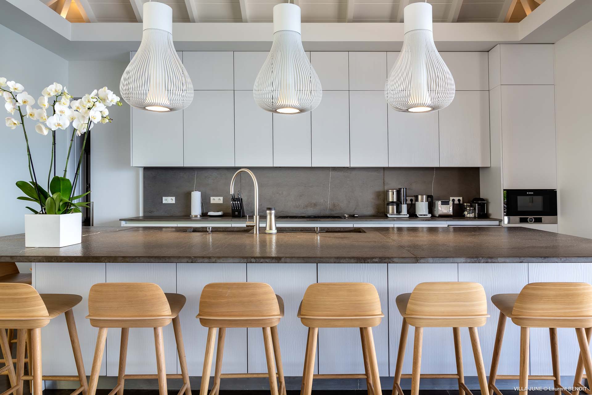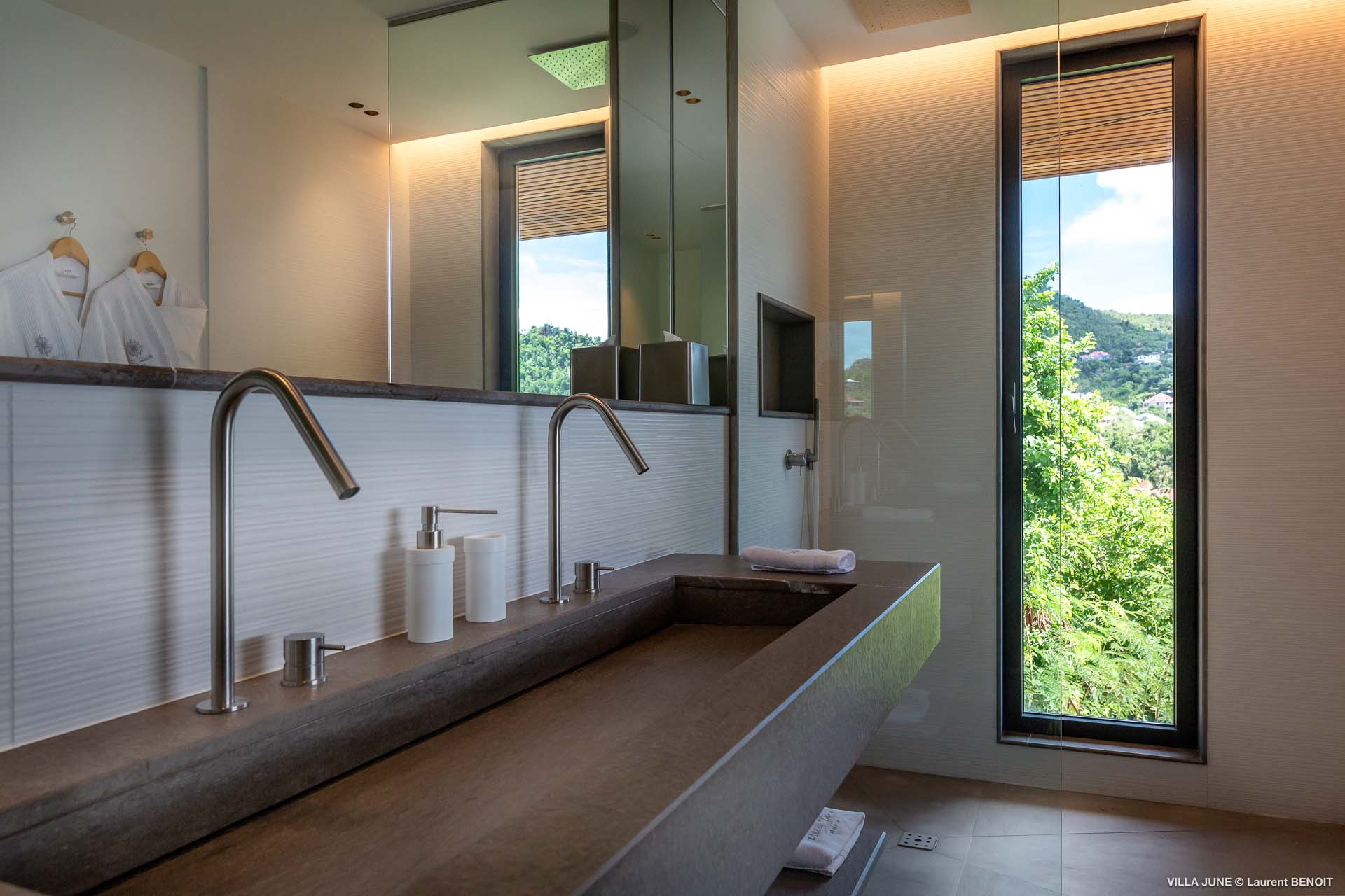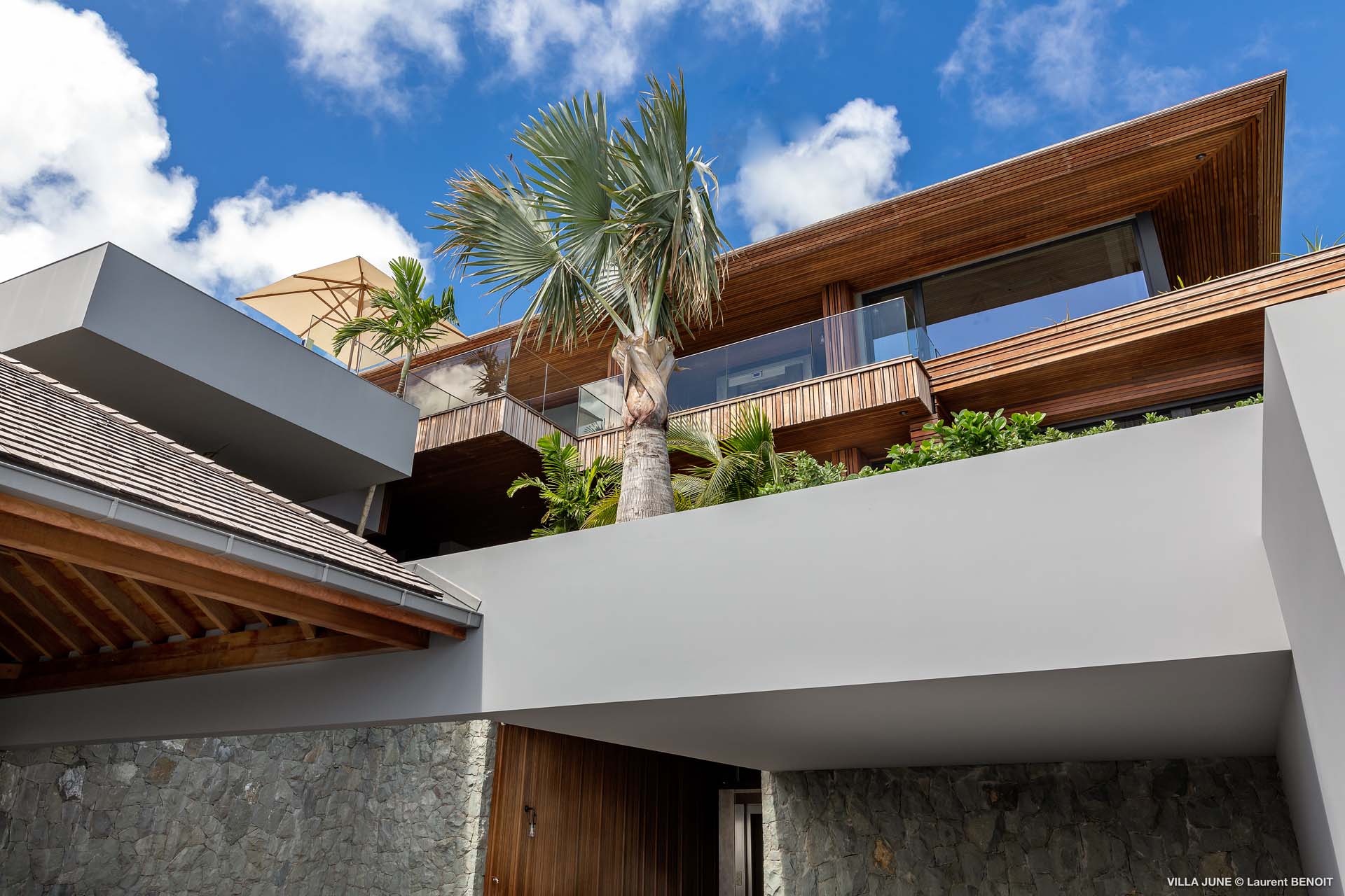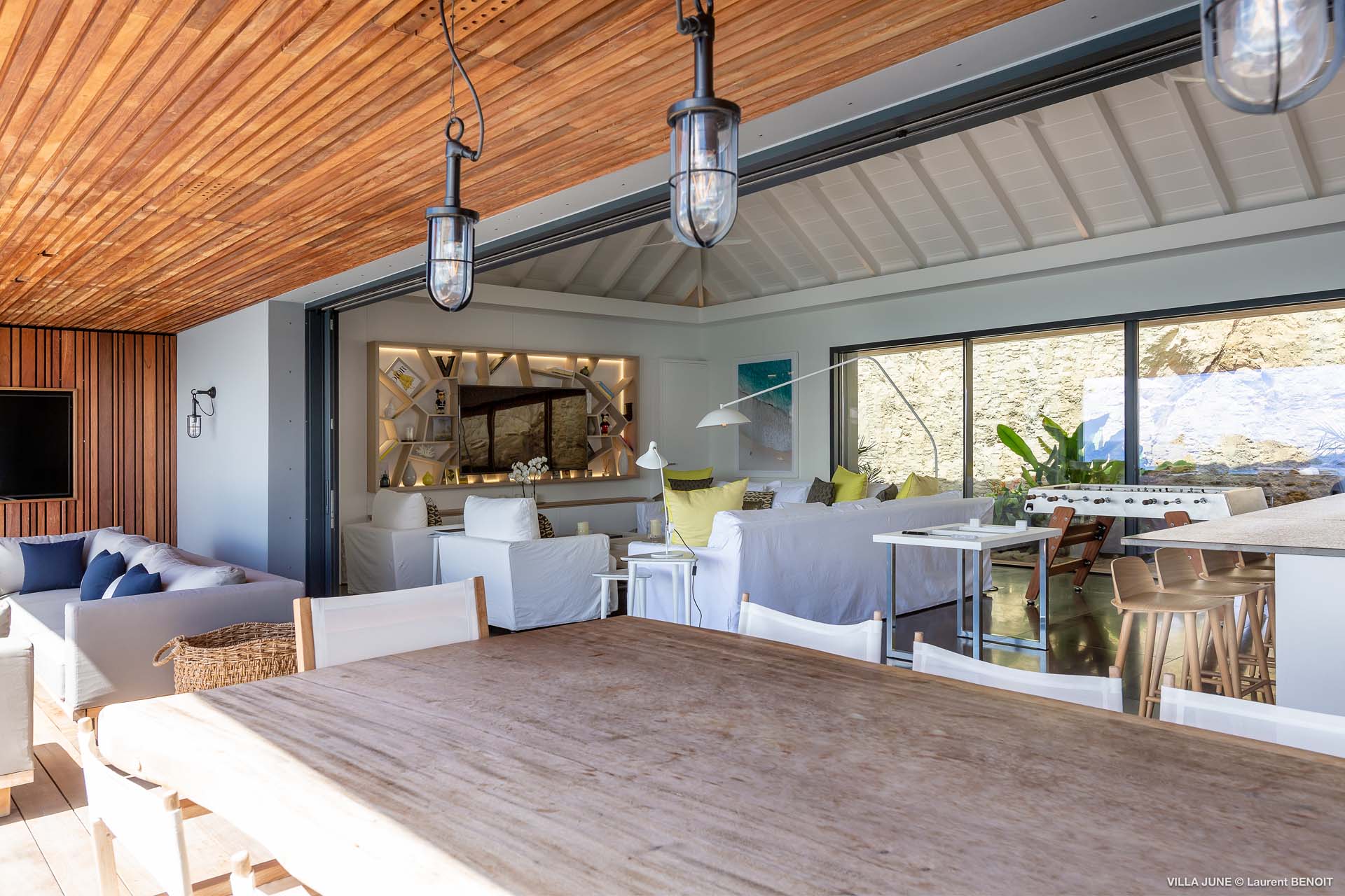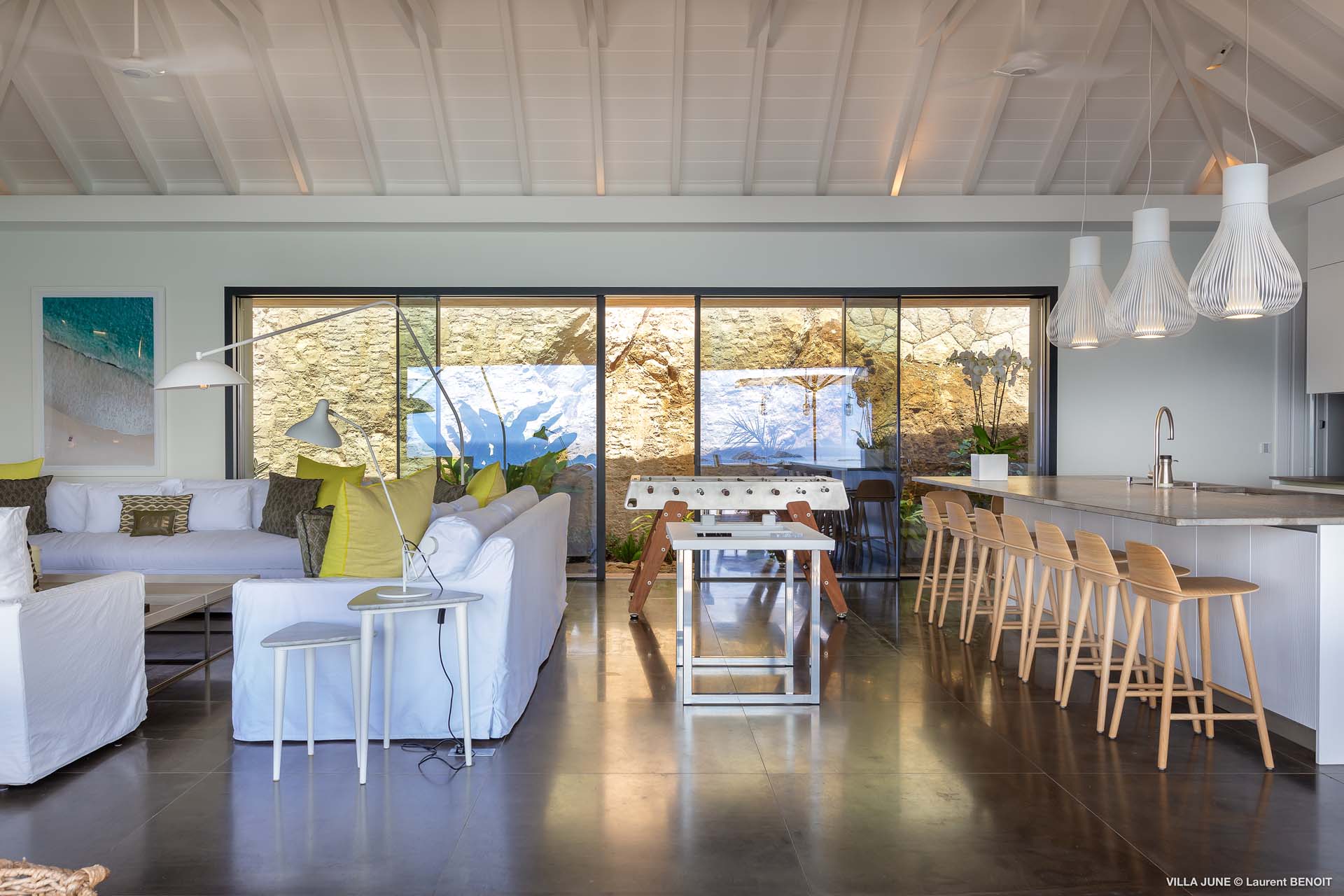 Embrace the good life at Villa June (villa code: WV JUN), a stunning 6-bedroom villa overlooking the harbor of Gustavia, St. Barts. Like a wide-angle camera lens, guests of this island home will enjoy fabulous views over the Caribbean Sea, watching as the luxury yachts sail to and from St. Barts’ elegant capital. Sleek, elegant, and sophisticated, Villa June is a graceful property that will capture your imagination as soon as you step foot inside. There are plenty of natural island woods, creating a contemporary and calm atmosphere, while the eclectic décor inside will please those with an eye for design and style. Located in the hills of Corossol, a new hotspot for the island’s most luxurious properties, Villa June enjoys a coveted location. There are excellent views across Gustavia harbor, while the beaches, shops, and restaurants of Gustavia and St. Jean are also within close driving distance. Villa June sprawls over three levels, with a flowing open plan characterized by a clean and modern design. There’s ample space to spread out and come together as a group, whether it’s in the luxurious home theater, the fitness room, or the beautiful great room at the property’s heart. A grand staircase and elevator connect the three levels. It’s here where you’ll find the large kitchen and living room. In the latter, beautifully soft sofas invite you to sink in and relax, diving into a good book or watching a film on the wall-mounted TV in front of a stunning shelf display. Sliding doors open wide to the outdoor terrace, framing the azure hues of the water and luxury yachts at anchor. Next to the living room is Villa June’s high-end kitchen. The large island has seating for 10 guests, making it the ideal spot to relax with a drink while you watch your private chef whip up a gourmet meal. You could choose to eat at the island or set up at the dining table on the covered terrace as an alternative. With the cool island breeze and outstanding views, this is the ideal setting for entertaining, opening a few bottles of wine, and toasting your island vacation over some fantastic local food. There’s a total of 6 bedrooms in Villa June, spread across the three levels to ensure privacy between guests. There are three on the main level. Next to the living room is the first, which connects to bedroom number two, an ideal choice for parents with young children. Of course, both rooms can be fully separated as well. The third bedroom on this level sits at the far end of the terrace, offering more privacy. Descending to the lower level brings you to the other three bedrooms, spread around the media and fitness rooms. The main focal point of the outdoor space is the heated, 70-foot-long infinity pool. Stretching the length of the terrace, the edge blends into the ocean beyond, creating the impression of a continuous waterscape with varied shades of blue. Slipping in for a refreshing dip here is impossible to resist. The pool is lined with plush loungers, ideal for sunbathing. You could also throw up the umbrellas for some shade, letting you drop off for a nap in the cool breezes. Back toward the house, the covered terrace is another beautiful spot to lounge around. There’s an outdoor sofa for cocktail hour and of course a beautiful dining table for alfresco meals. There’s additional seating and shade on the middle-level terrace that connects the bedrooms. During the December holidays, Thanksgiving, and Bucket, the villa rents at the full occupancy rate regardless of how many bedrooms are used and is an excellent villa for large groups traveling together with families with children.Please fill out the form to begin your inquiry and we will connect you with a seasoned villa rental specialist.