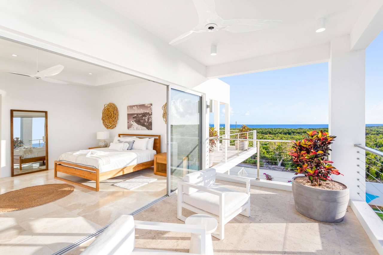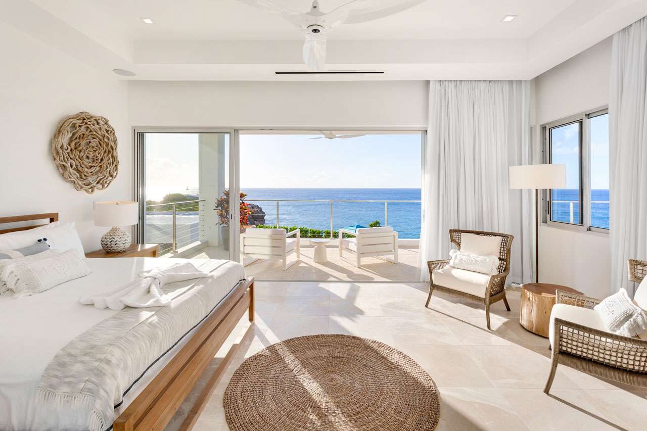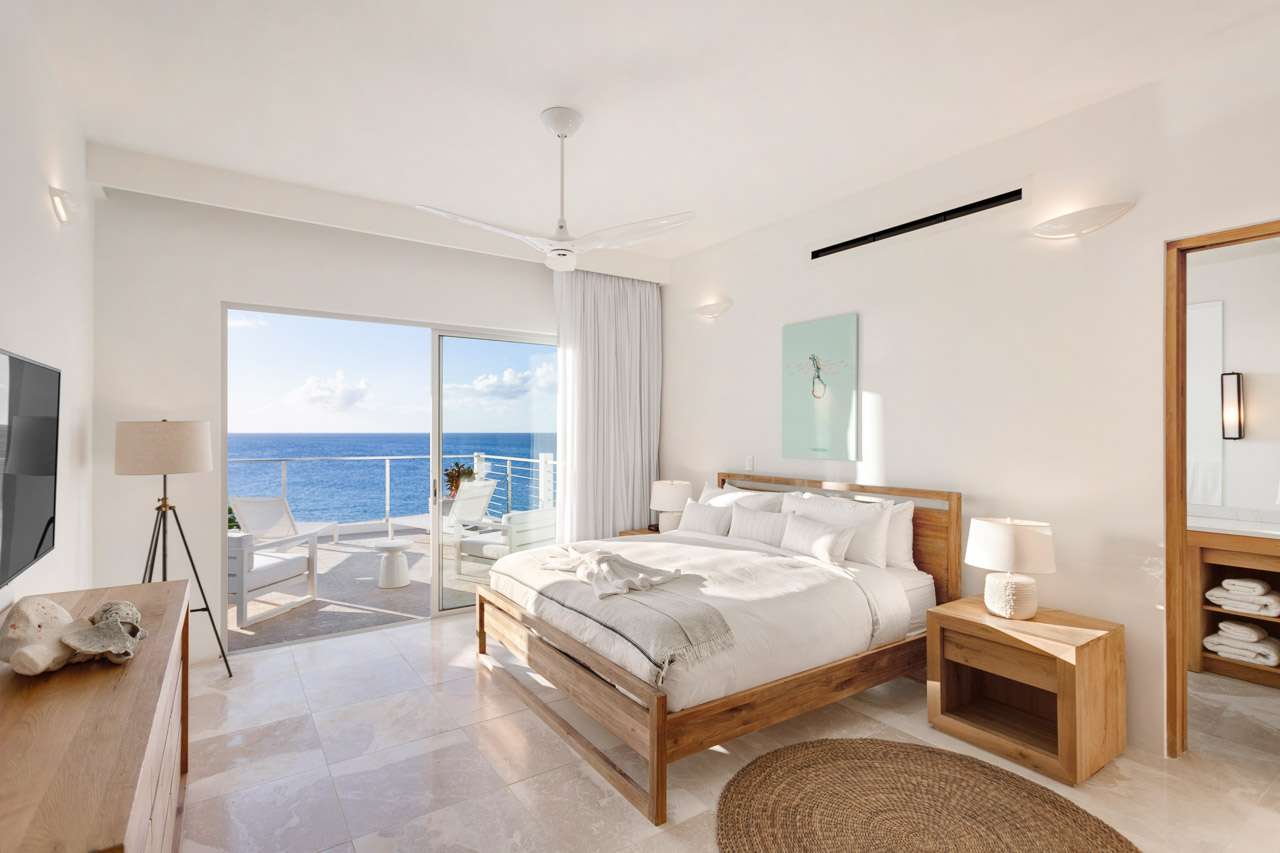 Upon arrival, floor-to-ceiling doors welcome guests with fresh sea breezes and immediate relaxation. The villa’s design artfully erases the boundary between indoor comfort and outdoor splendor, featuring ceiling fans, expansive terraces, a cliffside outdoor living room, a pool, and multiple balconies and lounge spaces to soak in the island’s serene atmosphere.