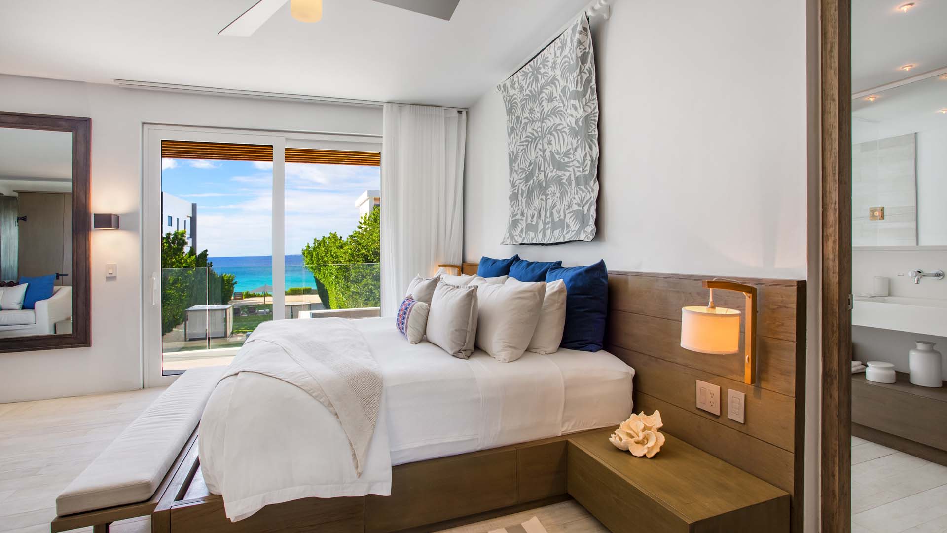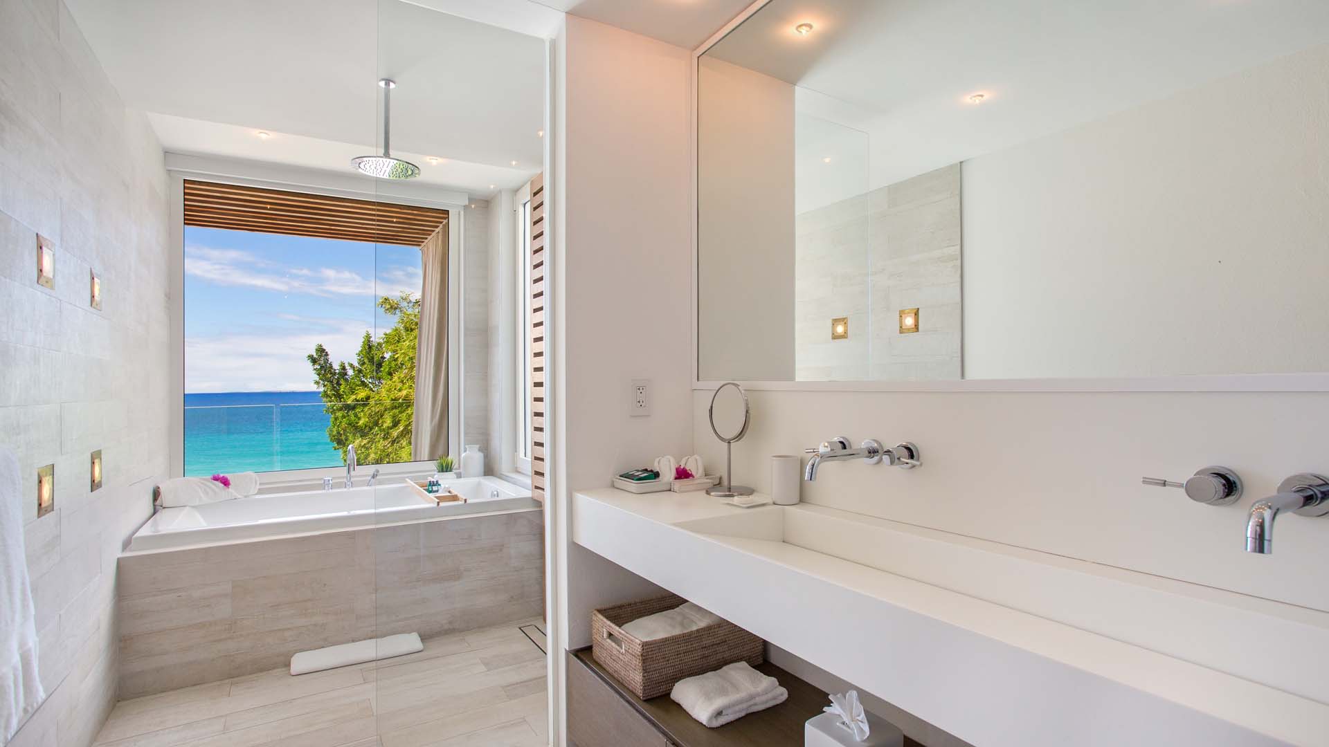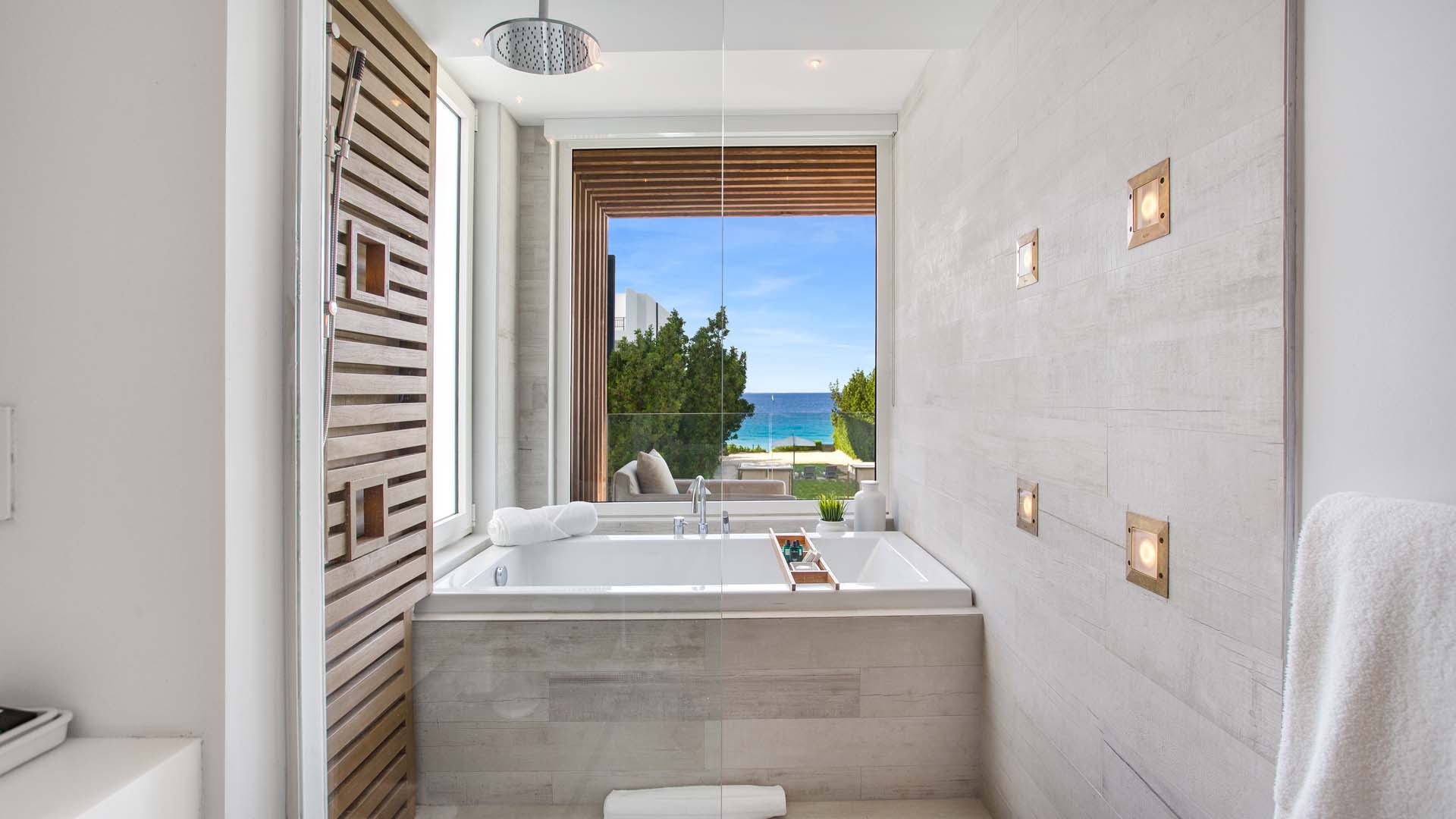 The villa's architecture makes the most of its spectacular setting. Floor-to-ceiling windows offer uninterrupted views and flood the interiors with natural light. Just steps from the powdery white sands, guests can stroll to nearby beach cafés or relax at the villa itself in open-air canopy beds, the beachside Jacuzzi, or the tranquil infinity pool.