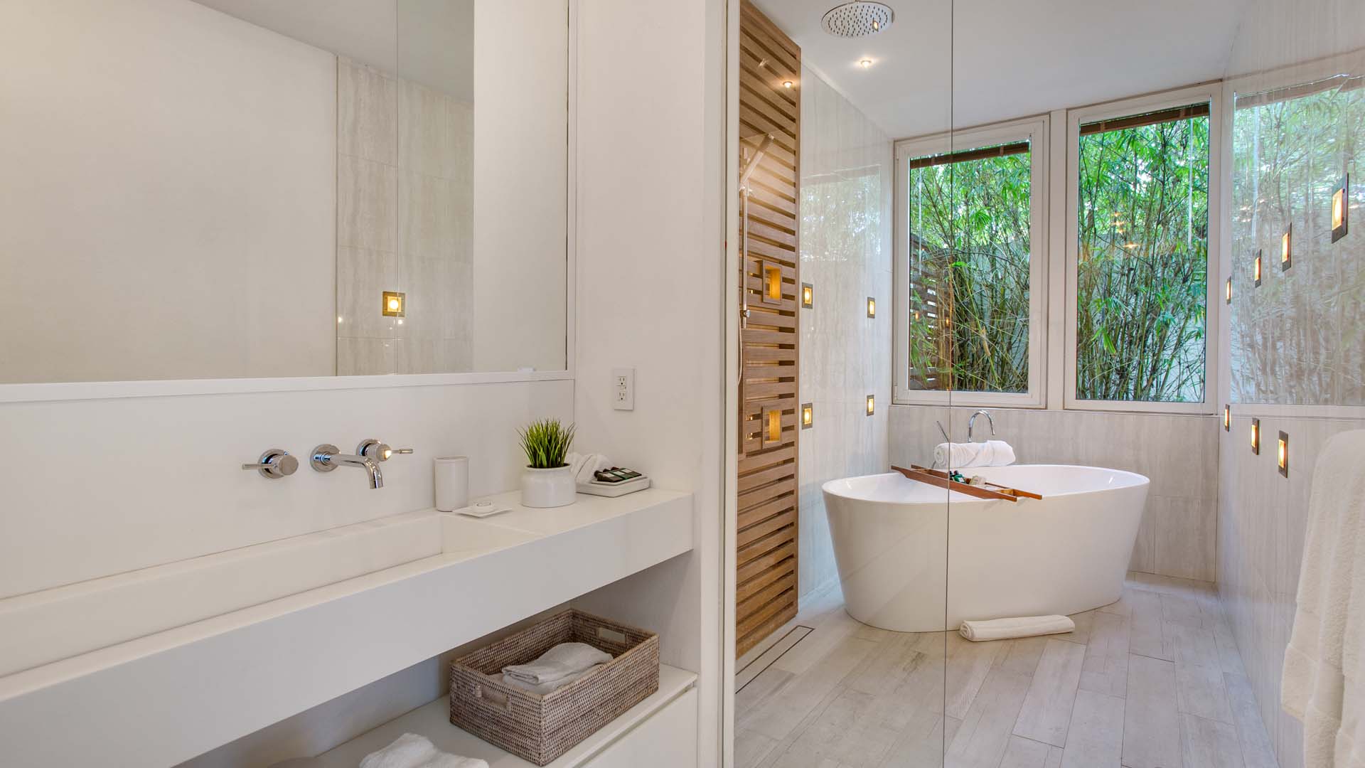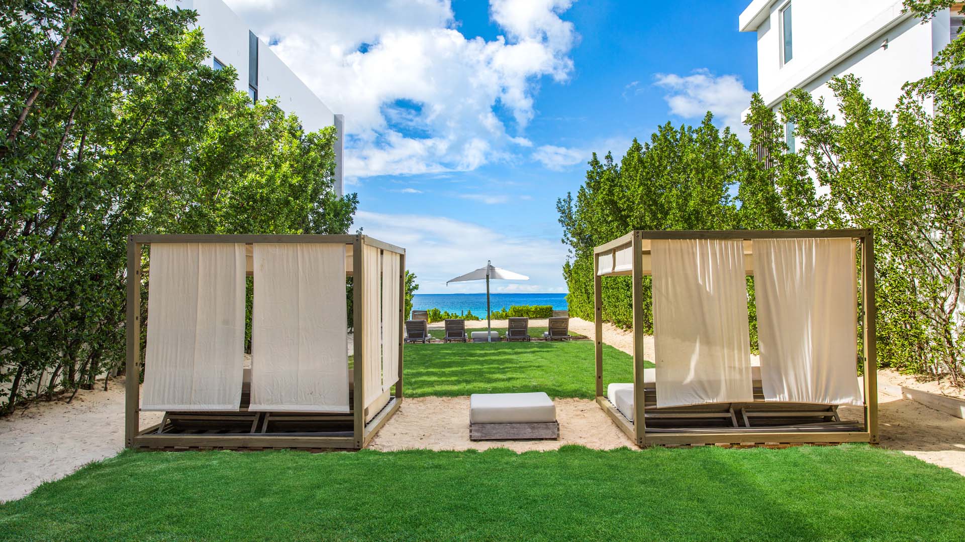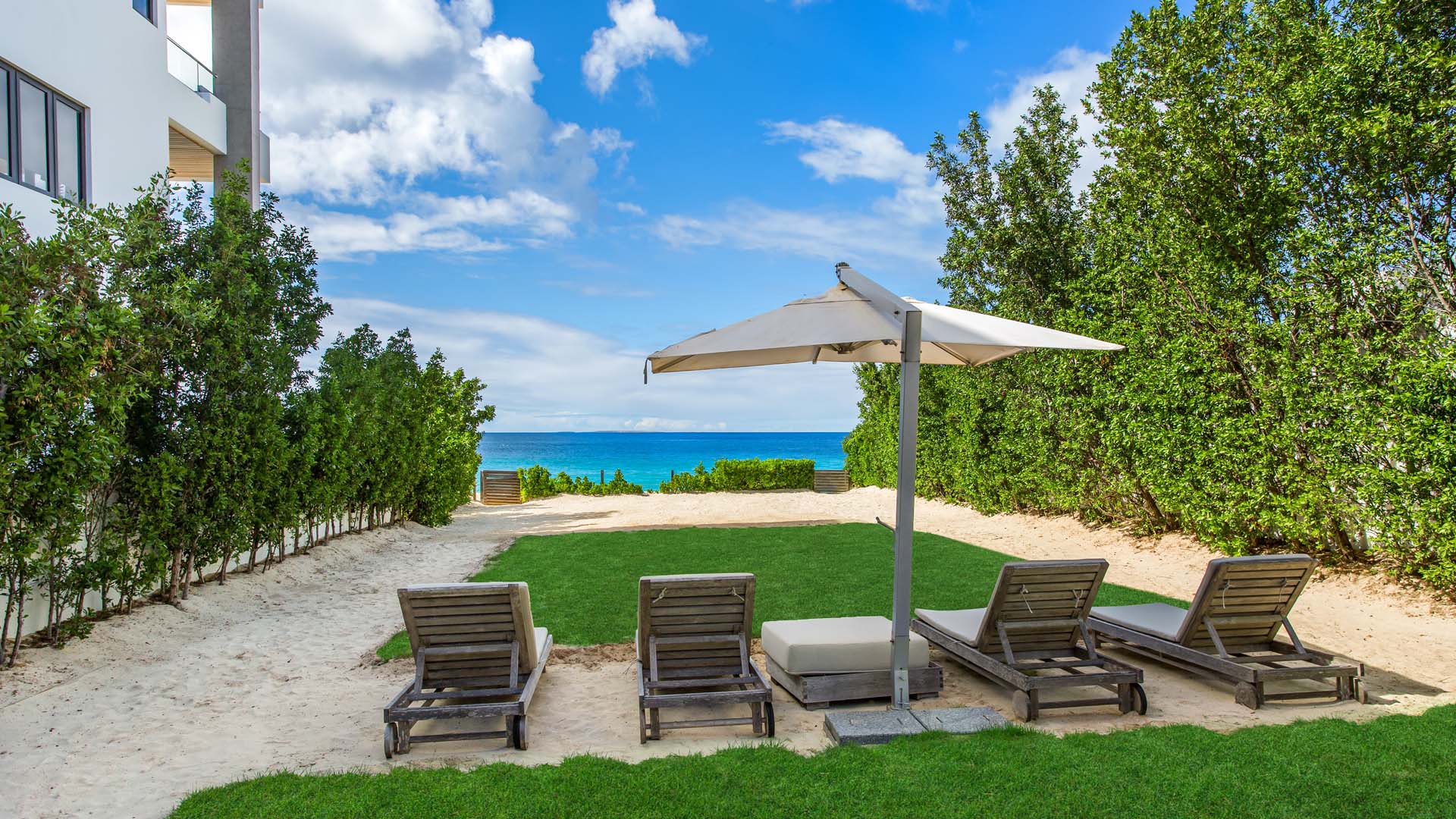 The villa's architecture makes the most of its spectacular setting. Floor-to-ceiling windows offer uninterrupted views and flood the interiors with natural light. Just steps from the powdery white sands, guests can stroll to nearby beach cafés or relax at the villa itself in open-air canopy beds, the beachside Jacuzzi, or the tranquil infinity pool.