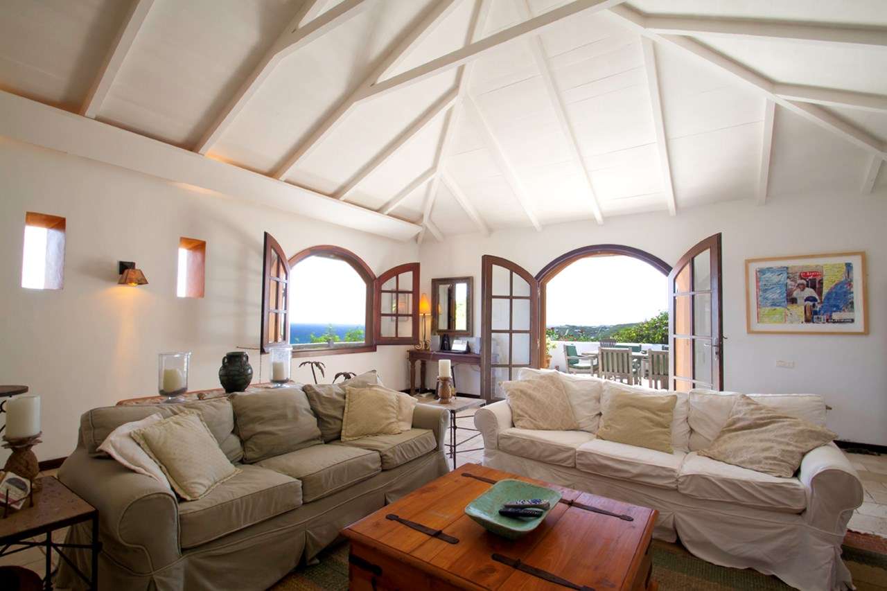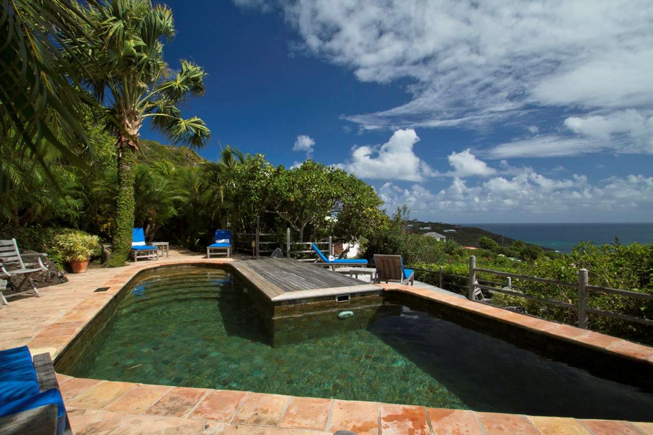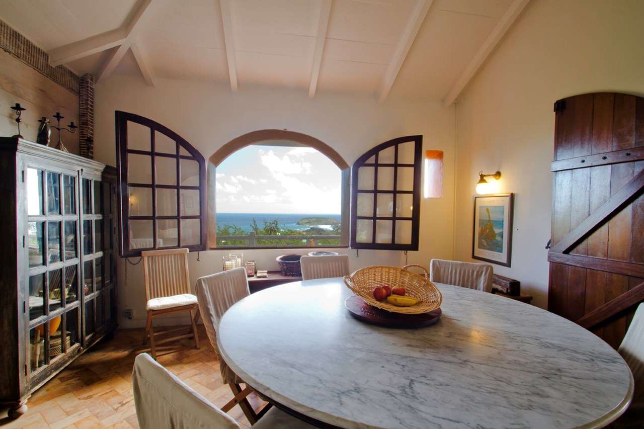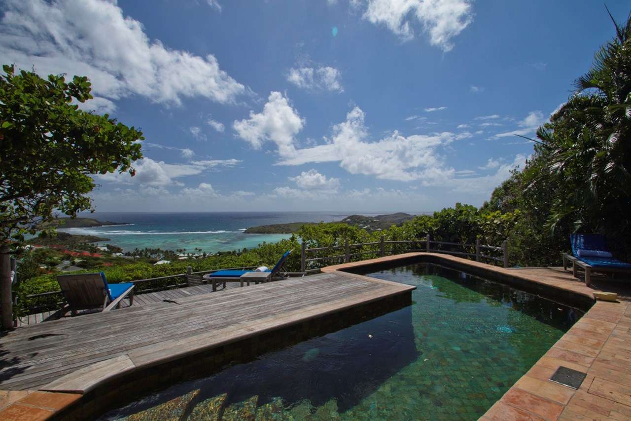 Castaway to Villa Kyody (villa code: WV KDY), a 2-bedroom villa located in Marigot within minutes of several beaches and restaurants. Nestled in the hillside above Grand Cul-de-Sac Bay, this villa has lovely views of the Caribbean and the offshore island of La Tortue. The interiors feature arched doors and windows, wooden accents, and beautiful stonework. Elegant island furnishings and local artwork help give the home the atmosphere of a South American tropical hideaway. Secluded amongst the lush foliage, Villa Kyody offers peerless privacy in one of St. Barts’ more tranquil neighborhoods. Beaches and restaurants at Grand Cul-de-Sac Bay are just a 10-minute walk away. As soon as you enter Villa Kyody you’re greeted with the spacious living room. Plush sofas and elegant wooden furnishings make it a great place to relax. Through the windows, you can glimpse the glimmering Caribbean and undulating hills surrounding the bay. Doors open towards the terrace and pool deck, letting you wash the entire space with natural light and cooling sea breezes. If you’re after something a bit cozier, Villa Kyody also features a lovely reading room upstairs. A bookshelf has a large variety of novels to read, right next to a soft daybed ideal for getting lost in a story. Connected to the living room is Villa Kyody’s well-equipped galley kitchen. The cabinets clad in tropical wood and views of the lush foliage from the window will inspire you to experiment with the local flavors. To make things even easier, our concierge can organize grocery pre-stocking or delivery, catered meals, or arrange private chef service for a special occasion. When it’s time to dine, a separate dining room is next to the living room. A rounded wooden table has seating for up to 8 guests, making it a fabulous spot for an elegant dinner party. Open-air dining is also available at Villa Kyody. Next to the dining room is a charming cobblestone patio, with an oriental-inspired low-lying table for dining. Next to the living room is another outdoor dining table, this one with space for 6 guests overlooking the ocean. The master bedroom is located on the main floor and accessed via a hallway off the living room. This comfortable room features a king-sized bed with mosquito netting and a spacious ensuite bathroom. Ascending upstairs leads you to the second bedroom. This space also has a king-sized bed and ensuite bathroom, as well as stunning views over the shimmering Caribbean. The outdoor spaces at Villa Kyody wrap around the length of the property. From everywhere, you can admire the emerald hills sloping gently down to meet the turquoise water at Grand Cul-de-Sac. A wooden and stone deck surrounds the unique, hand-cut slate pool. The water retains the warmth of the morning sun throughout the day, making it a great spot to enjoy a swim. Loungers are ideal for soaking up the island rays. If the open water is more your style, then the beaches at both Marigot Bay and Grand Cul-de-Sac are a 10-minute walk down the hill. As the day comes to a close, a covered lounge area is the best seat in the house to enjoy a cocktail as you watch the sunset over the hills. During the Thanksgiving and December holidays, the villa rents at the full occupancy rate regardless of how many bedrooms are used.Please fill out the form to begin your inquiry and we will connect you with a seasoned villa rental specialist.