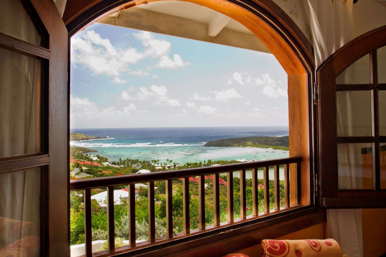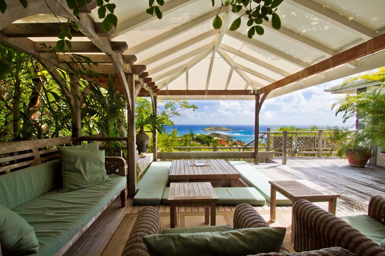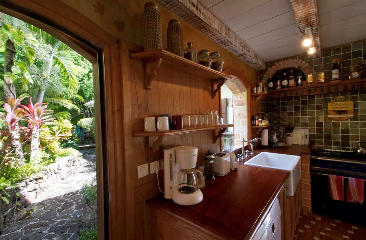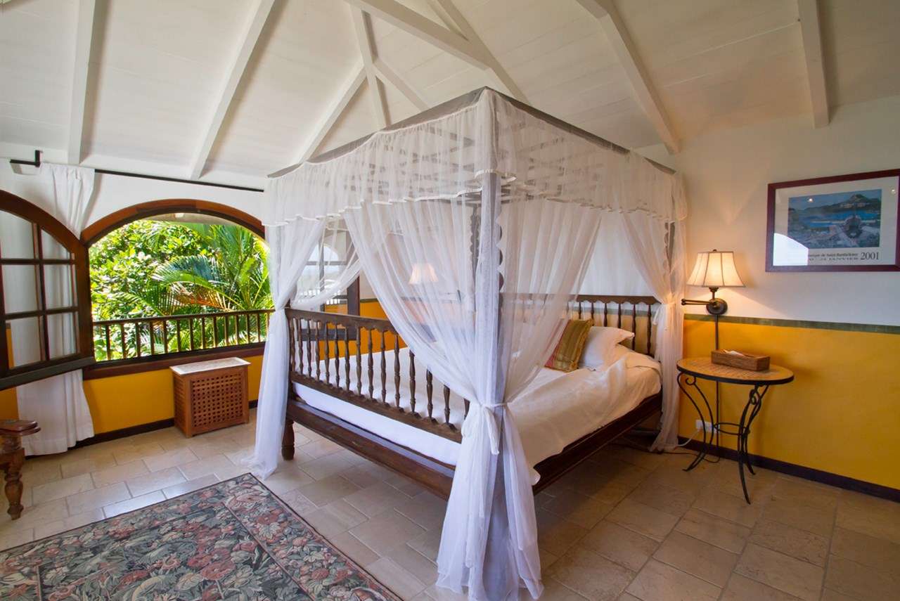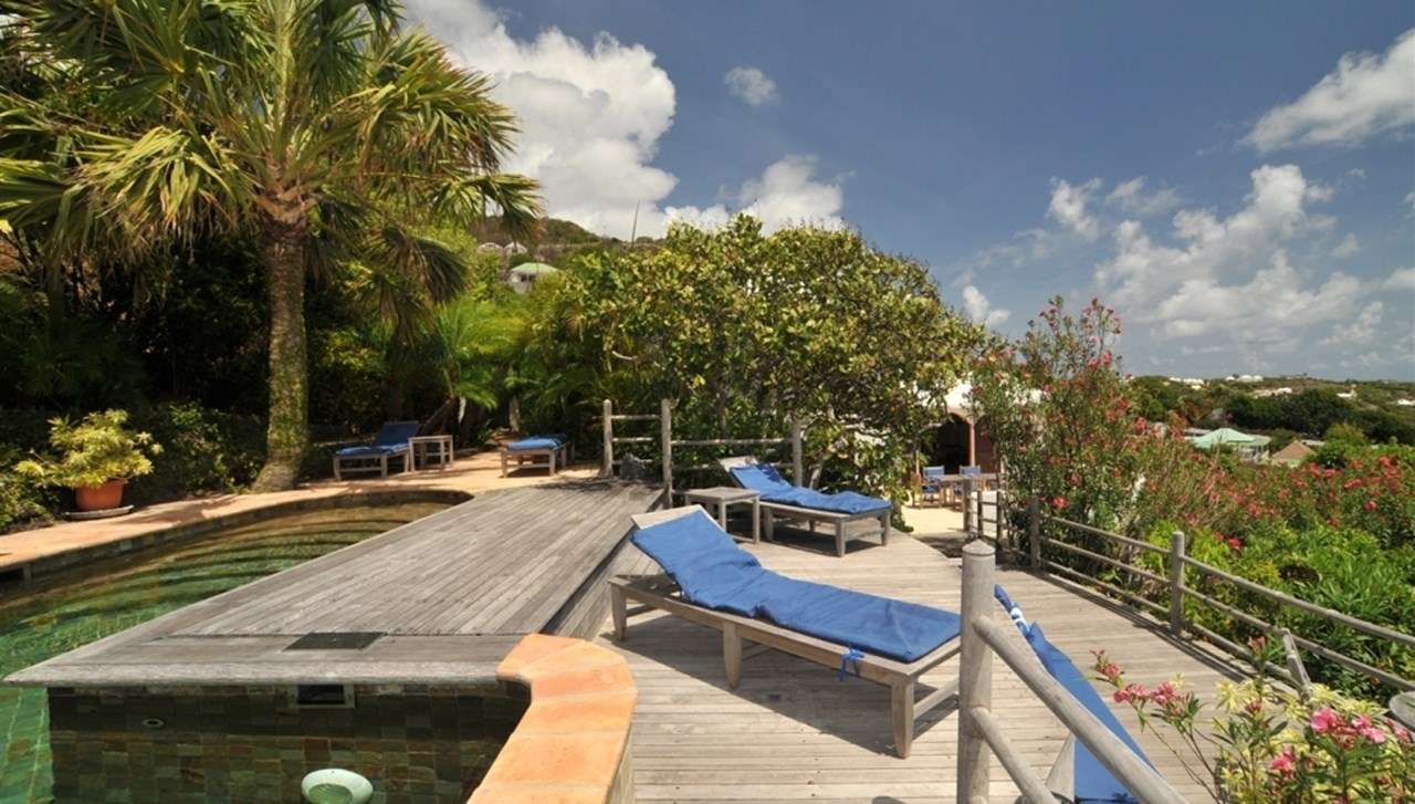 Castaway to Villa Kyody (villa code: WV KDY), a 2-bedroom villa located in Marigot within minutes of several beaches and restaurants. Nestled in the hillside above Grand Cul-de-Sac Bay, this villa has lovely views of the Caribbean and the offshore island of La Tortue. The interiors feature arched doors and windows, wooden accents, and beautiful stonework. Elegant island furnishings and local artwork help give the home the atmosphere of a South American tropical hideaway. Secluded amongst the lush foliage, Villa Kyody offers peerless privacy in one of St. Barts’ more tranquil neighborhoods. Beaches and restaurants at Grand Cul-de-Sac Bay are just a 10-minute walk away. As soon as you enter Villa Kyody you’re greeted with the spacious living room. Plush sofas and elegant wooden furnishings make it a great place to relax. Through the windows, you can glimpse the glimmering Caribbean and undulating hills surrounding the bay. Doors open towards the terrace and pool deck, letting you wash the entire space with natural light and cooling sea breezes. If you’re after something a bit cozier, Villa Kyody also features a lovely reading room upstairs. A bookshelf has a large variety of novels to read, right next to a soft daybed ideal for getting lost in a story. Connected to the living room is Villa Kyody’s well-equipped galley kitchen. The cabinets clad in tropical wood and views of the lush foliage from the window will inspire you to experiment with the local flavors. To make things even easier, our concierge can organize grocery pre-stocking or delivery, catered meals, or arrange private chef service for a special occasion. When it’s time to dine, a separate dining room is next to the living room. A rounded wooden table has seating for up to 8 guests, making it a fabulous spot for an elegant dinner party. Open-air dining is also available at Villa Kyody. Next to the dining room is a charming cobblestone patio, with an oriental-inspired low-lying table for dining. Next to the living room is another outdoor dining table, this one with space for 6 guests overlooking the ocean. The master bedroom is located on the main floor and accessed via a hallway off the living room. This comfortable room features a king-sized bed with mosquito netting and a spacious ensuite bathroom. Ascending upstairs leads you to the second bedroom. This space also has a king-sized bed and ensuite bathroom, as well as stunning views over the shimmering Caribbean. The outdoor spaces at Villa Kyody wrap around the length of the property. From everywhere, you can admire the emerald hills sloping gently down to meet the turquoise water at Grand Cul-de-Sac. A wooden and stone deck surrounds the unique, hand-cut slate pool. The water retains the warmth of the morning sun throughout the day, making it a great spot to enjoy a swim. Loungers are ideal for soaking up the island rays. If the open water is more your style, then the beaches at both Marigot Bay and Grand Cul-de-Sac are a 10-minute walk down the hill. As the day comes to a close, a covered lounge area is the best seat in the house to enjoy a cocktail as you watch the sunset over the hills. During the Thanksgiving and December holidays, the villa rents at the full occupancy rate regardless of how many bedrooms are used.Please fill out the form to begin your inquiry and we will connect you with a seasoned villa rental specialist.
