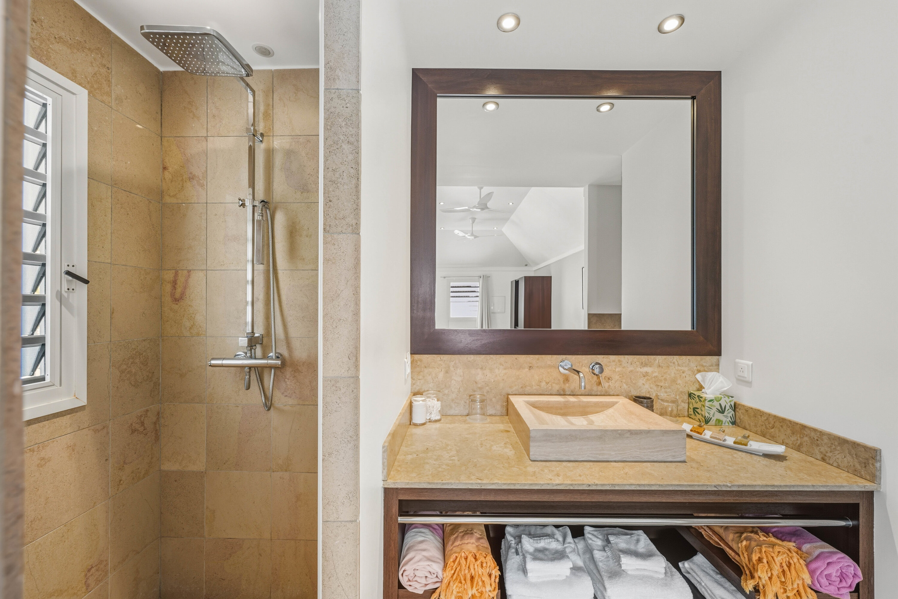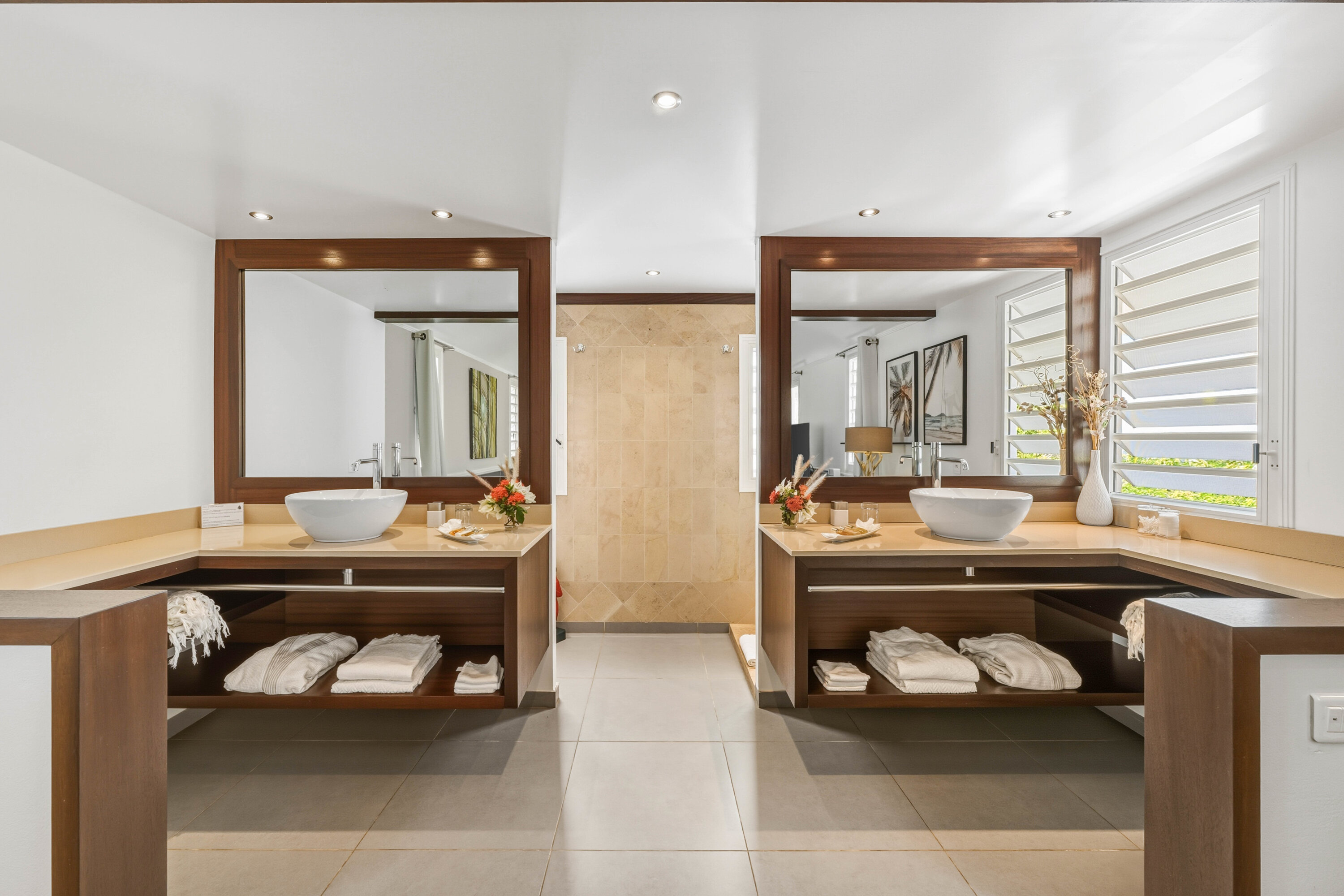 L’Enclos Villa’s well-equipped kitchen has everything you need to whip up gourmet meals. Discrete under-counter refrigerators mean that there’s plenty of space for everyone to get involved during mealtime. Our concierge can organize grocery pre-stocking or delivery, catered meals, or arrange private chef service for a special occasion.