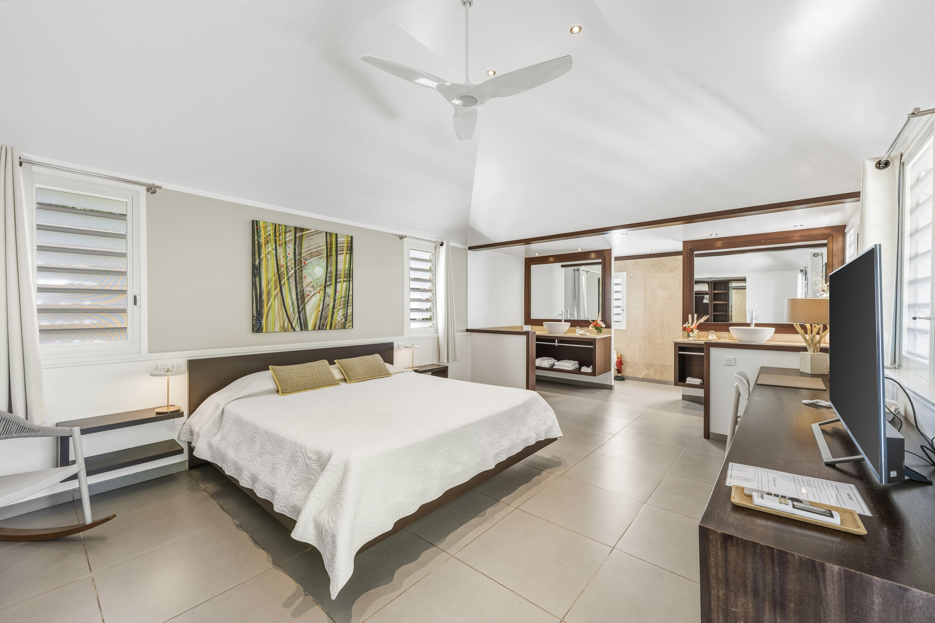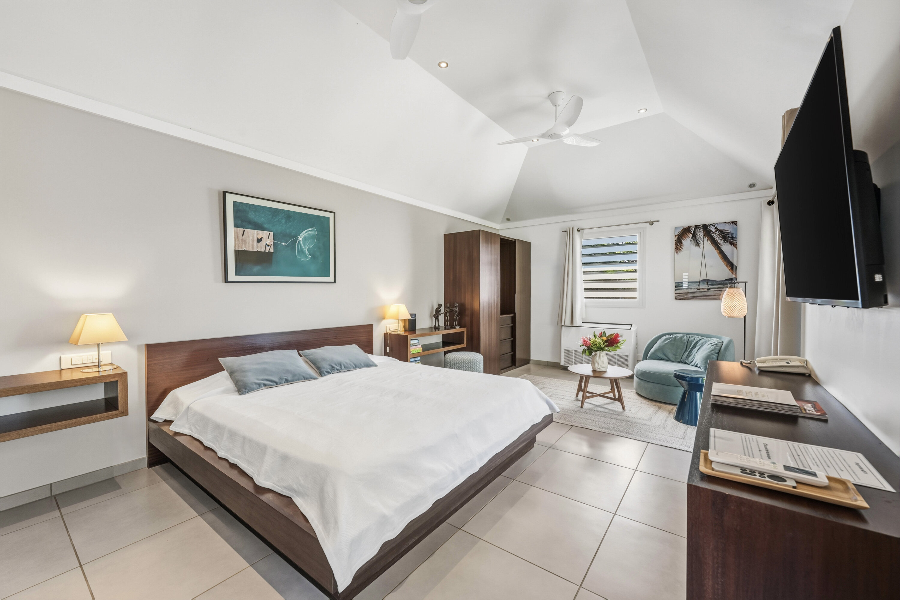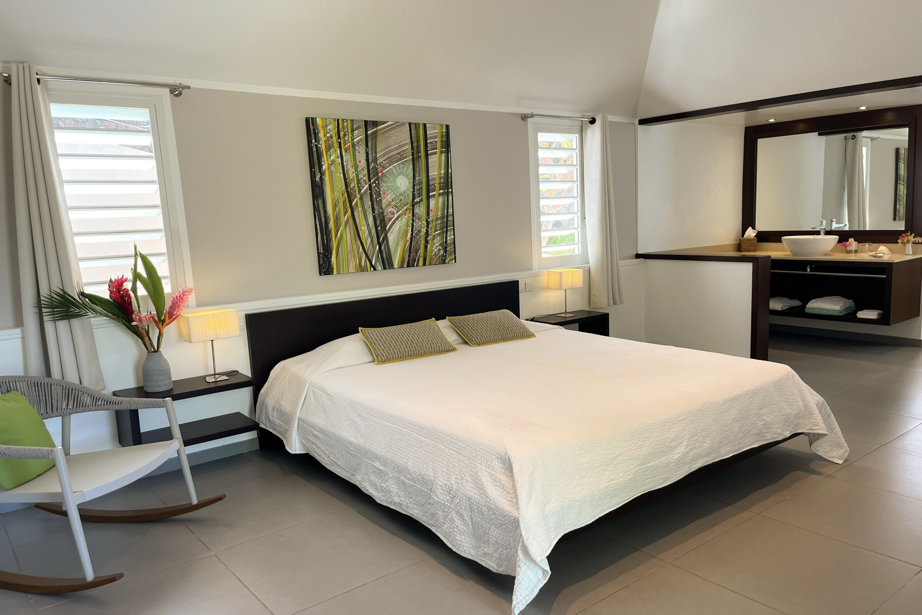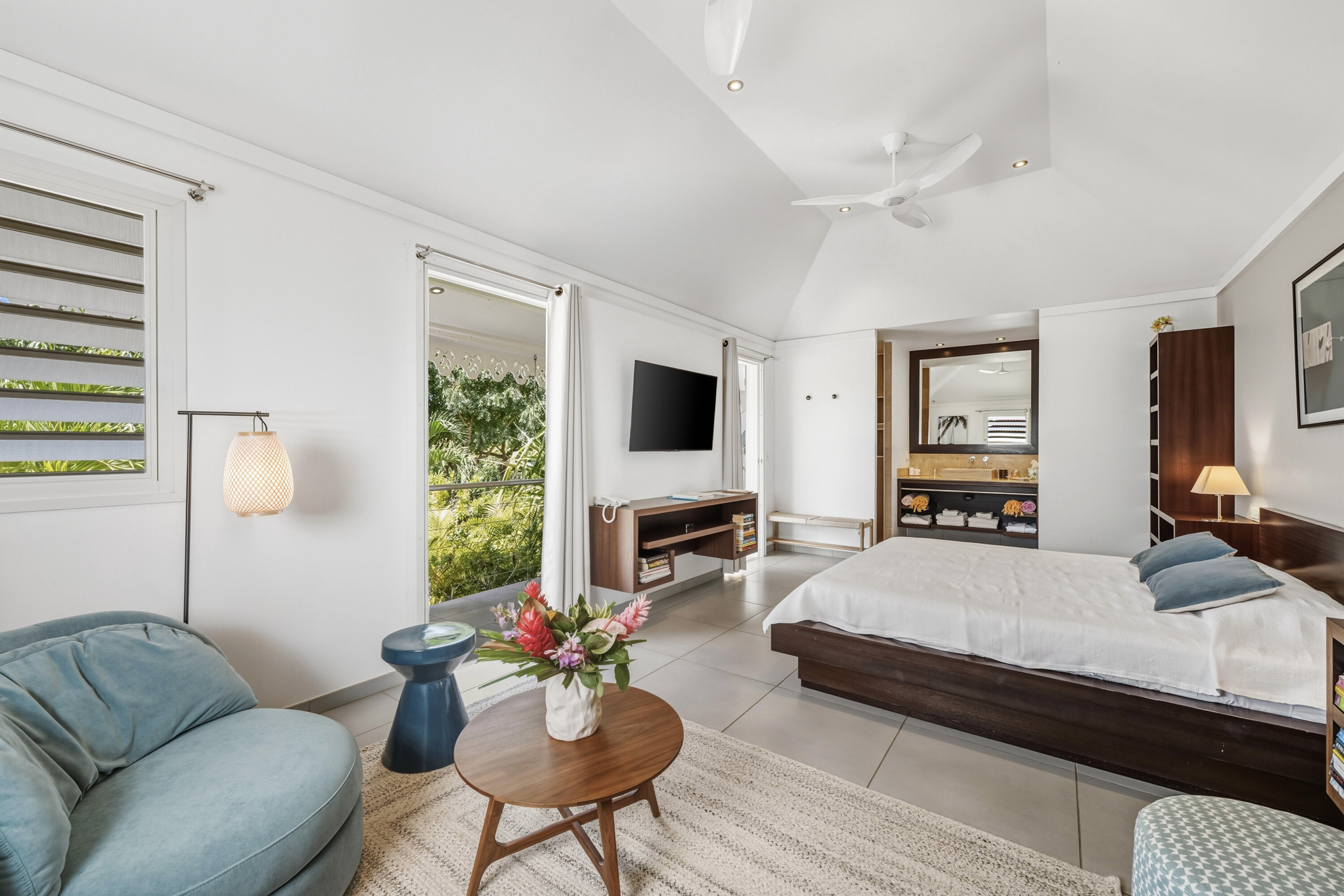 The two bedrooms at Villa L’Enclos each occupy their own bungalow, ensuring the utmost privacy for guests. Vibrant feature walls add a splash of life to each room, while wall-mounted TVs let you unwind before bed with a movie from under the covers.