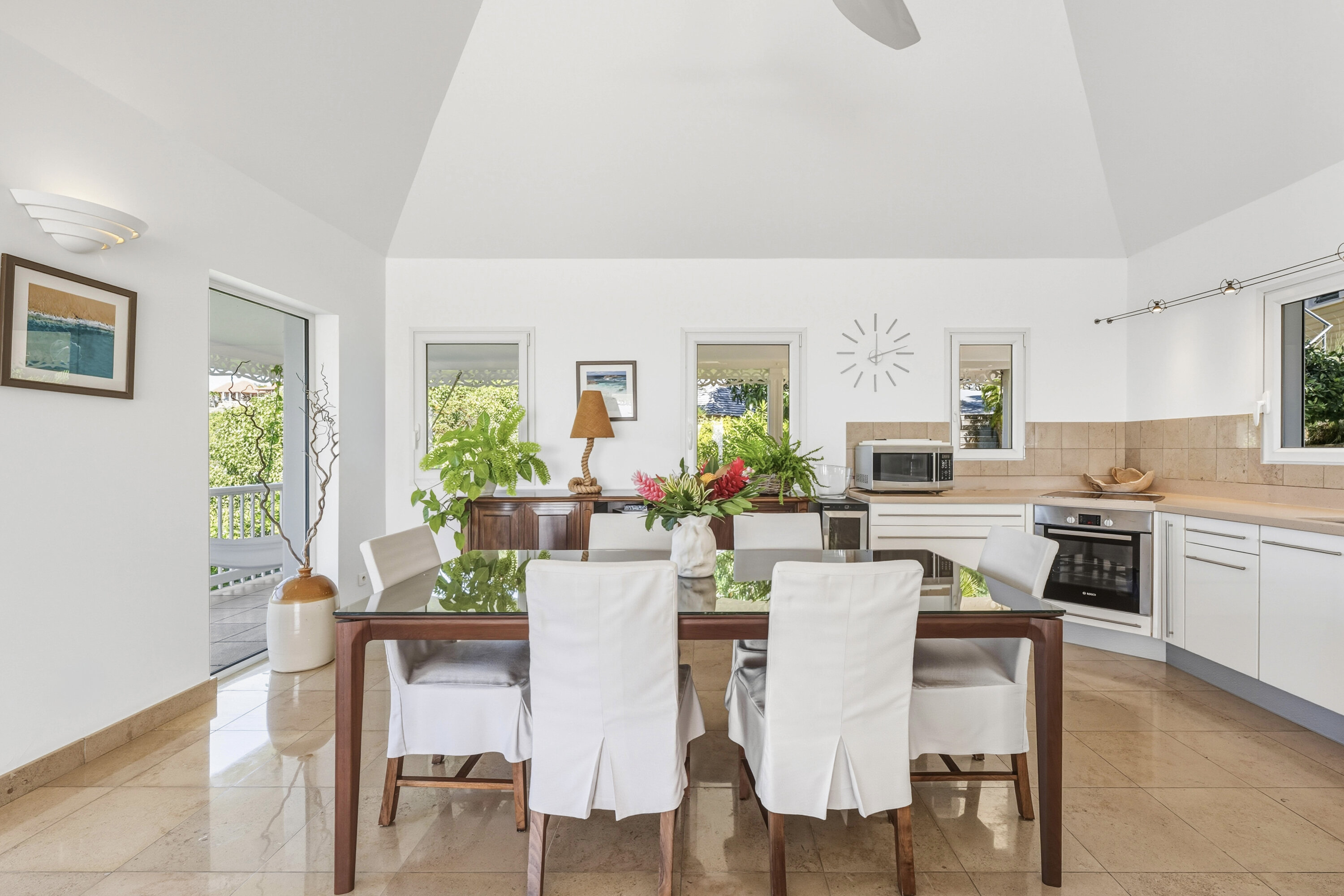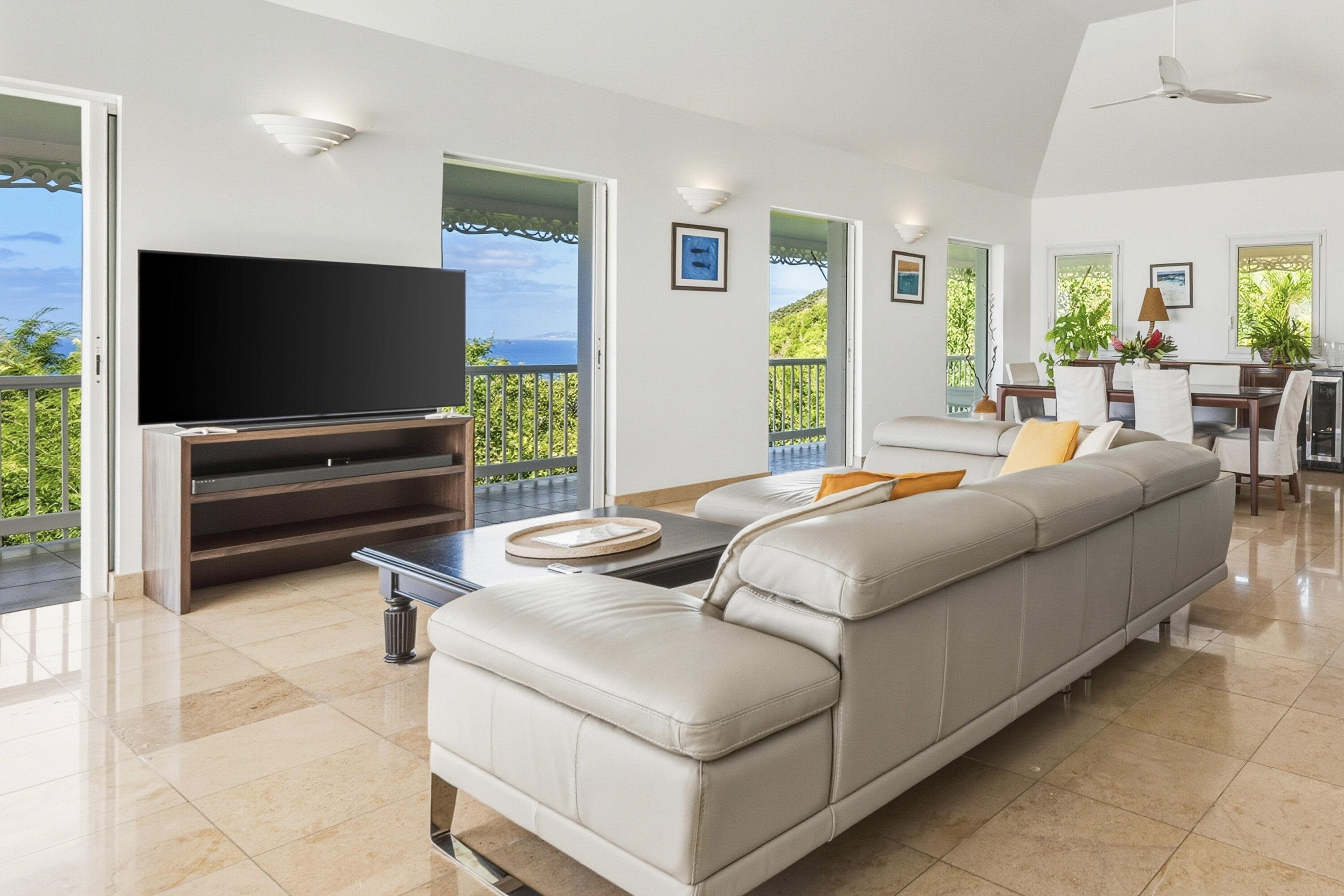 An open-plan great room at Villa L’Enclos contains the living room, dining area, and kitchen. French doors open towards the outdoor pool terrace, letting in plenty of natural light and sea breezes.
