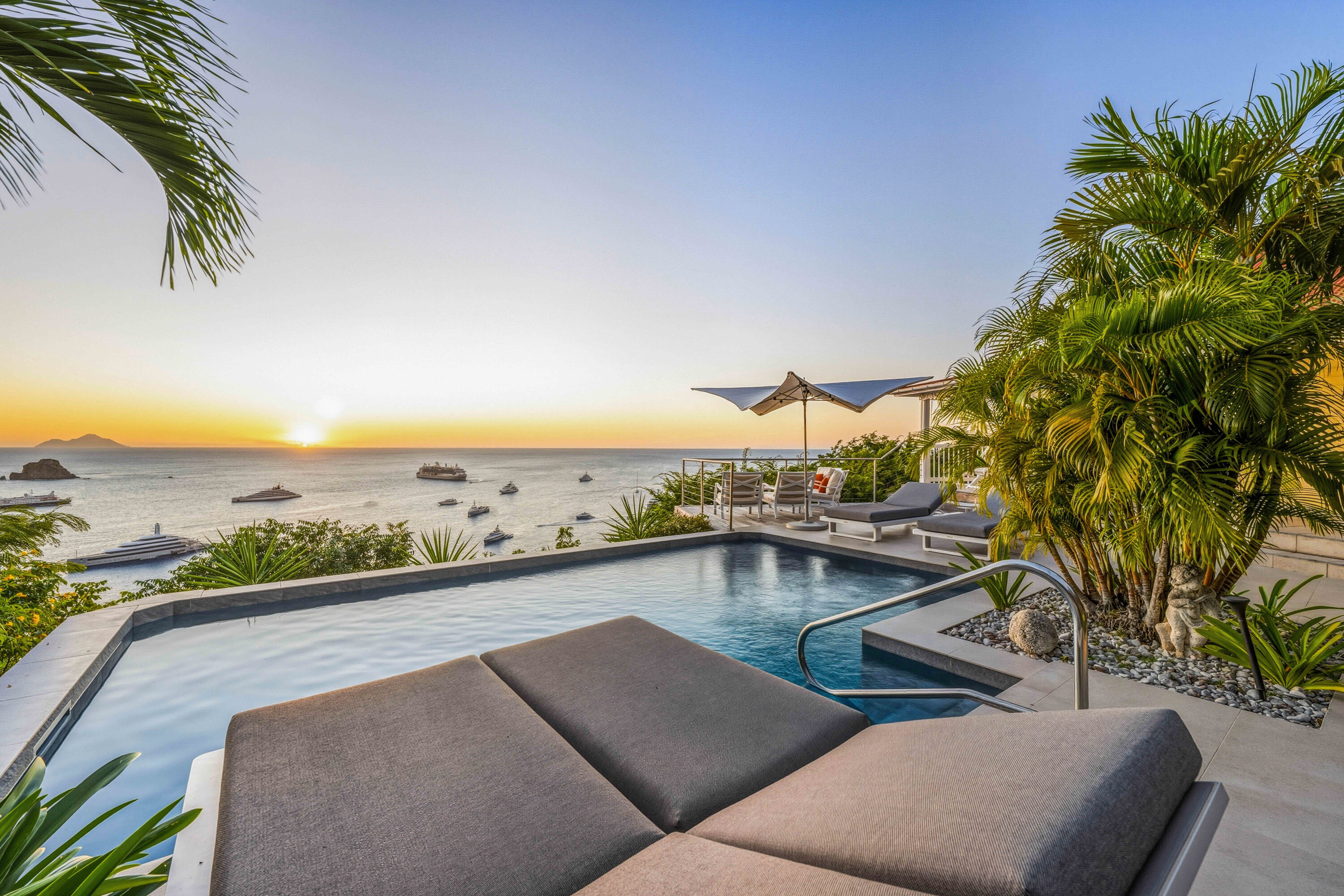 Above the pool is a dining deck, with the best views in the house. There’s nowhere better to watch the sunset, admiring as yachts return to port in Gustavia in front of a sky blazing with hues of red, orange, and gold.