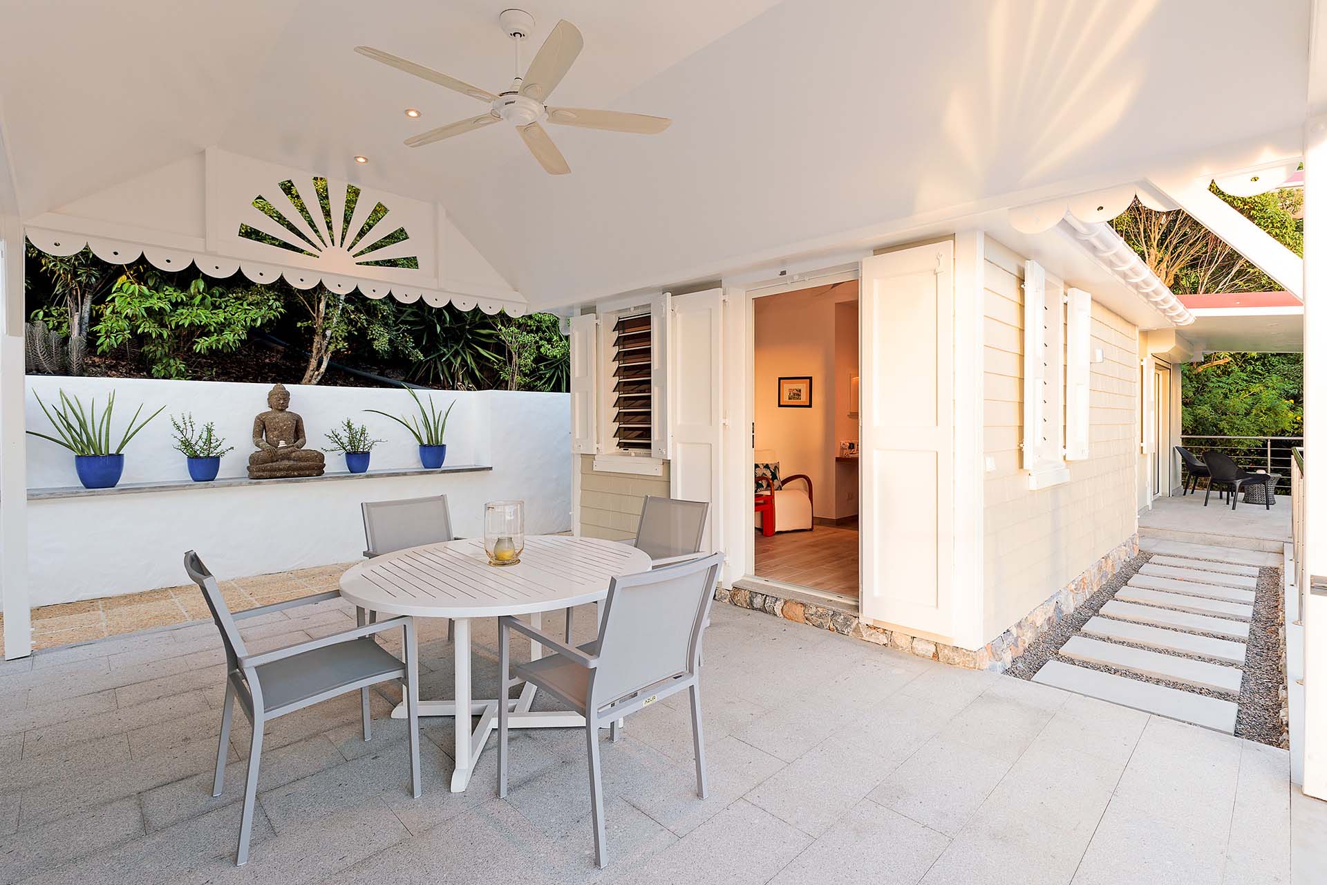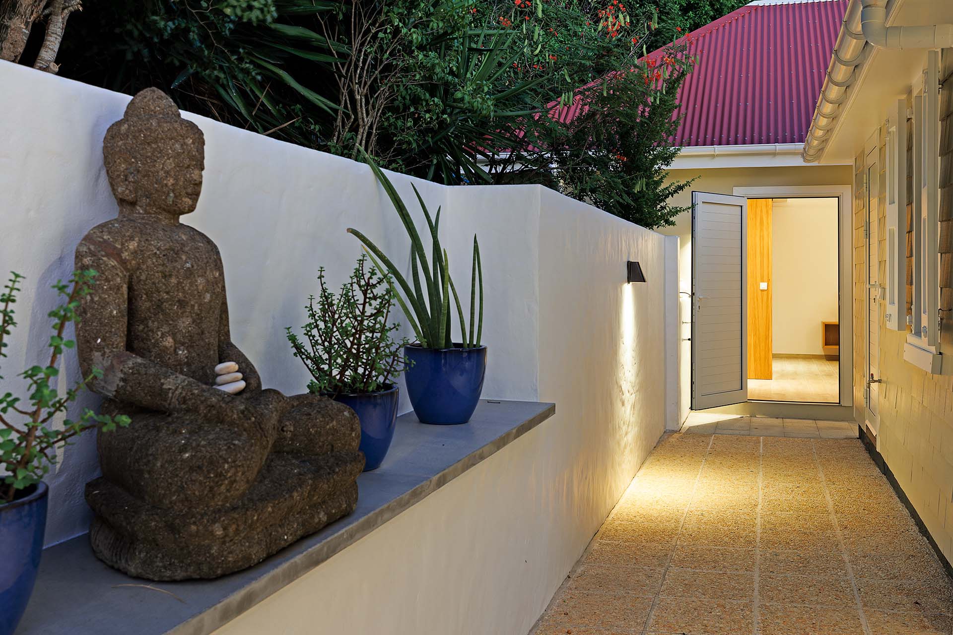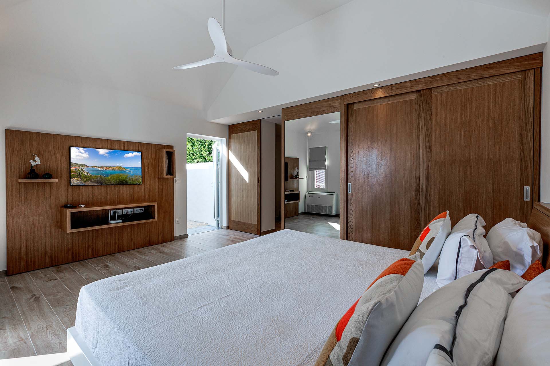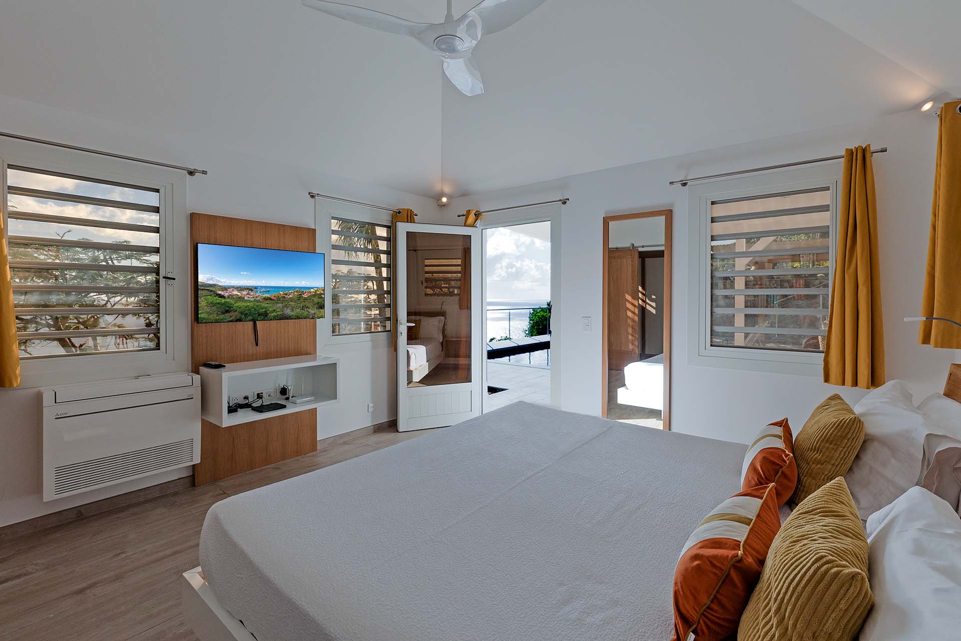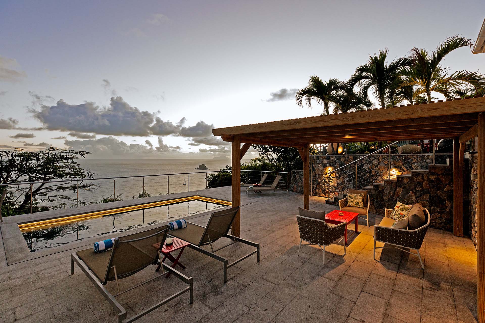 Welcome to Villa La Baleine (villa code: WV BAL), a charming 3-bedroom villa in Colombier, St. Barts. Located high in the hills, this island home enjoys breathtaking views of the ocean and nearby islands, all within minutes of the beach and shopping. There’s a distinct West Indies aesthetic to Villa La Baleine, with the design employing a variety of colors throughout the furnishings and décor. The layout too embraces the simplicity of island living, with several airy bungalows helping to blur the line between inside and out. Relaxed, quiet, and laid-back, this is an ideal choice for your island getaway. With a wonderful location in the hills of Colombier, Villa La Baleine is well connected to everything you might need for a luxurious Caribbean vacation. Flamands Beach is only a short drive away, as are the shops and restaurants of the capital Gustavia. Simple, bright, and airy, the living spaces inside Villa La Baleine make it easy to shrug off the rushes of modern life. Well-kept and with superb attention to detail, expect all the creature comforts you’d want from a luxurious St. Barts villa. A main great room combines the living room with the kitchen. The former is furnished with comfortable sofas and armchairs, inviting spots to sink in and unwind with a morning coffee or after a day exploring the island. Behind the living room is Villa La Baleine’s well-equipped kitchen. It has everything you might need for preparing meals, making it easy to whip up everything from quick snacks to gourmet feasts. Our concierge is also on hand to help – why not ask us to arrange a grocery delivery, or perhaps an evening with a private chef? The dining table is outside underneath a gazebo, letting you soak up the warm evening air and island breezes with your meal. The 3 bedrooms at Villa La Baleine are elegantly outfitted, spread across the main home and two separate bungalows to ensure privacy between guests. The bedroom bungalows are both accessed from the outdoor terrace. One has a king-sized bed with access to a hallway bathroom, the other has a king-sized bed with a private ensuite. Ascending upstairs above the main house reveals the master bedroom, where a four-poster king-sized bed promises a wonderful night’s sleep. This space also has a luxurious ensuite, a mini-fridge, and ocean views. Spending your time outside at Villa La Baleine is incredibly rewarding. A wooden terrace surrounds the villa’s plunge pool, with loungers for sunbathing and lush tropical plants bordering the edge. Nearby, the dining gazebo also features a gas grill, ideal for island-style cookouts. Two hammocks strung up here are also tempting spots to relax. An upper-level terrace features a sitting area, an idyllic spot for sunset cocktails in the evening. With outstanding views over the Caribbean and the offshore islands, this area will become an instant favorite for gathering in the late afternoon as the golden glow unfolds across the sky. During the Thanksgiving and December holidays, the villa rents at the full occupancy rate regardless of how many bedrooms are used.Please fill out the form to begin your inquiry and we will connect you with a seasoned villa rental specialist.