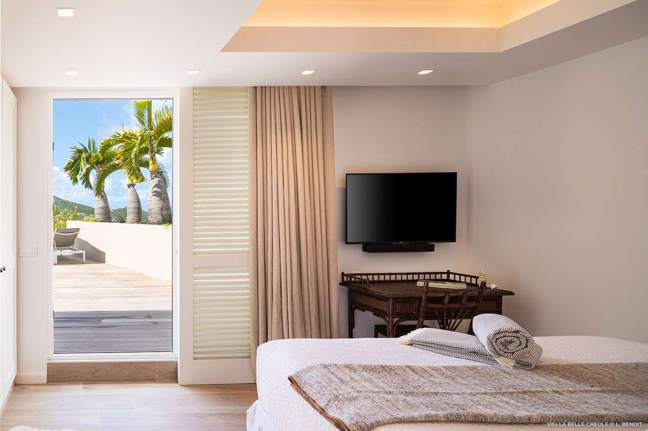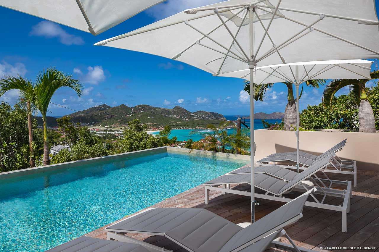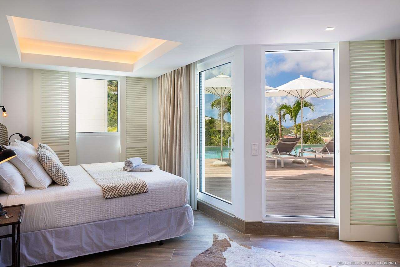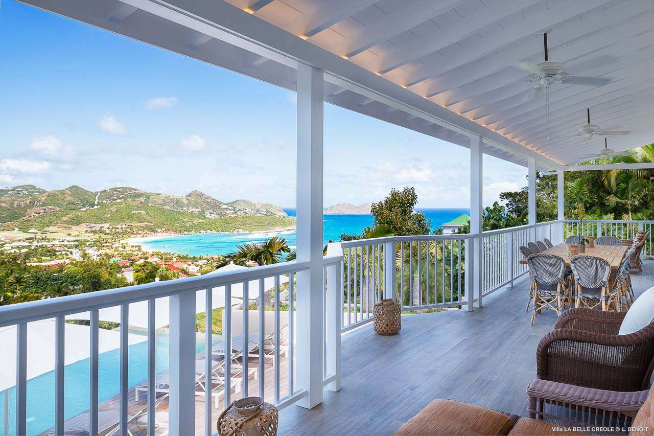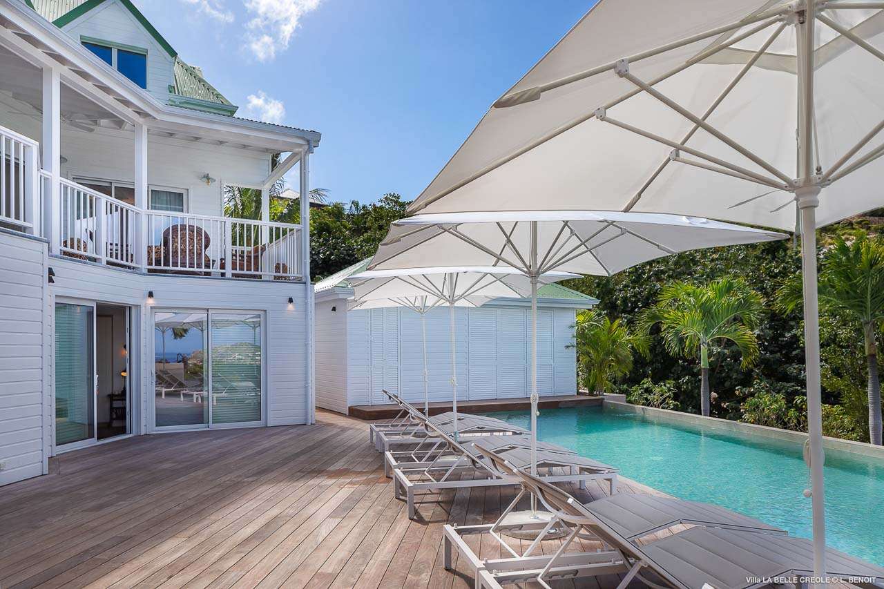 Villa La Belle Creole, (villa code: WV LBC) is a newly-built, 7 + 1-bedroom villa above the beach area of St. Jean with gorgeous ocean and sunset views. This well-known villa was destroyed by Hurricane Irma and rebuilt from the ground level up. The house has kept its colonial style but now offers modern amenities and comfort. From the outside, the house nearly looks identical but the real change is on the inside. Only the 3-car garage remained, but the three guest rooms on the pool level were completely rebuilt to support the new villa. A new driveway leads to the main level with a small parking area and a new master suite is situated in a bungalow at the end of the pool. The main room is still on the middle level, with a large contemporary and fully-equipped kitchen that has an island that separates the kitchen from the spacious living room. While the space feels contemporary, some of the West Indies furniture was preserved to maintain the colonial vibe of the original Belle Creole. A Sonos sound system can provide music and a large TV with Netflix and U.S. satellite is perfect for watching a movie or a game with the entire family or group. The covered terrace out in front of the main room dominates the property and the area and offers cooling breezes and gorgeous views. Just off the living room is the first master bedroom, which has a king-sized bed, dressing room, and a bright, ensuite bathroom with a shower. The second master bedroom is at the top of the stairs that leads from the living room to the top level. This large, cozy room has several windows that offer great views, a king-sized bed, a large his-and-hers dressing room, and an open bathroom with a shower. On the far end of the hallway is a guest room with a king-sized bed that connects to a small room with a twin bed and is ideal for children (a crib is at the house and an additional bed can be rented). The bathroom with shower is just across the hallway. The third master bedroom is a newly-built bungalow facing the pool and views and has a king-sized bed, dressing room, and ensuite bathroom with a shower. Three guest rooms face the pool side by side. Two of the rooms are slightly smaller than the third, but each has a king-sized bed, his-and-hers closets, and an ensuite bathroom with a shower. Villa La Belle Creole is a perfect villa for a large family, or couples vacationing together.Please fill out the form to begin your inquiry and we will connect you with a seasoned villa rental specialist.