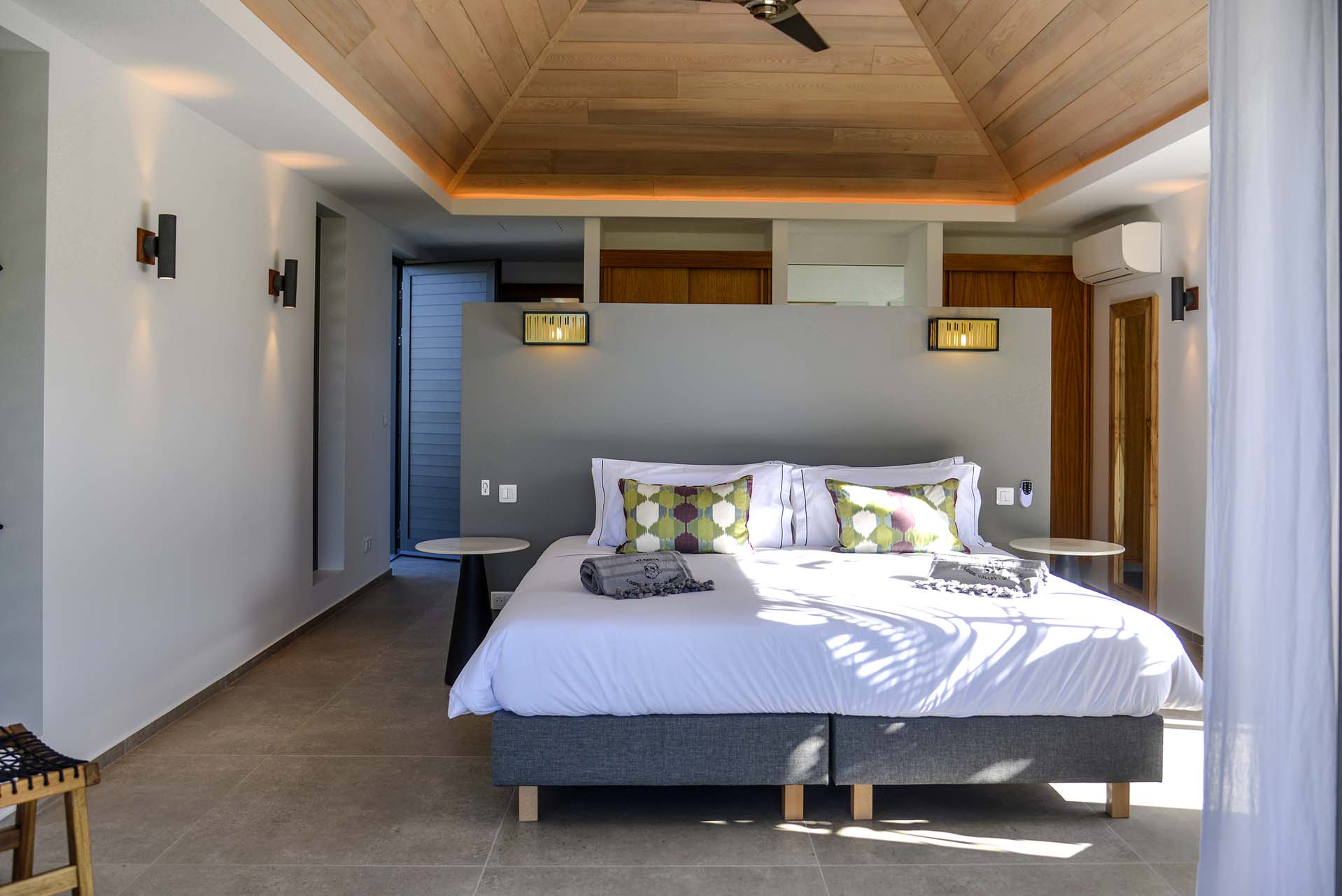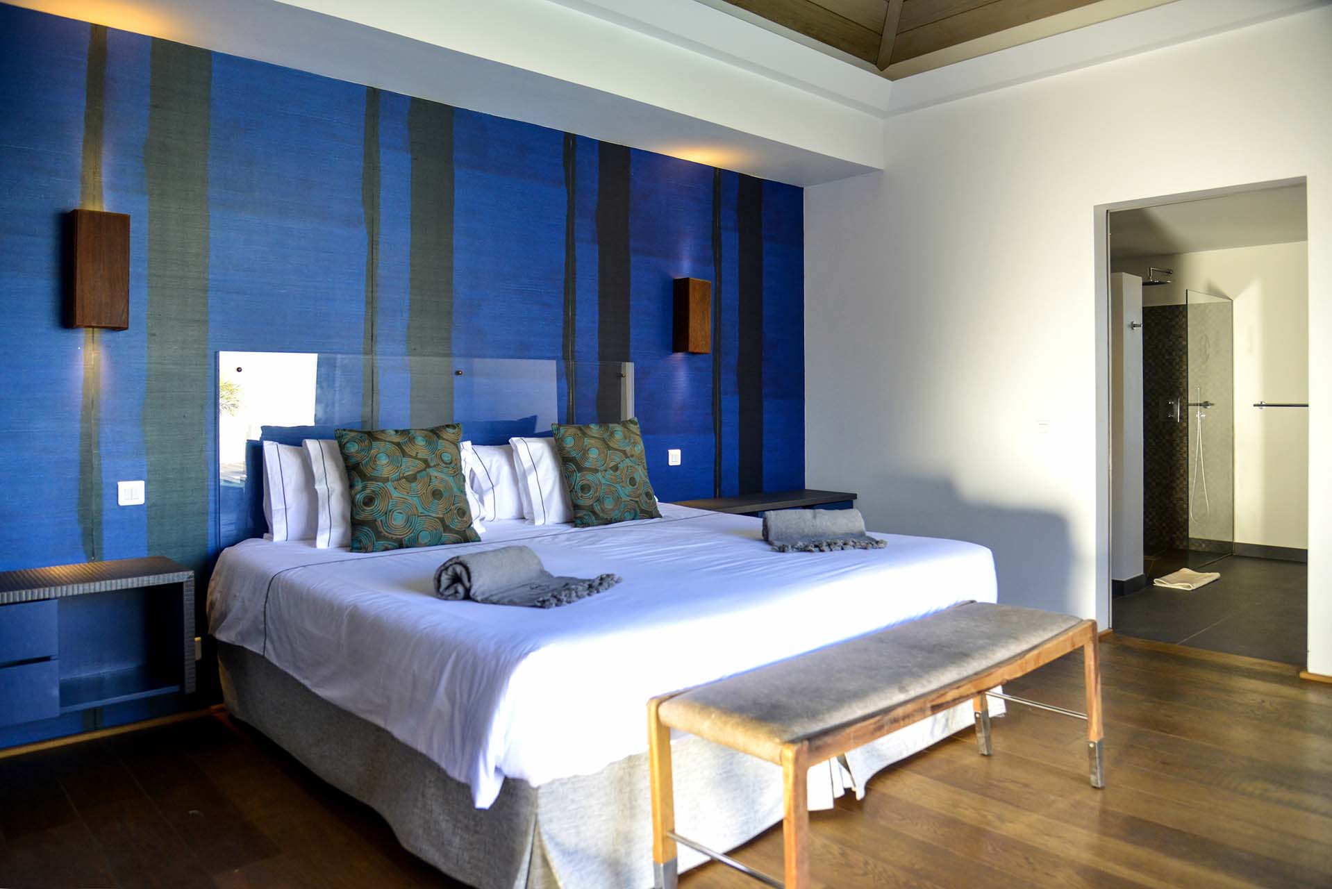 All the bedrooms feature a Euro King or Twin Beds (on request), an ensuite bathroom with a large shower, and a dressing area. Each room also features a different color scheme, harmonizing with the villa’s gorgeous wooden floors and earthy tones.