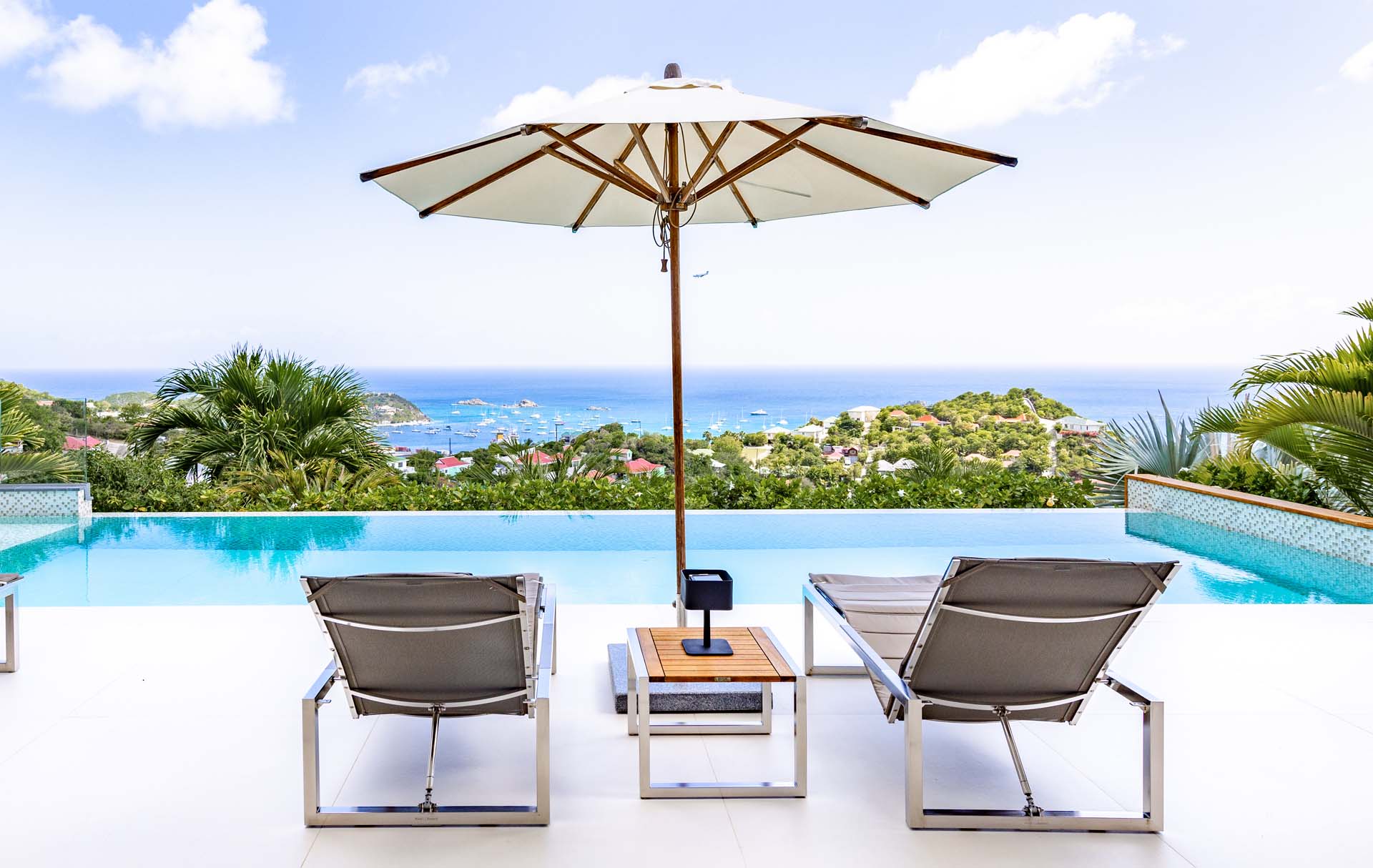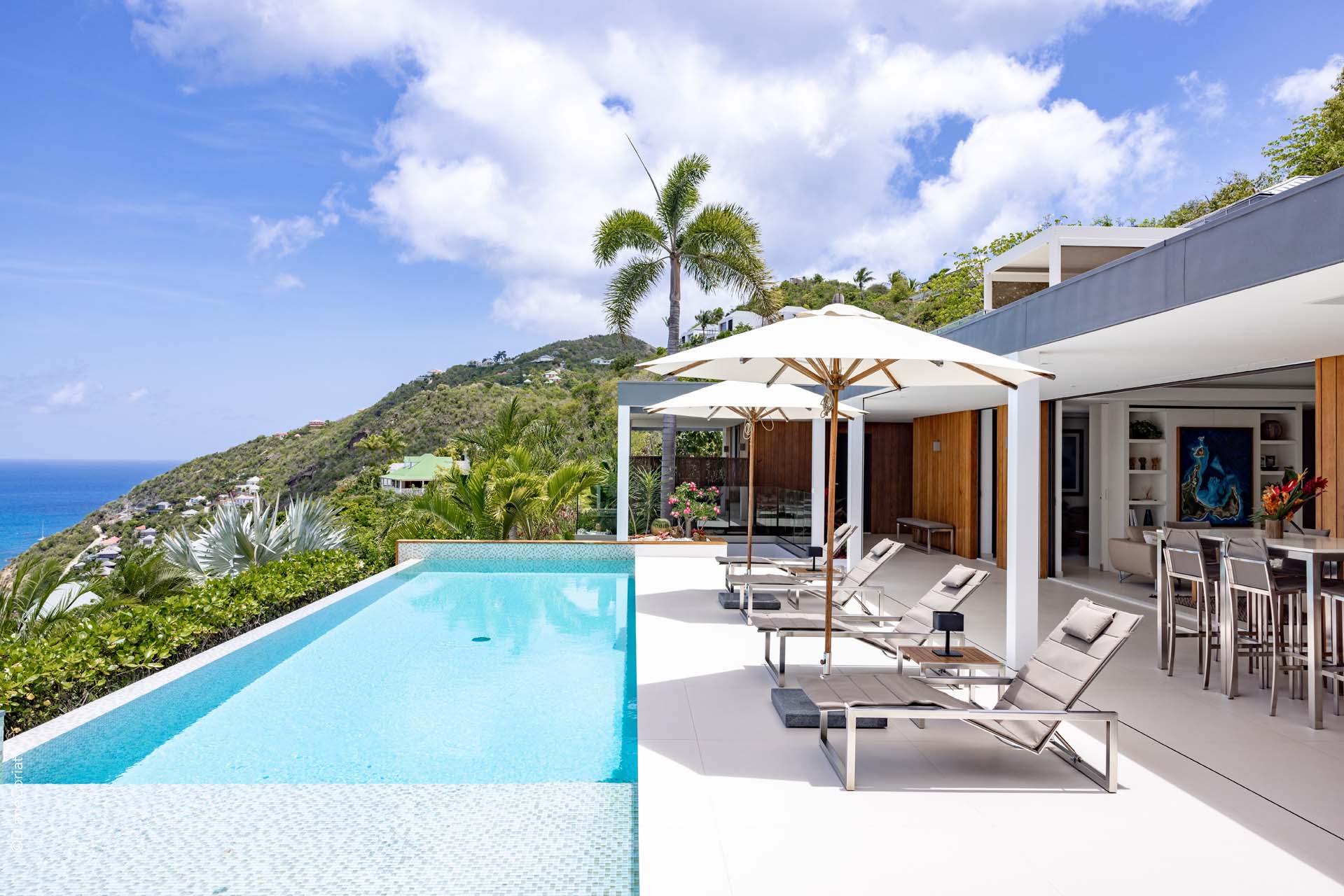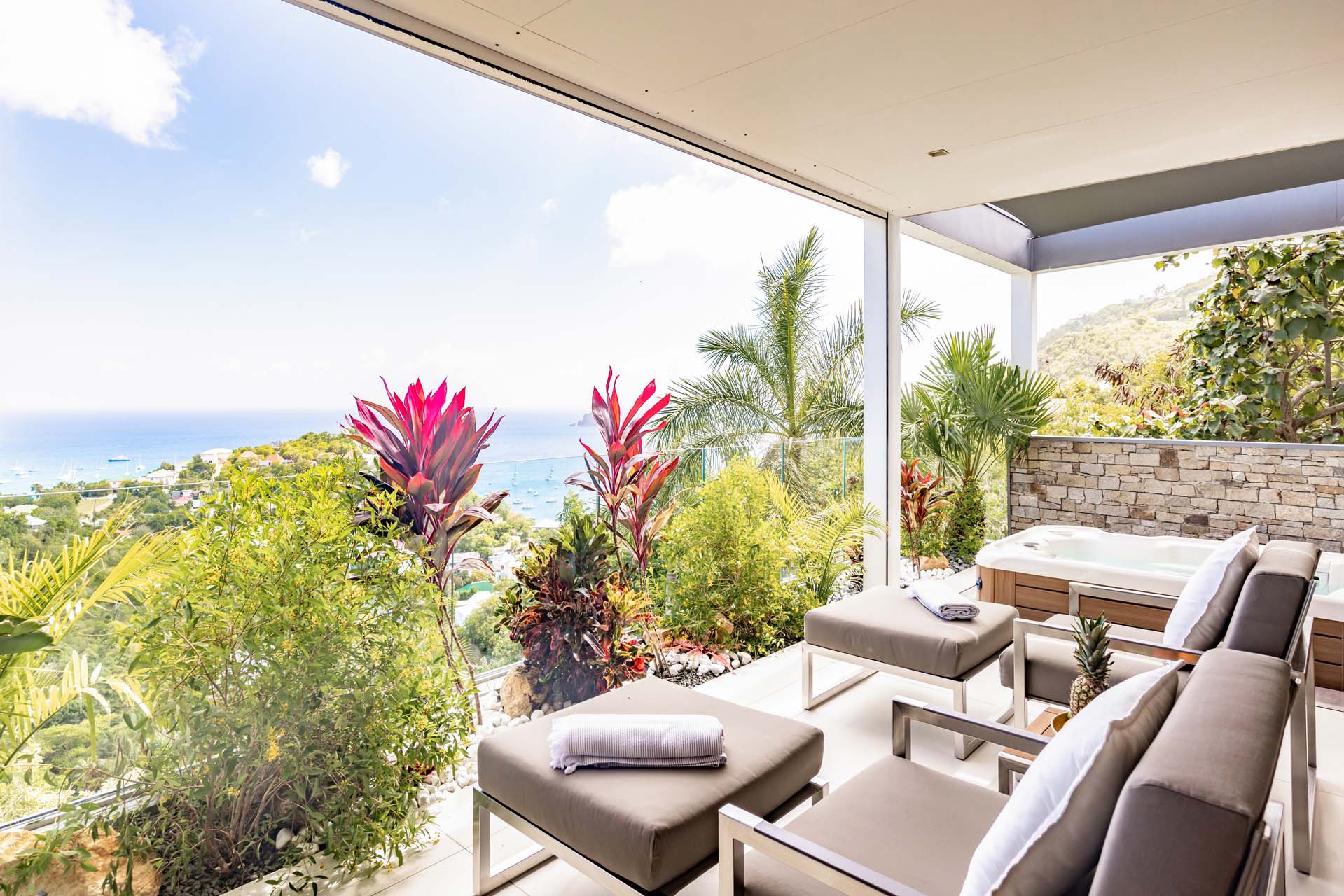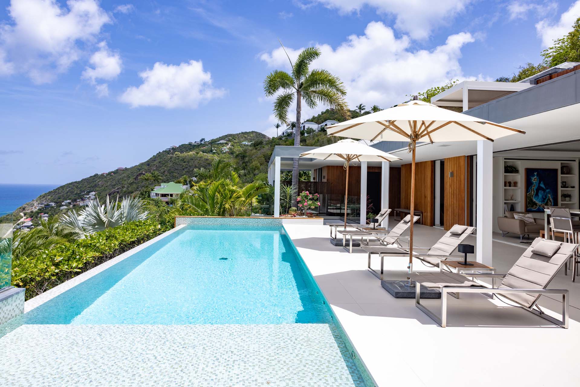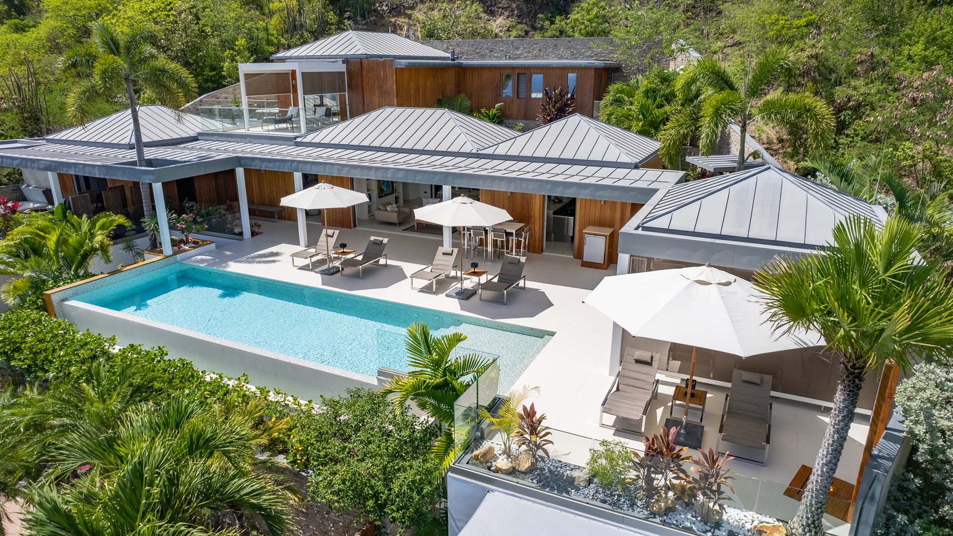 Welcome to Villa Lao (villa code: WV LAO), a contemporary 3-bedroom villa in Corossol, St. Barts. Nestled high in the hills, this villa enjoys stunning sunset views within a 5-minute drive from the beach, shopping, and restaurants. Chic island luxury awaits inside Villa Lao, a spacious home that immerses you in the St. Barts lifestyle. Space, natural light, and high-end design come together, with all the creature comforts as well: soft linens, plush mattresses, and luxurious furnishings. Woven textures and hardwood floors bring warmth into the villa – you’ll feel right at home here. With a fabulous location in the hills of Corossol, Villa Lao in St. Barts enjoys splendid panoramic views toward the western horizon, with incredible sunsets each evening, a spectacle you won’t want to miss. It’s a 5-minute drive into the capital Gustavia and also Corossol Beach, an unspoiled and quiet stretch of sand. The memorable living spaces at Villa Lao are open and flowing, with a large great room opening on several sides to the outdoor terraces. Inside you’ll find the large living room, dining room, and a professional-level kitchen. From the living room, the sofas face out towards the view, framed by the wall-to-wall sliding doors. Yachts bob up and down in the sparkling sea, with the headlands shrouded in lush trees. It’s an idyllic setting to kick back with a glass of champagne, toasting to your island vacation with family and friends. For something cozier, Villa Lao also has a separate TV room for movie nights inside. A breakfast bar separates the living room from the kitchen. Sleek and modern, this is an elegant and high-end space to prepare meals during your stay. Our concierge can even arrange to have groceries delivered before you arrive, including champagne, wine, and beer in the fridge. Private chefs are also available on the island. The breakfast bar is an ideal spot for a morning coffee and some fresh eggs before staking out a spot on the terrace for a day of sunbathing. Behind the living room is the formal dining table, next to another wall-to-wall sliding door that opens to a small inner courtyard. There are 3 bedrooms inside Villa Lao, relaxed spaces where guests can unwind in privacy. Each bedroom has a private terrace with a Jacuzzi, making this a great choice for several couples traveling together. One bedroom is upstairs, with alluring ocean views through its windows. The second bedroom is behind the living room, while the third is on the lower level with a separate private entrance. An extensive terrace with a large, heated infinity pool stretches out in front of the living room. This is the real highlight of a stay at Villa Lao; the immersive views of the island are incredible, taking in the beguiling coastline and the Caribbean Sea. A cozy gazebo at the far end of the terrace provides a shaded sitting area for watching sunsets. Cocktail hours here are splendid, with the sinking sun casting hues of pink, red, and gold across the sky. A small garden with a waterfall is located on the other side of the terrace. For days at the beach, it’s a short drive to the quiet and pristine Corossol Beach. This undeveloped area of St. Barts has retained its authentic feel, giving you a true taste of life in paradise. During the Thanksgiving and December holidays, the villa rents at full occupancy rates regardless of how many bedrooms are used.Please fill out the form to begin your inquiry and we will connect you with a seasoned villa rental specialist.