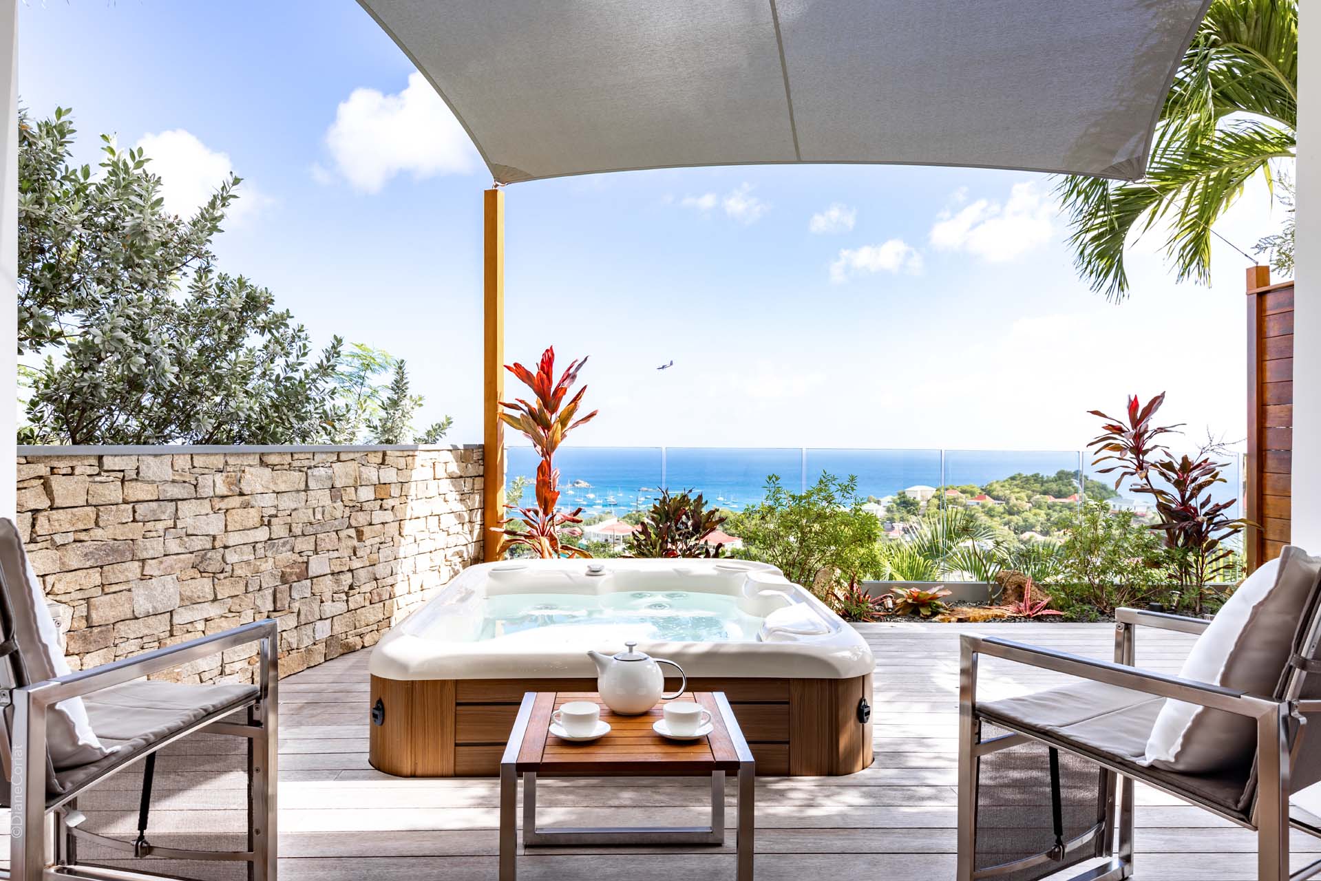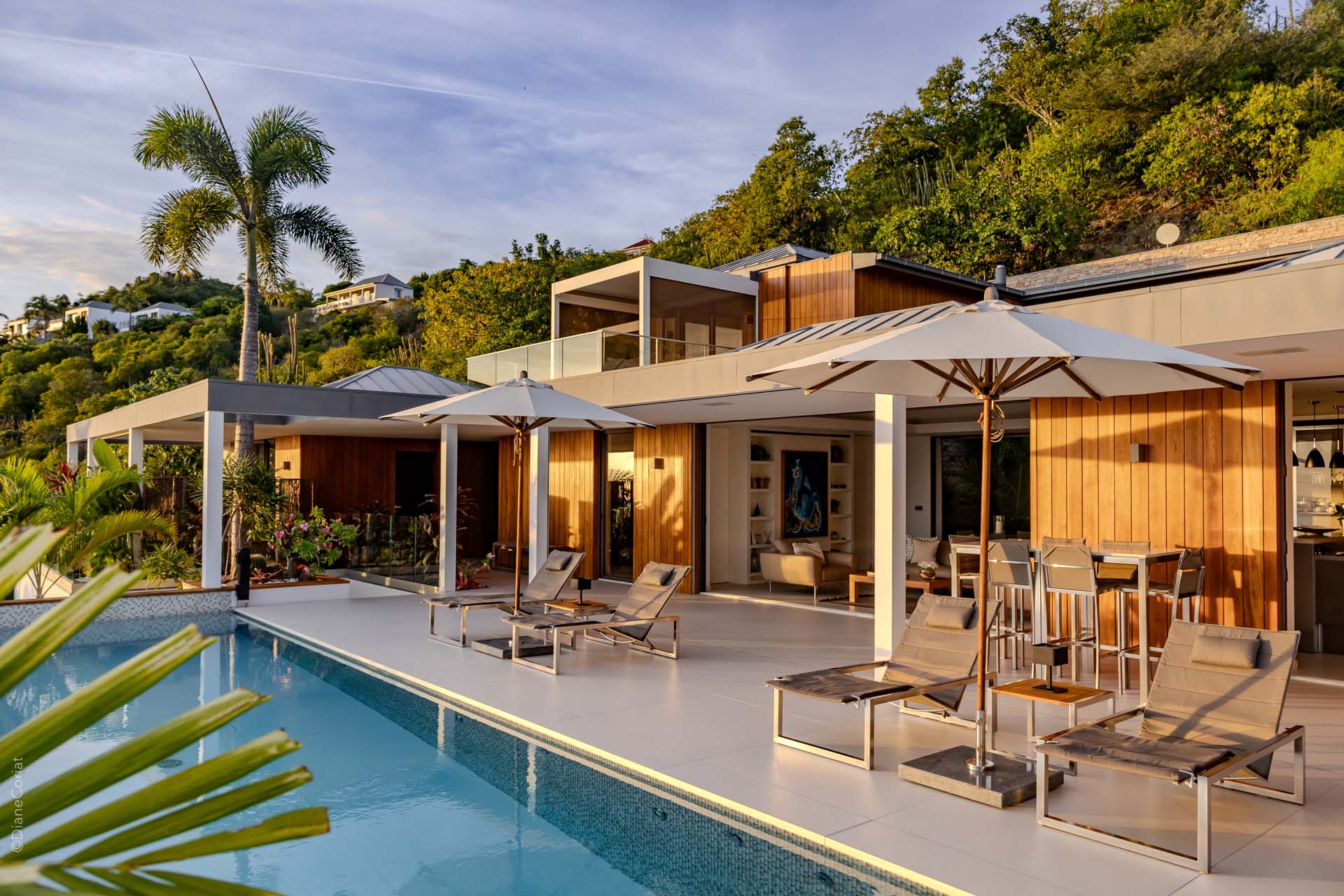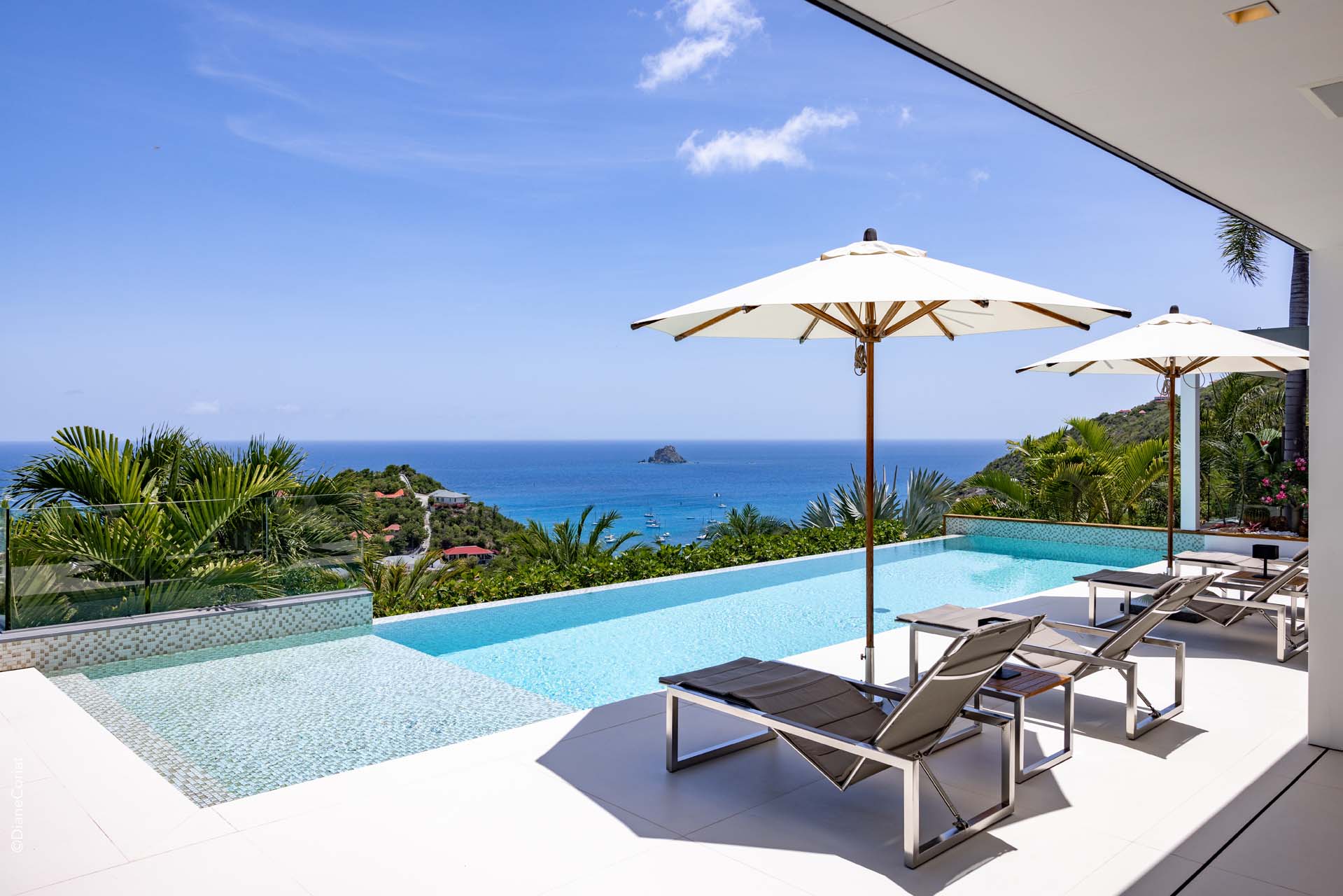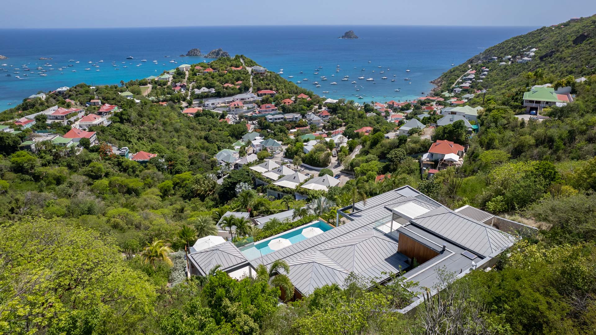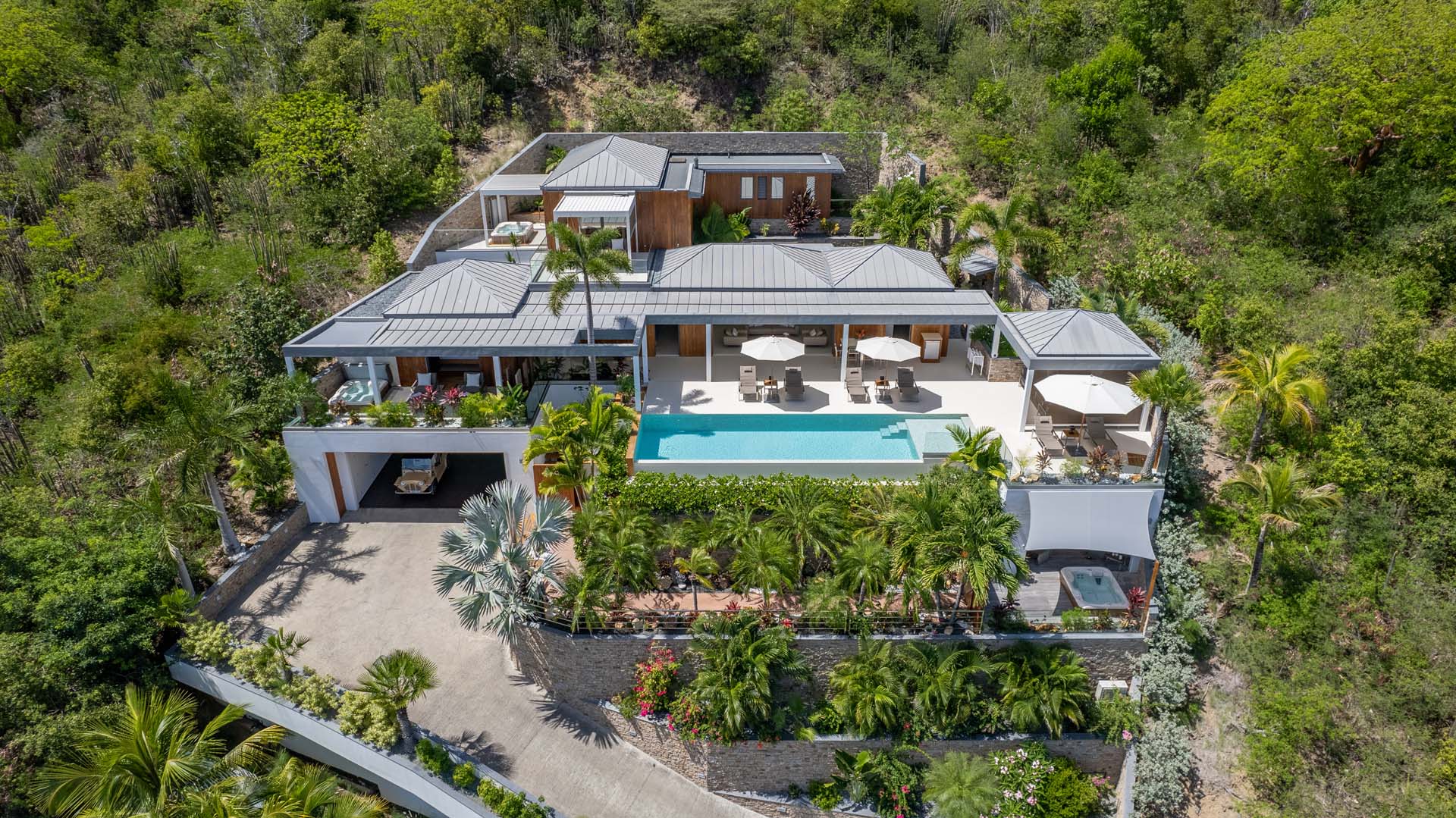 Welcome to Villa Lao (villa code: WV LAO), a contemporary 3-bedroom villa in Corossol, St. Barts. Nestled high in the hills, this villa enjoys stunning sunset views within a 5-minute drive from the beach, shopping, and restaurants. Chic island luxury awaits inside Villa Lao, a spacious home that immerses you in the St. Barts lifestyle. Space, natural light, and high-end design come together, with all the creature comforts as well: soft linens, plush mattresses, and luxurious furnishings. Woven textures and hardwood floors bring warmth into the villa – you’ll feel right at home here. With a fabulous location in the hills of Corossol, Villa Lao in St. Barts enjoys splendid panoramic views toward the western horizon, with incredible sunsets each evening, a spectacle you won’t want to miss. It’s a 5-minute drive into the capital Gustavia and also Corossol Beach, an unspoiled and quiet stretch of sand. The memorable living spaces at Villa Lao are open and flowing, with a large great room opening on several sides to the outdoor terraces. Inside you’ll find the large living room, dining room, and a professional-level kitchen. From the living room, the sofas face out towards the view, framed by the wall-to-wall sliding doors. Yachts bob up and down in the sparkling sea, with the headlands shrouded in lush trees. It’s an idyllic setting to kick back with a glass of champagne, toasting to your island vacation with family and friends. For something cozier, Villa Lao also has a separate TV room for movie nights inside. A breakfast bar separates the living room from the kitchen. Sleek and modern, this is an elegant and high-end space to prepare meals during your stay. Our concierge can even arrange to have groceries delivered before you arrive, including champagne, wine, and beer in the fridge. Private chefs are also available on the island. The breakfast bar is an ideal spot for a morning coffee and some fresh eggs before staking out a spot on the terrace for a day of sunbathing. Behind the living room is the formal dining table, next to another wall-to-wall sliding door that opens to a small inner courtyard. There are 3 bedrooms inside Villa Lao, relaxed spaces where guests can unwind in privacy. Each bedroom has a private terrace with a Jacuzzi, making this a great choice for several couples traveling together. One bedroom is upstairs, with alluring ocean views through its windows. The second bedroom is behind the living room, while the third is on the lower level with a separate private entrance. An extensive terrace with a large, heated infinity pool stretches out in front of the living room. This is the real highlight of a stay at Villa Lao; the immersive views of the island are incredible, taking in the beguiling coastline and the Caribbean Sea. A cozy gazebo at the far end of the terrace provides a shaded sitting area for watching sunsets. Cocktail hours here are splendid, with the sinking sun casting hues of pink, red, and gold across the sky. A small garden with a waterfall is located on the other side of the terrace. For days at the beach, it’s a short drive to the quiet and pristine Corossol Beach. This undeveloped area of St. Barts has retained its authentic feel, giving you a true taste of life in paradise. During the Thanksgiving and December holidays, the villa rents at full occupancy rates regardless of how many bedrooms are used.Please fill out the form to begin your inquiry and we will connect you with a seasoned villa rental specialist.