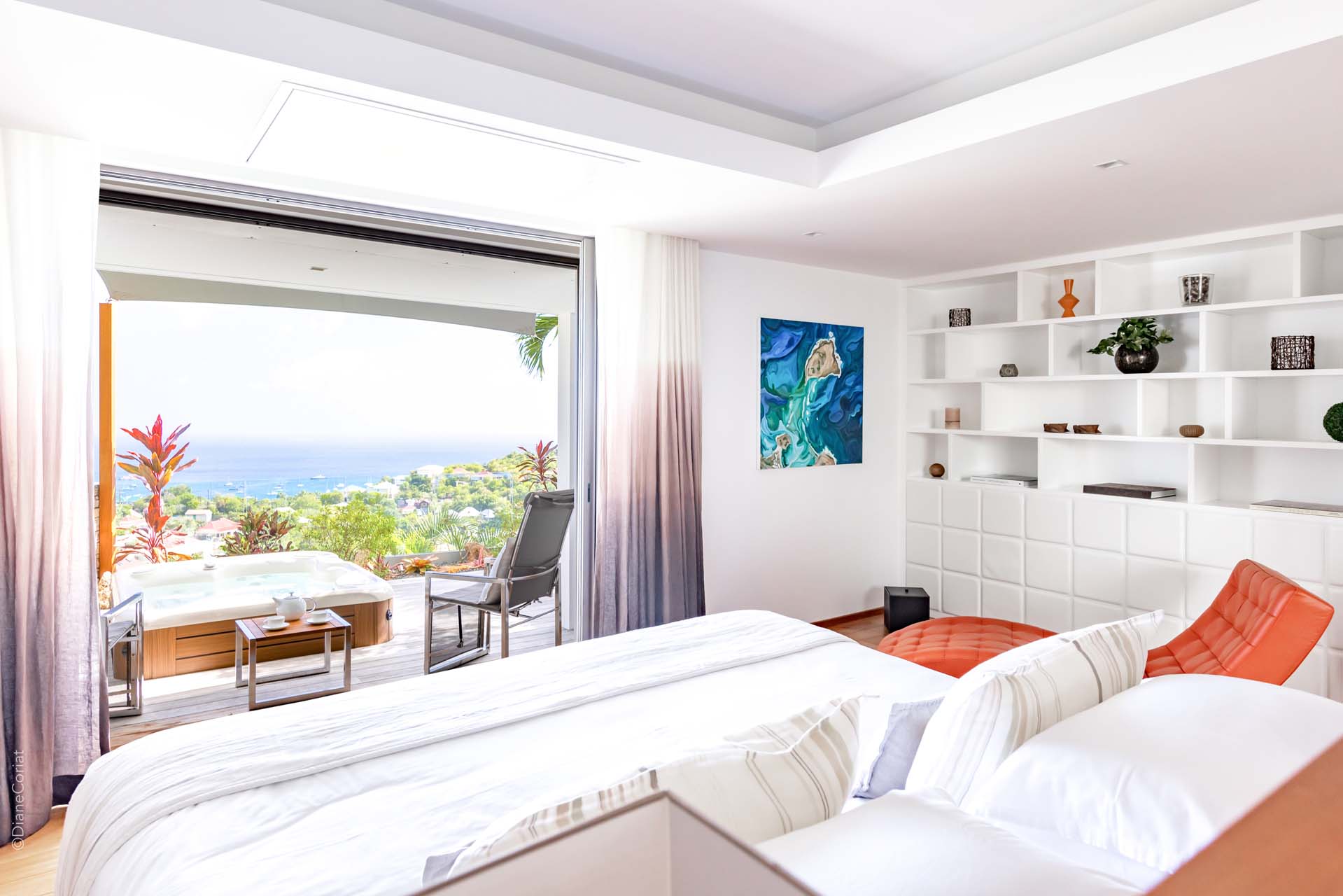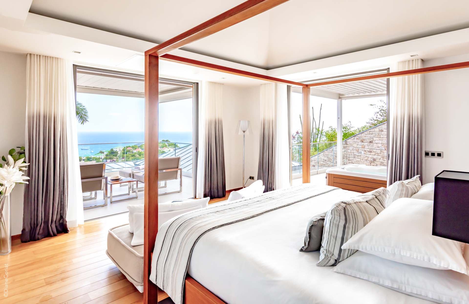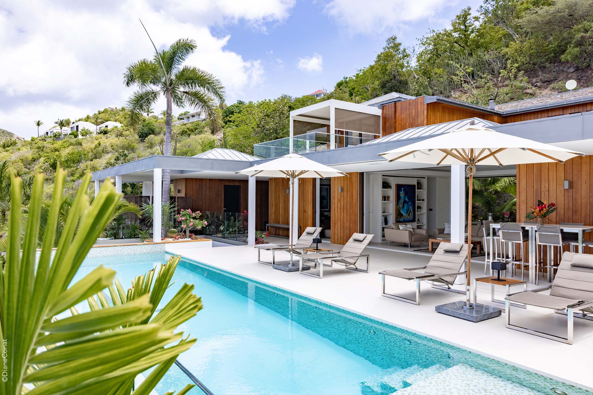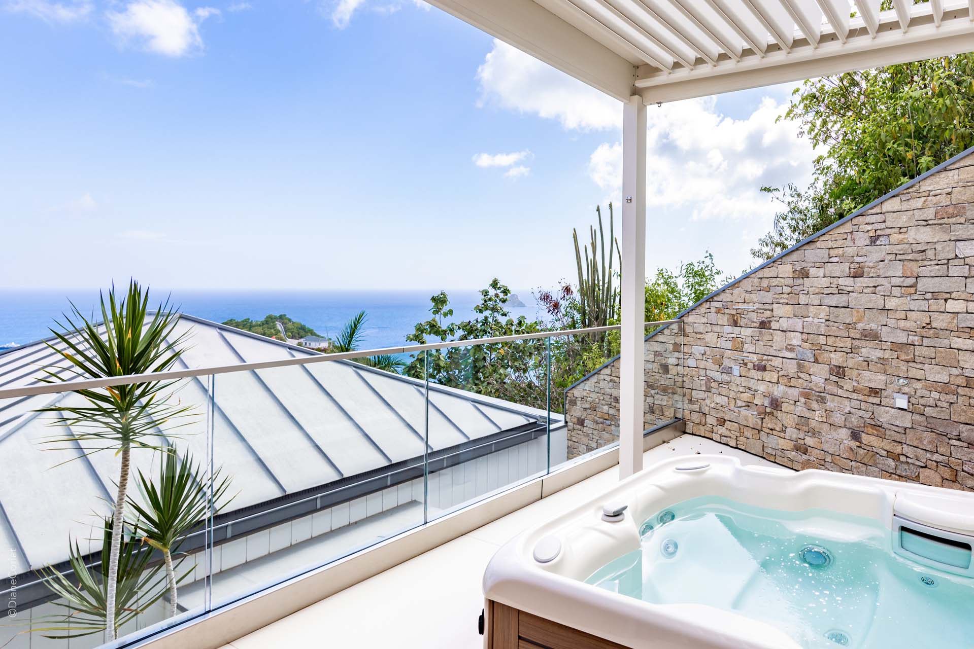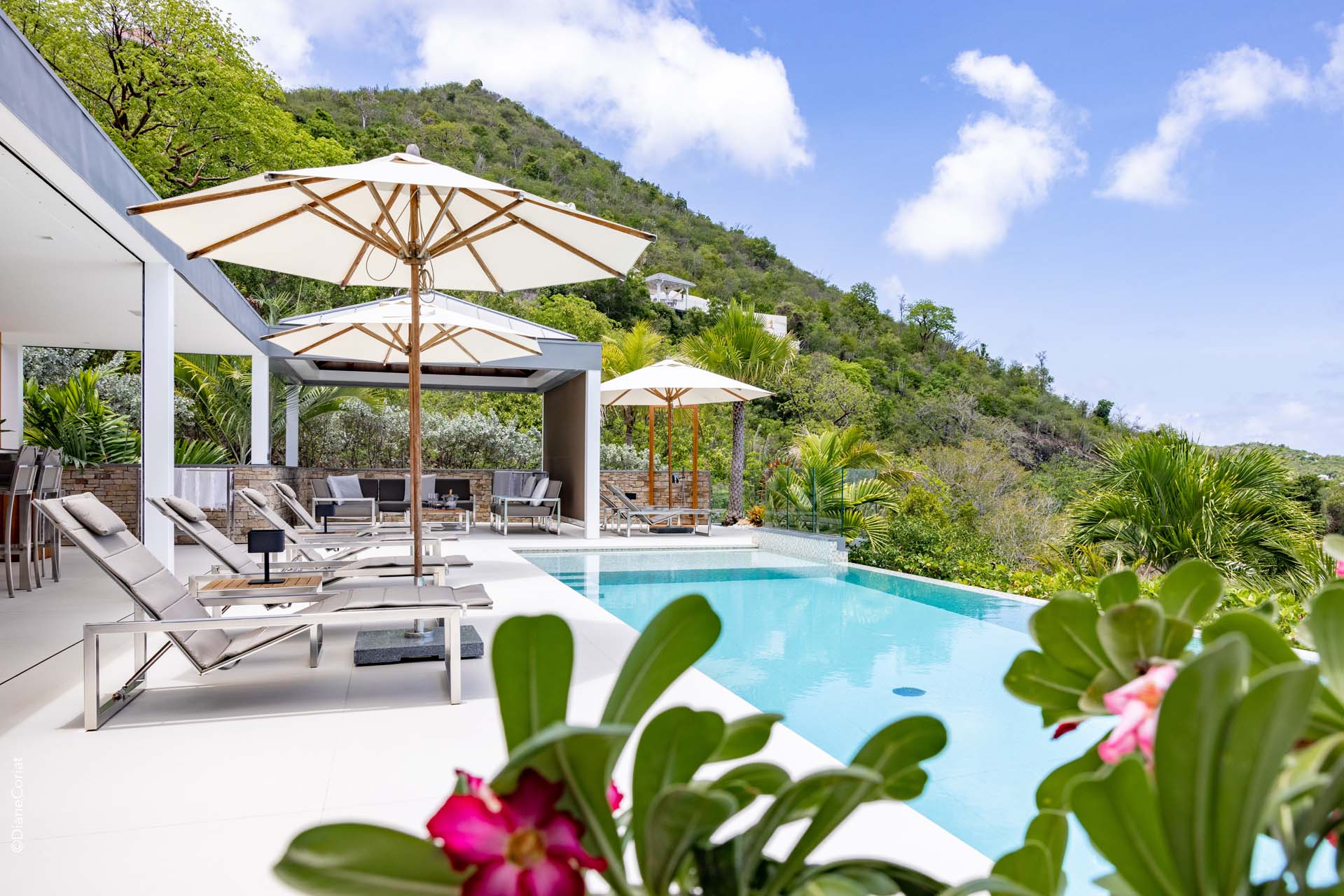 Welcome to Villa Lao (villa code: WV LAO), a contemporary 3-bedroom villa in Corossol, St. Barts. Nestled high in the hills, this villa enjoys stunning sunset views within a 5-minute drive from the beach, shopping, and restaurants. Chic island luxury awaits inside Villa Lao, a spacious home that immerses you in the St. Barts lifestyle. Space, natural light, and high-end design come together, with all the creature comforts as well: soft linens, plush mattresses, and luxurious furnishings. Woven textures and hardwood floors bring warmth into the villa – you’ll feel right at home here. With a fabulous location in the hills of Corossol, Villa Lao in St. Barts enjoys splendid panoramic views toward the western horizon, with incredible sunsets each evening, a spectacle you won’t want to miss. It’s a 5-minute drive into the capital Gustavia and also Corossol Beach, an unspoiled and quiet stretch of sand. The memorable living spaces at Villa Lao are open and flowing, with a large great room opening on several sides to the outdoor terraces. Inside you’ll find the large living room, dining room, and a professional-level kitchen. From the living room, the sofas face out towards the view, framed by the wall-to-wall sliding doors. Yachts bob up and down in the sparkling sea, with the headlands shrouded in lush trees. It’s an idyllic setting to kick back with a glass of champagne, toasting to your island vacation with family and friends. For something cozier, Villa Lao also has a separate TV room for movie nights inside. A breakfast bar separates the living room from the kitchen. Sleek and modern, this is an elegant and high-end space to prepare meals during your stay. Our concierge can even arrange to have groceries delivered before you arrive, including champagne, wine, and beer in the fridge. Private chefs are also available on the island. The breakfast bar is an ideal spot for a morning coffee and some fresh eggs before staking out a spot on the terrace for a day of sunbathing. Behind the living room is the formal dining table, next to another wall-to-wall sliding door that opens to a small inner courtyard. There are 3 bedrooms inside Villa Lao, relaxed spaces where guests can unwind in privacy. Each bedroom has a private terrace with a Jacuzzi, making this a great choice for several couples traveling together. One bedroom is upstairs, with alluring ocean views through its windows. The second bedroom is behind the living room, while the third is on the lower level with a separate private entrance. An extensive terrace with a large, heated infinity pool stretches out in front of the living room. This is the real highlight of a stay at Villa Lao; the immersive views of the island are incredible, taking in the beguiling coastline and the Caribbean Sea. A cozy gazebo at the far end of the terrace provides a shaded sitting area for watching sunsets. Cocktail hours here are splendid, with the sinking sun casting hues of pink, red, and gold across the sky. A small garden with a waterfall is located on the other side of the terrace. For days at the beach, it’s a short drive to the quiet and pristine Corossol Beach. This undeveloped area of St. Barts has retained its authentic feel, giving you a true taste of life in paradise. During the Thanksgiving and December holidays, the villa rents at full occupancy rates regardless of how many bedrooms are used.Please fill out the form to begin your inquiry and we will connect you with a seasoned villa rental specialist.