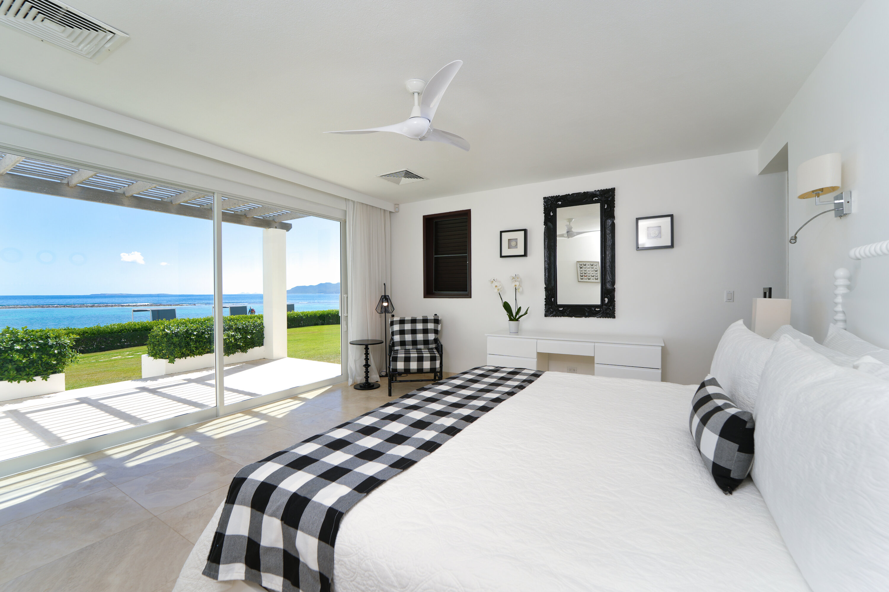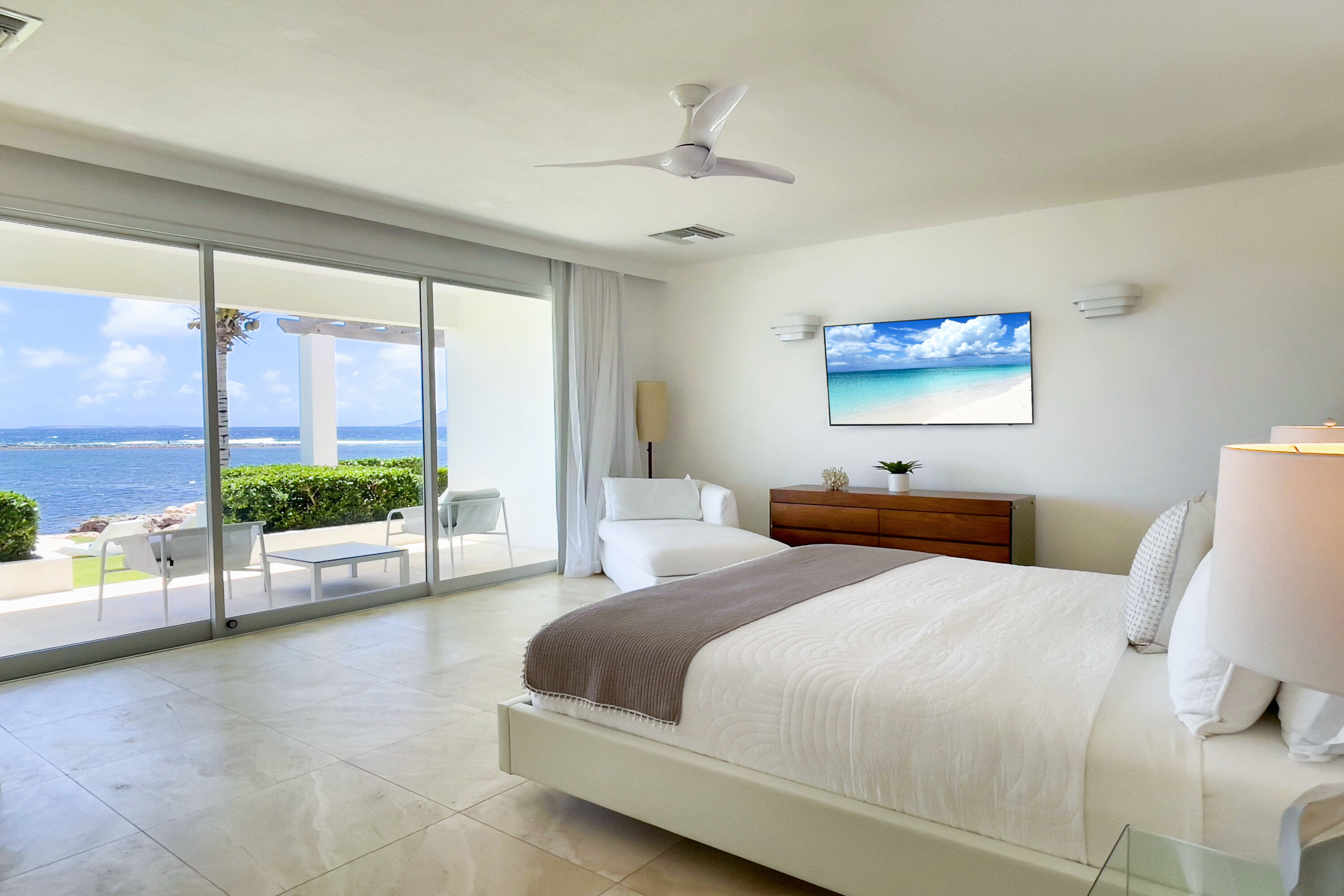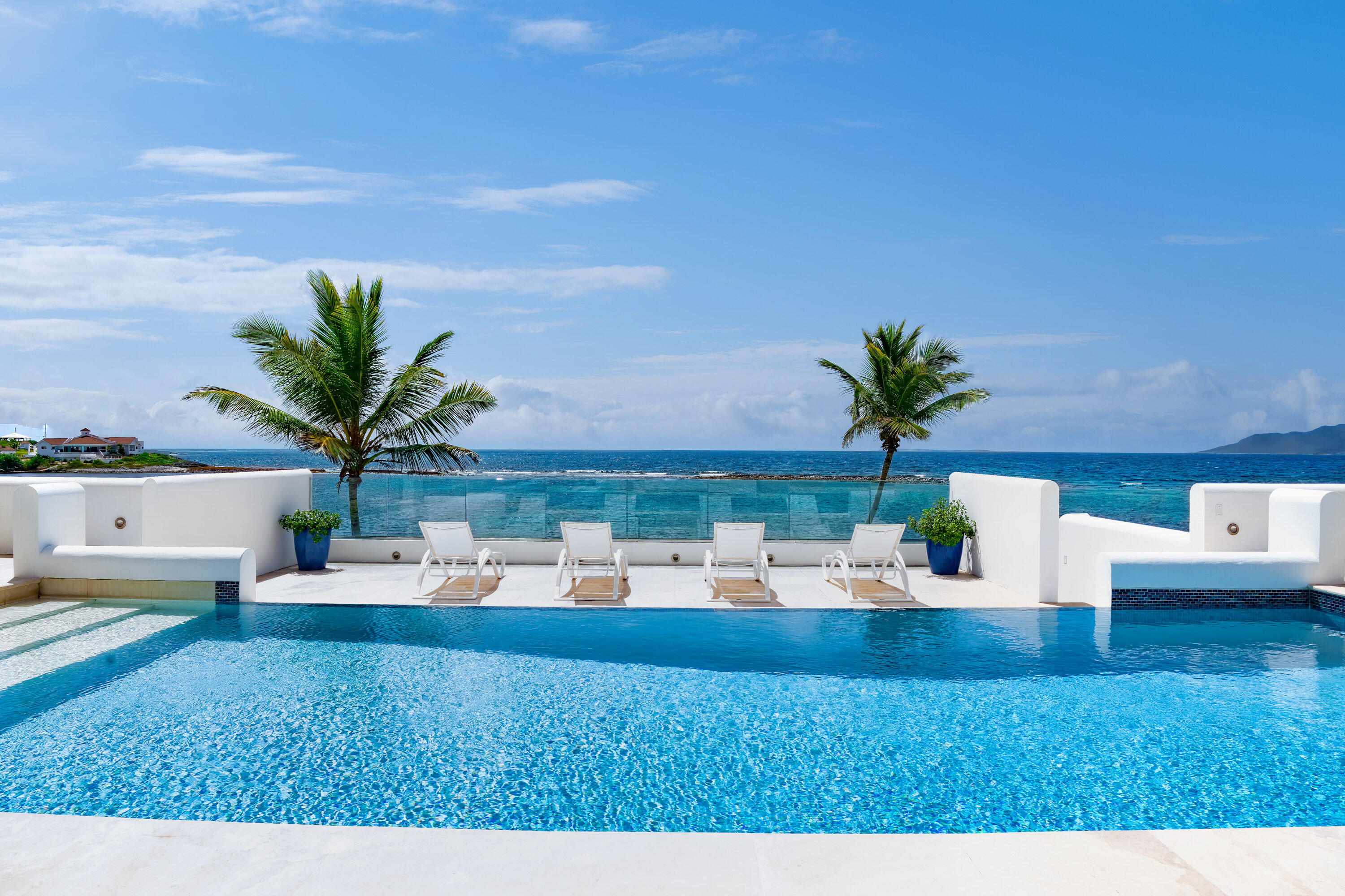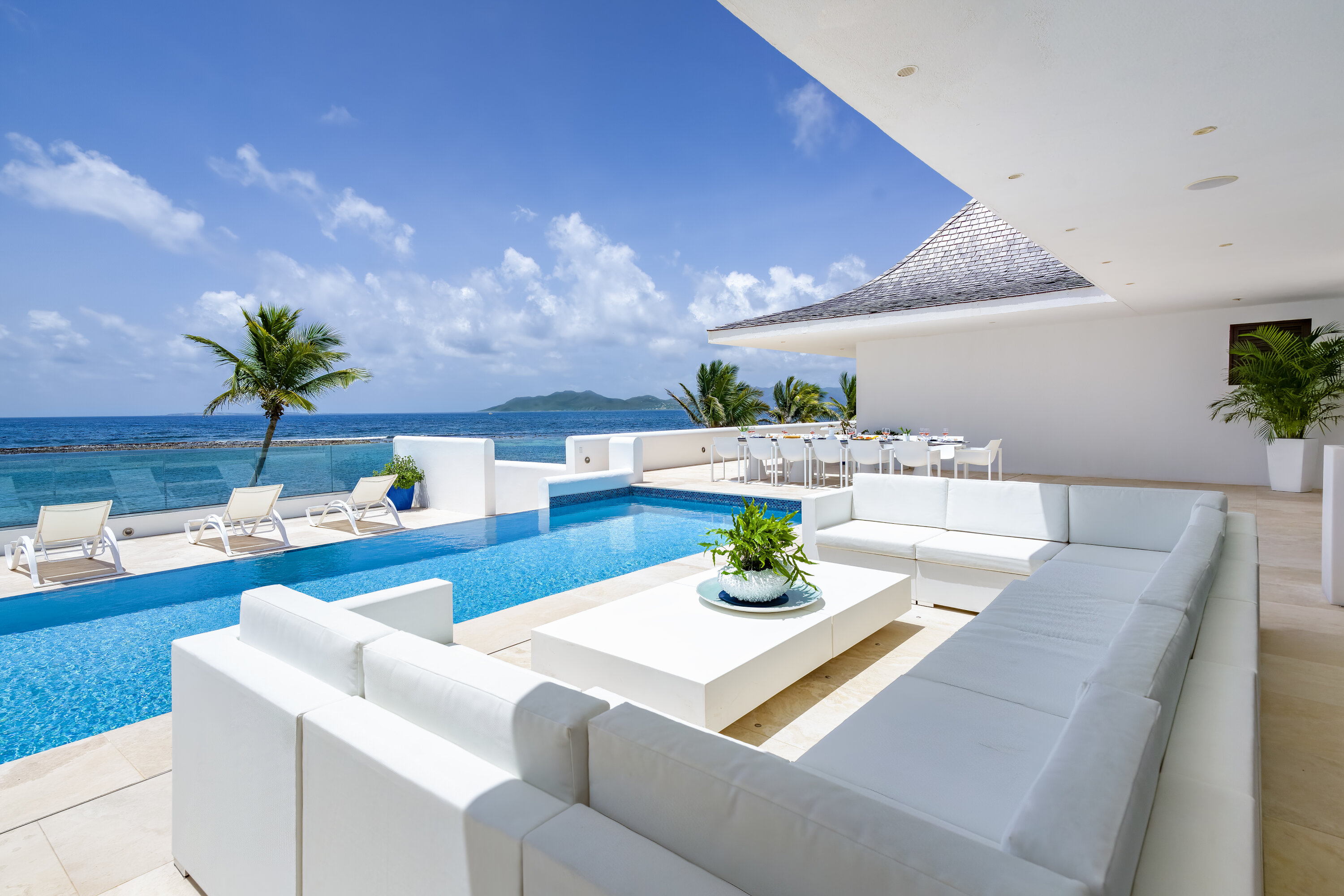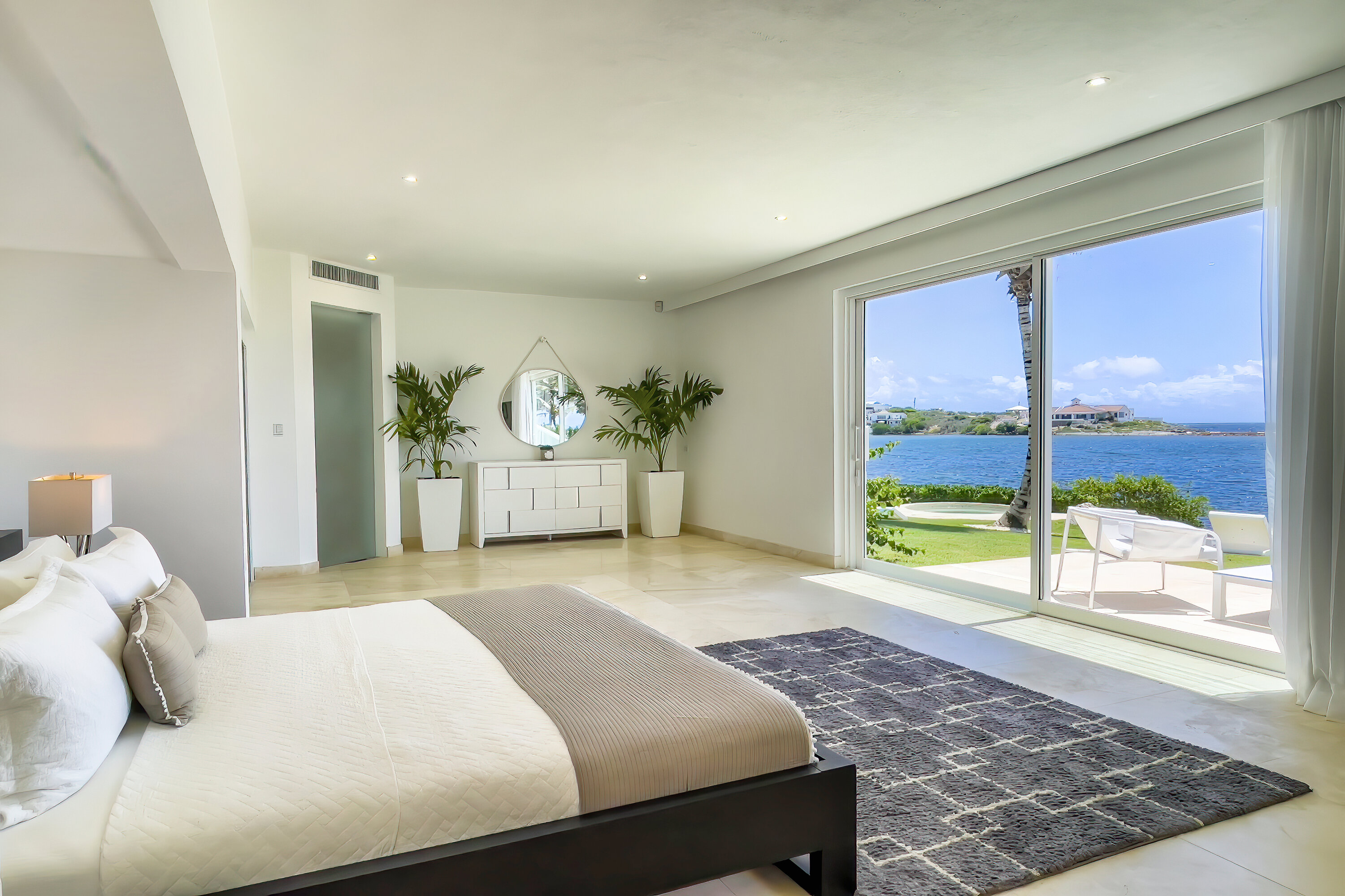On the upper level are two bedrooms, accessed via the pool terrace. Both have plush king-sized beds and alluring views over the water towards St. Martin.