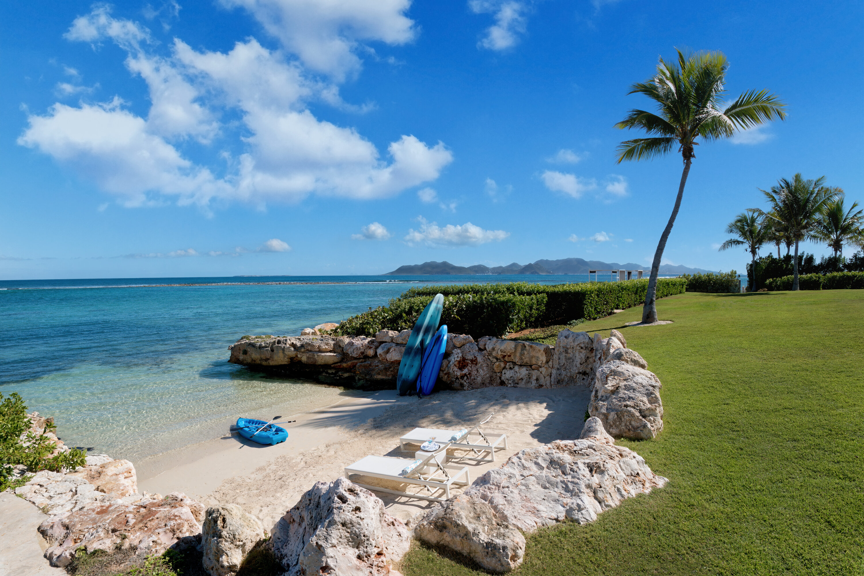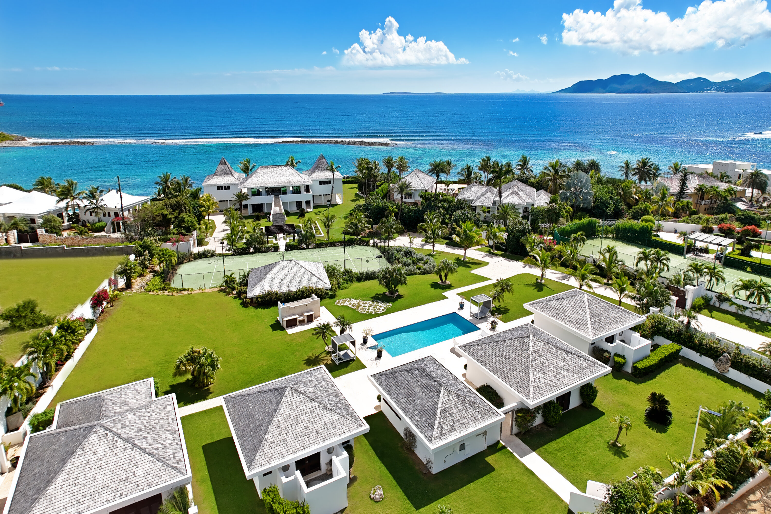 Welcome to Villa Le Bleu (villa code: AXA BLE), a luxurious 11-bedroom tropical estate located on the island of Anguilla in the British West Indies. Set on two lush acres, the property includes a grand main house and a charming guesthouse called Petite Le Bleu. This stunning villa boasts beautifully designed master suites, each with serene views of St. Martin and St. Barts across the sparkling Caribbean Sea.