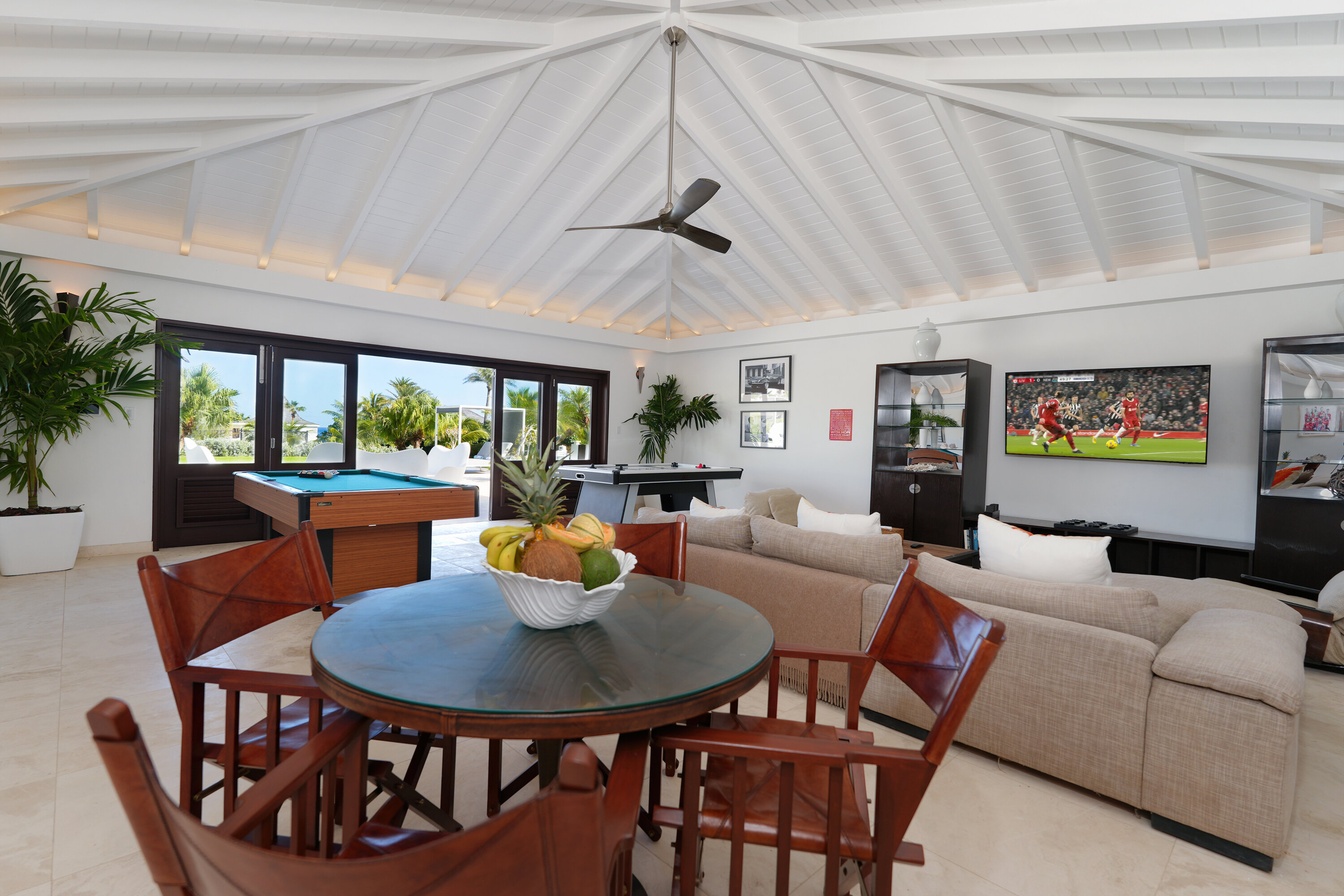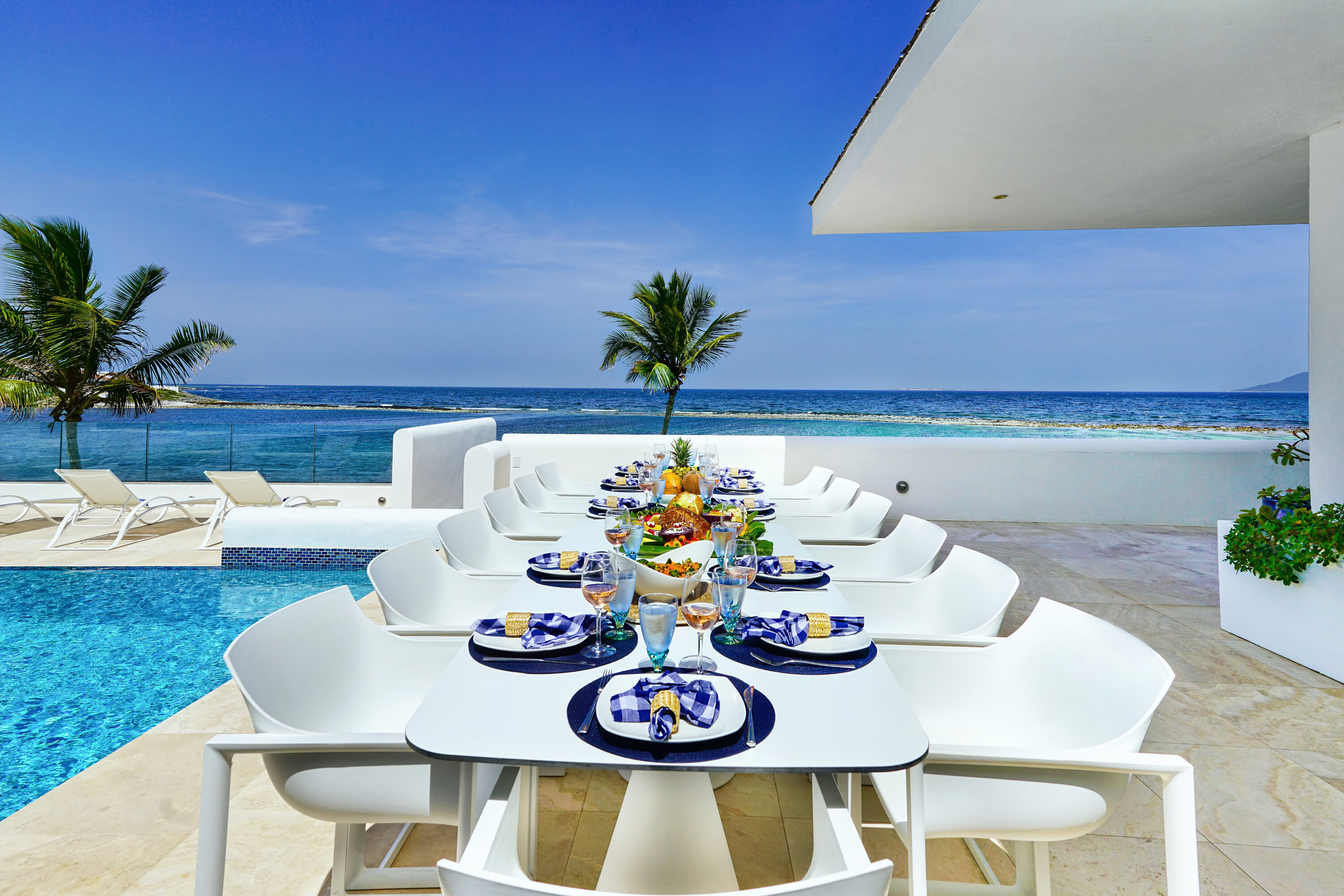 The elegant dining room has a large table that can seat up to 20 guests. It’s a magnificent setting for island-style dinner parties that last long into the evening. For those nights when you’d prefer to dine in the warm island air, there’s also another table for 20 by the pool.