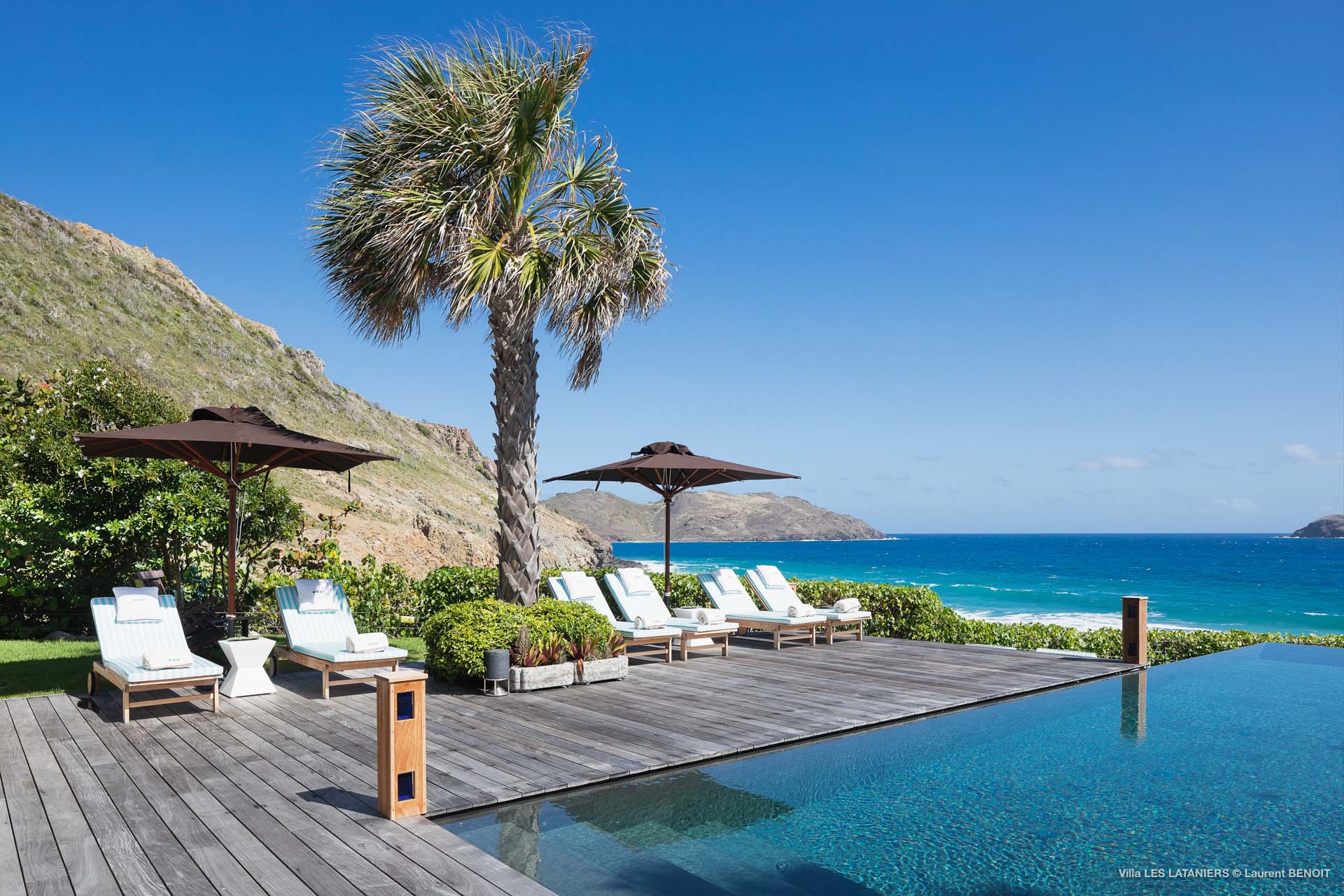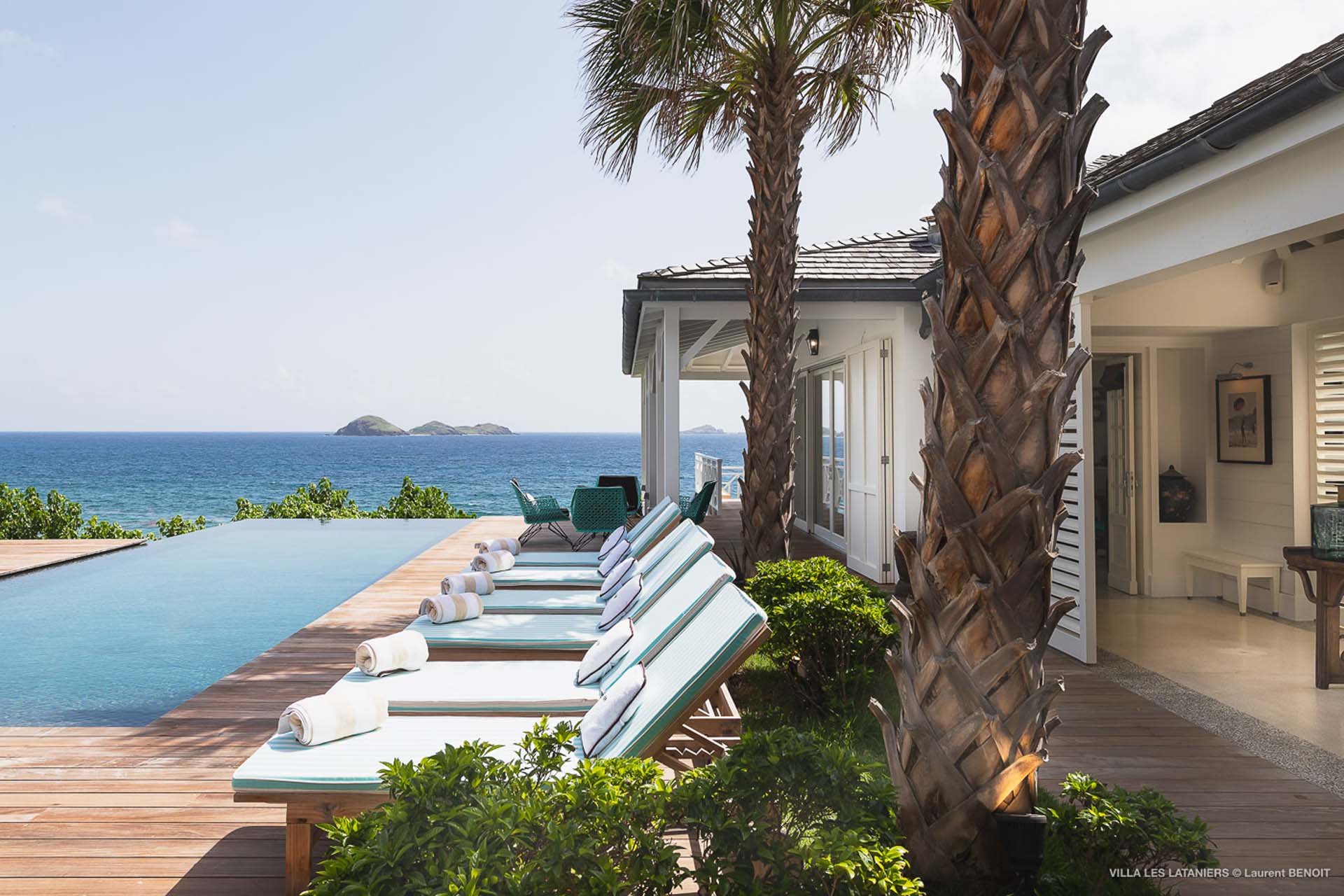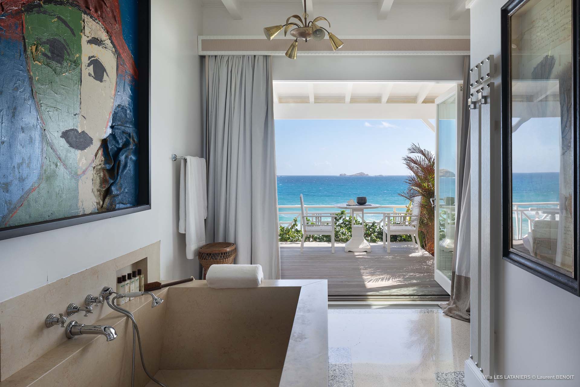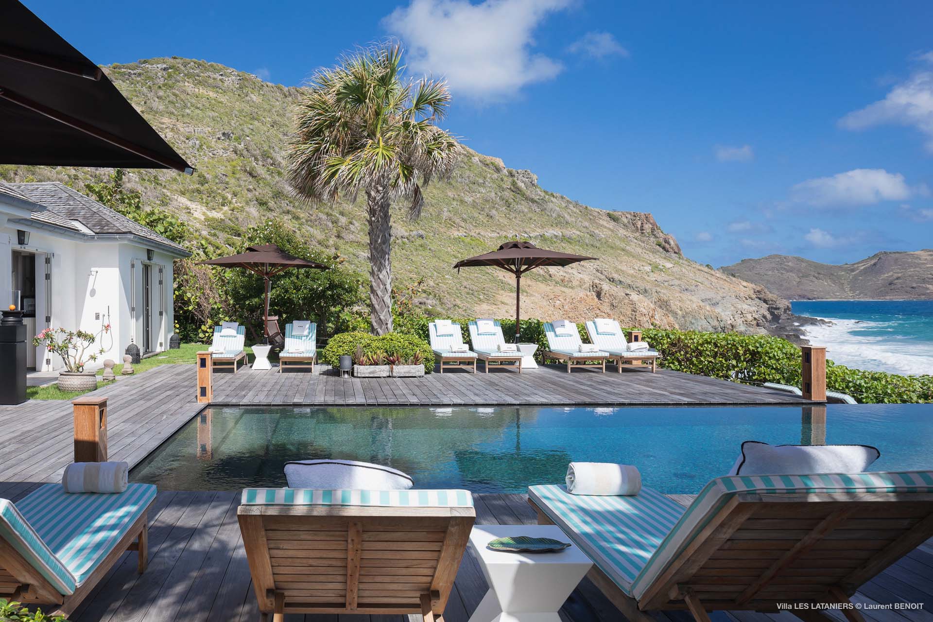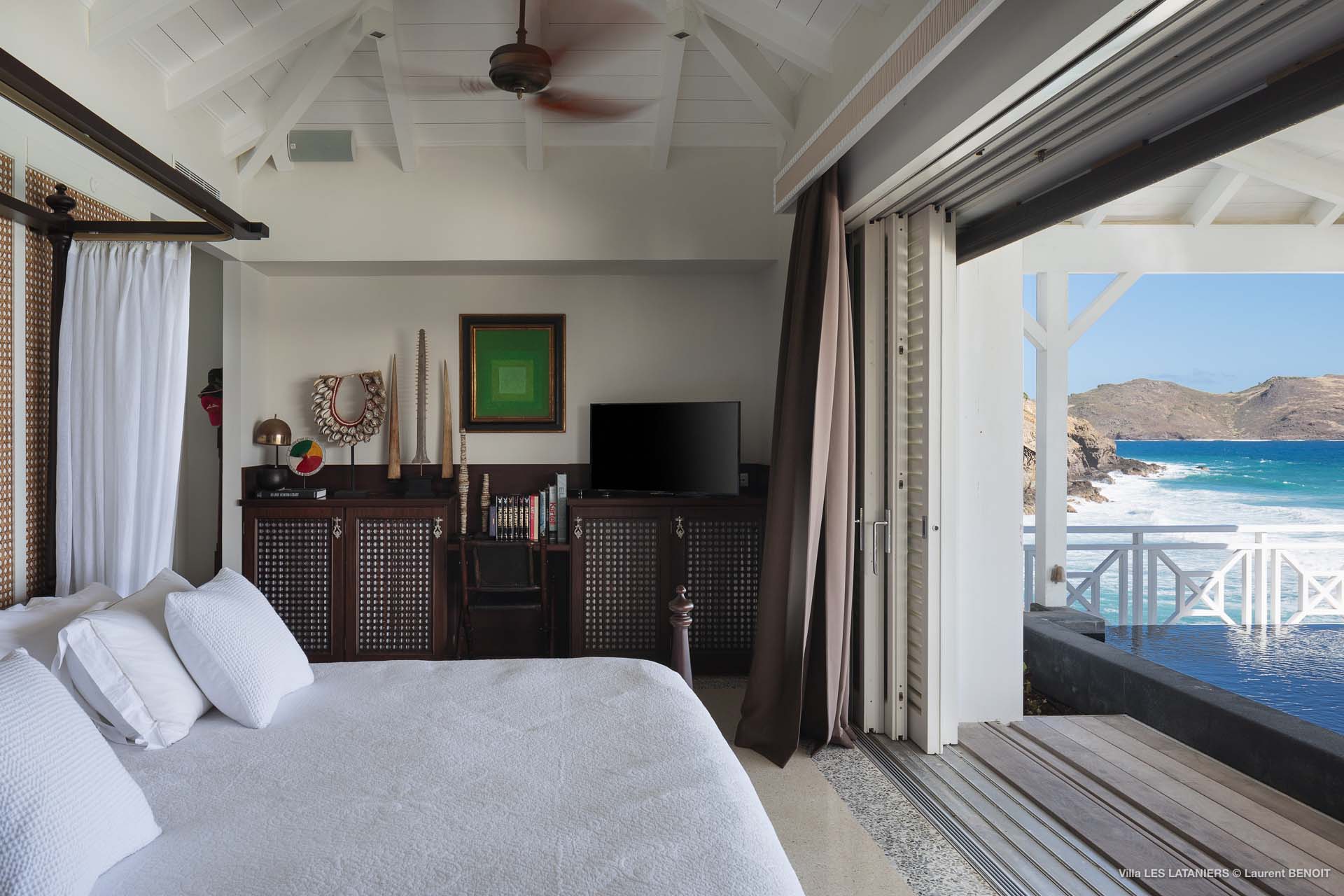 Villa Les Lataniers, (villa code: WV LAT) is a 6+1-bedroom villa located in Anse des Lezards. Perched just above the Anse des Lezards Bay, this large colonial-style estate enjoys panoramic views of the bay and hillsides. The interior features original artwork and memorabilia from around the world. Situated just off the pool is the dining room, which can be fully opened on both sides to tropical breezes. The dining room opens to the well-equipped, modern kitchen with a wood pizza oven. This room can also be closed off and air-conditioned. A covered passage leads to the fully air-conditioned main room, which has a sitting area, TV area, and dining area with seating for up to 8 guests. Located next to the living room is the air-conditioned master bedroom, which has a king-size bed, an en suite bathroom with a shower and oversized bathtub, and a private terrace with ample seating and a large hot tub facing the ocean view. Situated behind the pool house is a second bedroom, which has a European king-size bed, a dressing area, a large granite bathtub with ocean views, and both an indoor and outdoor shower. The remaining 4 bedrooms and a small staff room are located downstairs. Three bedrooms have European king-size beds, exterior access, and ensuite bathrooms, each with a tub and shower. The sixth bedroom has twin beds, a sofa bed, and an ensuite bathroom with a tub and shower, while the staff bedroom has a single twin-size bed, an ensuite bathroom with a shower, exterior access, and a small TV room with a sleep sofa. Each bedroom has screens. A deck with a small bar and loungers frame the heated infinity pool, which has an alarm. Located nearby is a pool house with a shower. The large covered deck features ample seating and a daybed (perfect for lounging). During the Thanksgiving and December holidays, the villa rents at full occupancy rates regardless of how many bedrooms are used.Please fill out the form to begin your inquiry and we will connect you with a seasoned villa rental specialist.