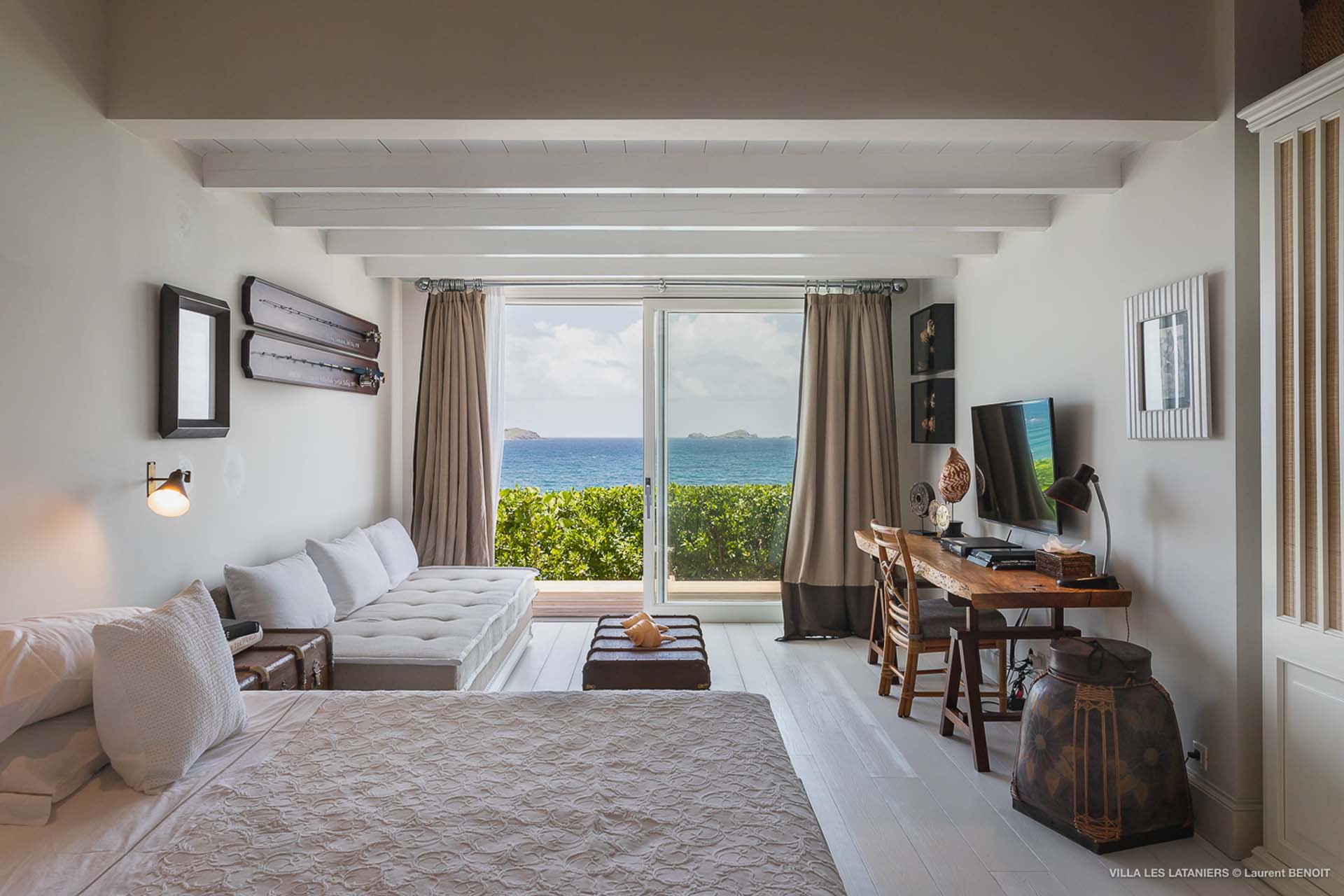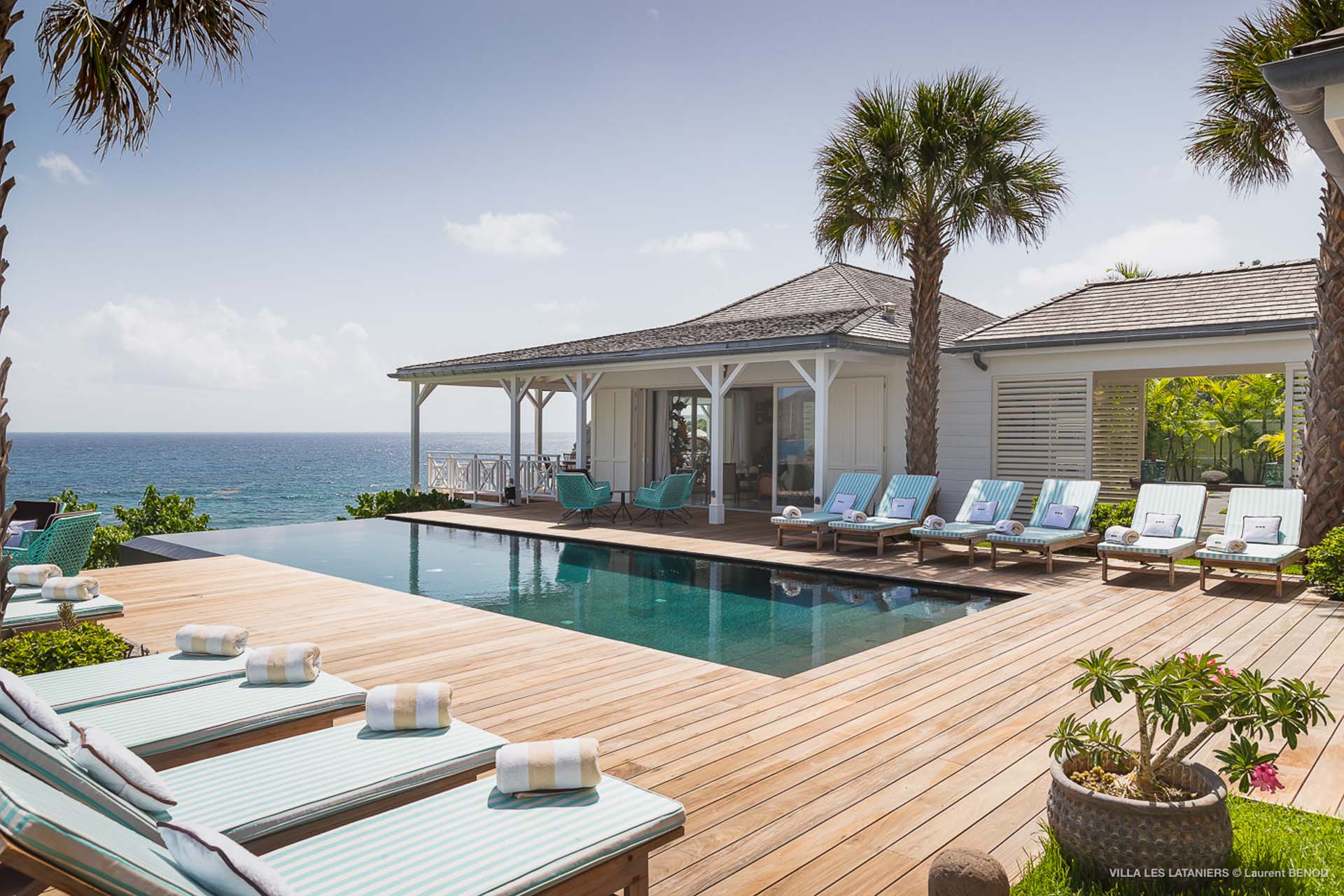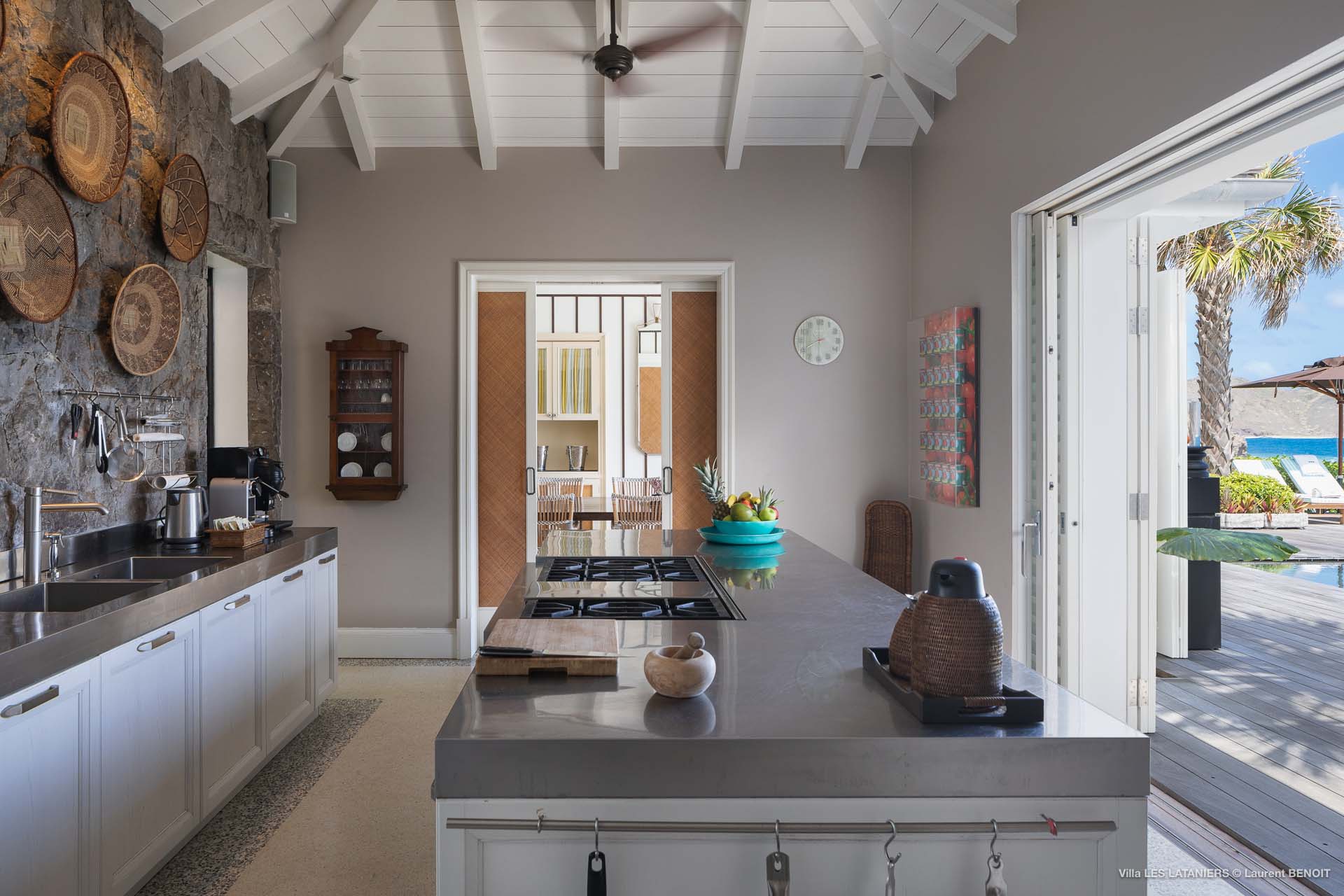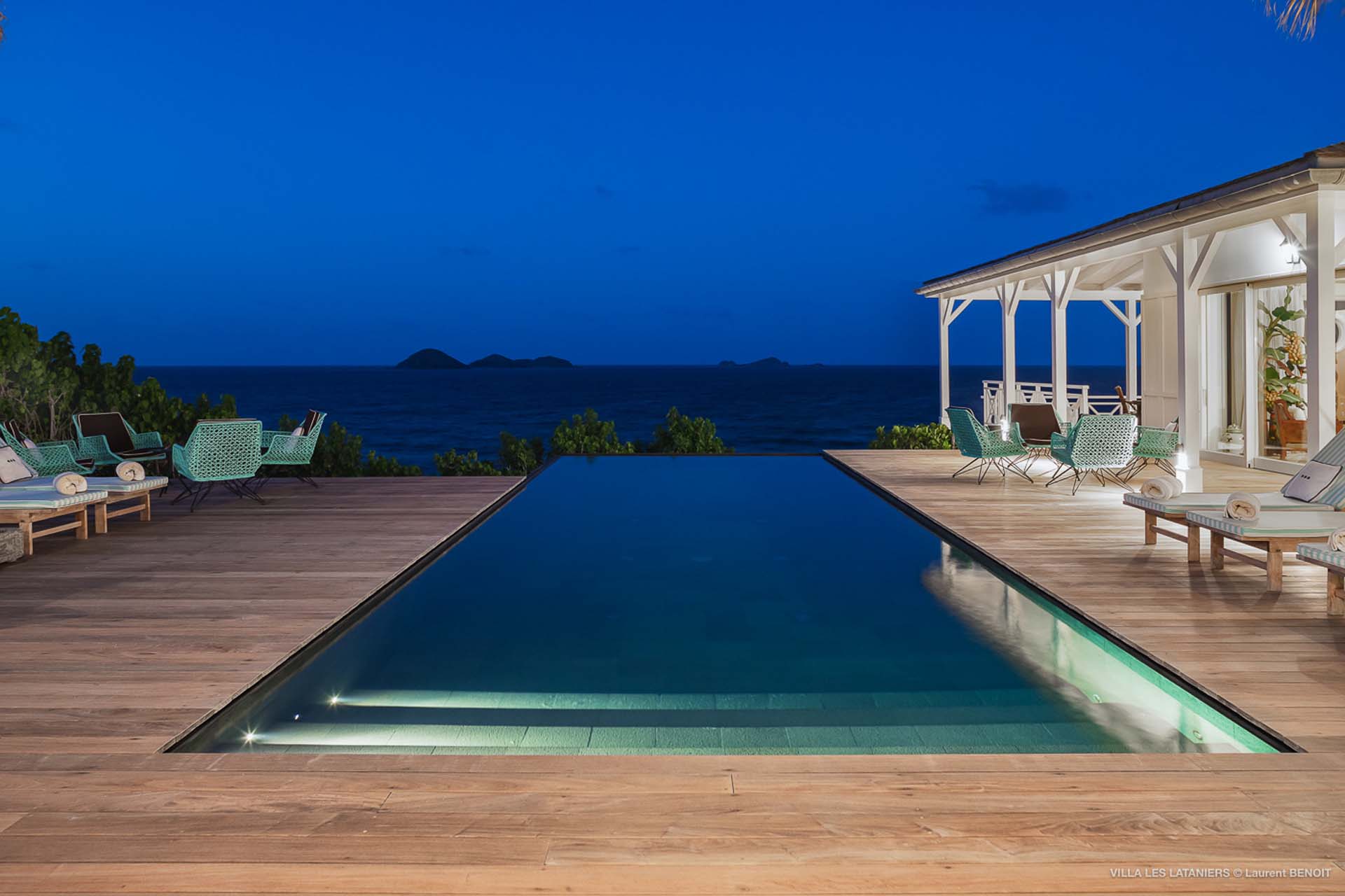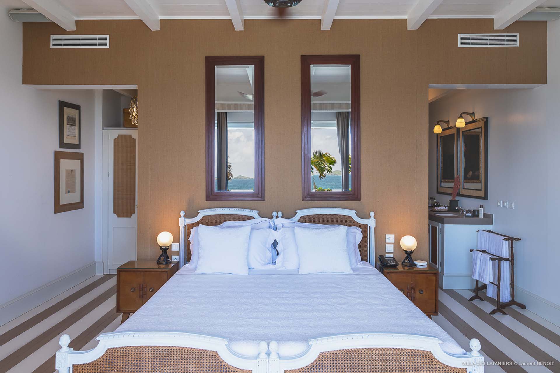 Villa Les Lataniers, (villa code: WV LAT) is a 6+1-bedroom villa located in Anse des Lezards. Perched just above the Anse des Lezards Bay, this large colonial-style estate enjoys panoramic views of the bay and hillsides. The interior features original artwork and memorabilia from around the world. Situated just off the pool is the dining room, which can be fully opened on both sides to tropical breezes. The dining room opens to the well-equipped, modern kitchen with a wood pizza oven. This room can also be closed off and air-conditioned. A covered passage leads to the fully air-conditioned main room, which has a sitting area, TV area, and dining area with seating for up to 8 guests. Located next to the living room is the air-conditioned master bedroom, which has a king-size bed, an en suite bathroom with a shower and oversized bathtub, and a private terrace with ample seating and a large hot tub facing the ocean view. Situated behind the pool house is a second bedroom, which has a European king-size bed, a dressing area, a large granite bathtub with ocean views, and both an indoor and outdoor shower. The remaining 4 bedrooms and a small staff room are located downstairs. Three bedrooms have European king-size beds, exterior access, and ensuite bathrooms, each with a tub and shower. The sixth bedroom has twin beds, a sofa bed, and an ensuite bathroom with a tub and shower, while the staff bedroom has a single twin-size bed, an ensuite bathroom with a shower, exterior access, and a small TV room with a sleep sofa. Each bedroom has screens. A deck with a small bar and loungers frame the heated infinity pool, which has an alarm. Located nearby is a pool house with a shower. The large covered deck features ample seating and a daybed (perfect for lounging). During the Thanksgiving and December holidays, the villa rents at full occupancy rates regardless of how many bedrooms are used.Please fill out the form to begin your inquiry and we will connect you with a seasoned villa rental specialist.