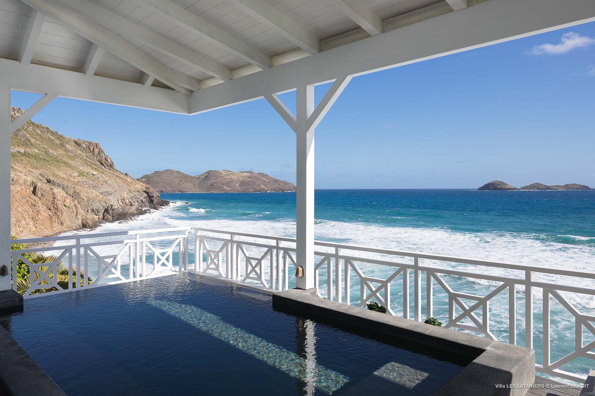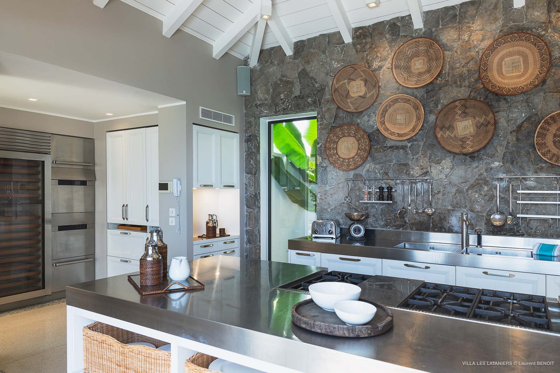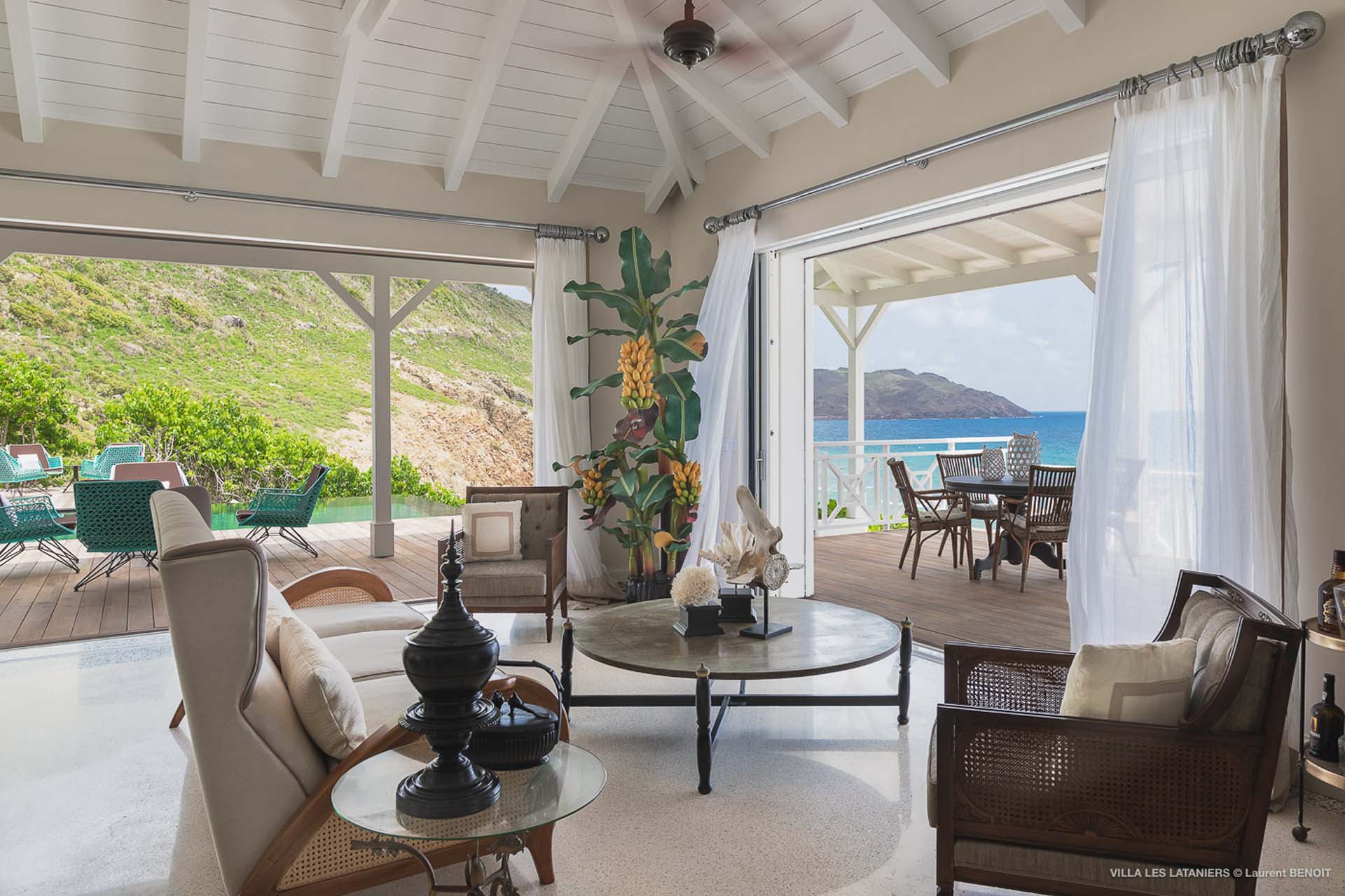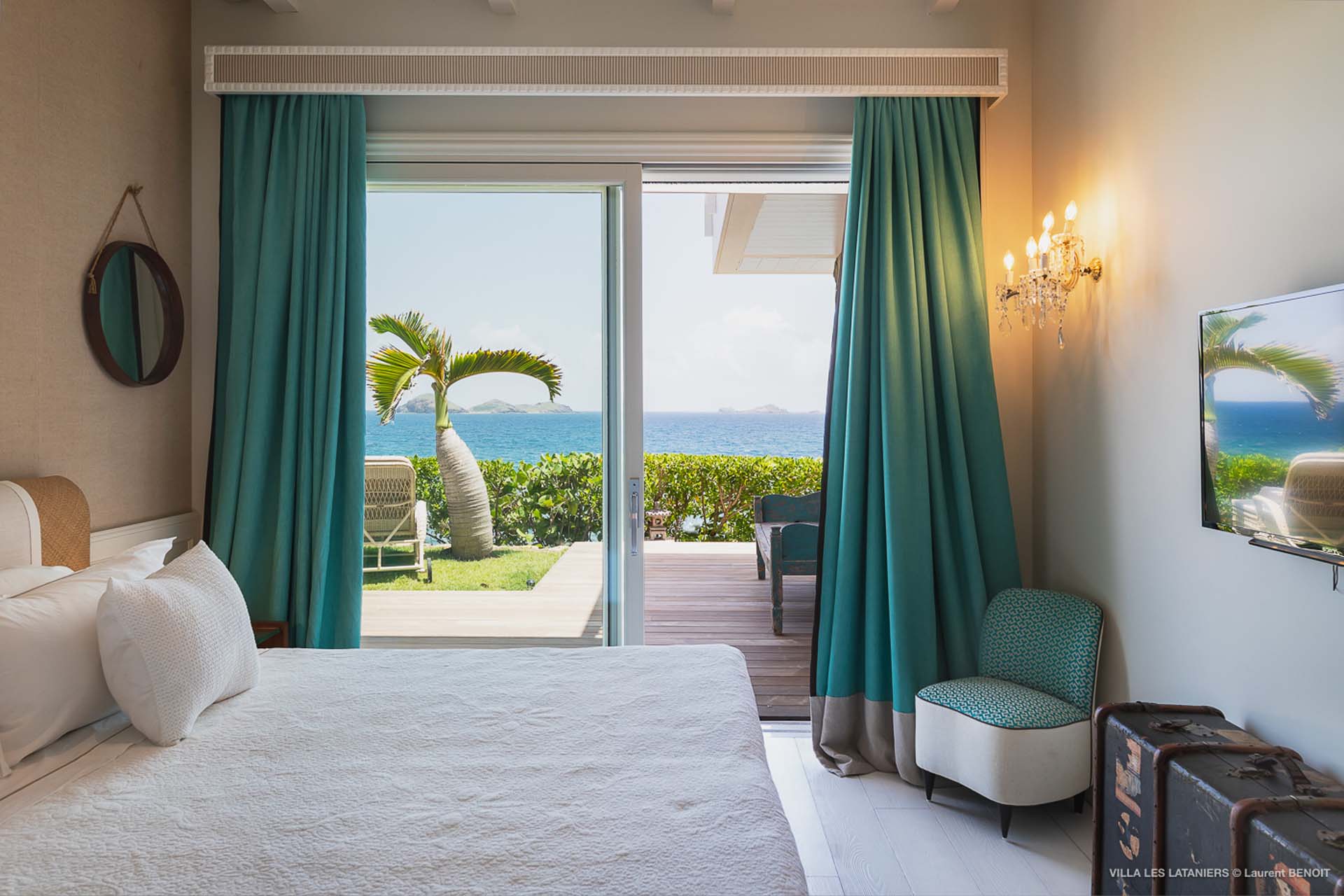 Villa Les Lataniers, (villa code: WV LAT) is a 6+1-bedroom villa located in Anse des Lezards. Perched just above the Anse des Lezards Bay, this large colonial-style estate enjoys panoramic views of the bay and hillsides. The interior features original artwork and memorabilia from around the world. Situated just off the pool is the dining room, which can be fully opened on both sides to tropical breezes. The dining room opens to the well-equipped, modern kitchen with a wood pizza oven. This room can also be closed off and air-conditioned. A covered passage leads to the fully air-conditioned main room, which has a sitting area, TV area, and dining area with seating for up to 8 guests. Located next to the living room is the air-conditioned master bedroom, which has a king-size bed, an en suite bathroom with a shower and oversized bathtub, and a private terrace with ample seating and a large hot tub facing the ocean view. Situated behind the pool house is a second bedroom, which has a European king-size bed, a dressing area, a large granite bathtub with ocean views, and both an indoor and outdoor shower. The remaining 4 bedrooms and a small staff room are located downstairs. Three bedrooms have European king-size beds, exterior access, and ensuite bathrooms, each with a tub and shower. The sixth bedroom has twin beds, a sofa bed, and an ensuite bathroom with a tub and shower, while the staff bedroom has a single twin-size bed, an ensuite bathroom with a shower, exterior access, and a small TV room with a sleep sofa. Each bedroom has screens. A deck with a small bar and loungers frame the heated infinity pool, which has an alarm. Located nearby is a pool house with a shower. The large covered deck features ample seating and a daybed (perfect for lounging). During the Thanksgiving and December holidays, the villa rents at full occupancy rates regardless of how many bedrooms are used.Please fill out the form to begin your inquiry and we will connect you with a seasoned villa rental specialist.