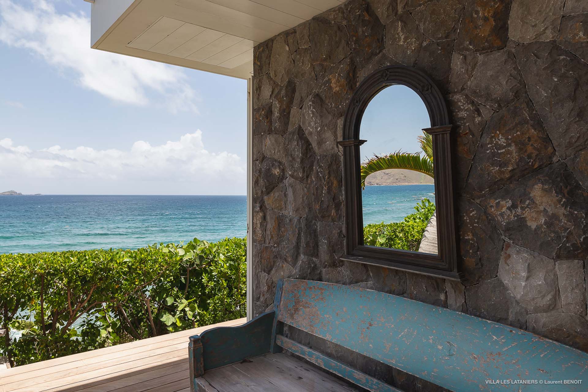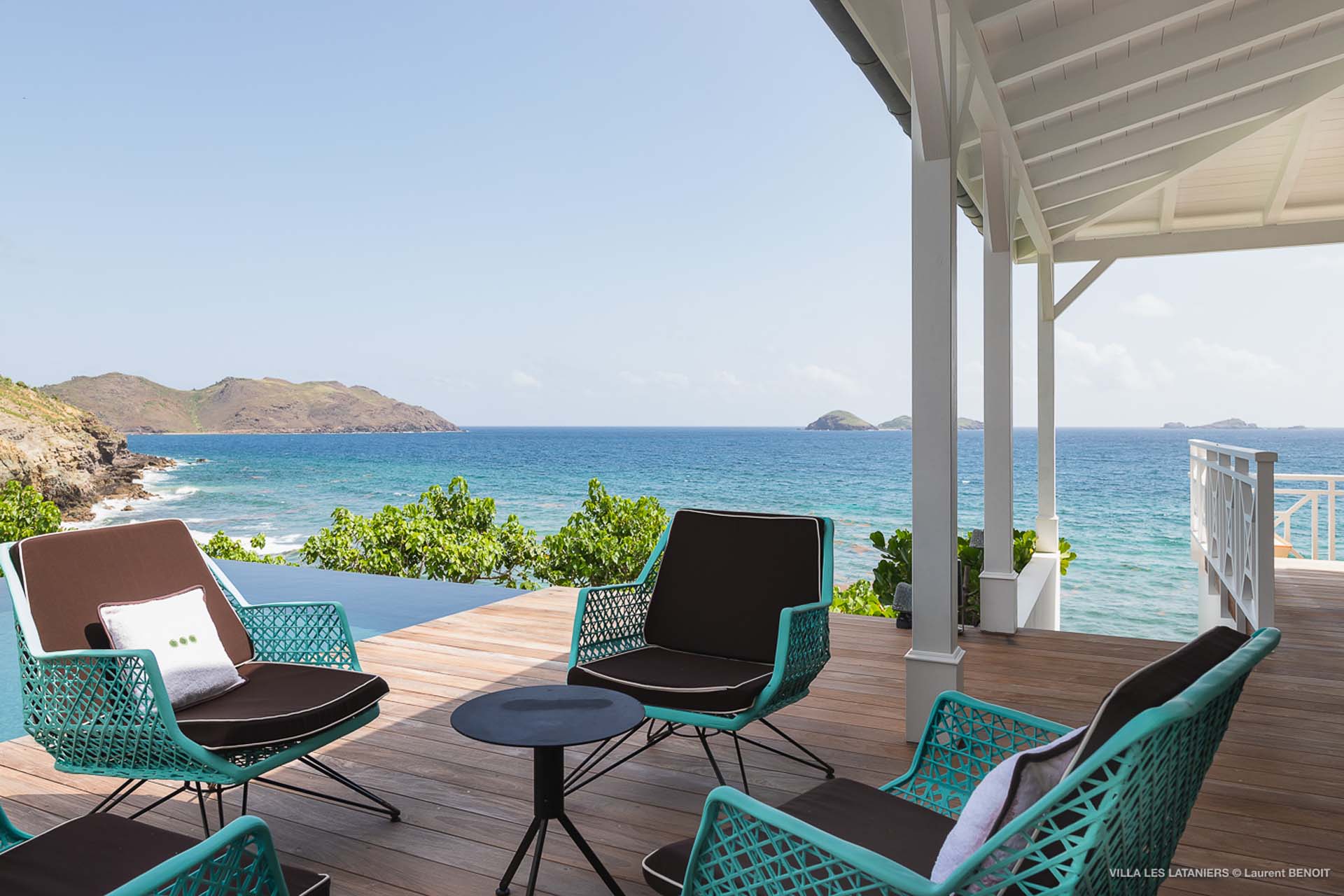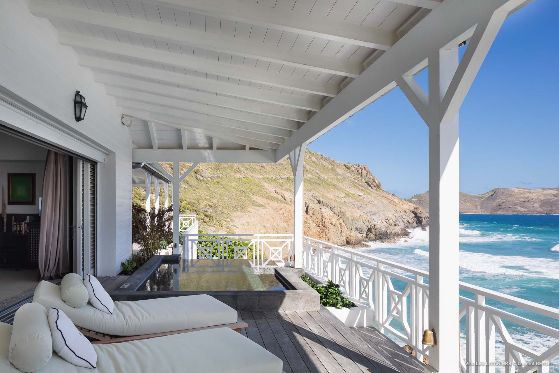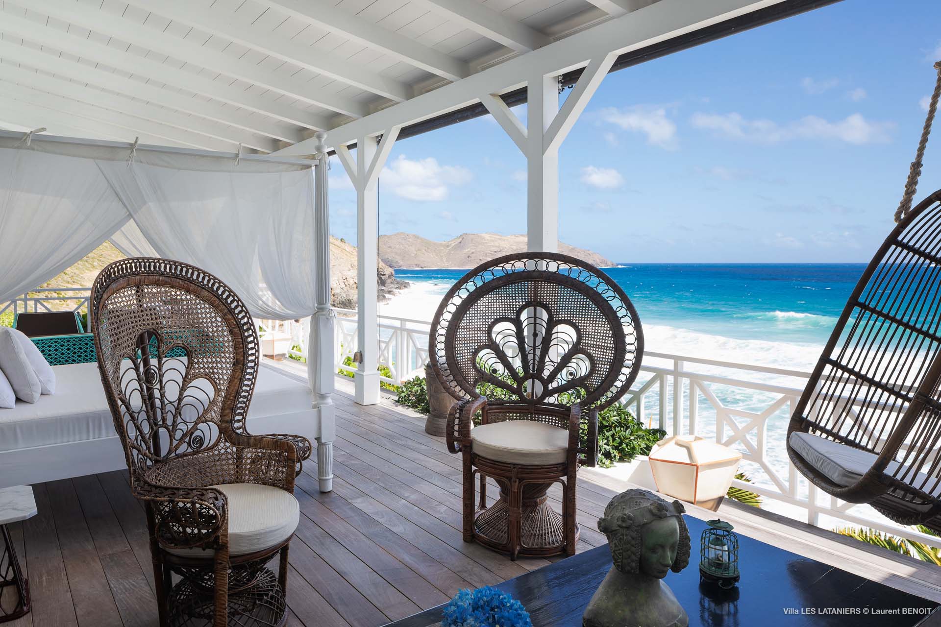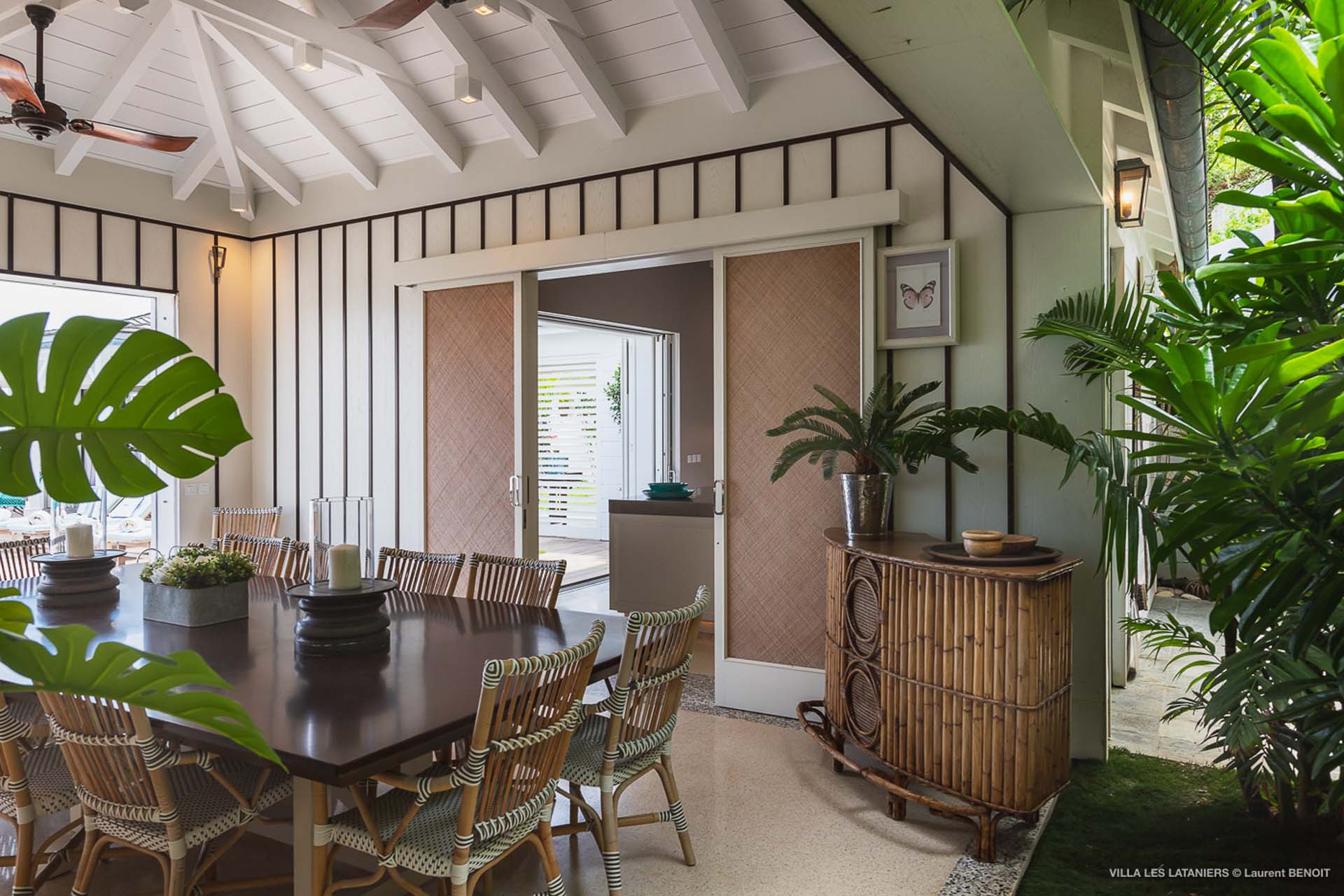 Villa Les Lataniers, (villa code: WV LAT) is a 6+1-bedroom villa located in Anse des Lezards. Perched just above the Anse des Lezards Bay, this large colonial-style estate enjoys panoramic views of the bay and hillsides. The interior features original artwork and memorabilia from around the world. Situated just off the pool is the dining room, which can be fully opened on both sides to tropical breezes. The dining room opens to the well-equipped, modern kitchen with a wood pizza oven. This room can also be closed off and air-conditioned. A covered passage leads to the fully air-conditioned main room, which has a sitting area, TV area, and dining area with seating for up to 8 guests. Located next to the living room is the air-conditioned master bedroom, which has a king-size bed, an en suite bathroom with a shower and oversized bathtub, and a private terrace with ample seating and a large hot tub facing the ocean view. Situated behind the pool house is a second bedroom, which has a European king-size bed, a dressing area, a large granite bathtub with ocean views, and both an indoor and outdoor shower. The remaining 4 bedrooms and a small staff room are located downstairs. Three bedrooms have European king-size beds, exterior access, and ensuite bathrooms, each with a tub and shower. The sixth bedroom has twin beds, a sofa bed, and an ensuite bathroom with a tub and shower, while the staff bedroom has a single twin-size bed, an ensuite bathroom with a shower, exterior access, and a small TV room with a sleep sofa. Each bedroom has screens. A deck with a small bar and loungers frame the heated infinity pool, which has an alarm. Located nearby is a pool house with a shower. The large covered deck features ample seating and a daybed (perfect for lounging). During the Thanksgiving and December holidays, the villa rents at full occupancy rates regardless of how many bedrooms are used.Please fill out the form to begin your inquiry and we will connect you with a seasoned villa rental specialist.