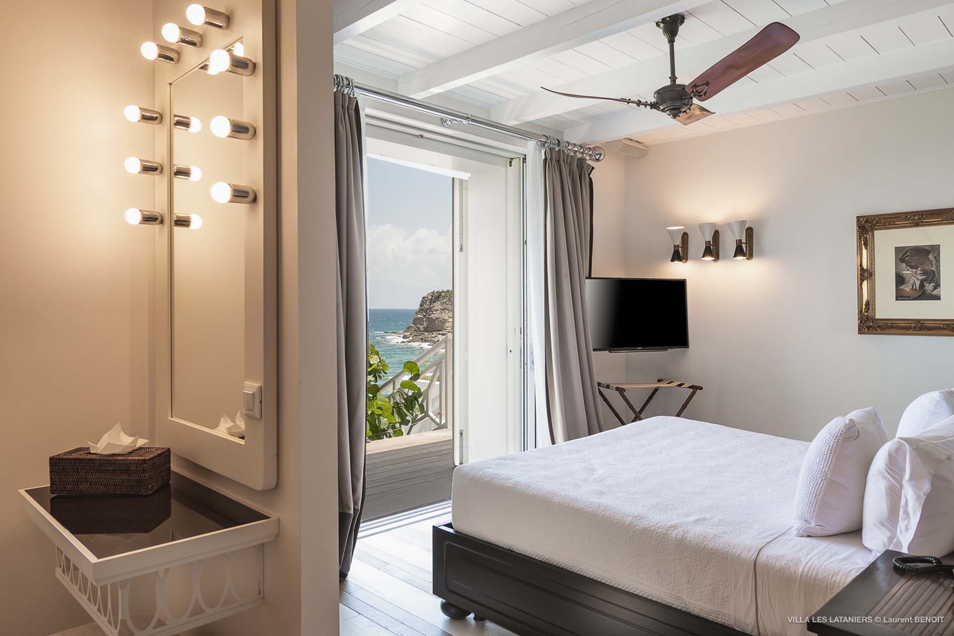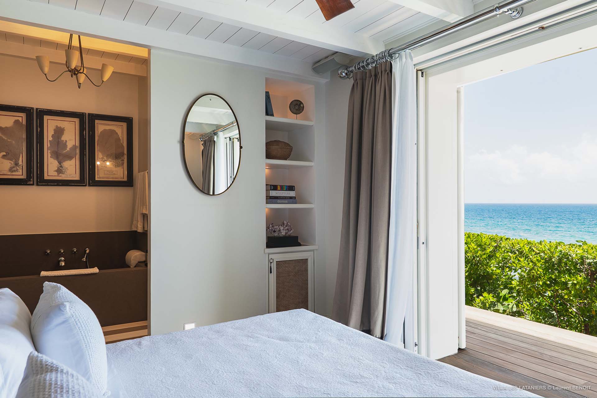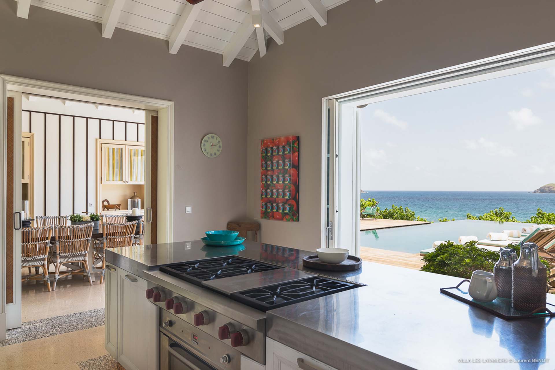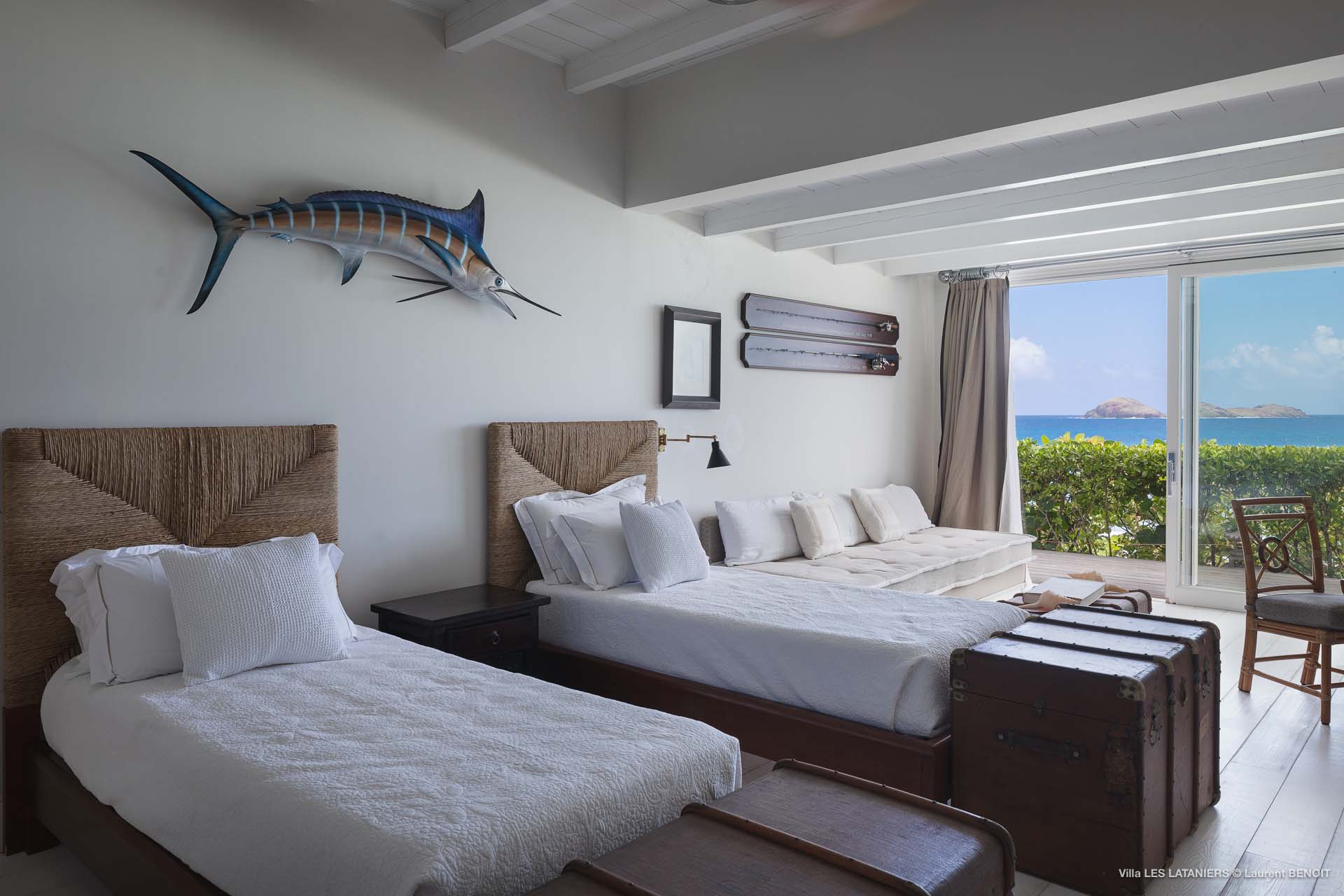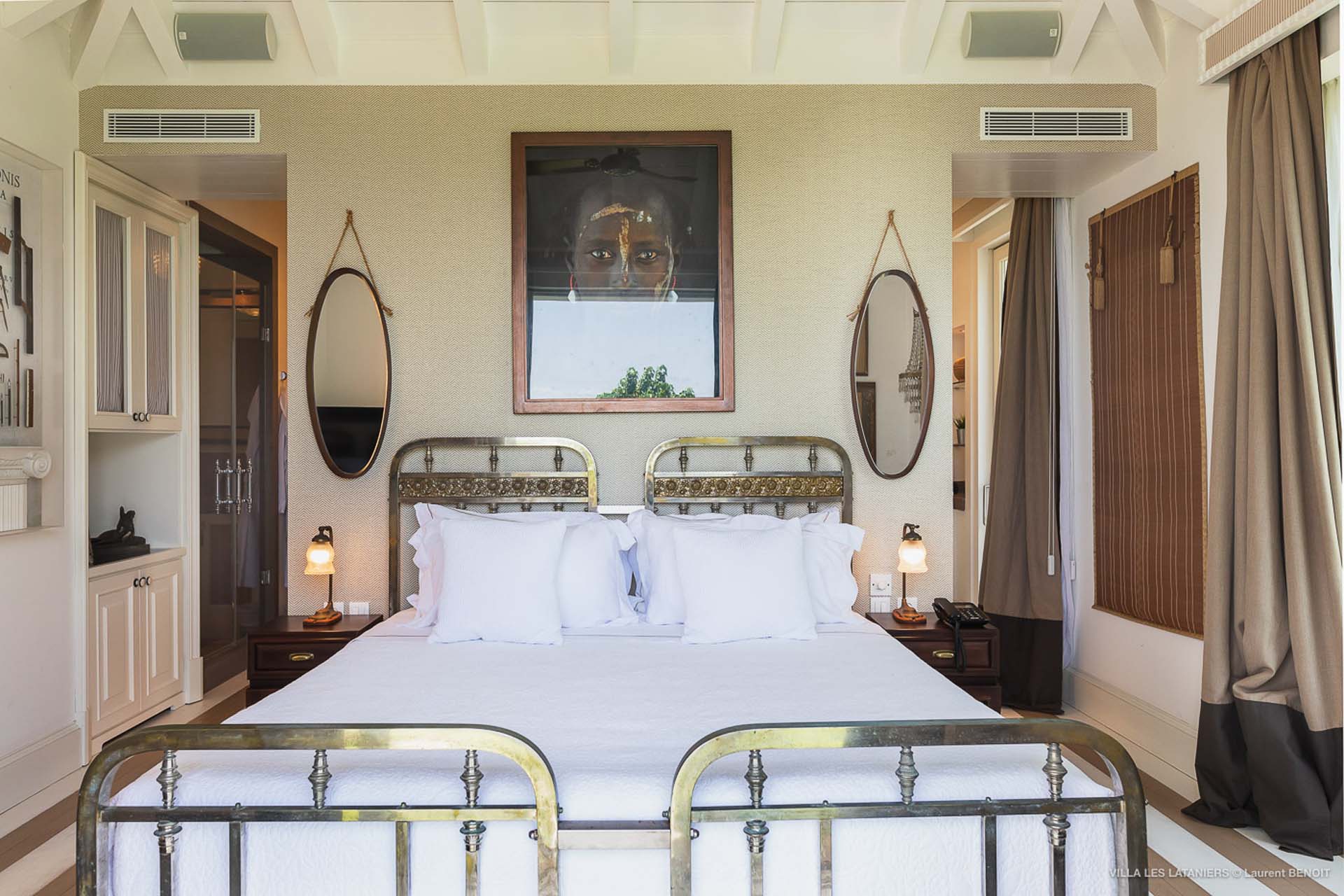 Villa Les Lataniers, (villa code: WV LAT) is a 6+1-bedroom villa located in Anse des Lezards. Perched just above the Anse des Lezards Bay, this large colonial-style estate enjoys panoramic views of the bay and hillsides. The interior features original artwork and memorabilia from around the world. Situated just off the pool is the dining room, which can be fully opened on both sides to tropical breezes. The dining room opens to the well-equipped, modern kitchen with a wood pizza oven. This room can also be closed off and air-conditioned. A covered passage leads to the fully air-conditioned main room, which has a sitting area, TV area, and dining area with seating for up to 8 guests. Located next to the living room is the air-conditioned master bedroom, which has a king-size bed, an en suite bathroom with a shower and oversized bathtub, and a private terrace with ample seating and a large hot tub facing the ocean view. Situated behind the pool house is a second bedroom, which has a European king-size bed, a dressing area, a large granite bathtub with ocean views, and both an indoor and outdoor shower. The remaining 4 bedrooms and a small staff room are located downstairs. Three bedrooms have European king-size beds, exterior access, and ensuite bathrooms, each with a tub and shower. The sixth bedroom has twin beds, a sofa bed, and an ensuite bathroom with a tub and shower, while the staff bedroom has a single twin-size bed, an ensuite bathroom with a shower, exterior access, and a small TV room with a sleep sofa. Each bedroom has screens. A deck with a small bar and loungers frame the heated infinity pool, which has an alarm. Located nearby is a pool house with a shower. The large covered deck features ample seating and a daybed (perfect for lounging). During the Thanksgiving and December holidays, the villa rents at full occupancy rates regardless of how many bedrooms are used.Please fill out the form to begin your inquiry and we will connect you with a seasoned villa rental specialist.